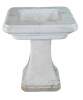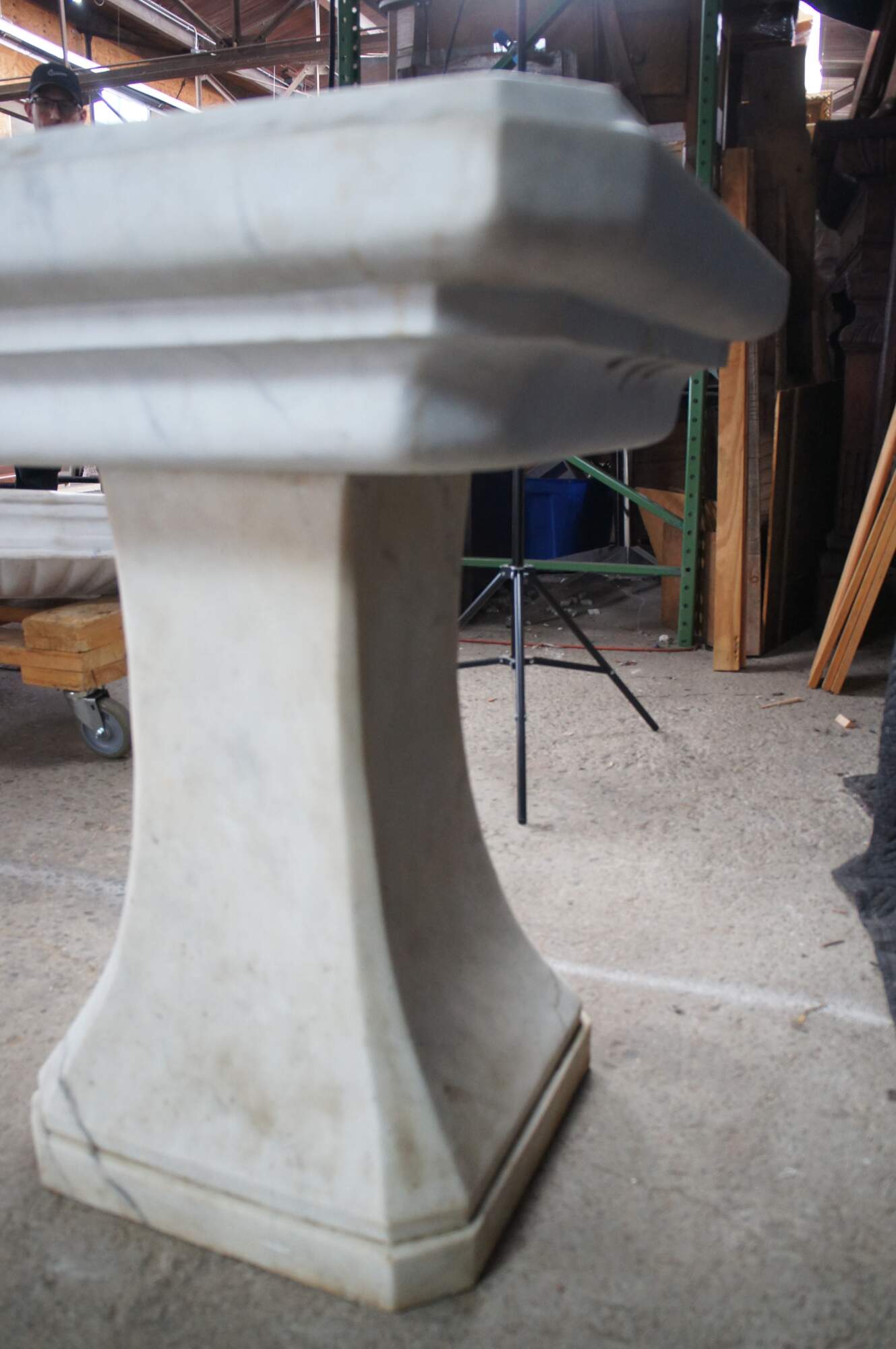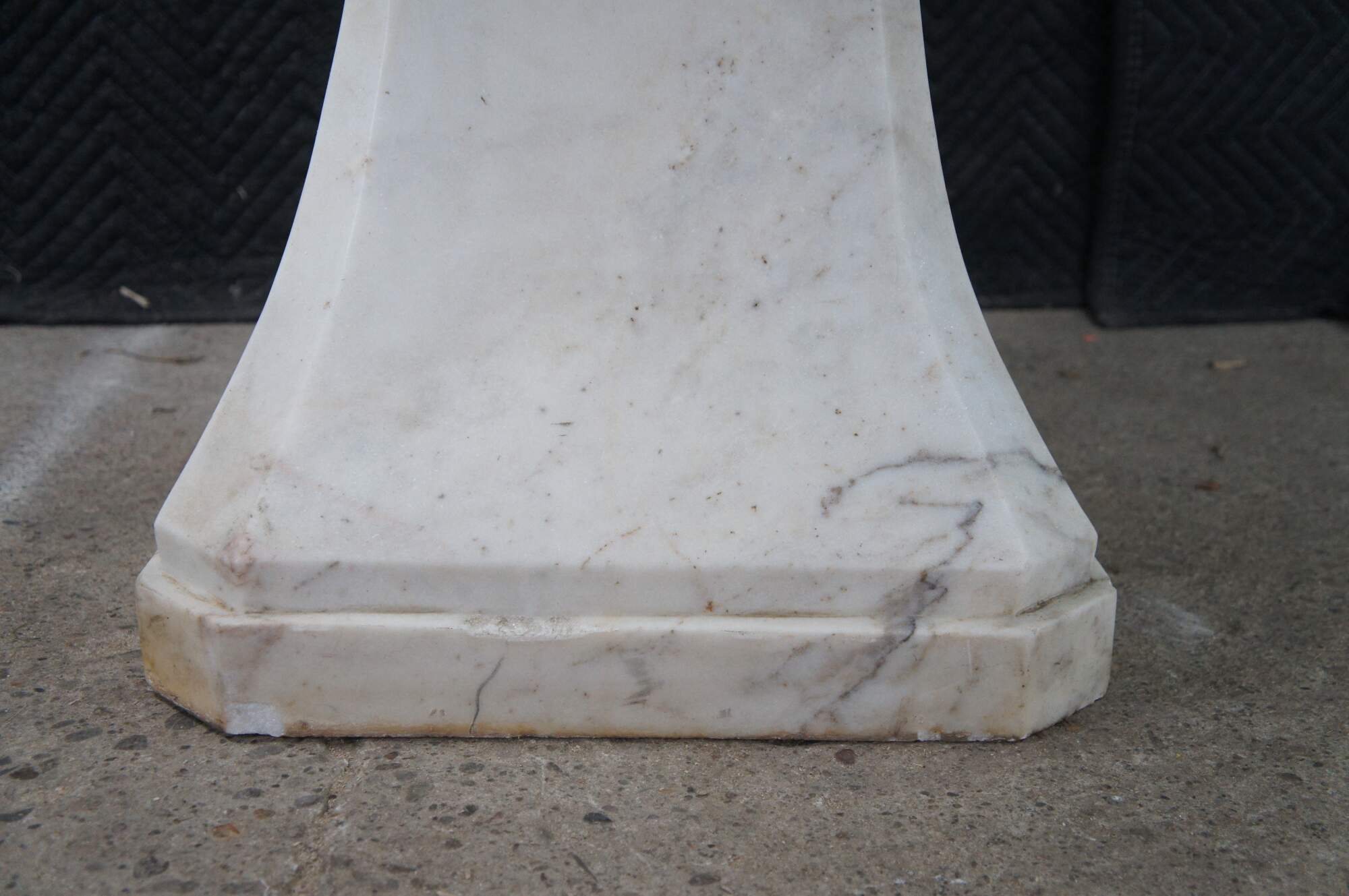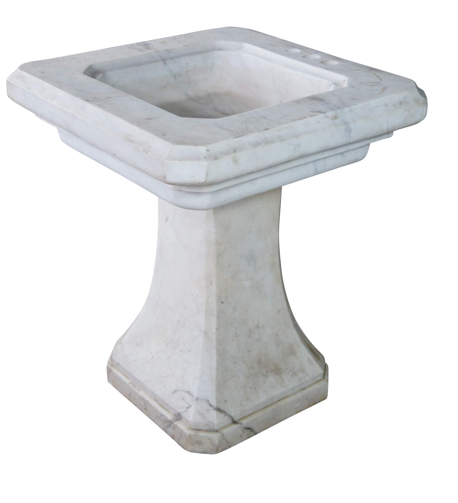Monumental mid century Italian white Carrara marble bathroom sink. A tapered rectangular plith column supports a square form sink with a beveled and notched design.