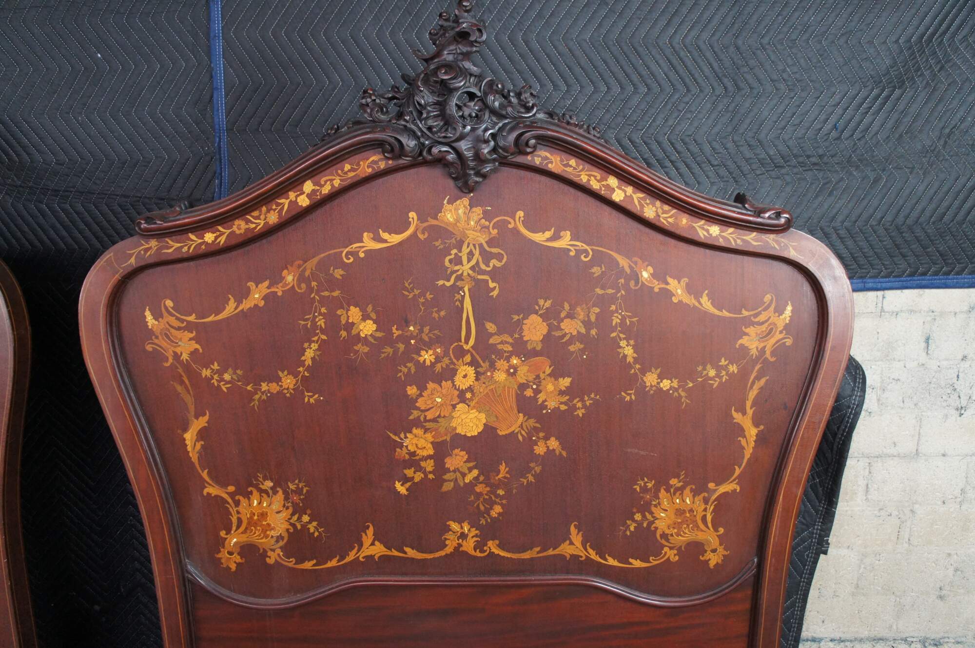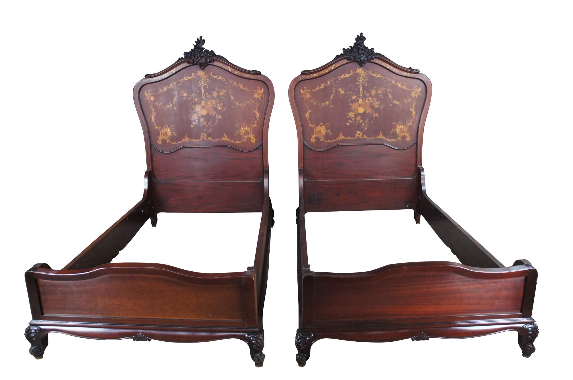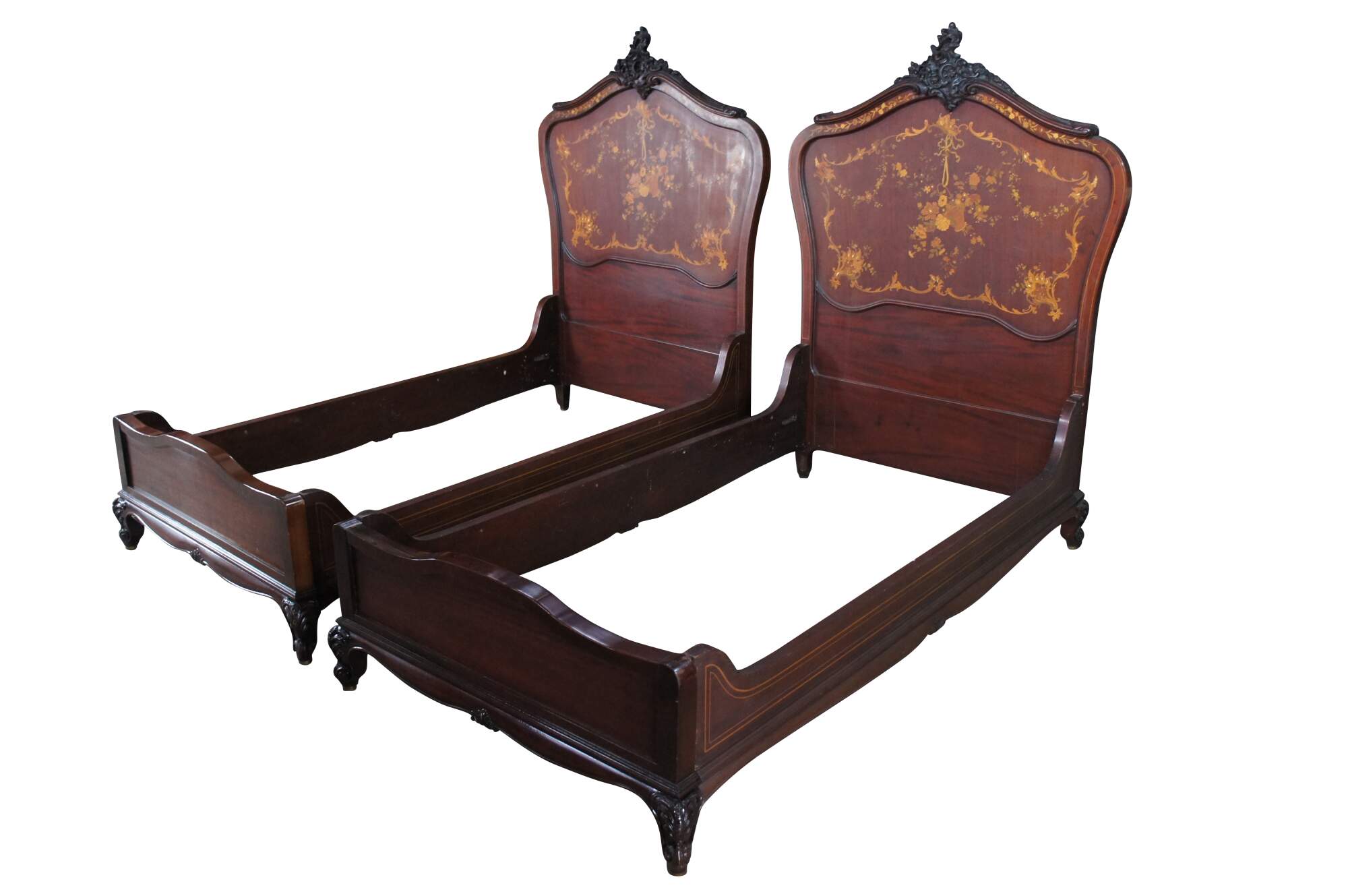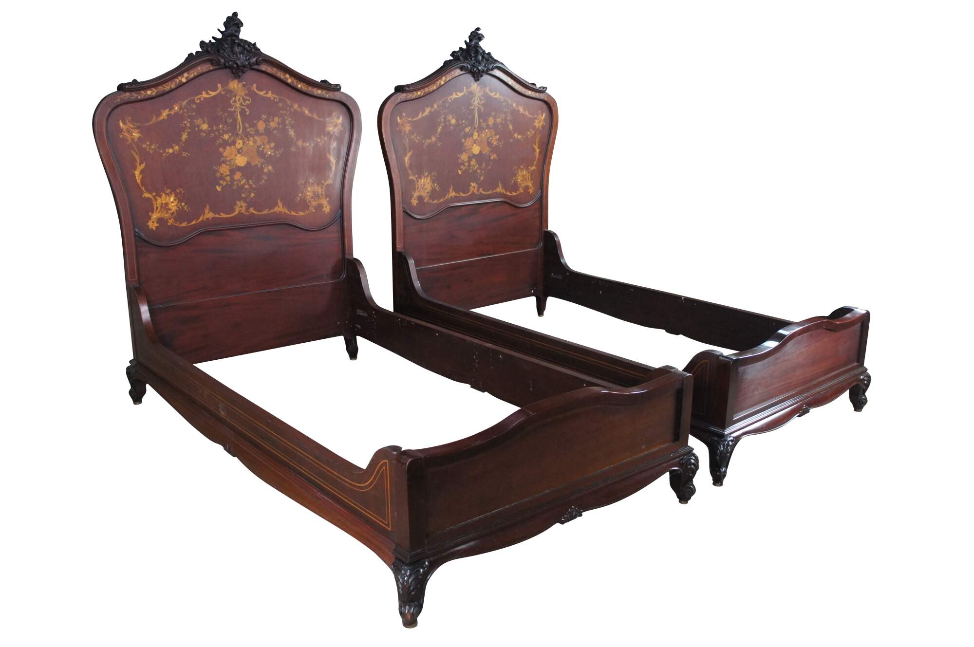 Two antique RJ Horner French Louis XV style bed frames with intricate marquetry inlay designs. The beds are carved from walnut featuring ornate pierced Rococo crests, fruitwood and mother of pearl inlay designs of scrolled floral swags, acanthus leaves, and a boquet of flowers in a basket suspended from a Neoclassical ribbon.