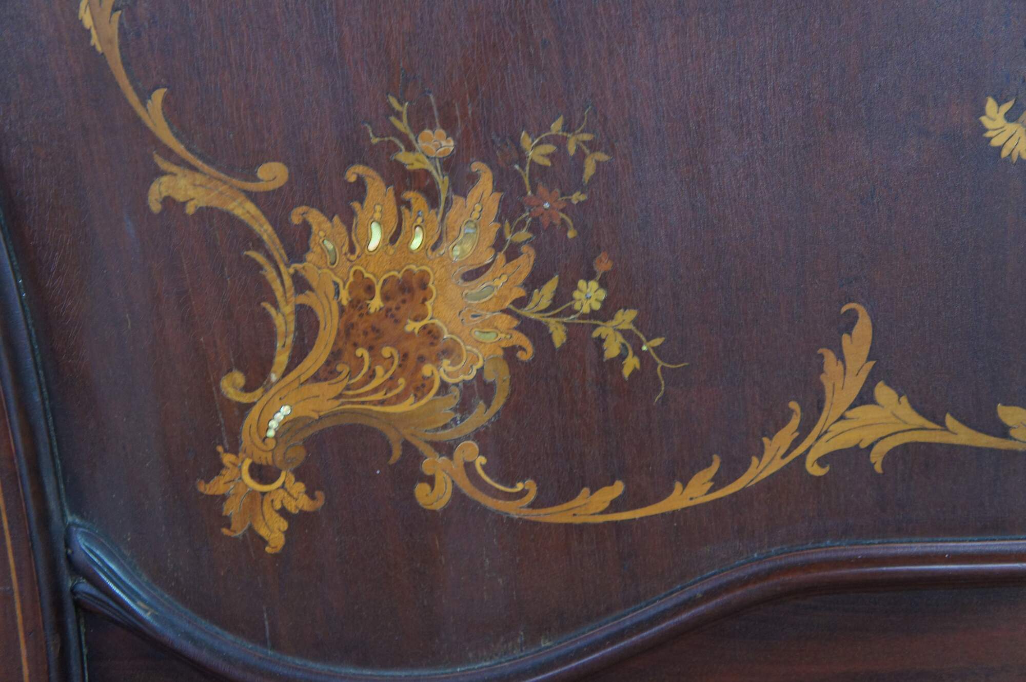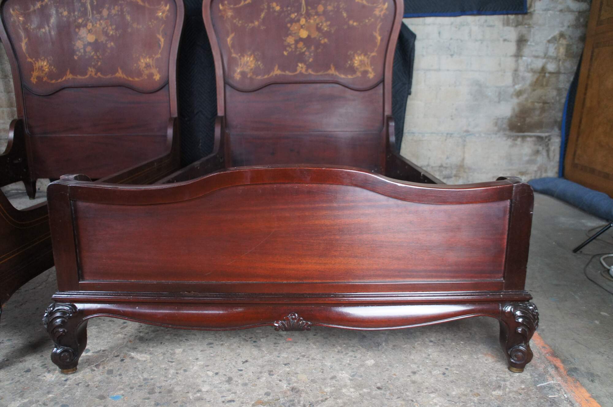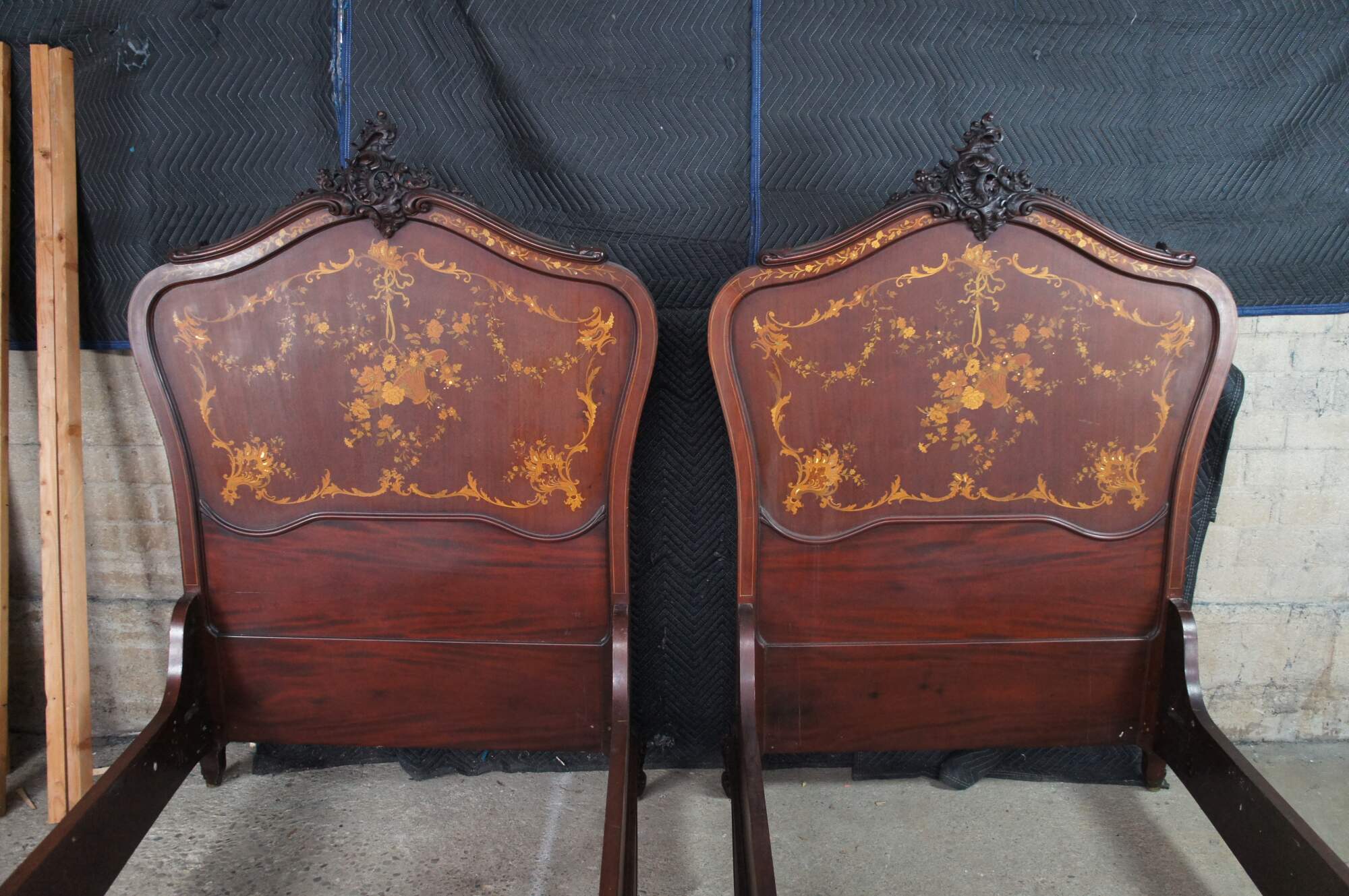 Two antique RJ Horner French Louis XV style bed frames with intricate marquetry inlay designs. The beds are carved from walnut featuring ornate pierced Rococo crests, fruitwood and mother of pearl inlay designs of scrolled floral swags, acanthus leaves, and a boquet of flowers in a basket suspended from a Neoclassical ribbon.