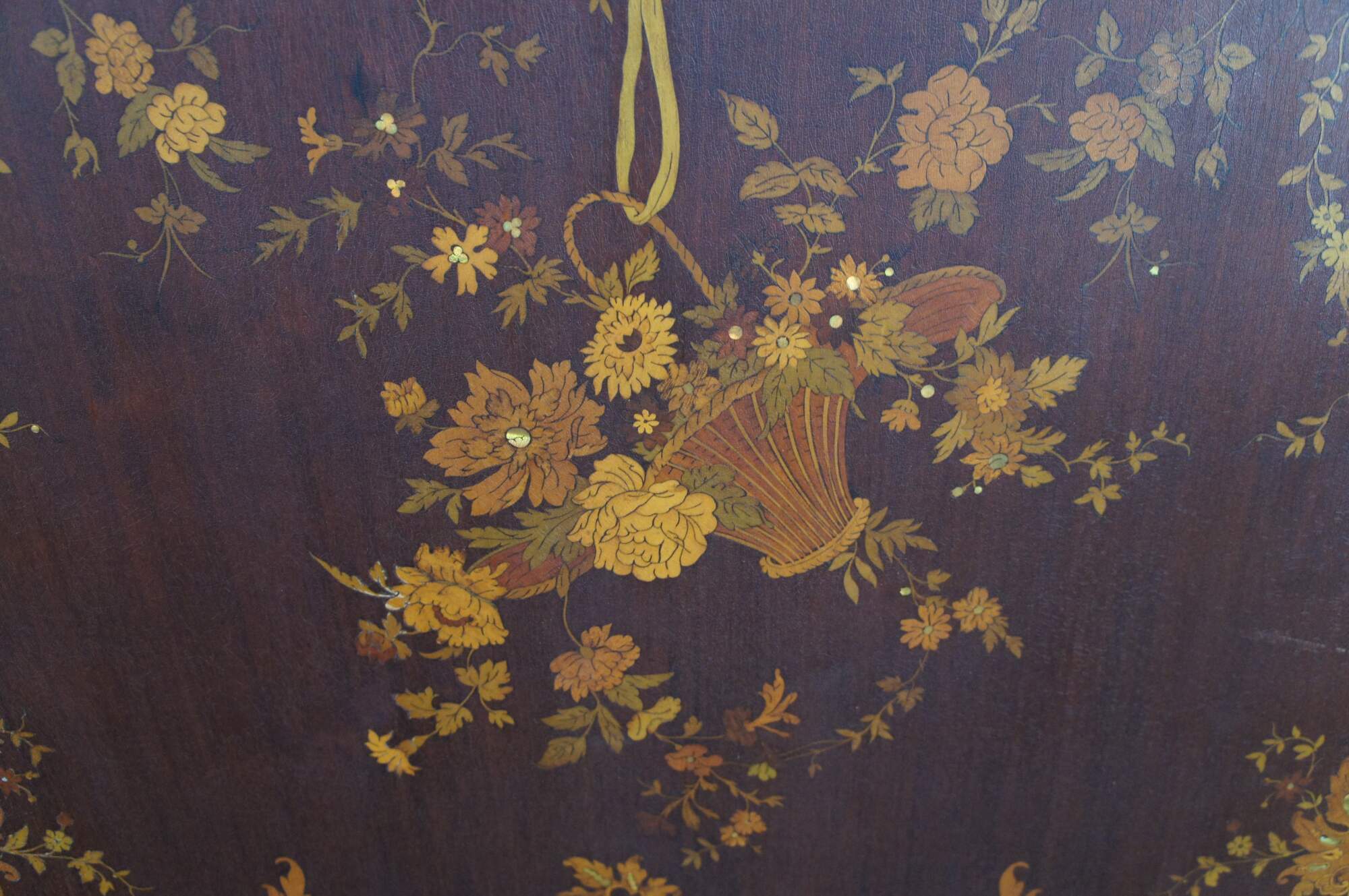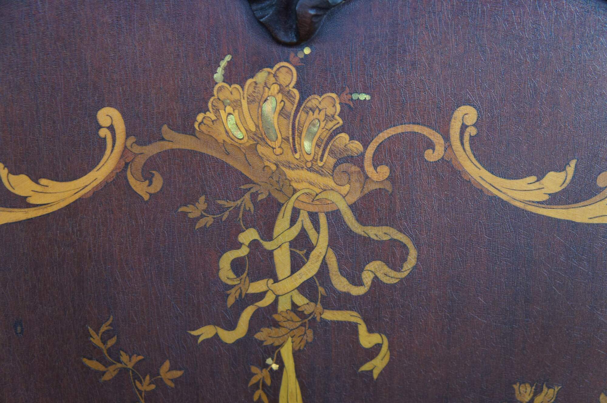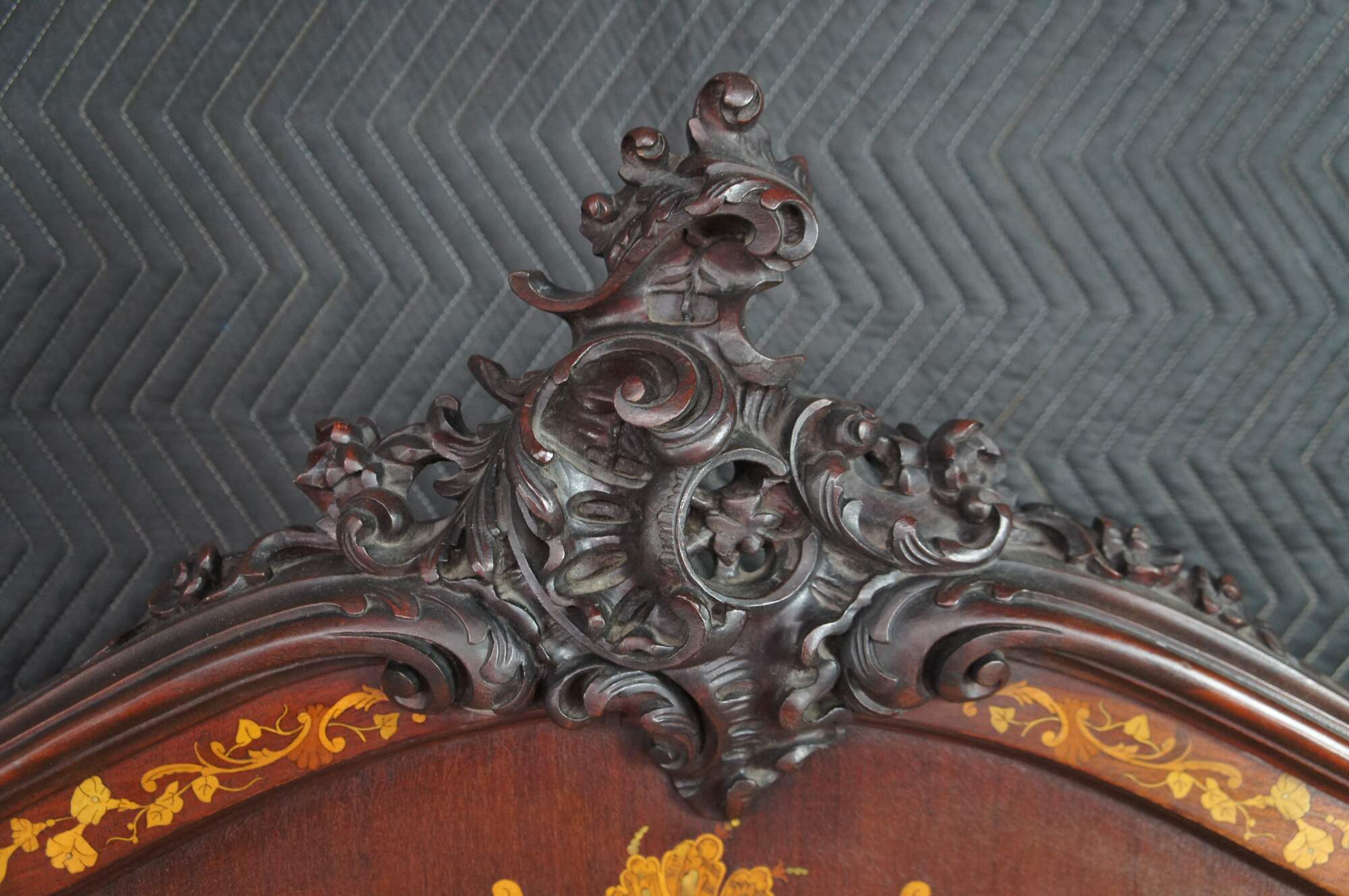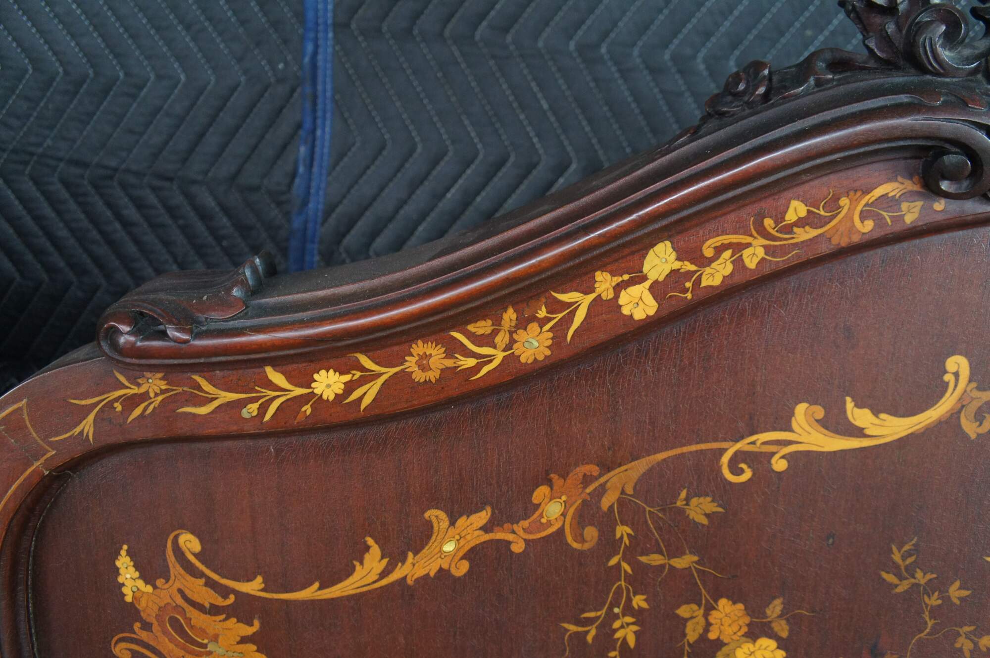 Two antique RJ Horner French Louis XV style bed frames with intricate marquetry inlay designs. The beds are carved from walnut featuring ornate pierced Rococo crests, fruitwood and mother of pearl inlay designs of scrolled floral swags, acanthus leaves, and a boquet of flowers in a basket suspended from a Neoclassical ribbon.