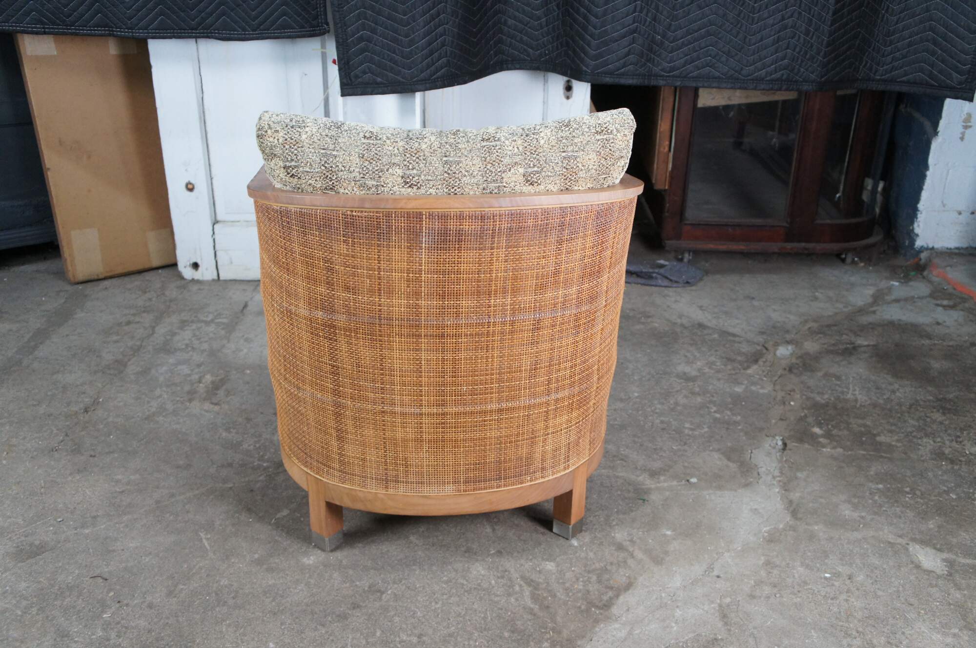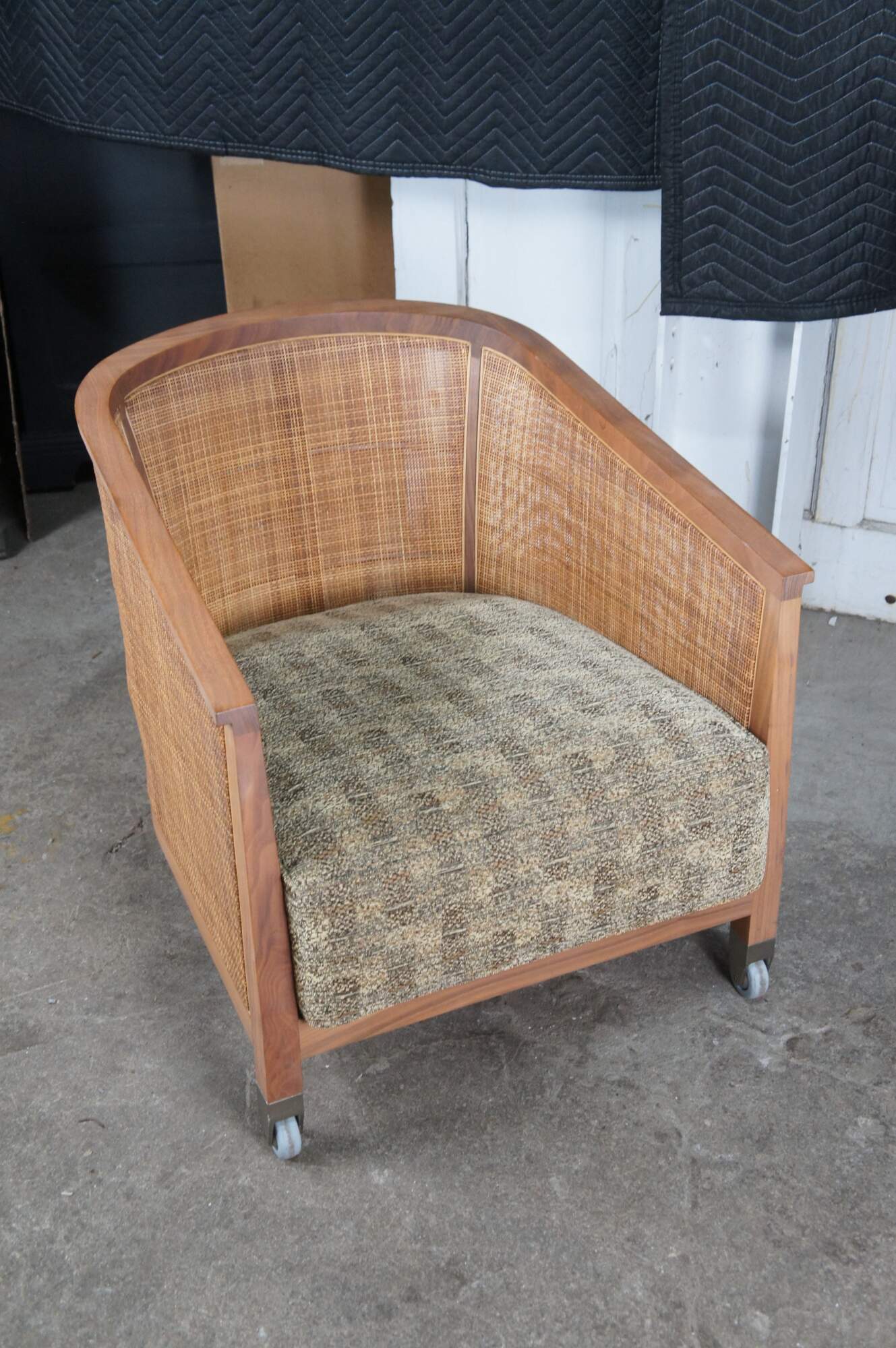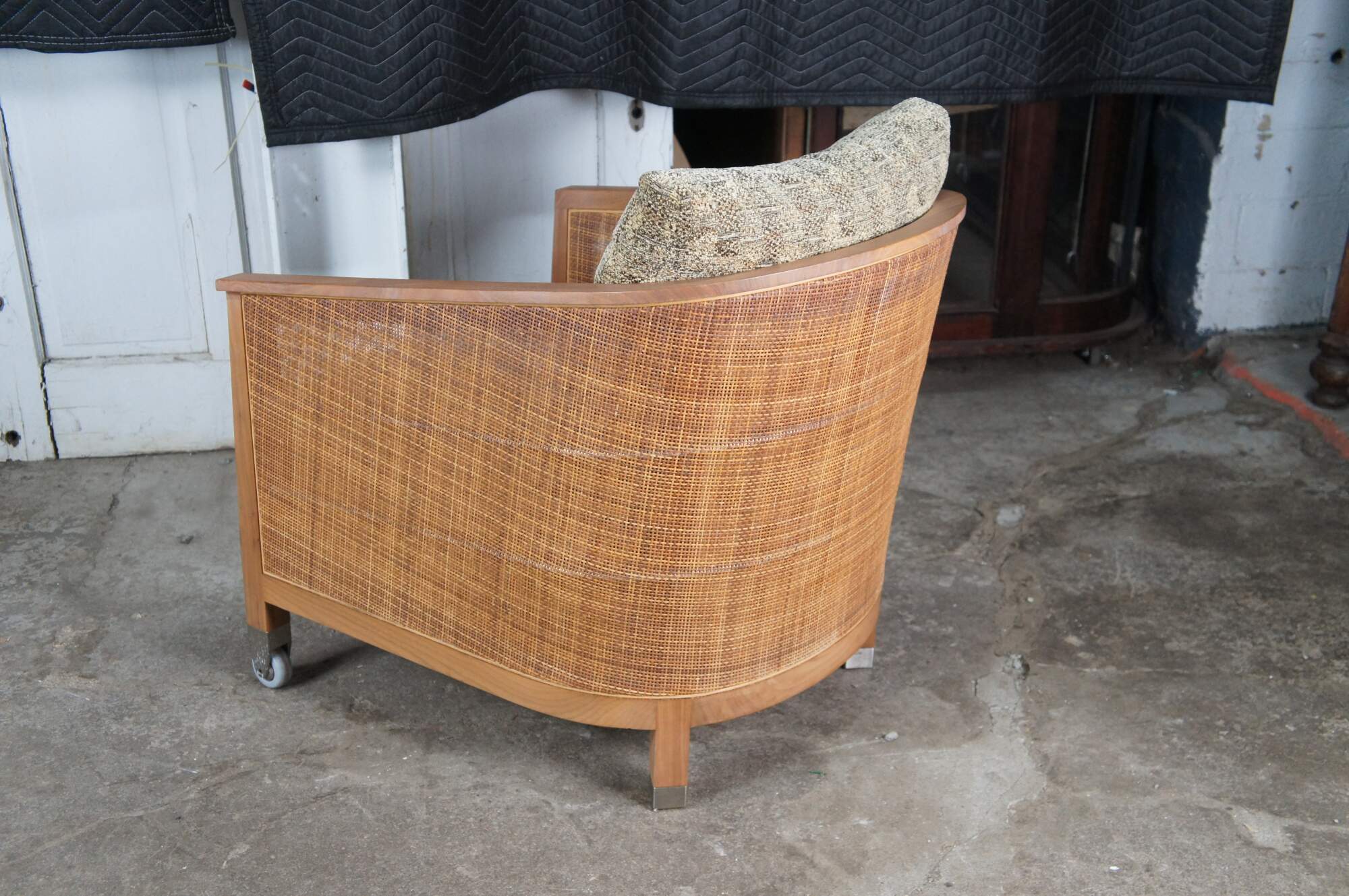 A beautiful set of four 'Mozart' Armchairs by Antonio Citterio for Flexform, Italy circa 1980s. Features a walnut barrel back form with double woven caned back and upholstered seats. Each chair rests on metal capped feet with casters along the front for ease of movement. The deep seat cushion and cushioned back make for a very comfortable lounging experience. Religious Iconography: It prominently features a central figure resembling the Virgin Mary or a similar religious icon within a decorated niche.