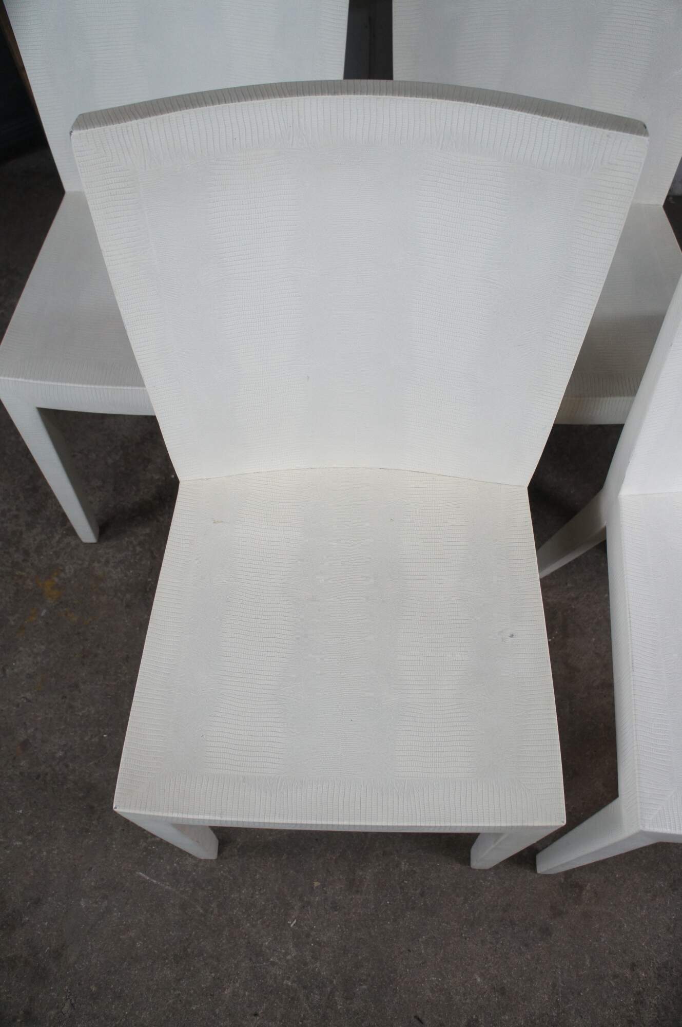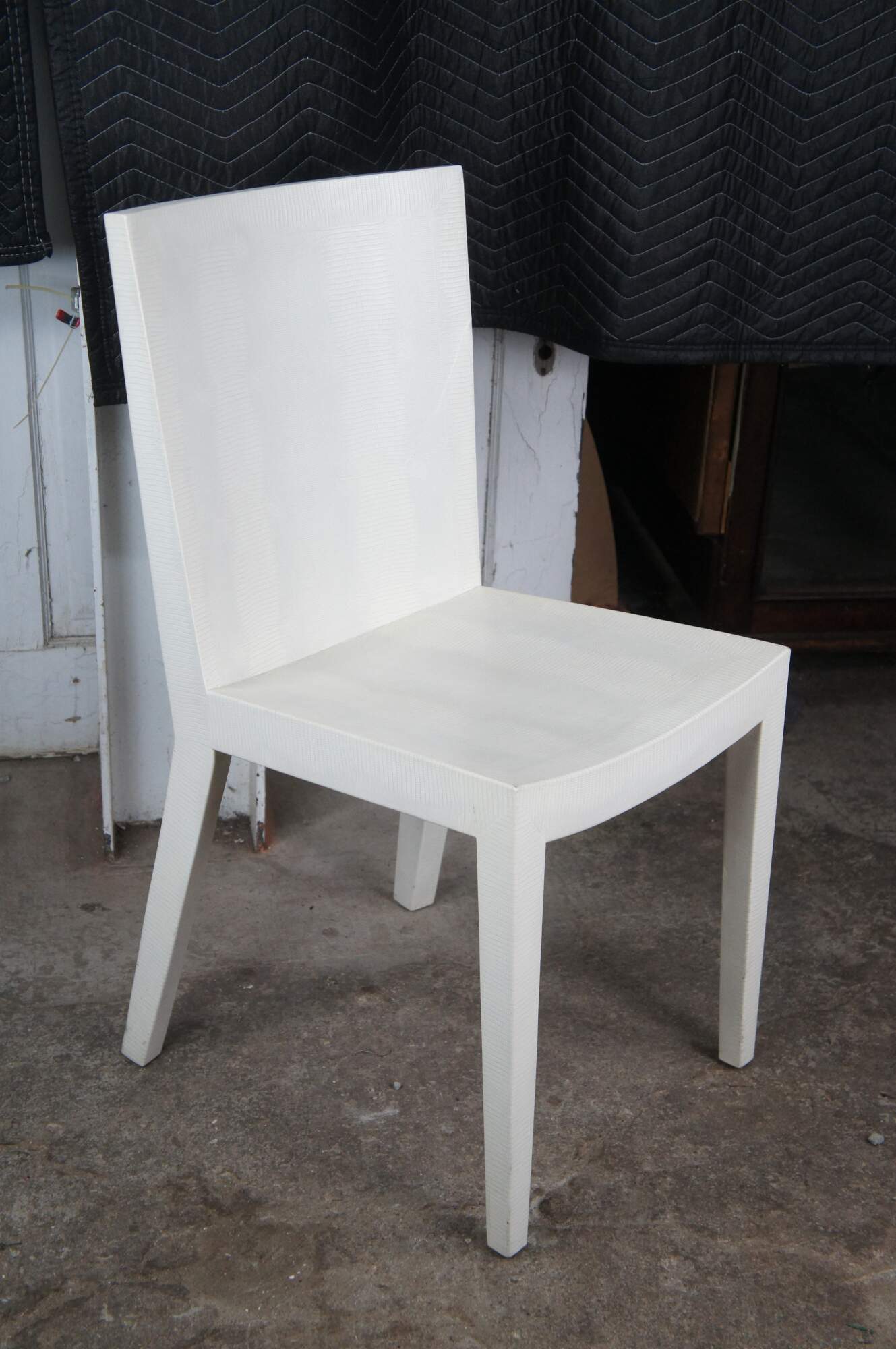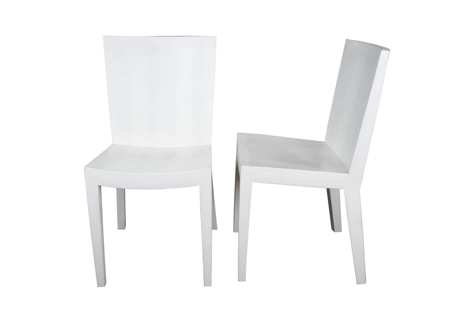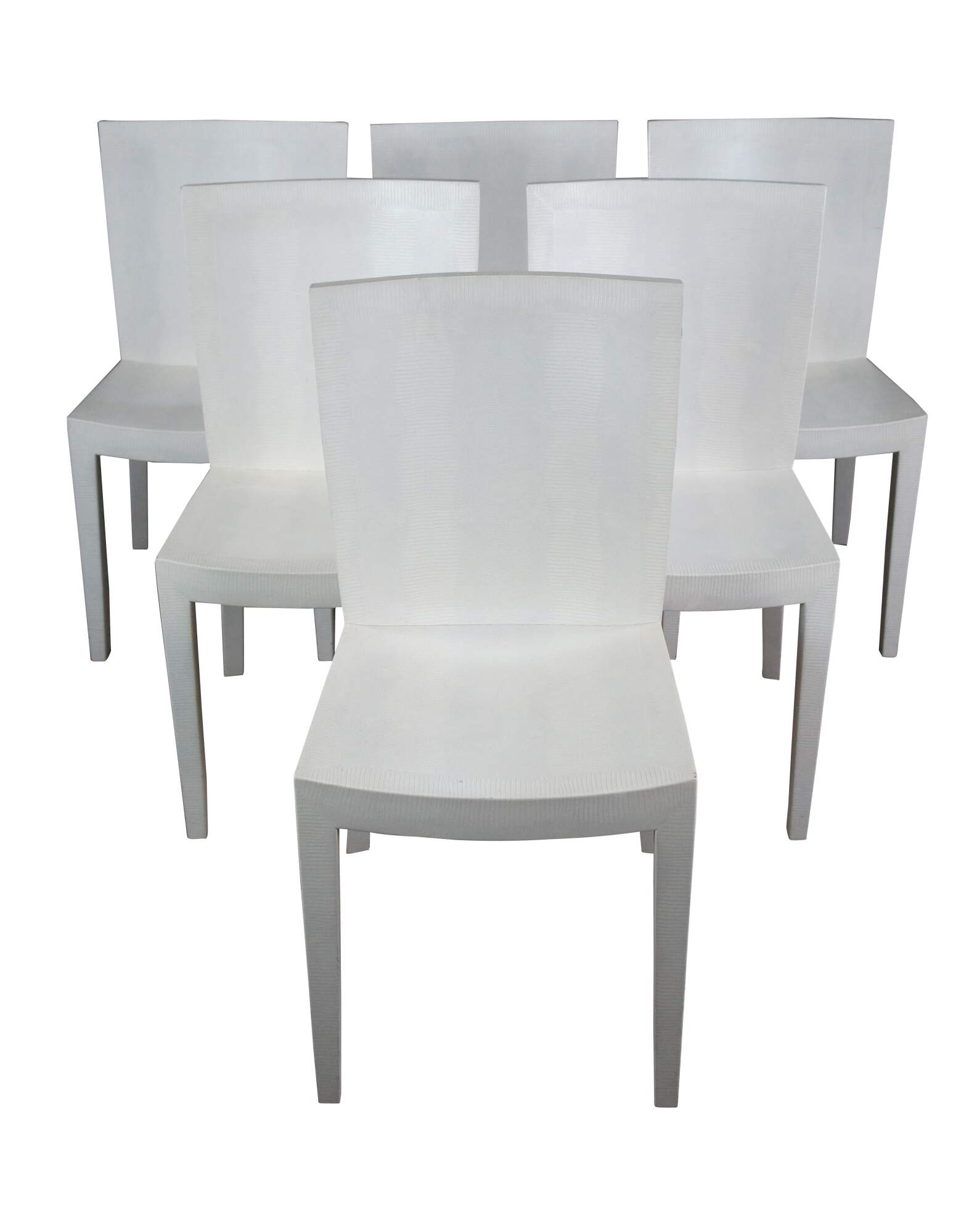 Set of six iconic J.M.F. Chairs signed by Karl Springer, circa 1986. Features a minimalist design with embossed lizard print frame. The chair features a curved back and contoured seat over square tapered legs. Signed along underside.