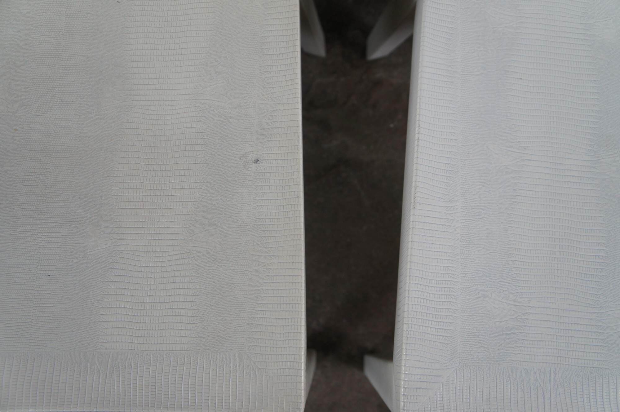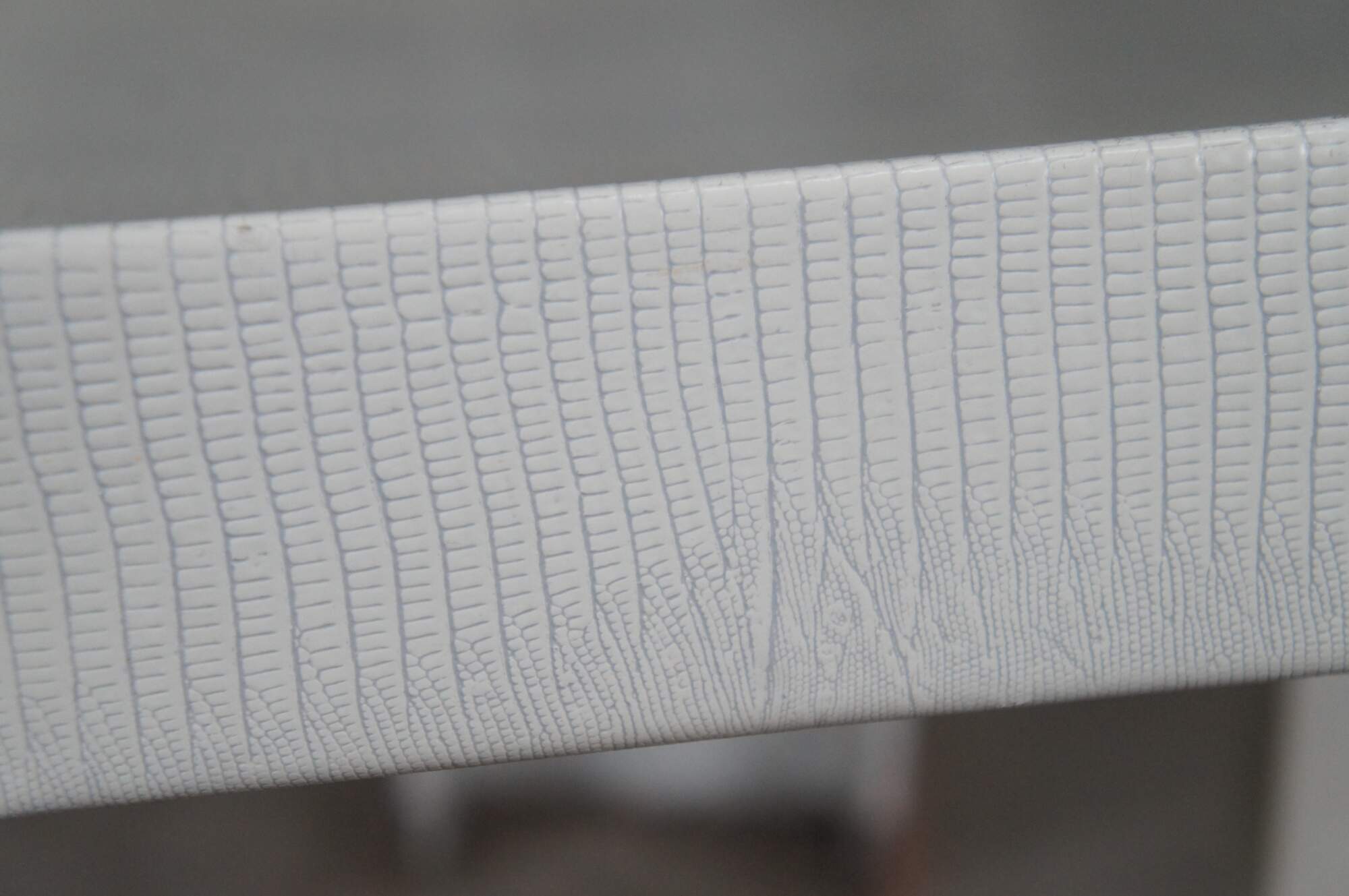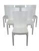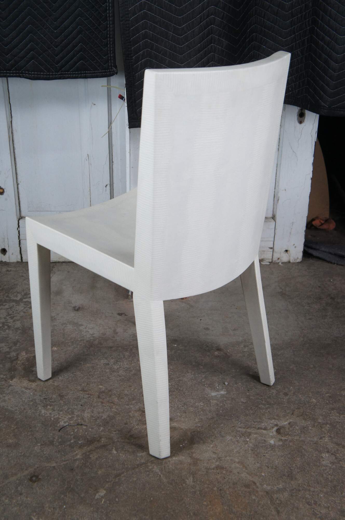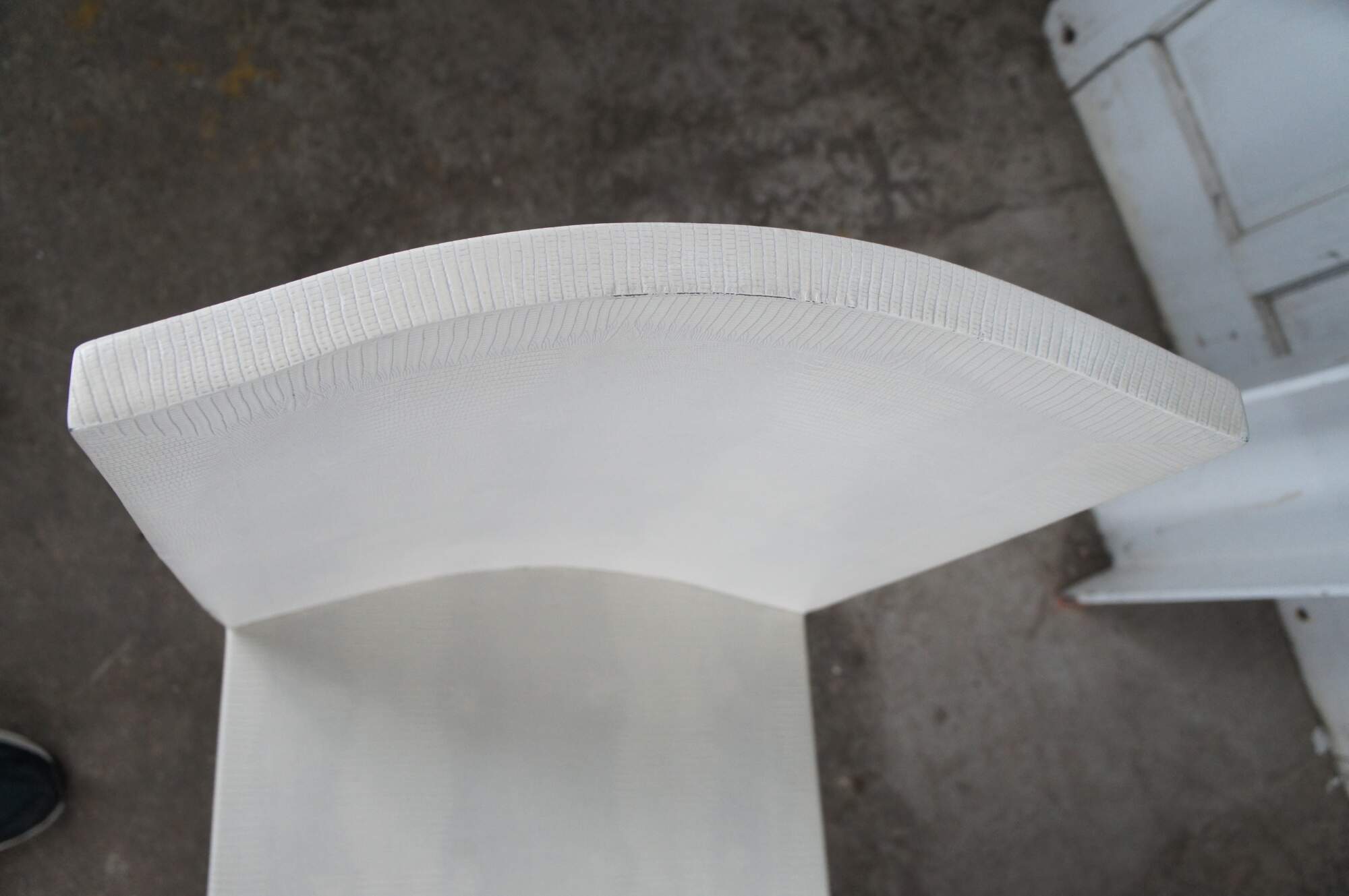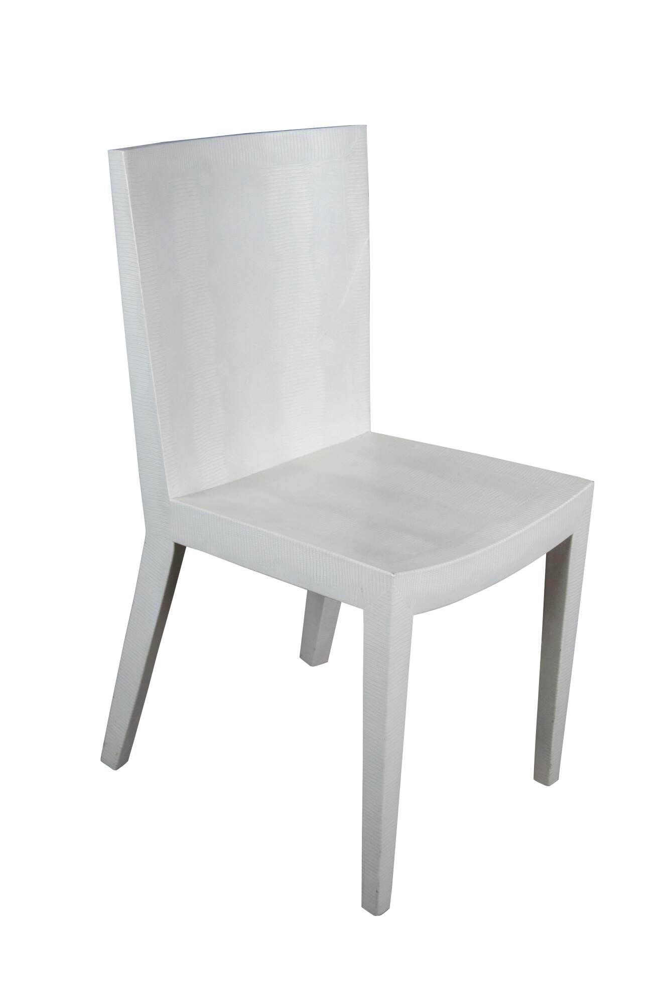 Set of six iconic J.M.F. Chairs signed by Karl Springer, circa 1986. Features a minimalist design with embossed lizard print frame. The chair features a curved back and contoured seat over square tapered legs. Signed along underside.