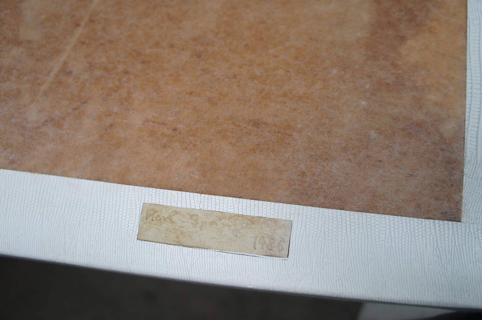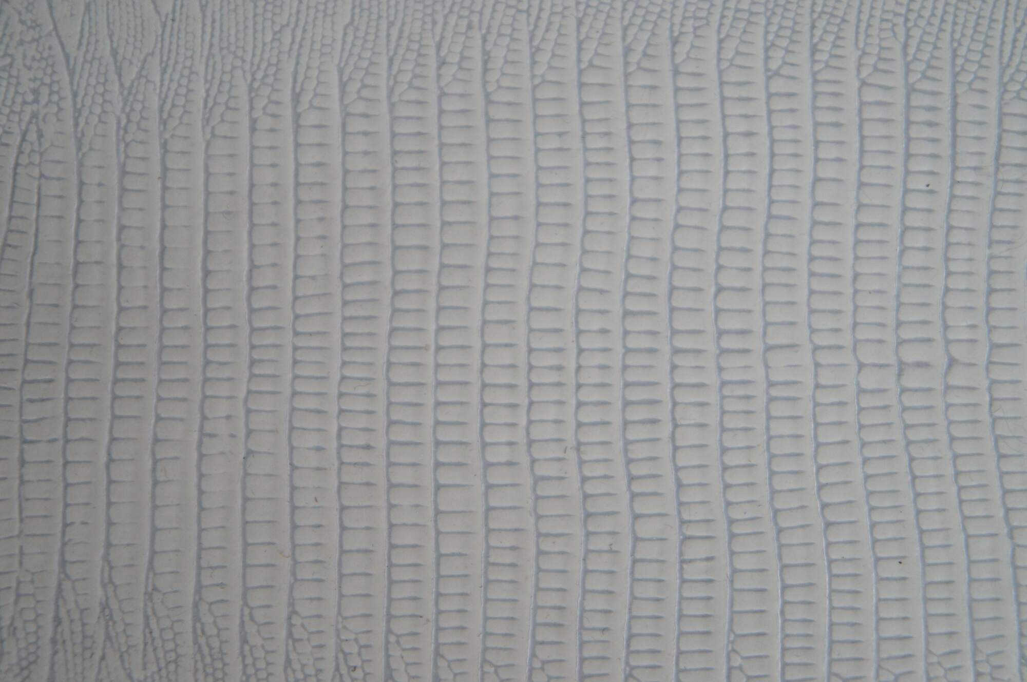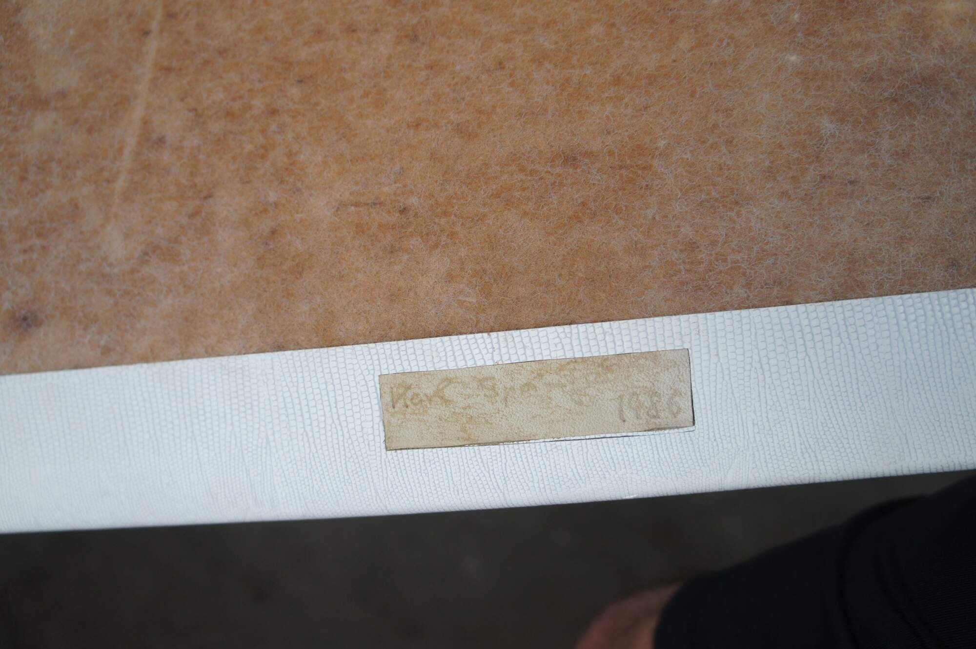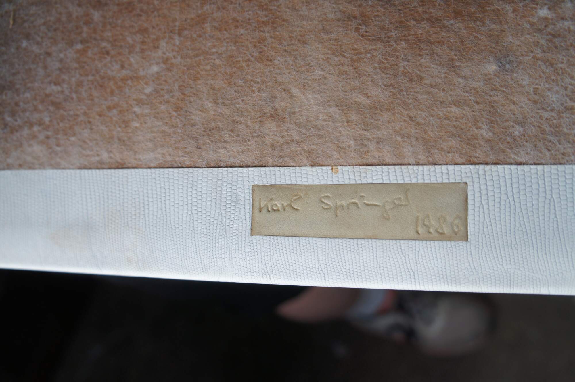 Set of six iconic J.M.F. Chairs signed by Karl Springer, circa 1986. Features a minimalist design with embossed lizard print frame. The chair features a curved back and contoured seat over square tapered legs. Signed along underside.