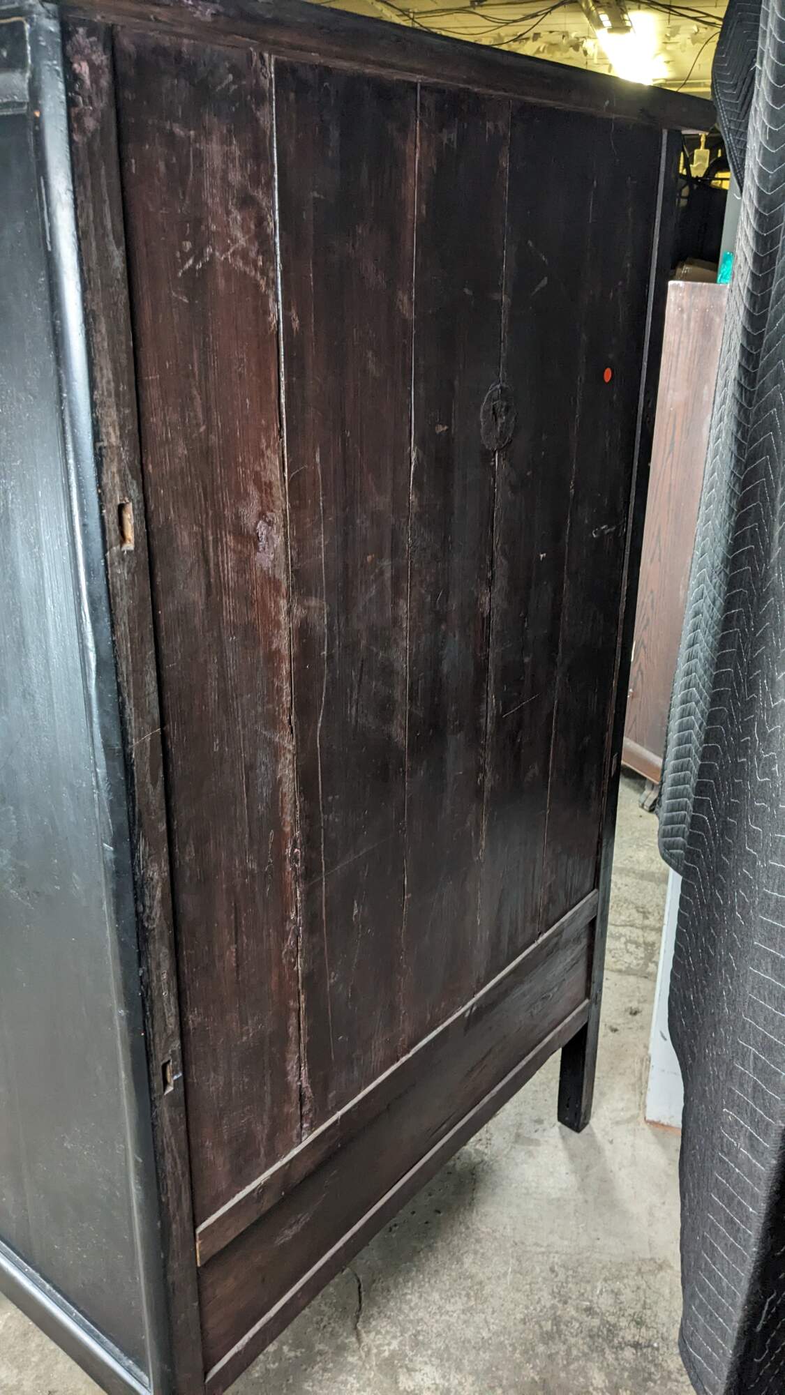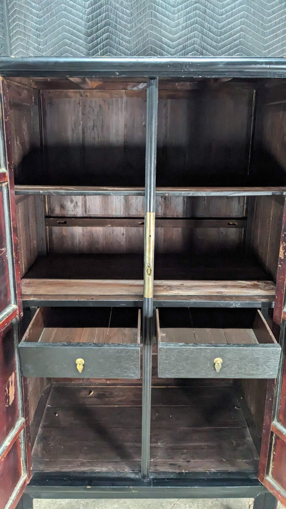 An Antique Chinese Qing Dynasty Wedding Cabinet. Features an elm frame with mortise and tenon construction and a black lacquer finish with brass hardware. Opens to two interior shelves and two dovetailed drawers. Traditional Ming styling with peg legged base.