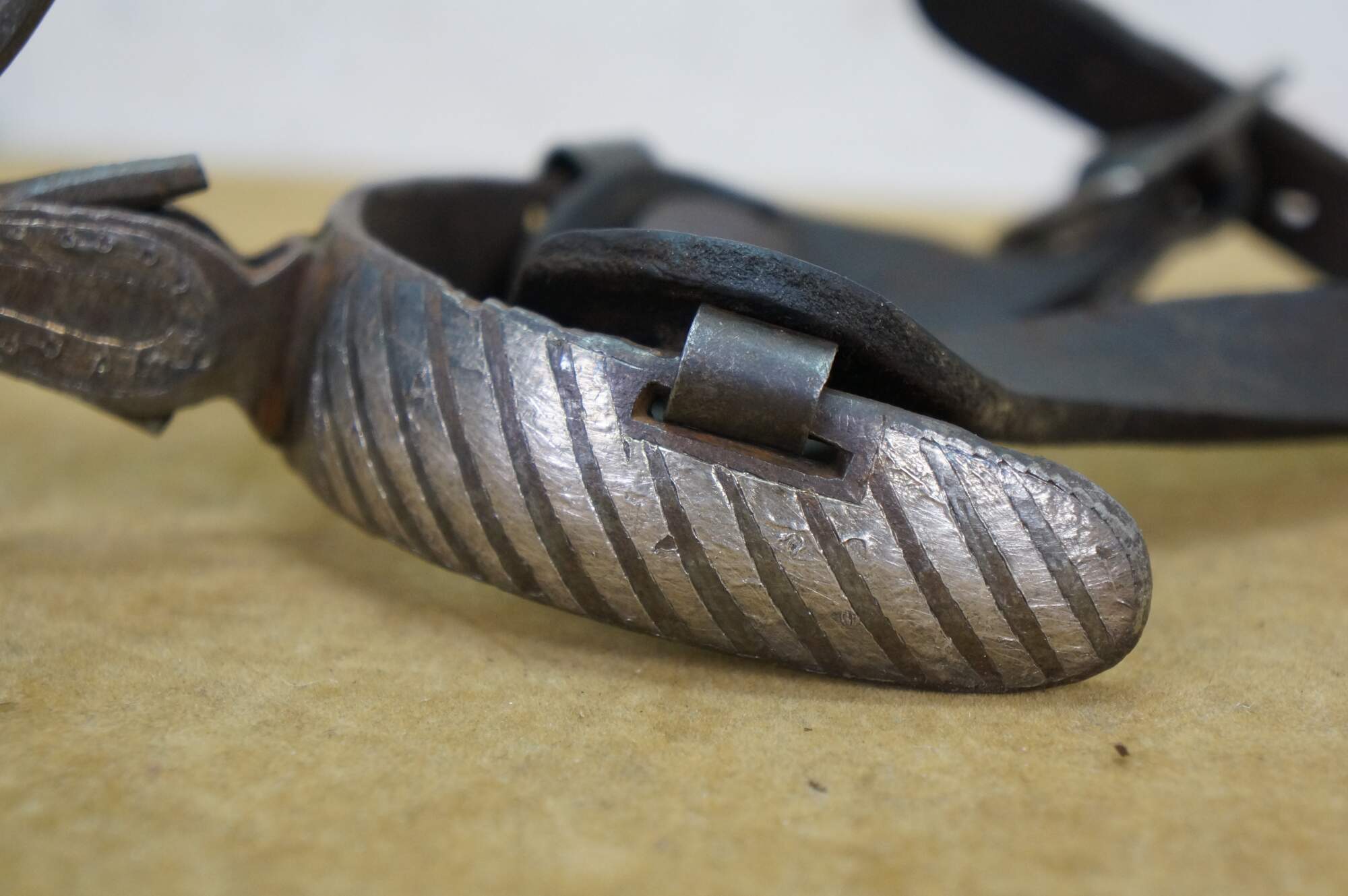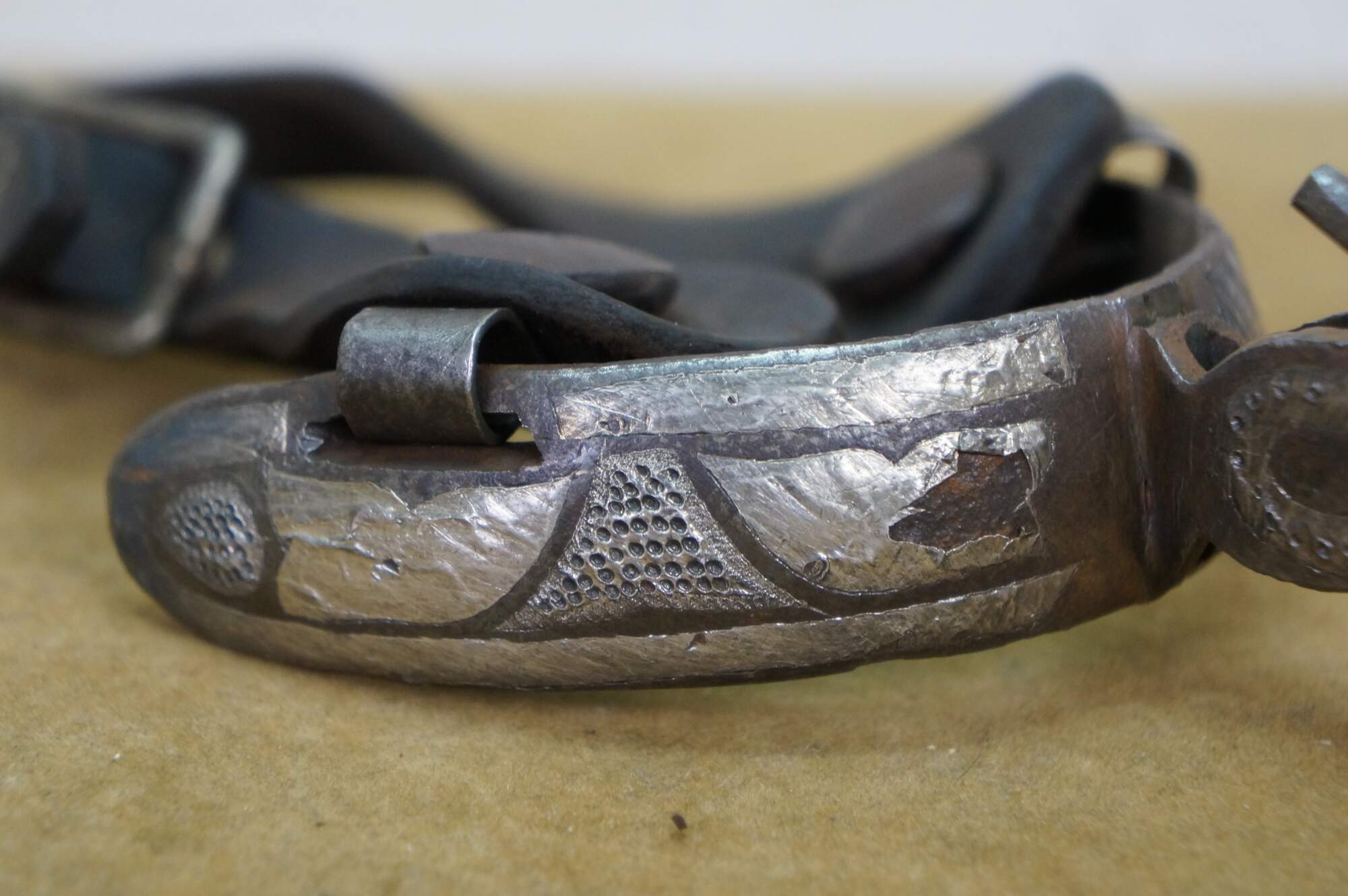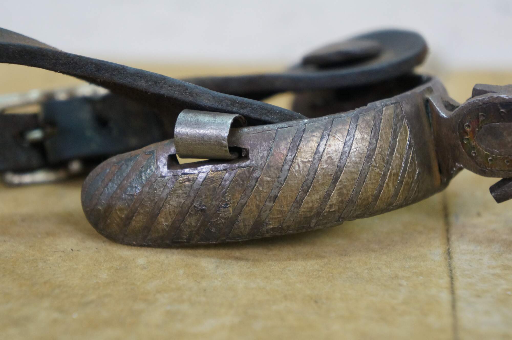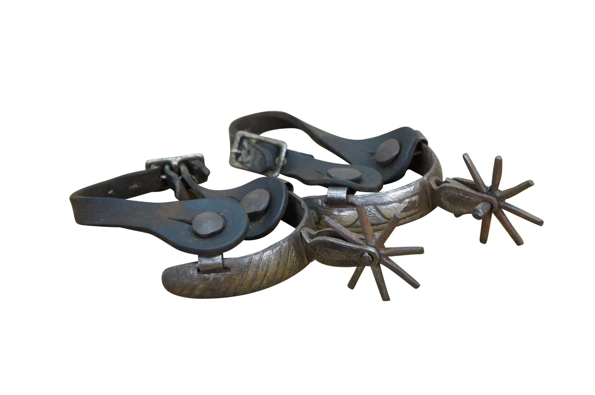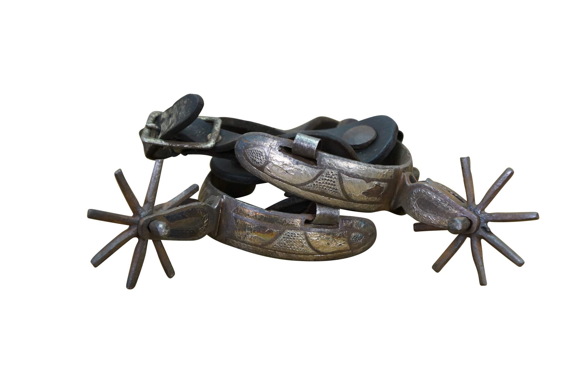 Antique Western / Southwestern Mexican Spanish Cowboy equestrian / horseshoe Charro spurs made of wrought iron with copper inlay and leather straps.