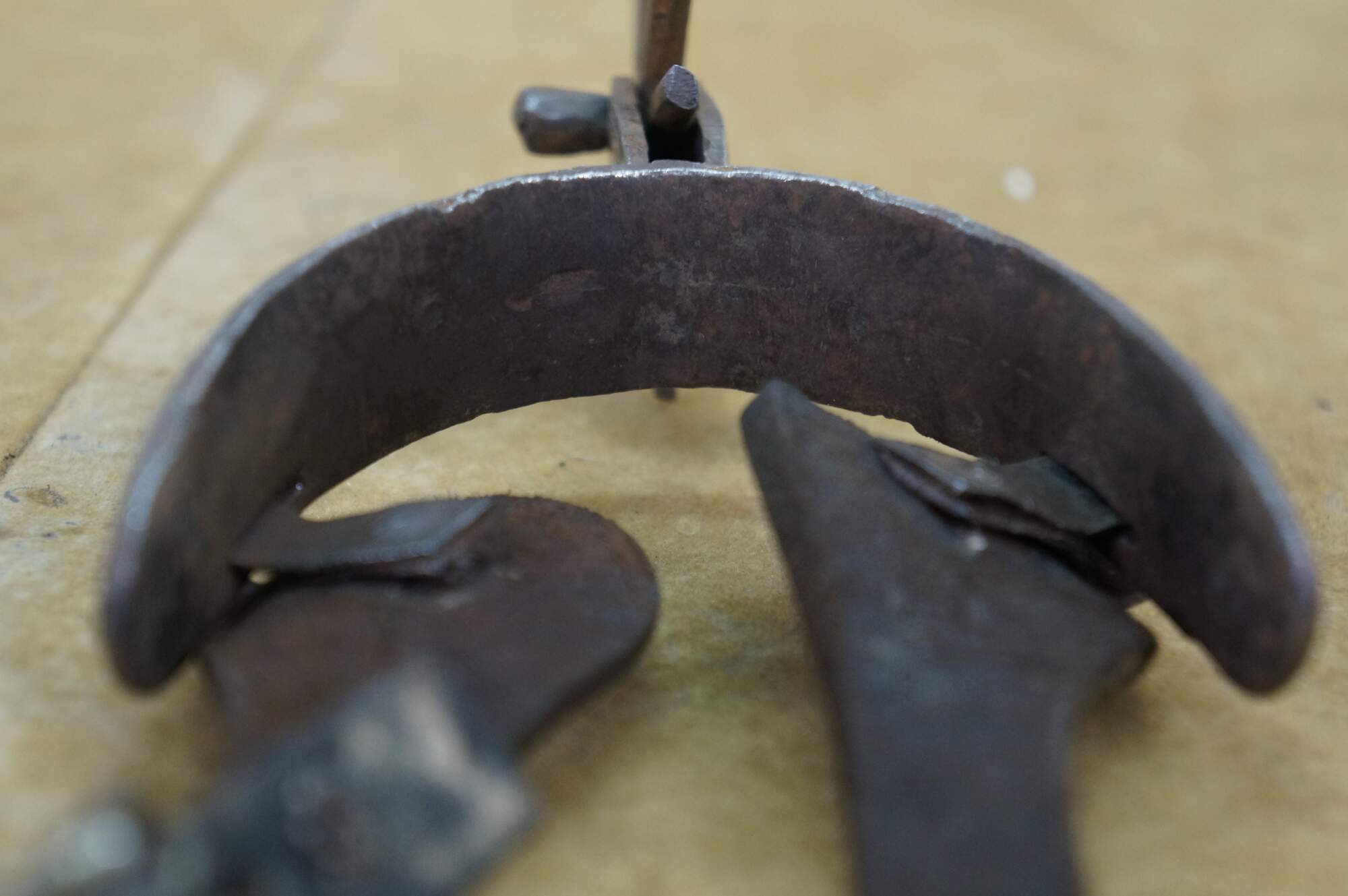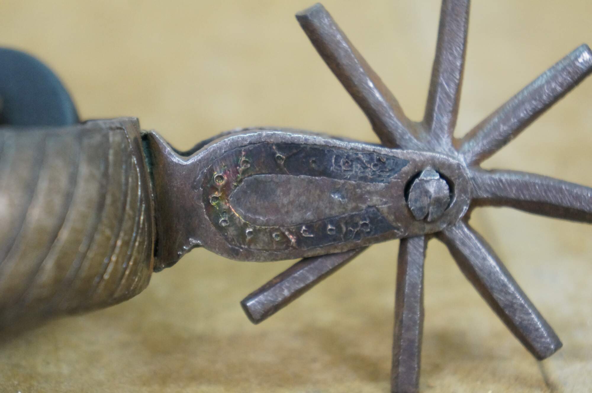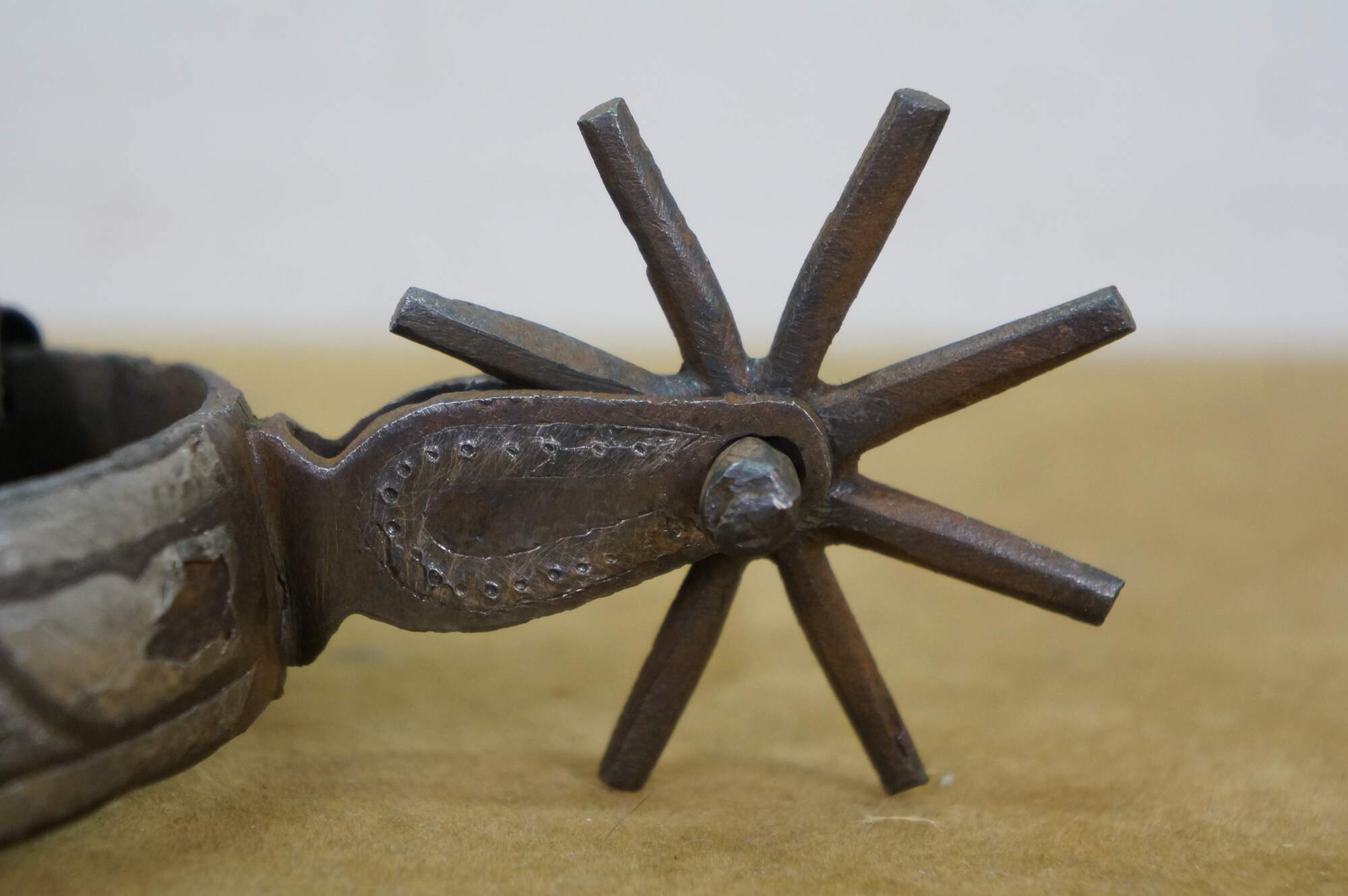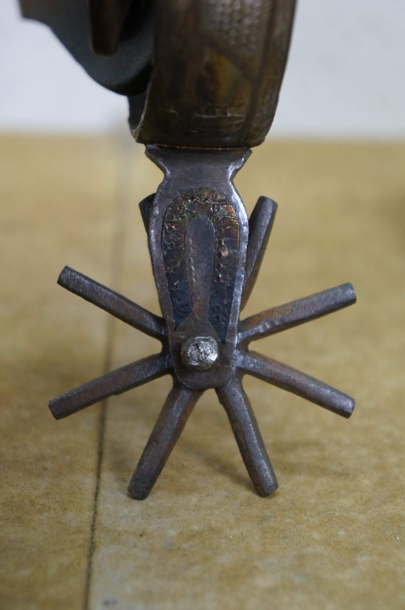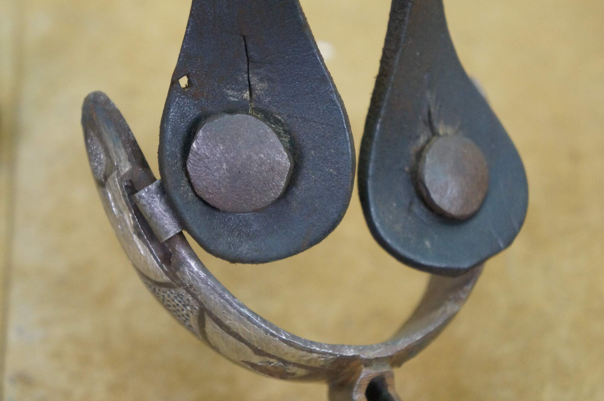 Antique Western / Southwestern Mexican Spanish Cowboy equestrian / horseshoe Charro spurs made of wrought iron with copper inlay and leather straps.