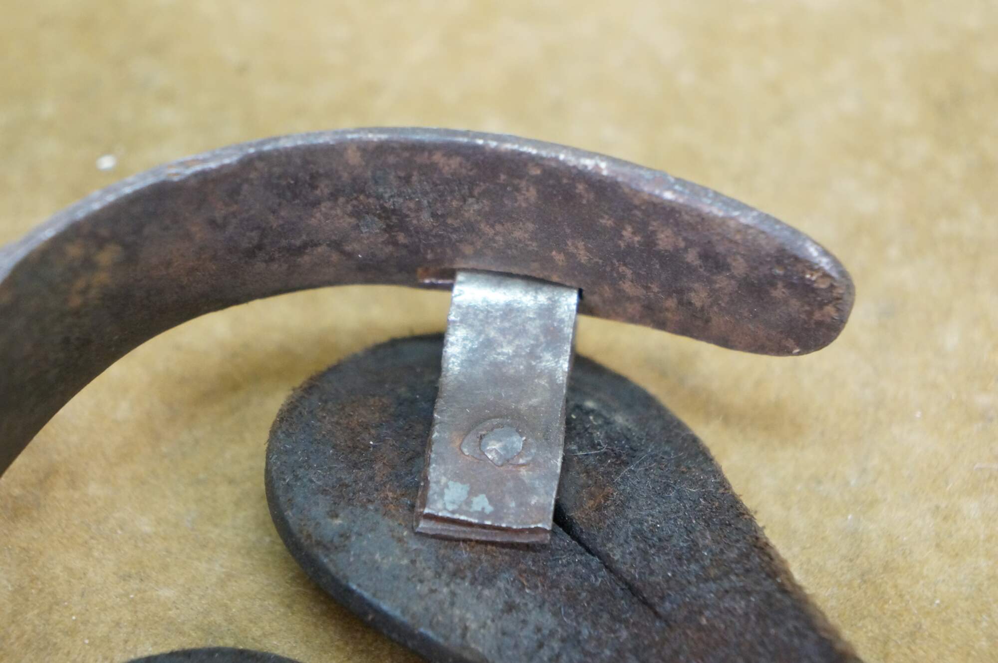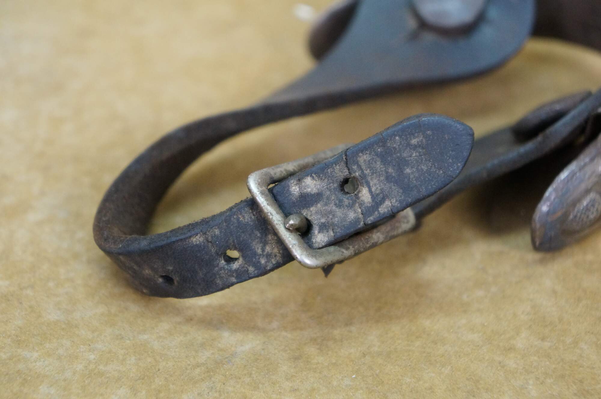 Gentle wear/tarnish/oxidation to metal; stains to leather