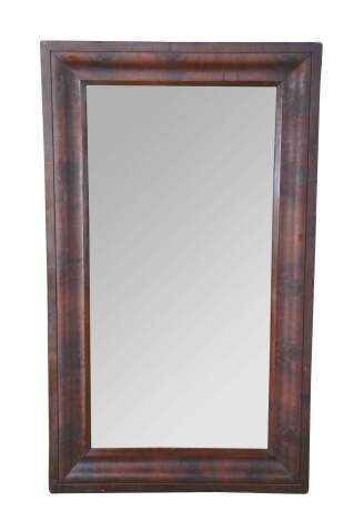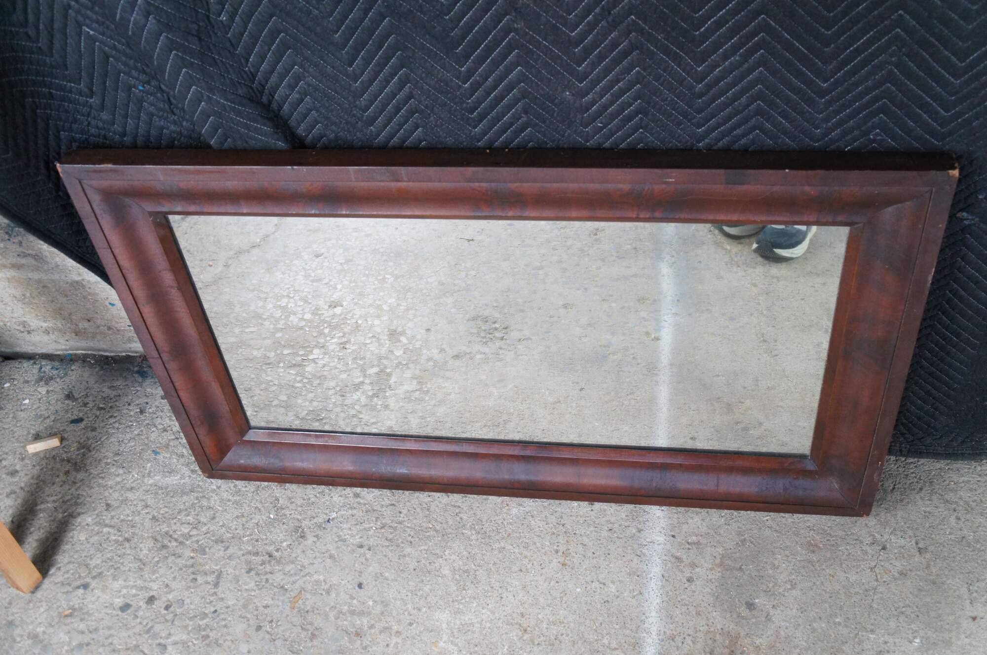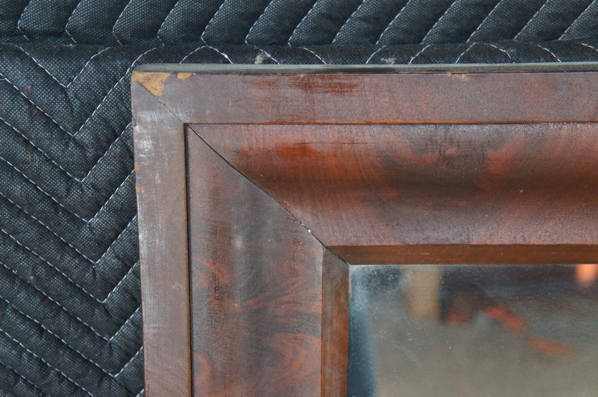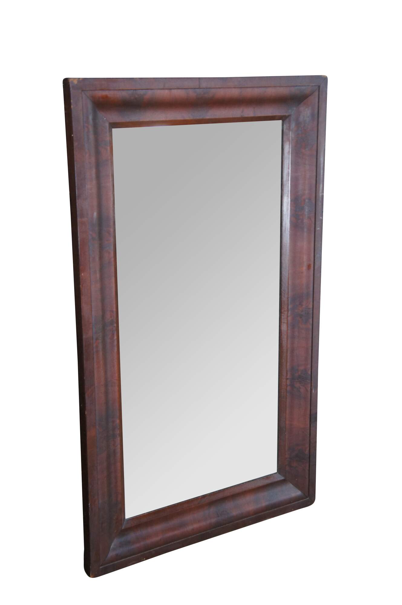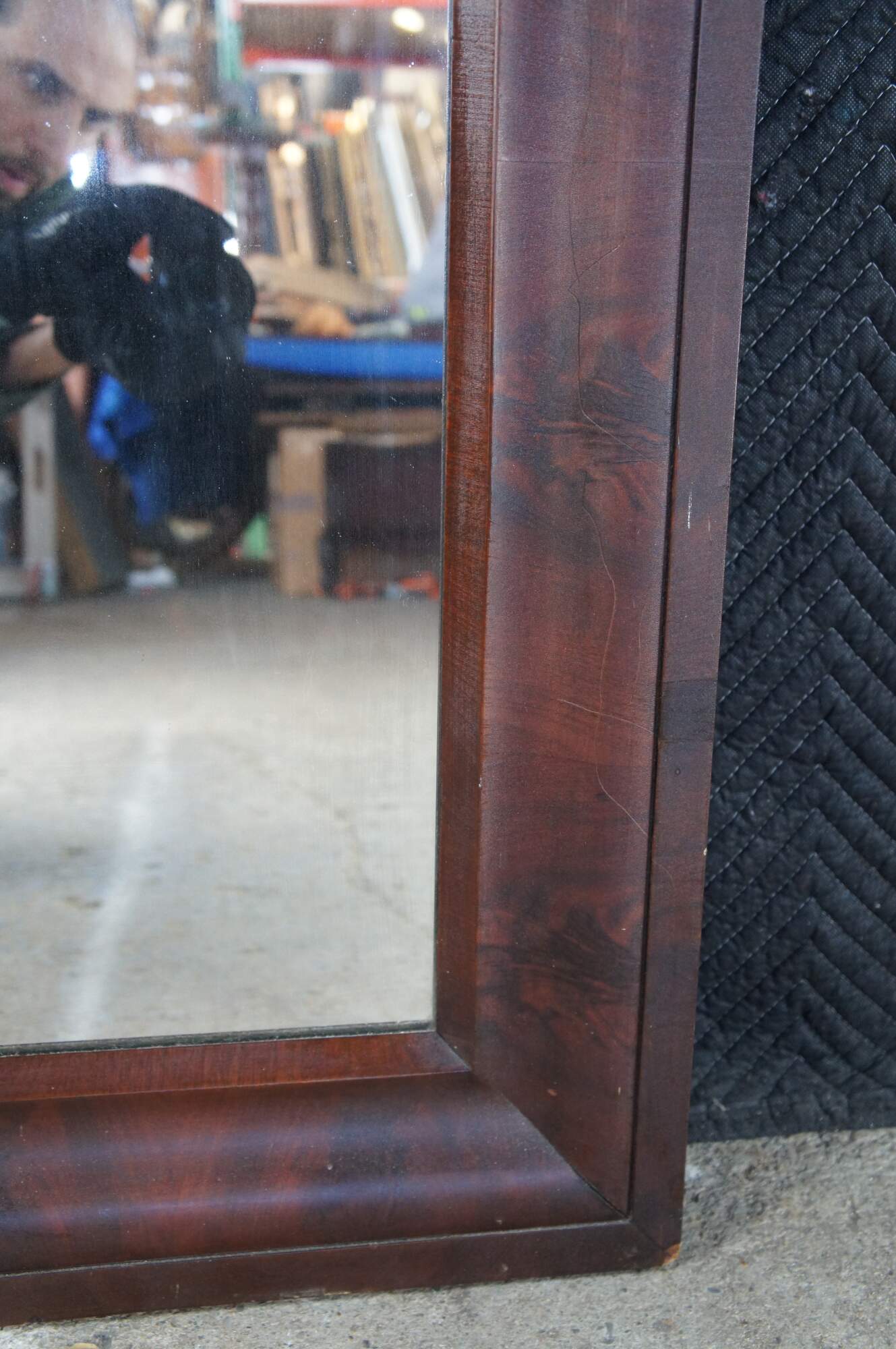 A very large and impressive antique American Empire wall vanity mirror, made of flamed mahogany featuring rectangular form with a deep beveled frame.