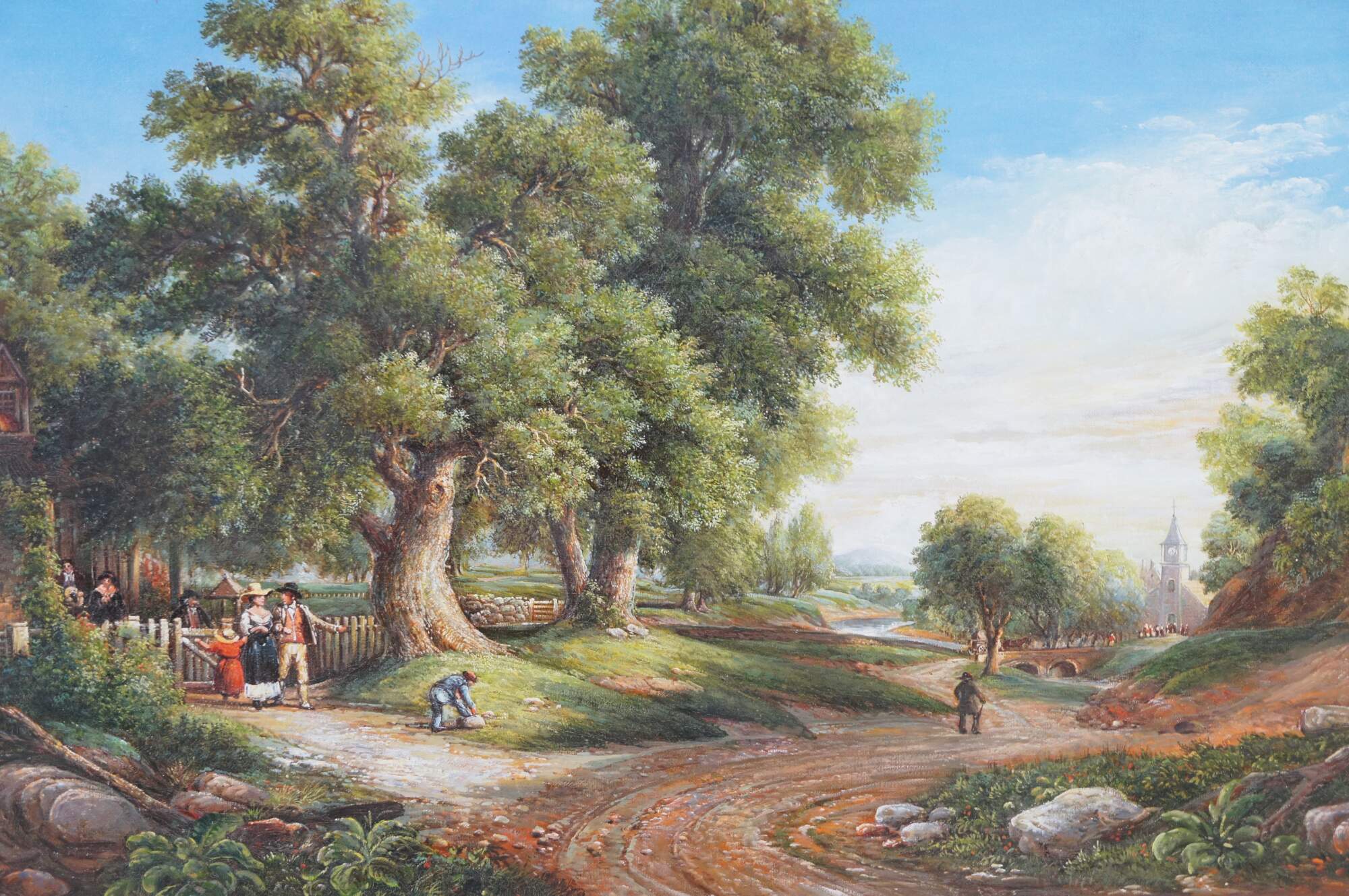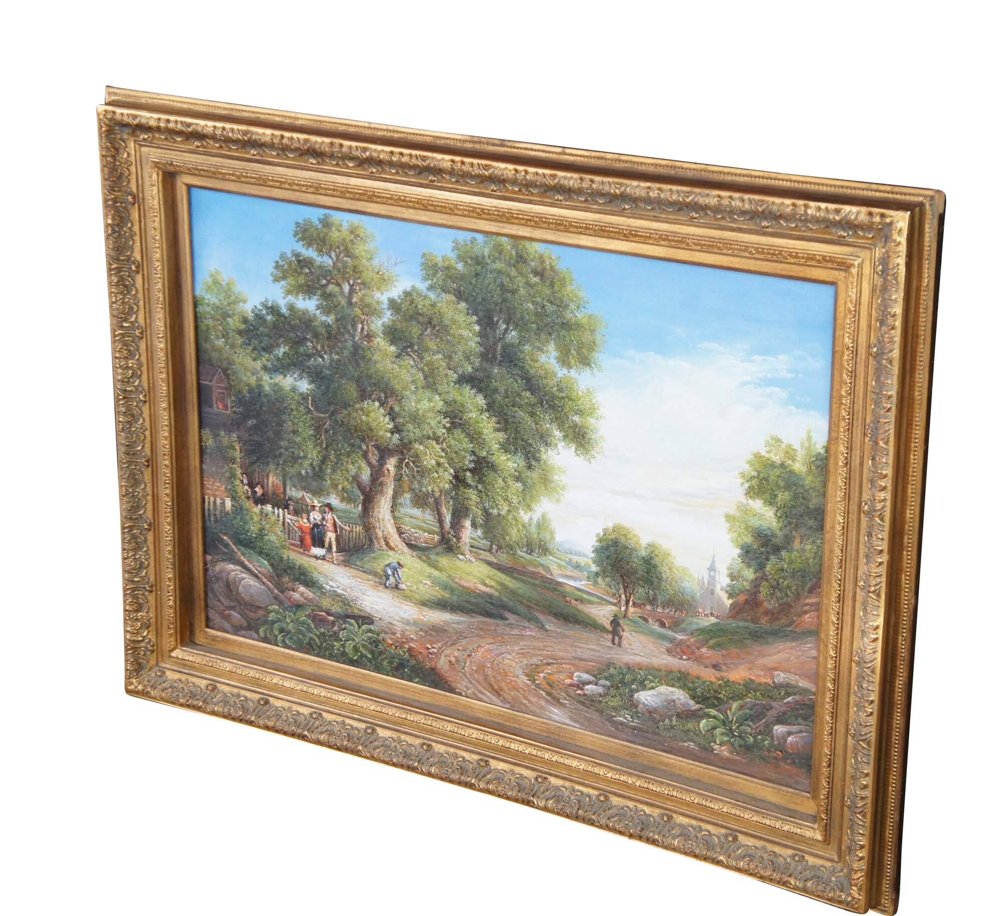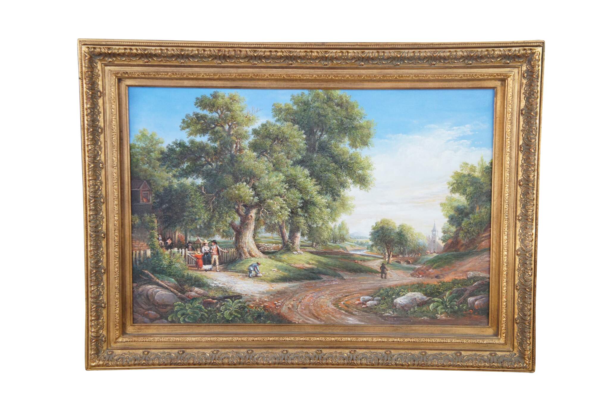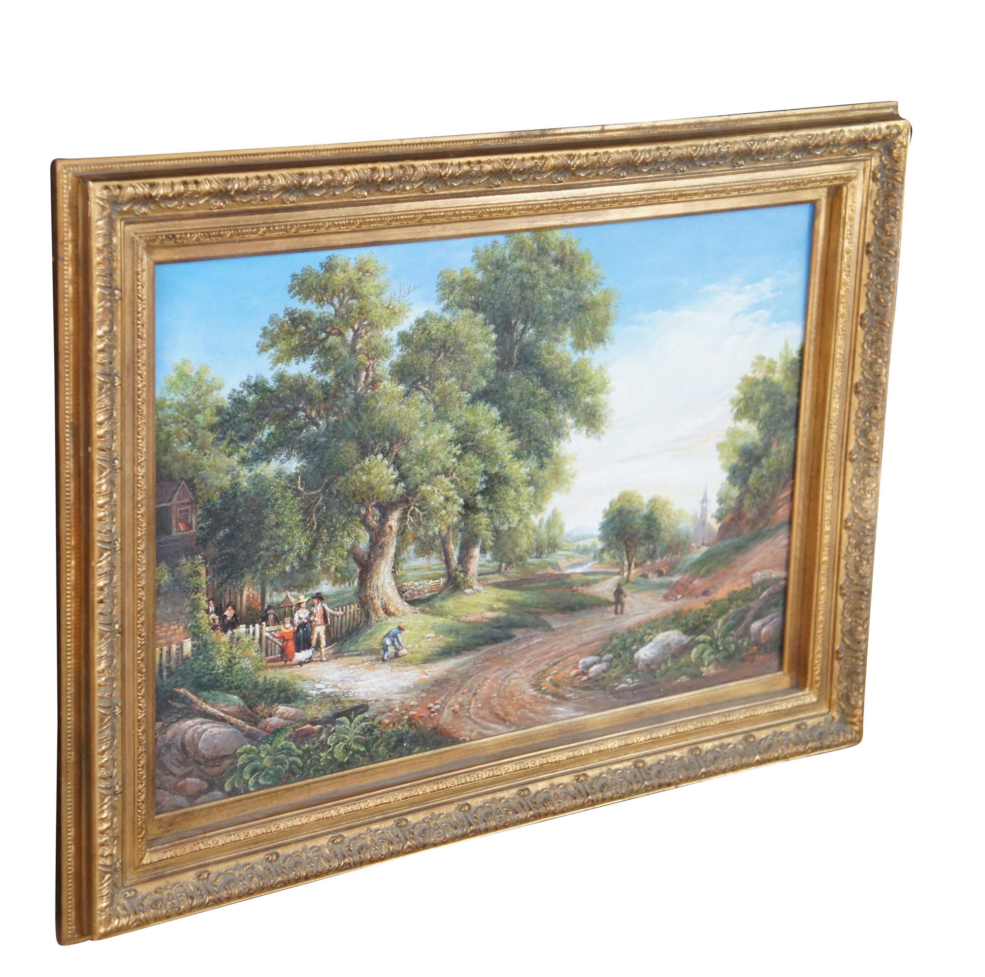 Vintage Sunday Morning oil painting after Asher Brown Durand. The artwork captures a tranquil Sunday morning scene, enveloped in the serene beauty of nature. In the foreground, majestic trees frame the scene, their verdant leaves reaching towards an expansive, light-filled sky, towering over the old country farmhouse where figures are leaving for church. The landscape opens up to a gentle hill upon which rests a quaint church, its steeple piercing the horizon. A cobblestone path meanders towards the church, along which a horse and buggy / figures in the distance stroll on their way to a morning service, adding a sense of community and peacefulness to the composition. A river runs through the middle ground, crossed by a stone bridge, while in the background, rolling hills stretch towards the horizon. Grazing animals and lush greenery further contribute to the idyllic and harmonious atmosphere that characterizes this quintessential Romantic landscape.