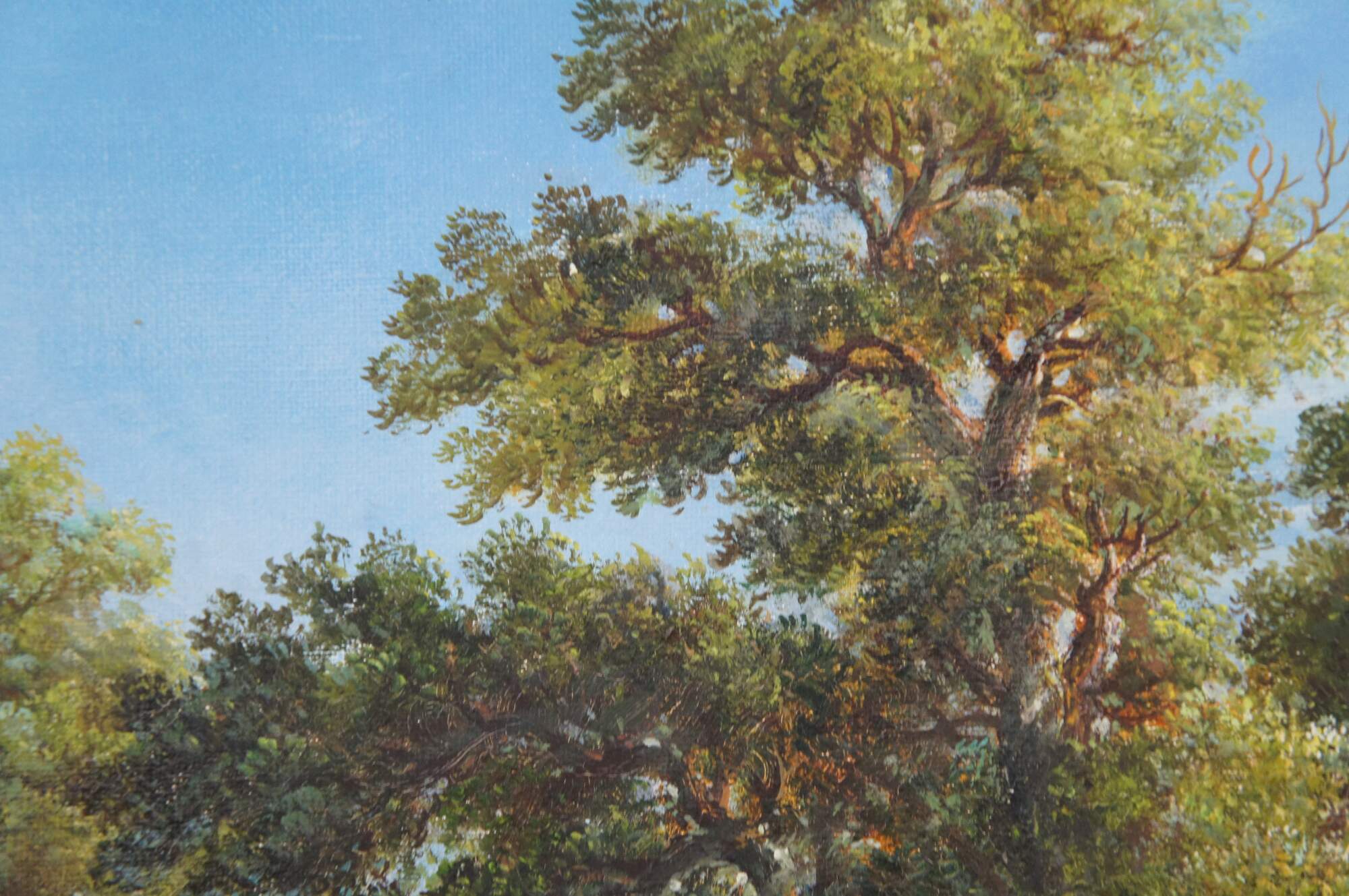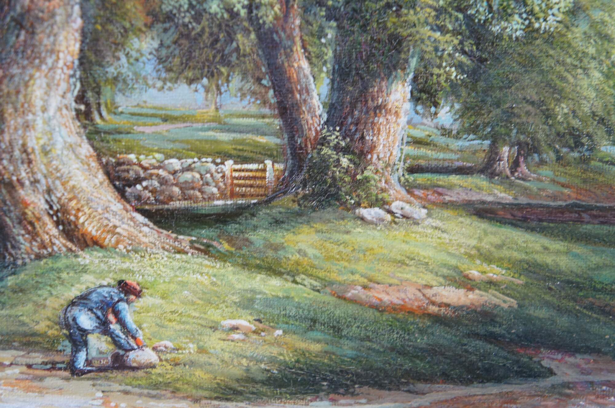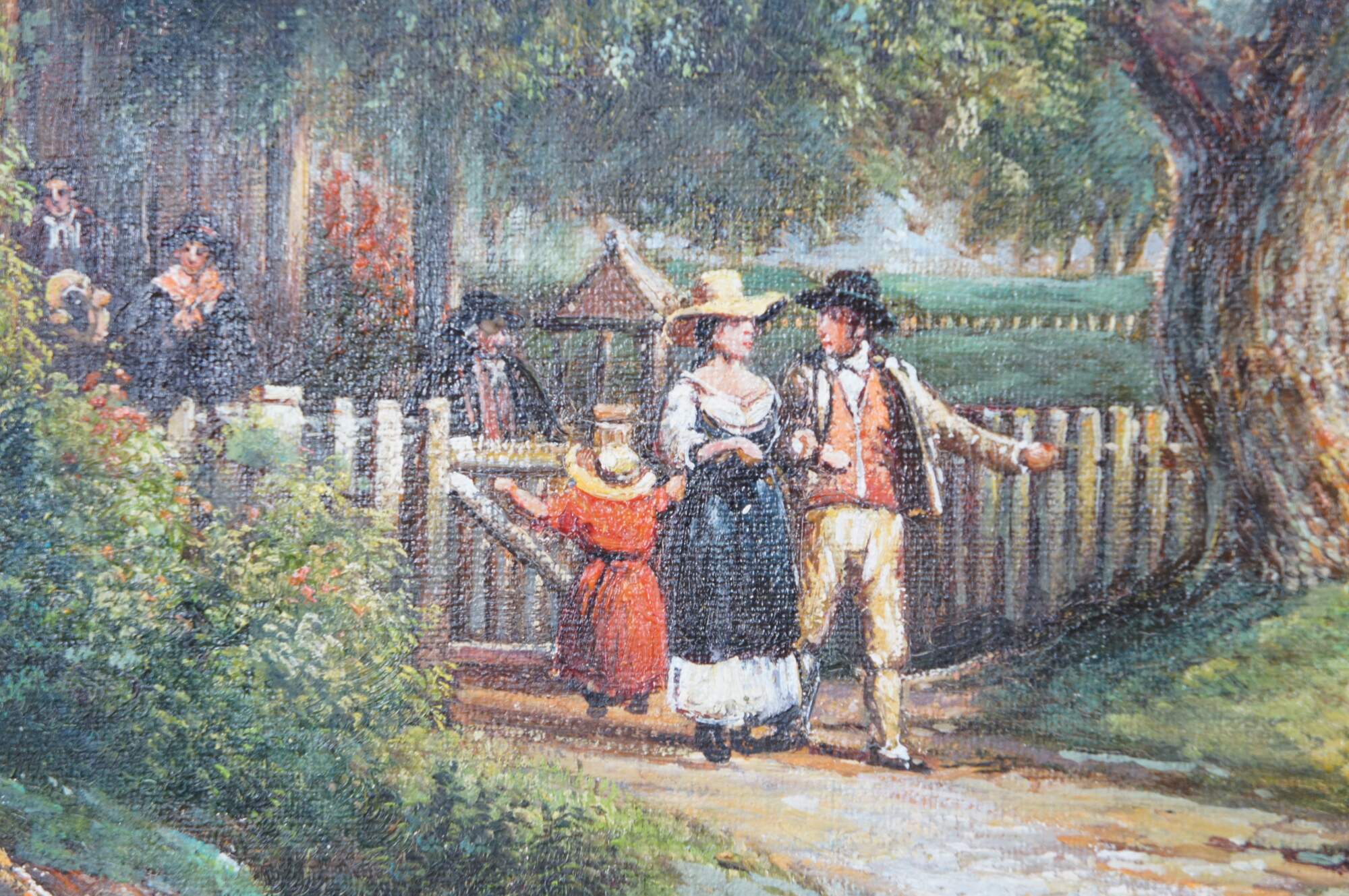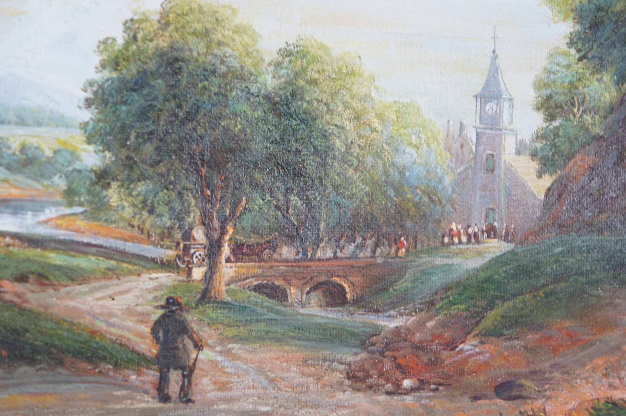 Vintage Sunday Morning oil painting after Asher Brown Durand. The artwork captures a tranquil Sunday morning scene, enveloped in the serene beauty of nature. In the foreground, majestic trees frame the scene, their verdant leaves reaching towards an expansive, light-filled sky, towering over the old country farmhouse where figures are leaving for church. The landscape opens up to a gentle hill upon which rests a quaint church, its steeple piercing the horizon. A cobblestone path meanders towards the church, along which a horse and buggy / figures in the distance stroll on their way to a morning service, adding a sense of community and peacefulness to the composition. A river runs through the middle ground, crossed by a stone bridge, while in the background, rolling hills stretch towards the horizon. Grazing animals and lush greenery further contribute to the idyllic and harmonious atmosphere that characterizes this quintessential Romantic landscape.