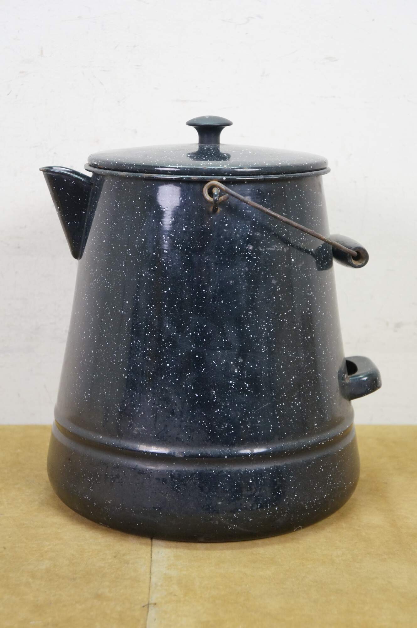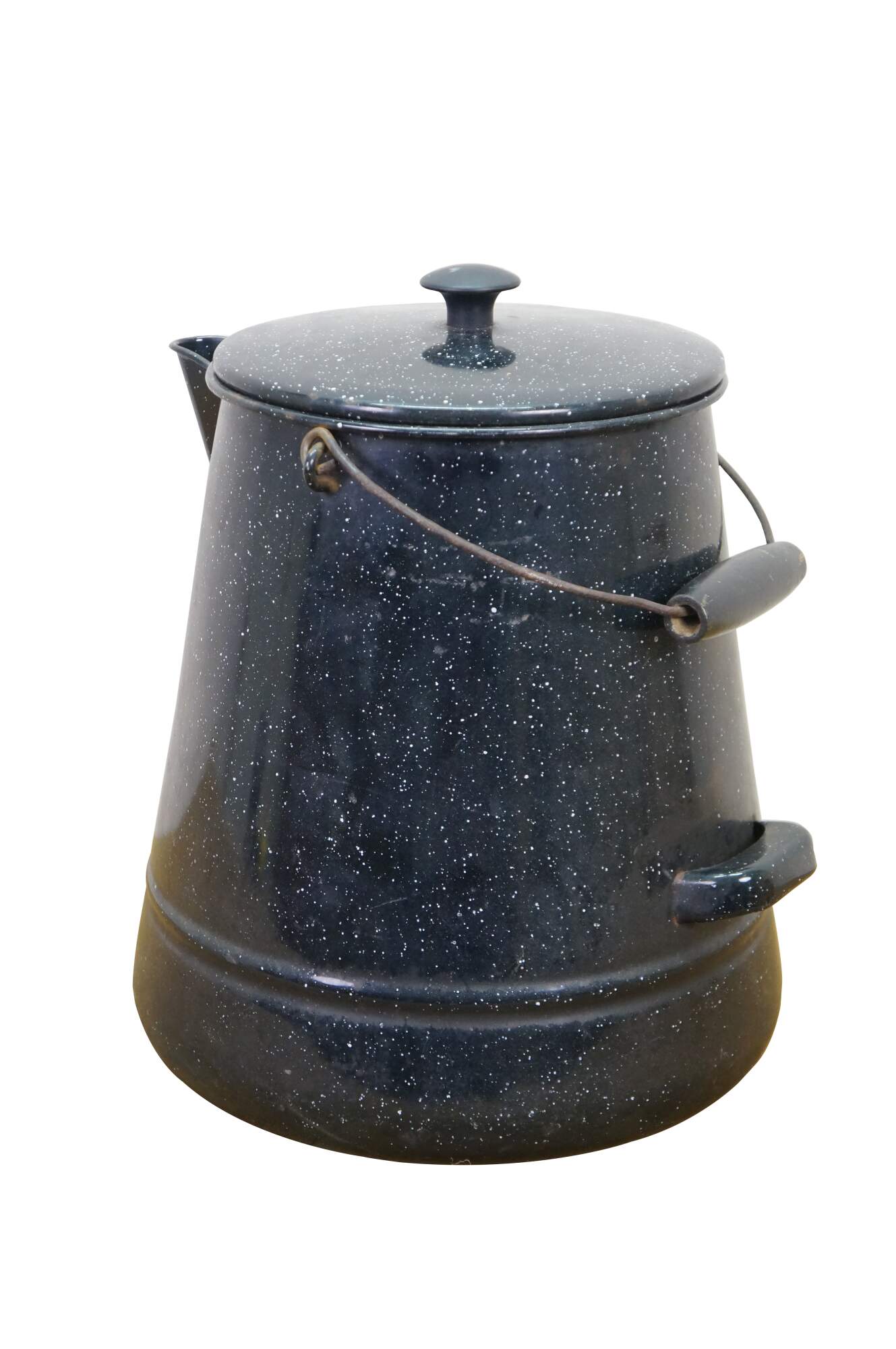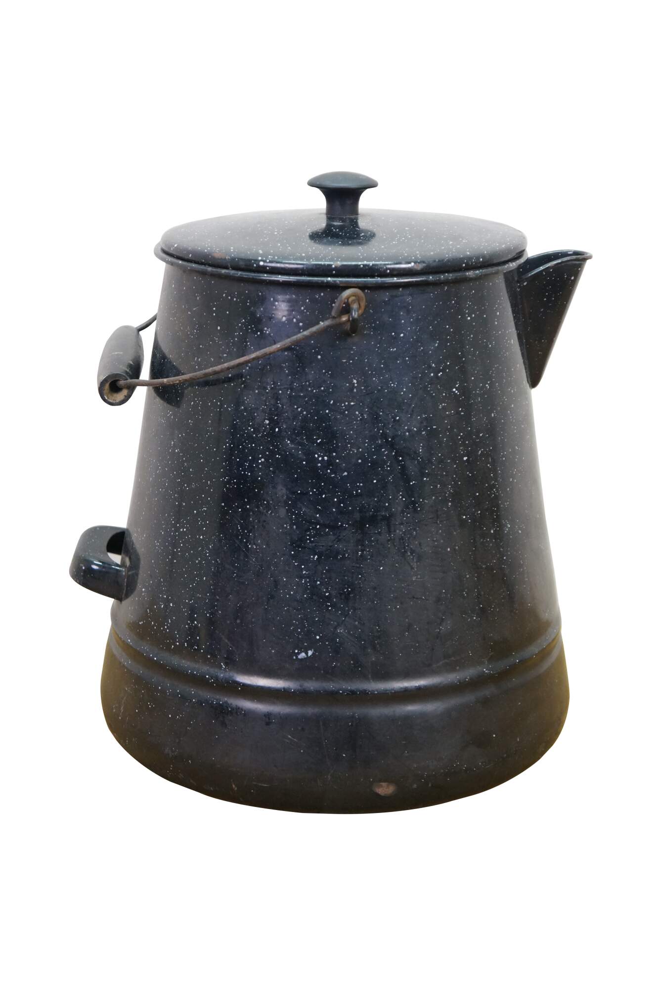 Antique graniteware / enamelware coffee / tea / water pot / pitcher / kettle. It is made of metal coated in a speckled, rust-resistant black porcelain enamel.� The pot includes a bale handle with a wooden grip for lifting, a sturdy spout, and a lid.� Campfire, Camping, Farmhouse.