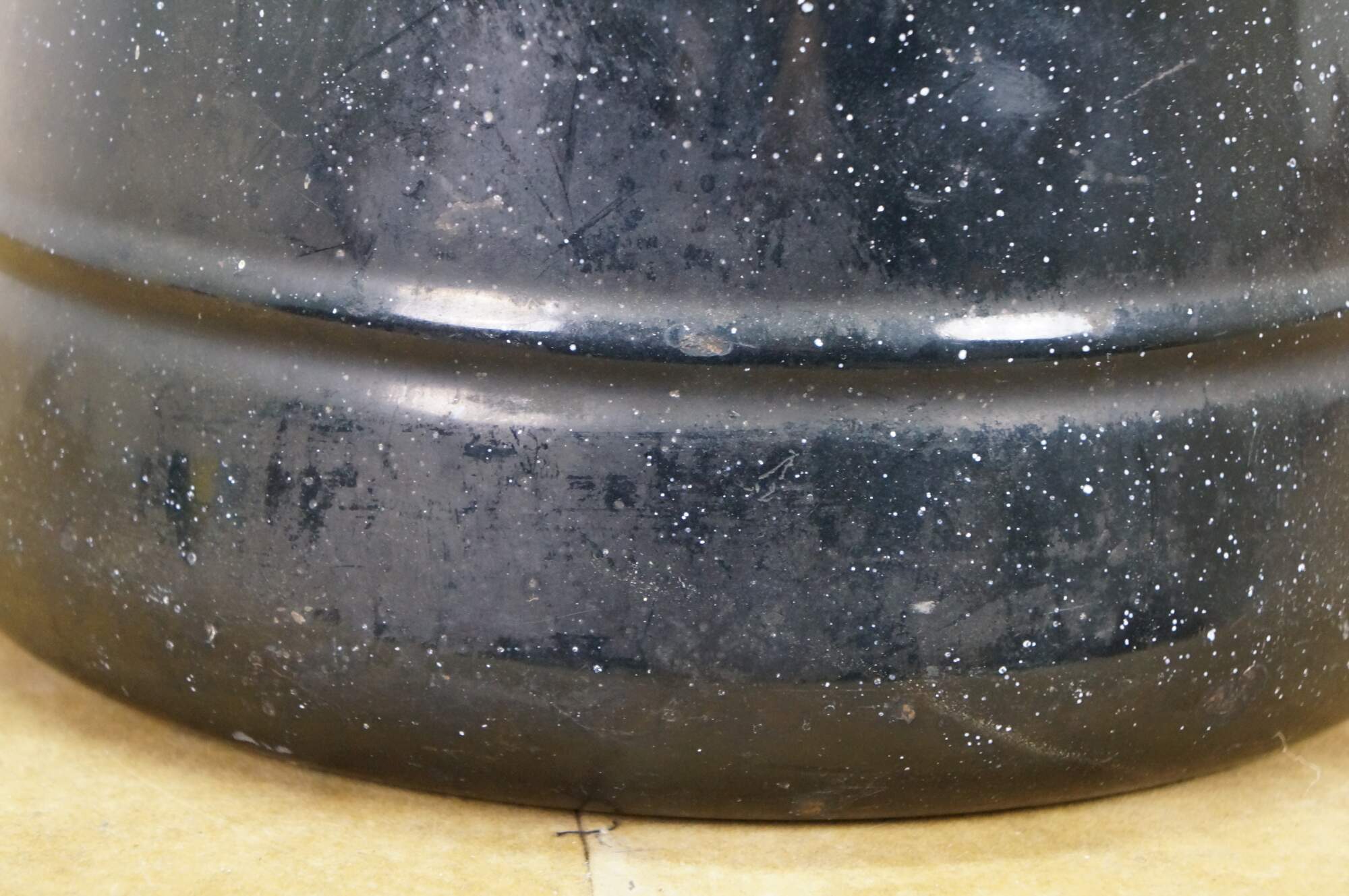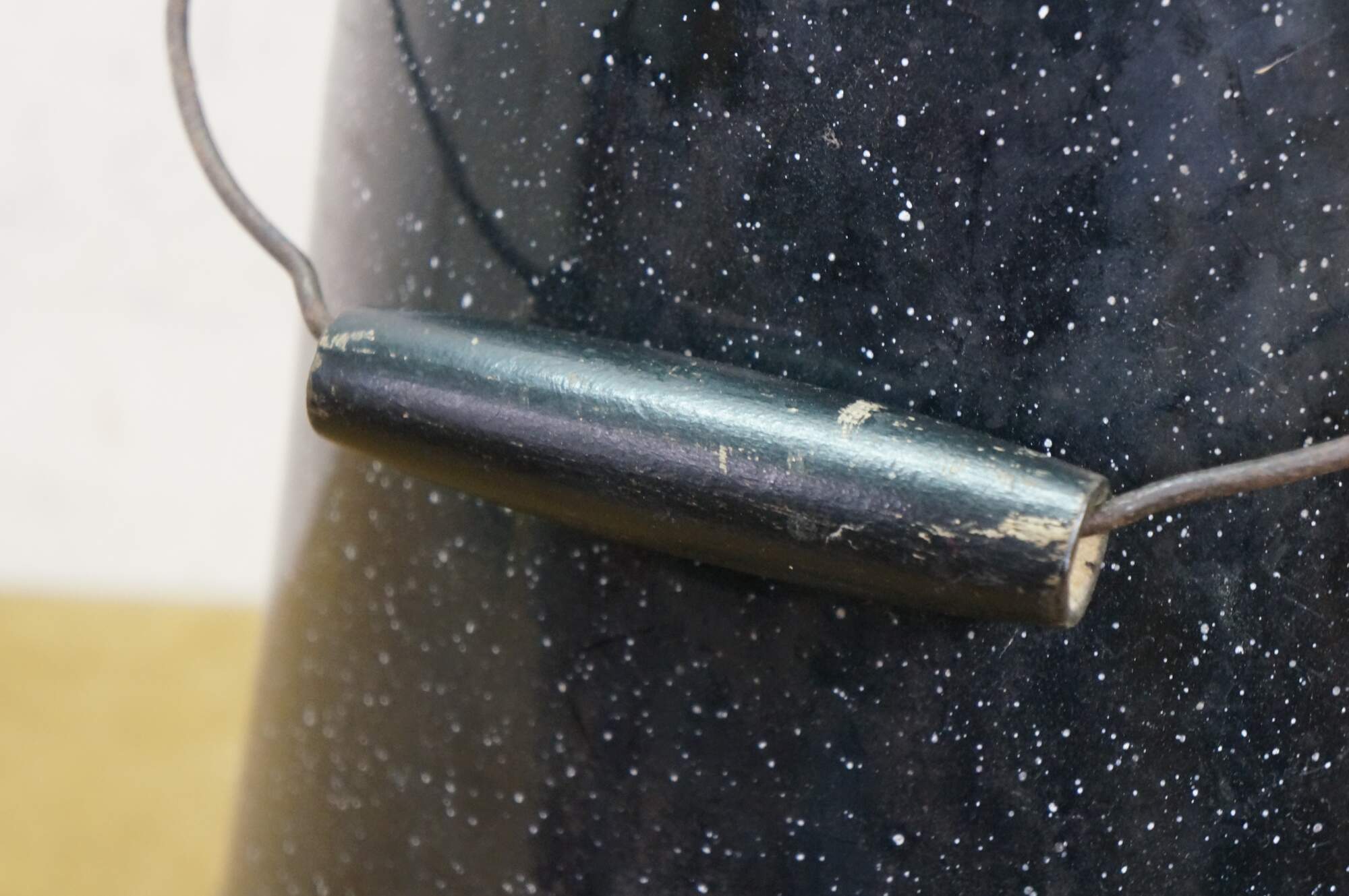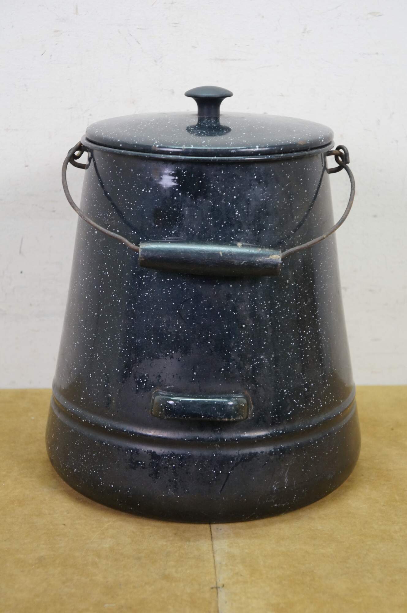 Antique graniteware / enamelware coffee / tea / water pot / pitcher / kettle. It is made of metal coated in a speckled, rust-resistant black porcelain enamel.� The pot includes a bale handle with a wooden grip for lifting, a sturdy spout, and a lid.� Campfire, Camping, Farmhouse.