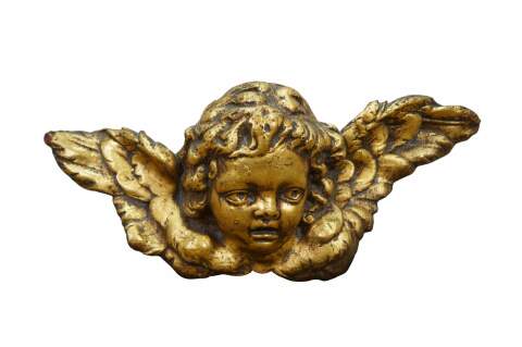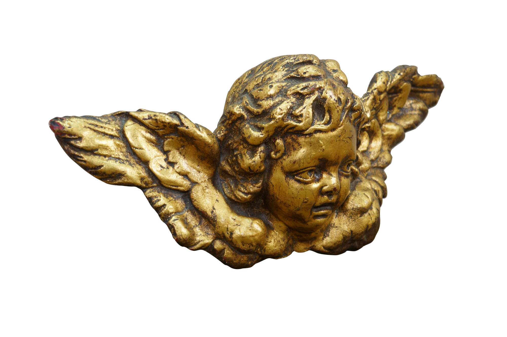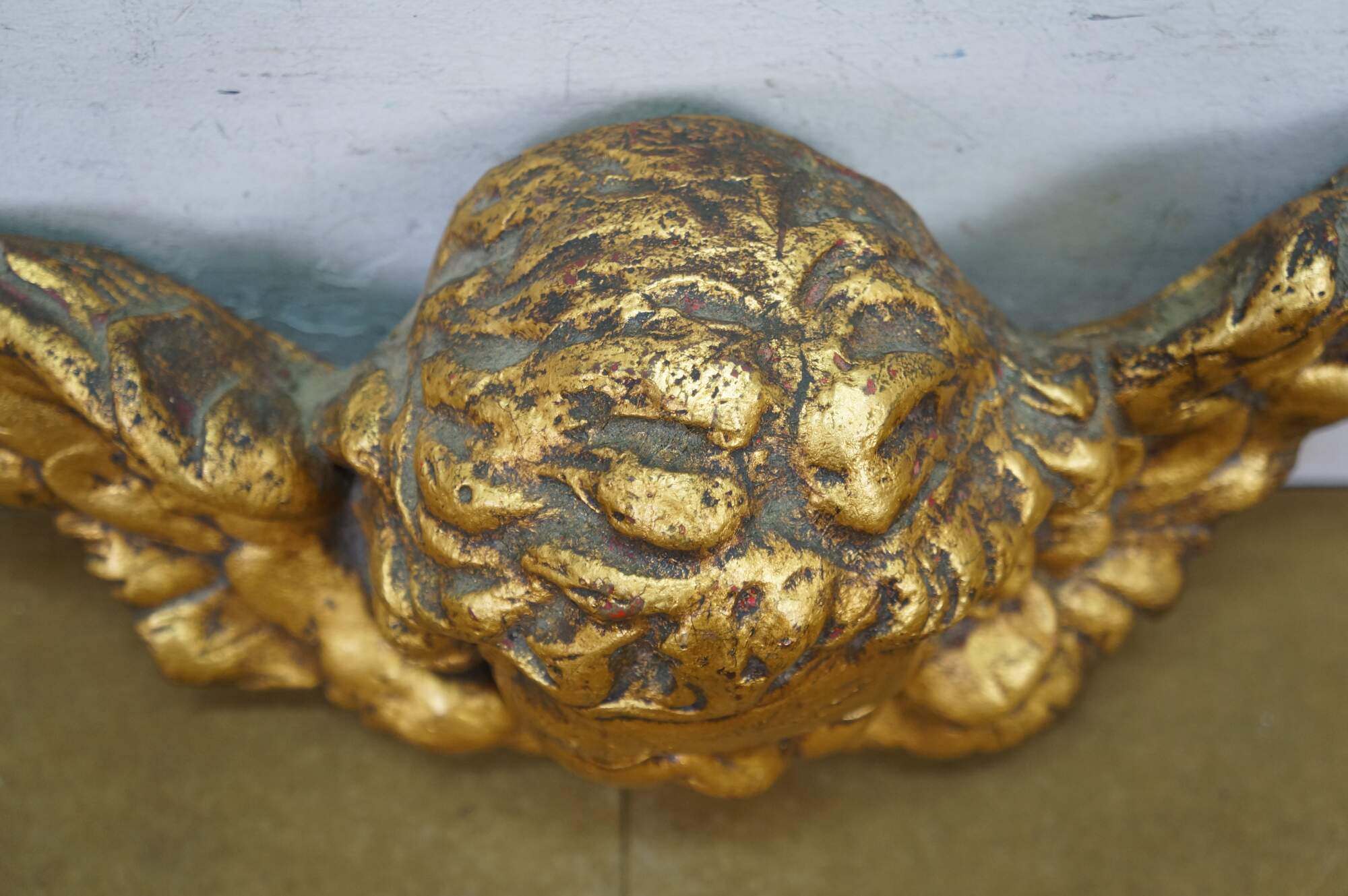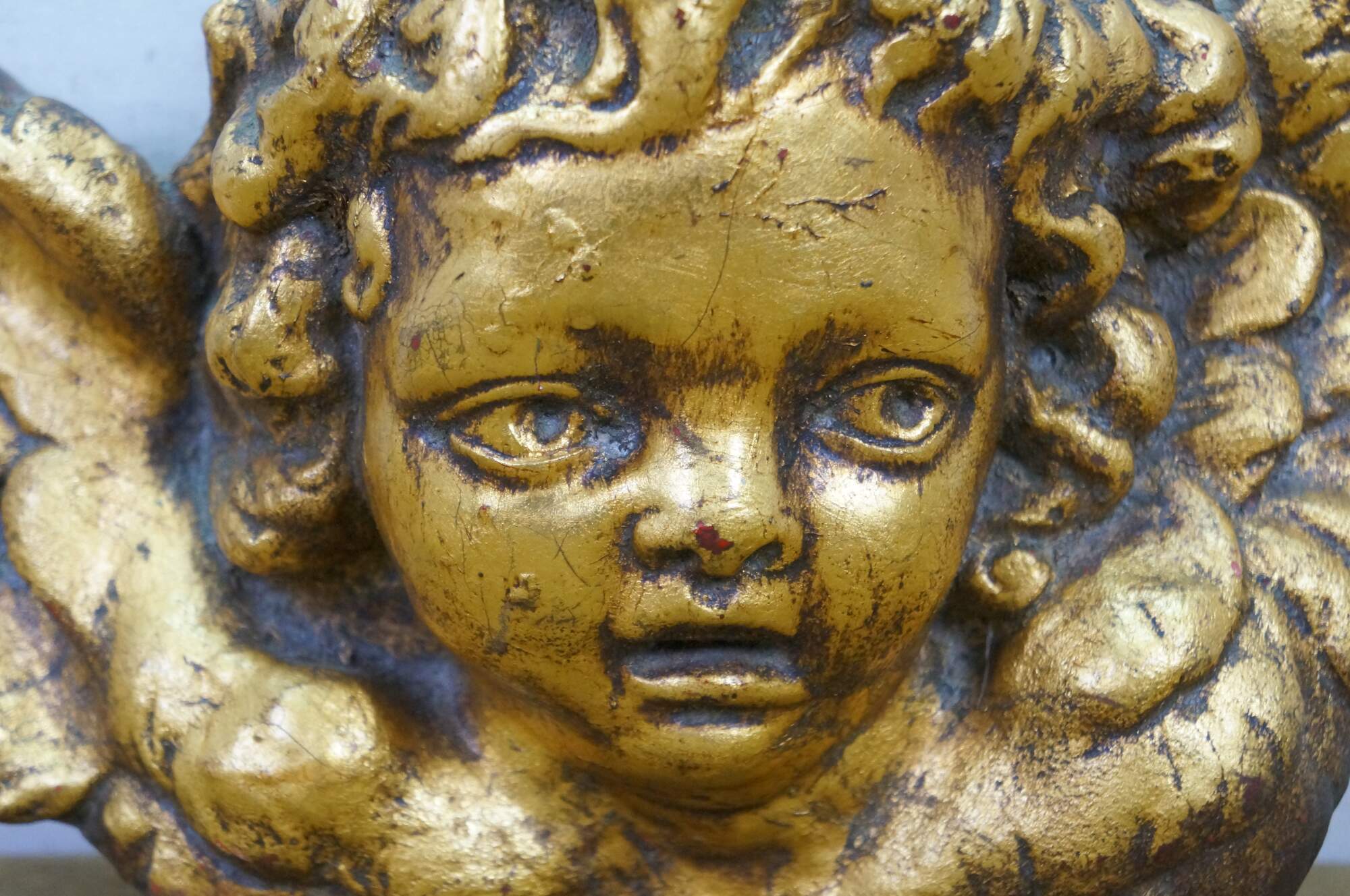 Large vintage Baroque / Rococo / Hollywood Regency style cherub / putti wall plaque sculpture, typically made of plaster or resin with a gold leaf / gilt finish.� Features a winged angelic head and shoulders, designed to project from a wall.