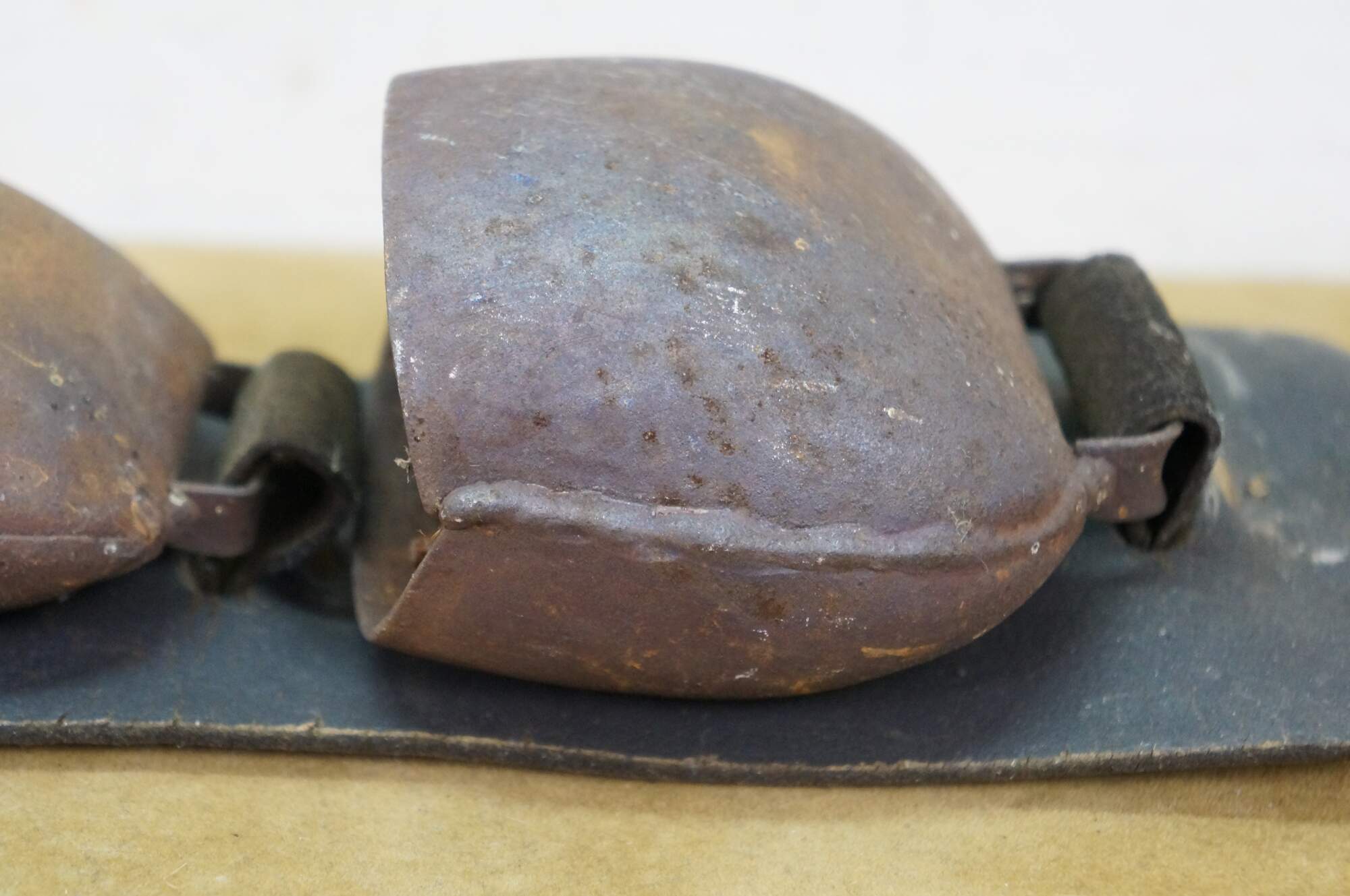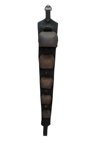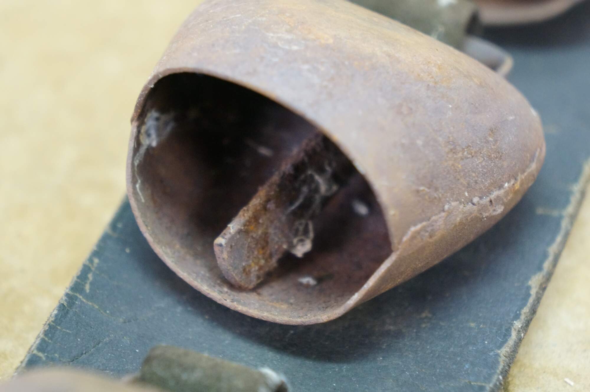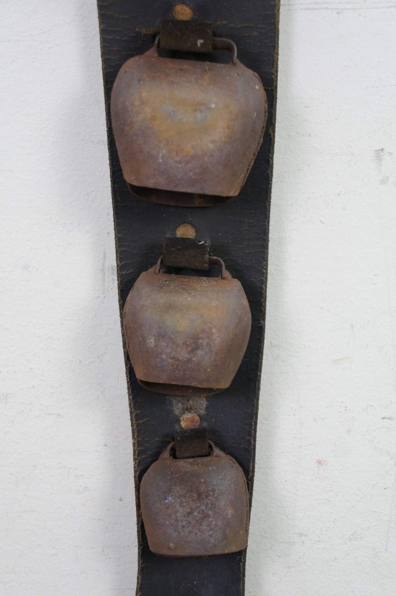Antique set of Swiss cow / farmhouse / iron sleigh bells, graduated and attached to a leather strap.