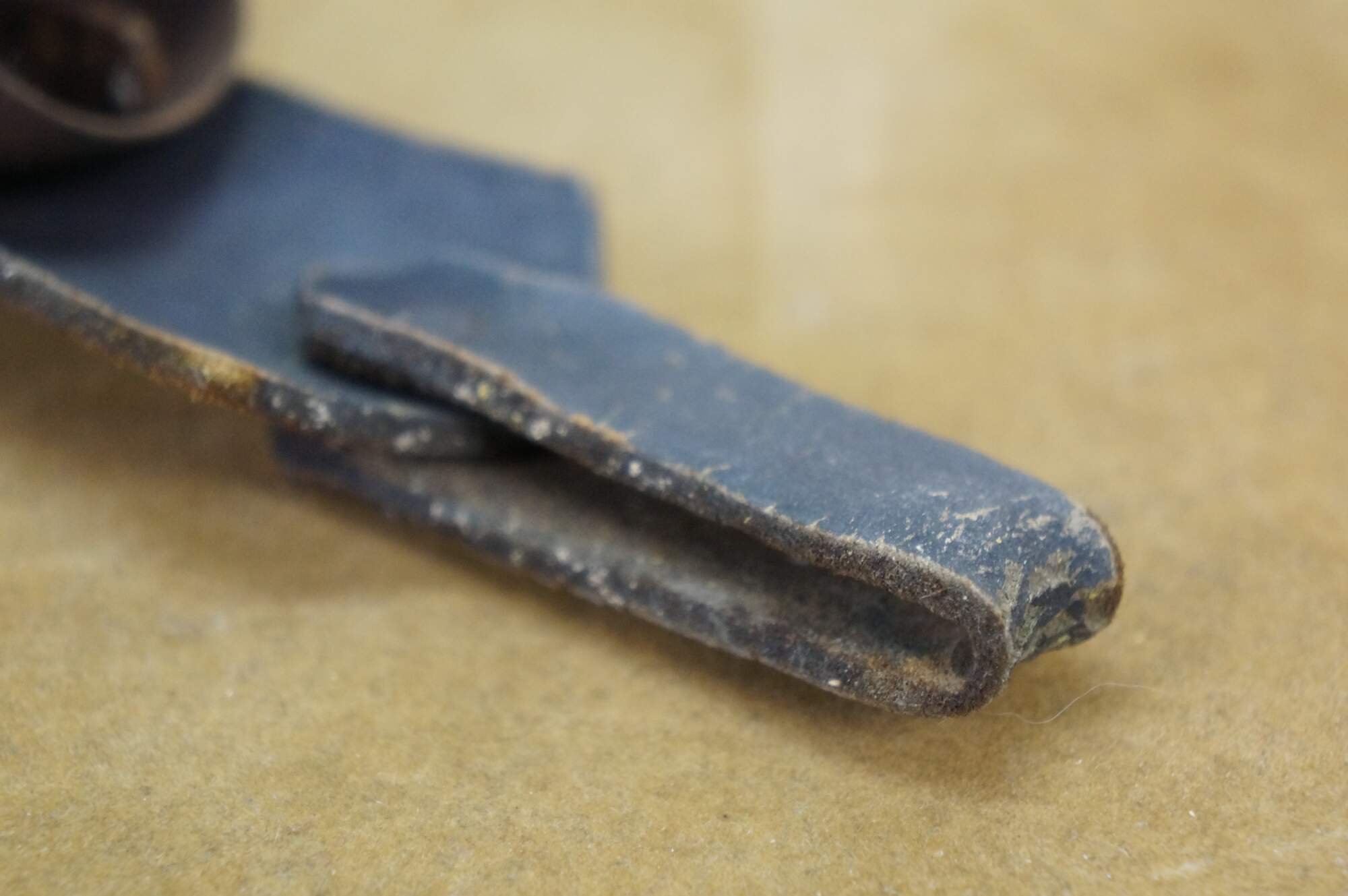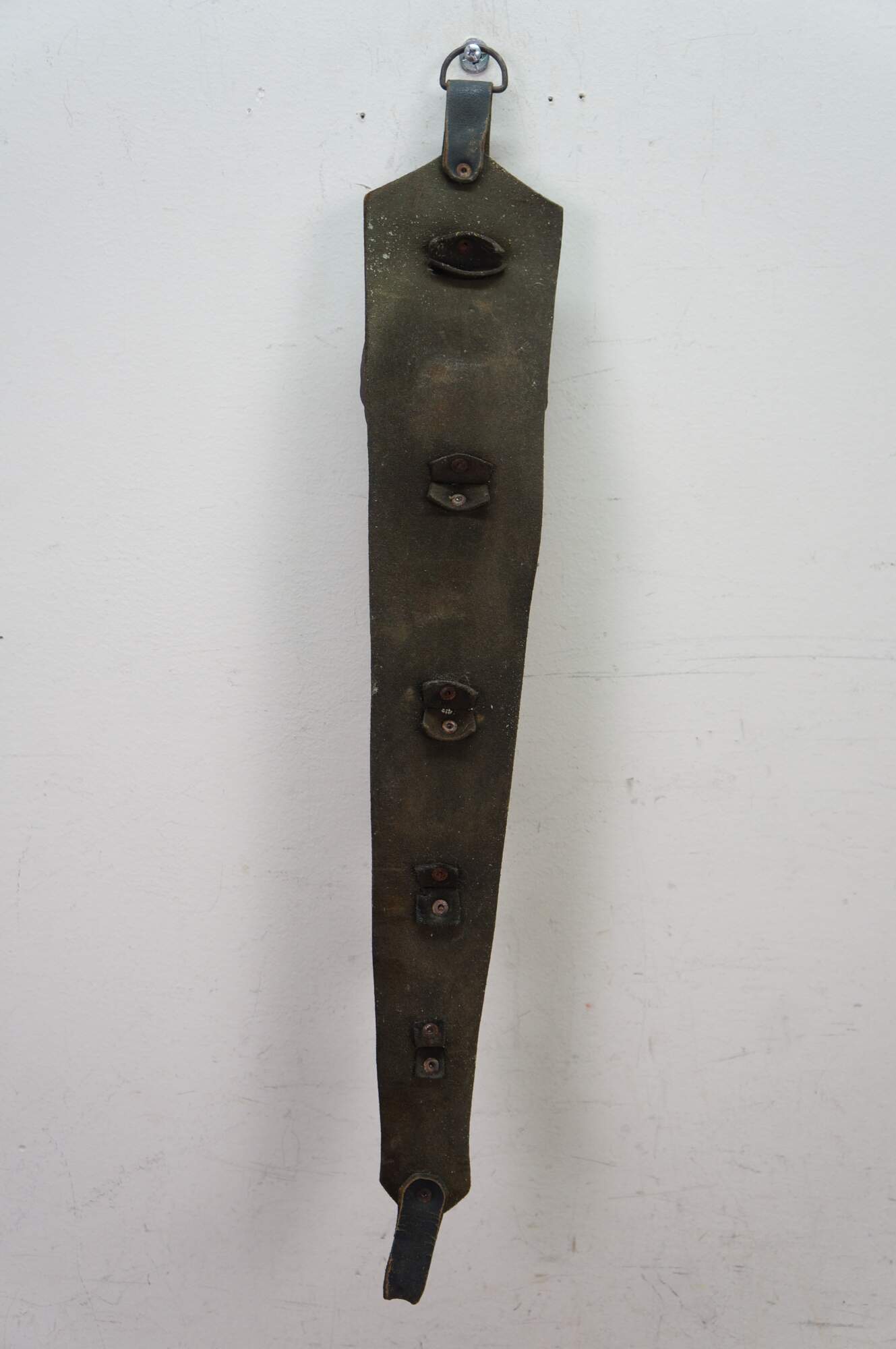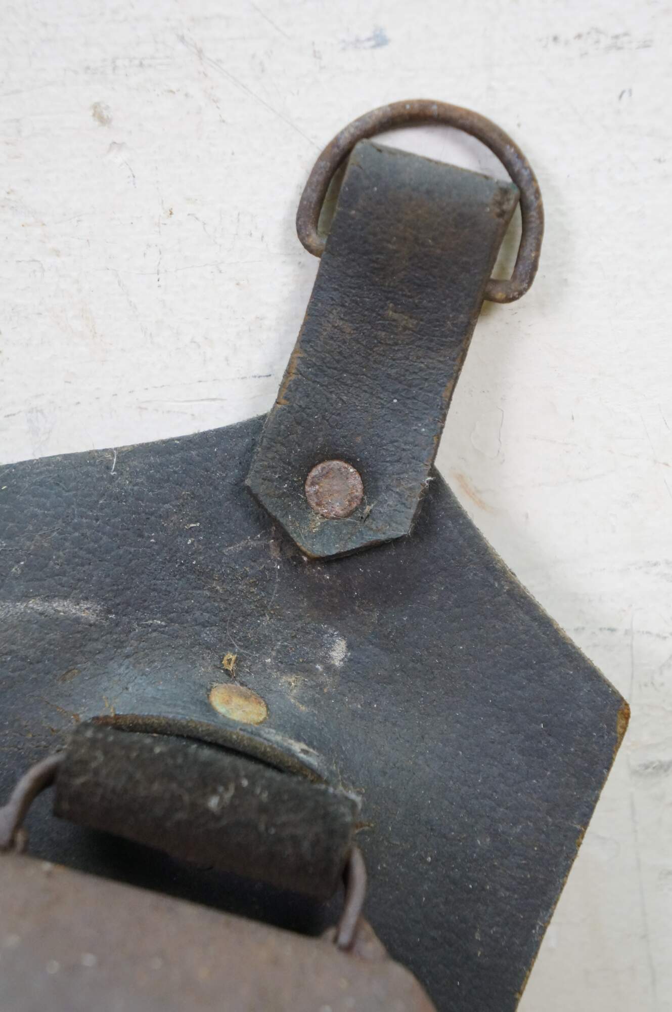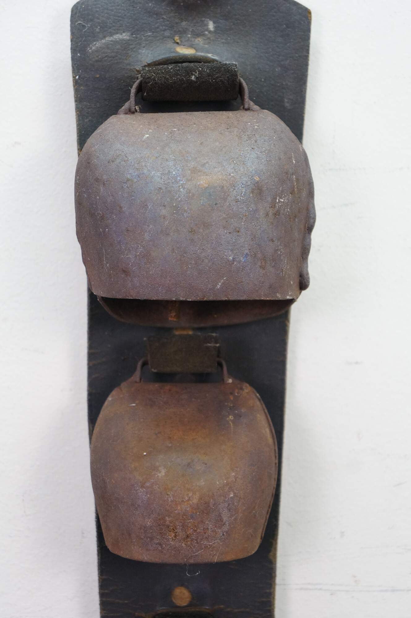 Antique set of Swiss cow / farmhouse / iron sleigh bells, graduated and attached to a leather strap.