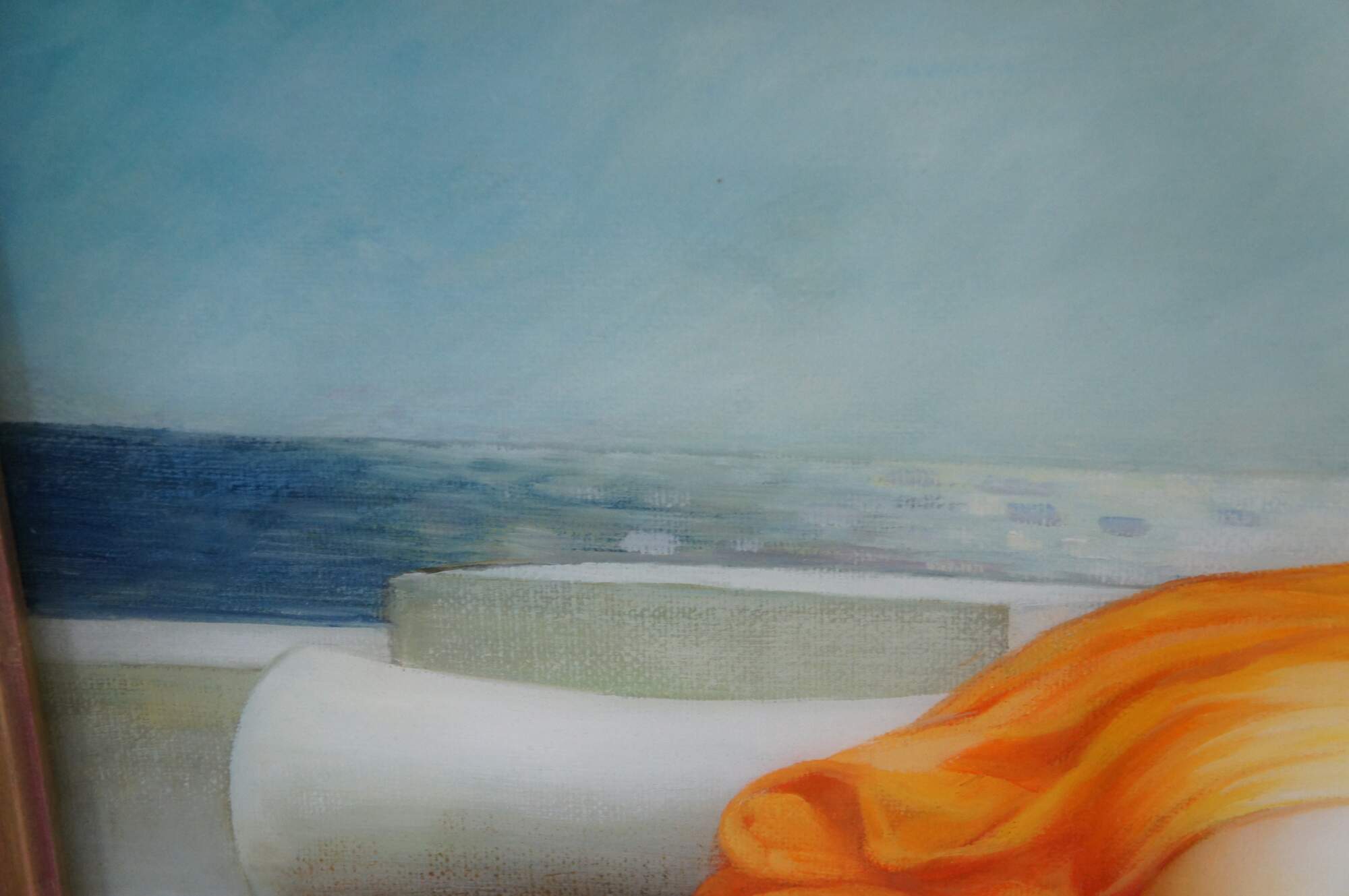 This painting depicts a young Neoclassical / Victorian woman with a sensuous, complex pose, sleeping peacefully on a marble terrace in a vivid, sheer orange gown. The setting is Mediterranean, with the sea visible in the distance, and the warm, golden light suggests the heat of summer. Leighton was known for his classicist Academic style and his commitment to the ideal of art for art's sake, focusing on aesthetic beauty rather than narrative context. The pose of the sleeping figure was reportedly inspired by Michelangelo's sculpture Night.