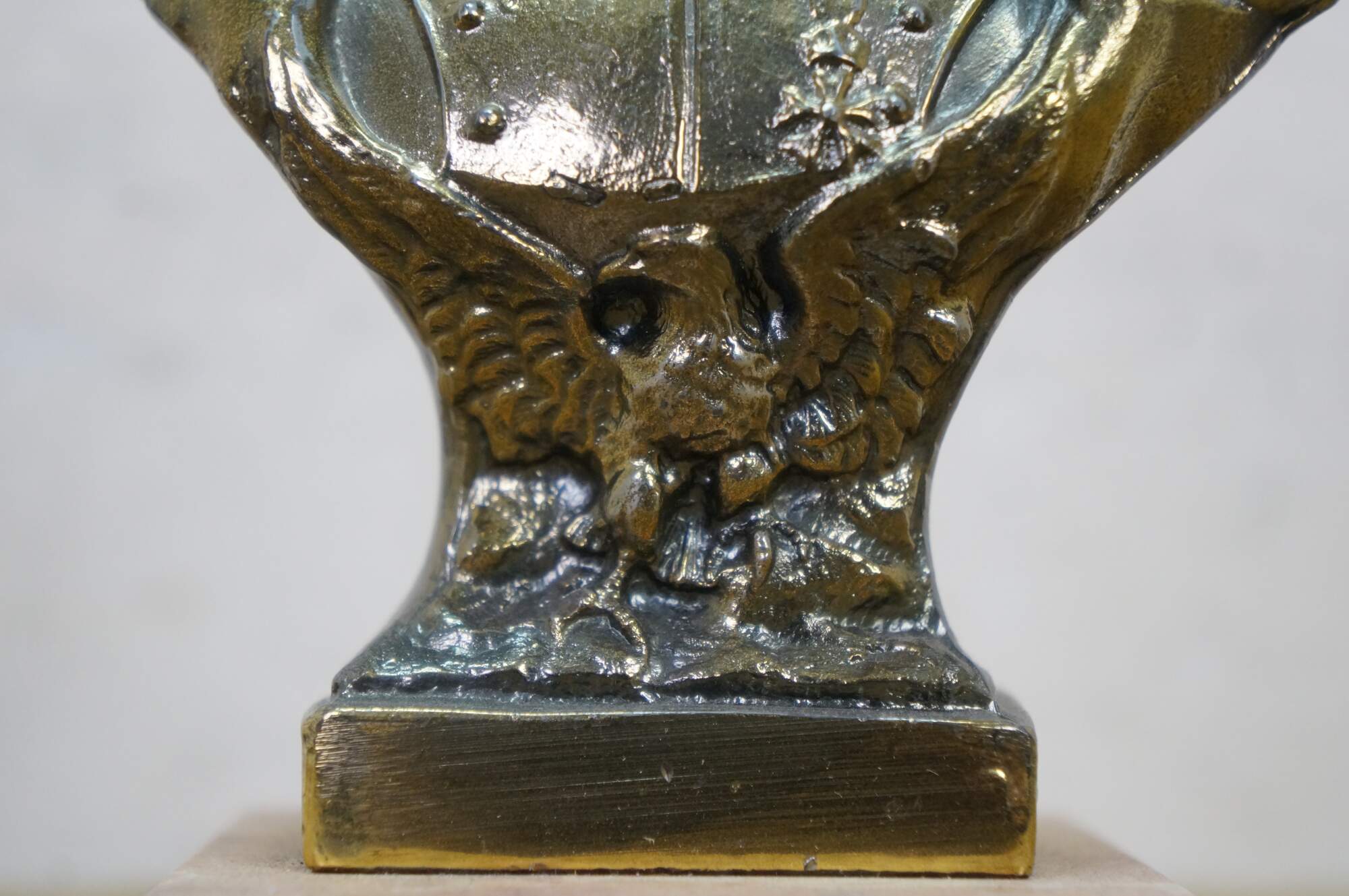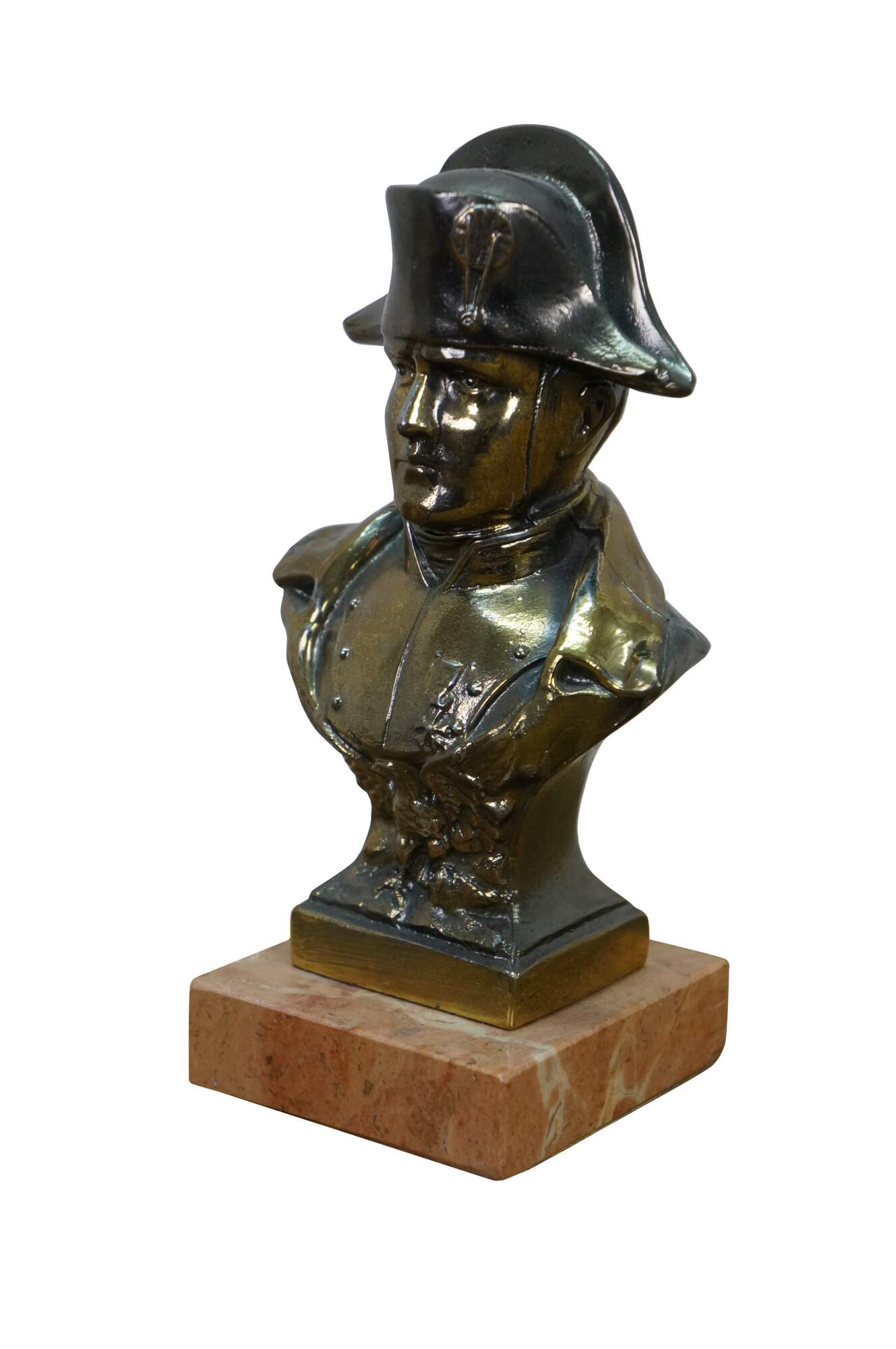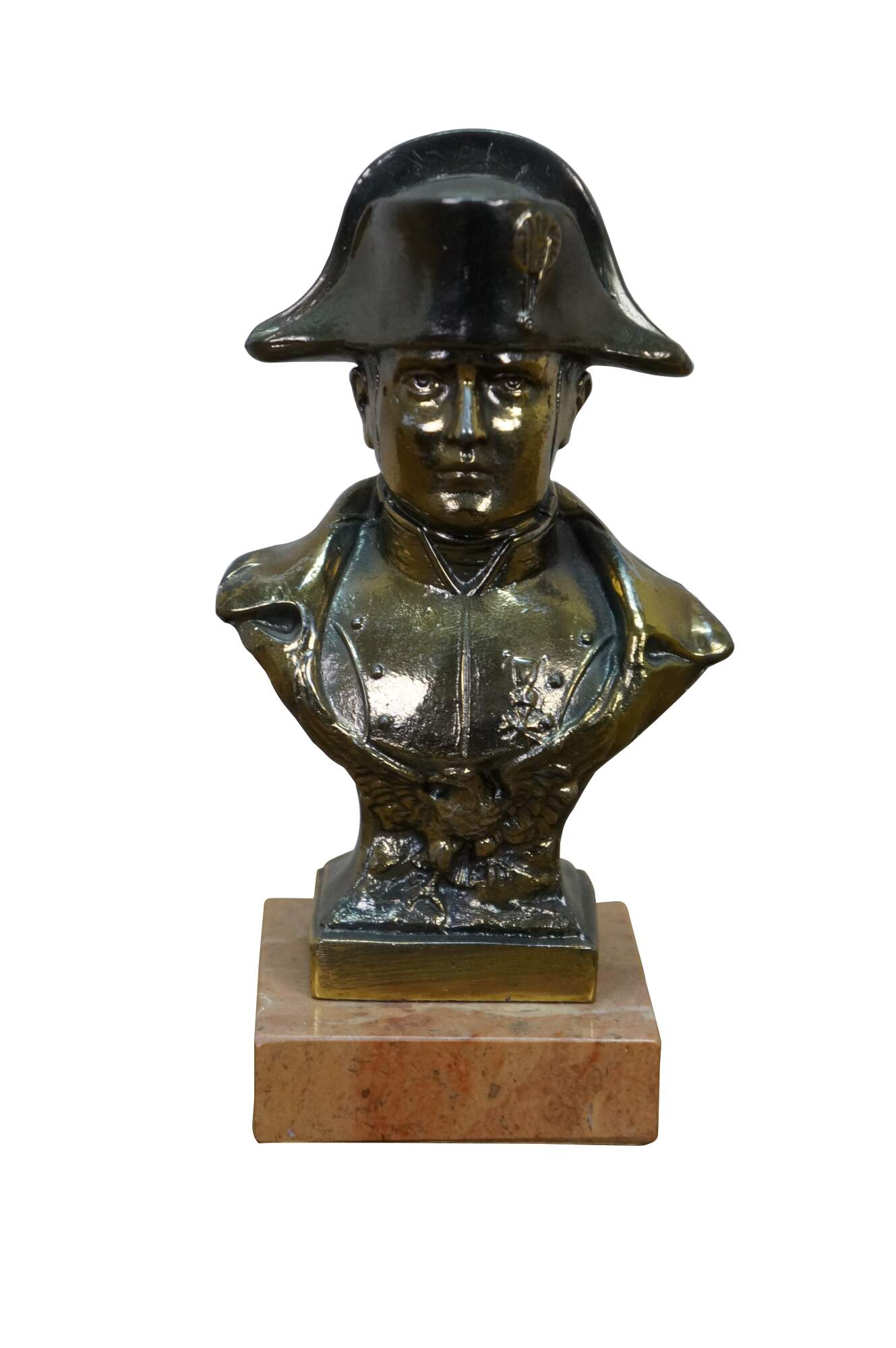Vintage cast spelter metal Napoleon bust statue featuring the famous military officer in Regalia uniform and spread wing Federal style eagle. Signed on back shoulder by artist.