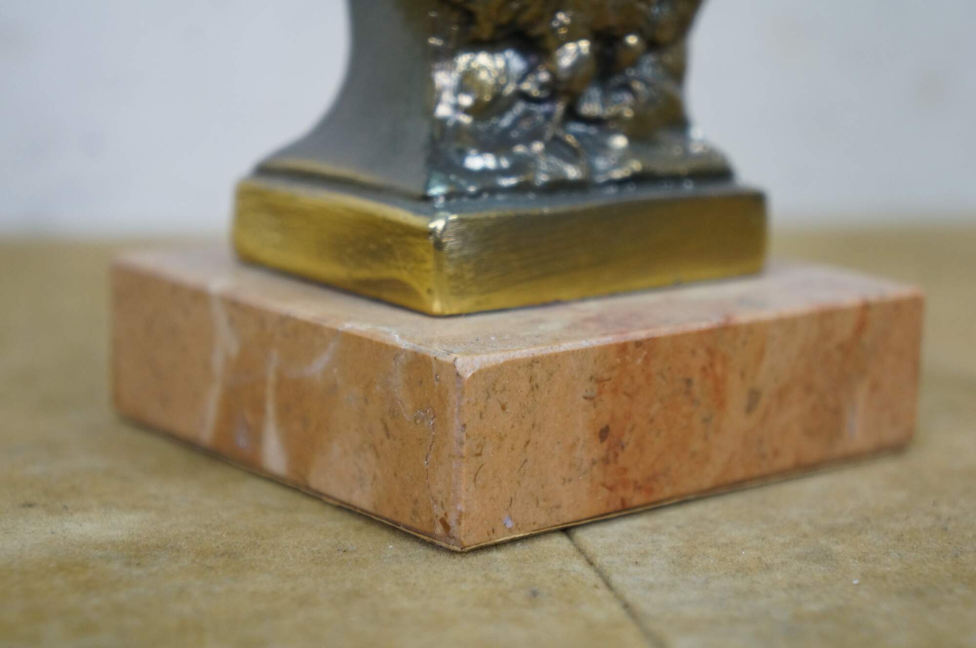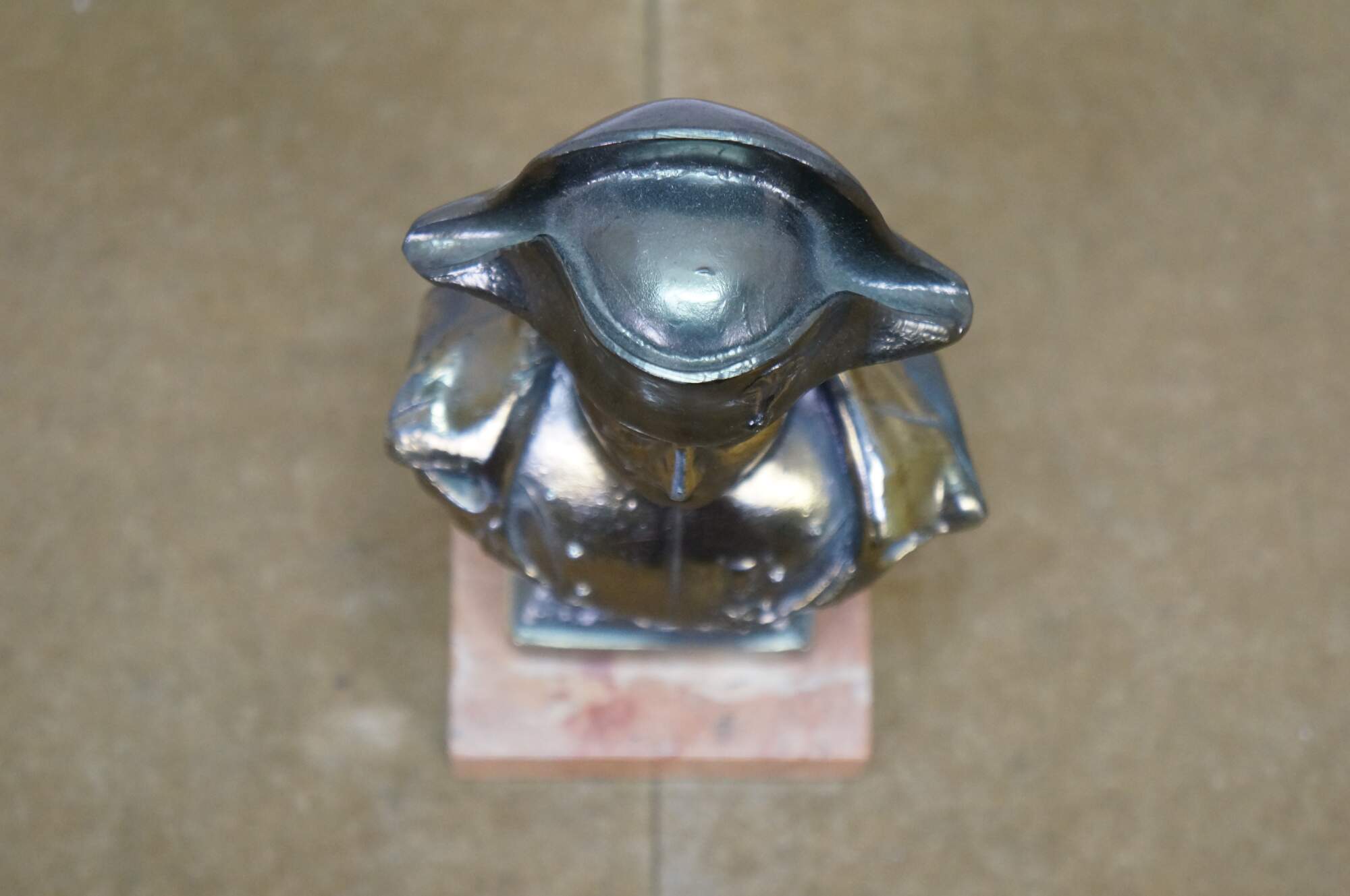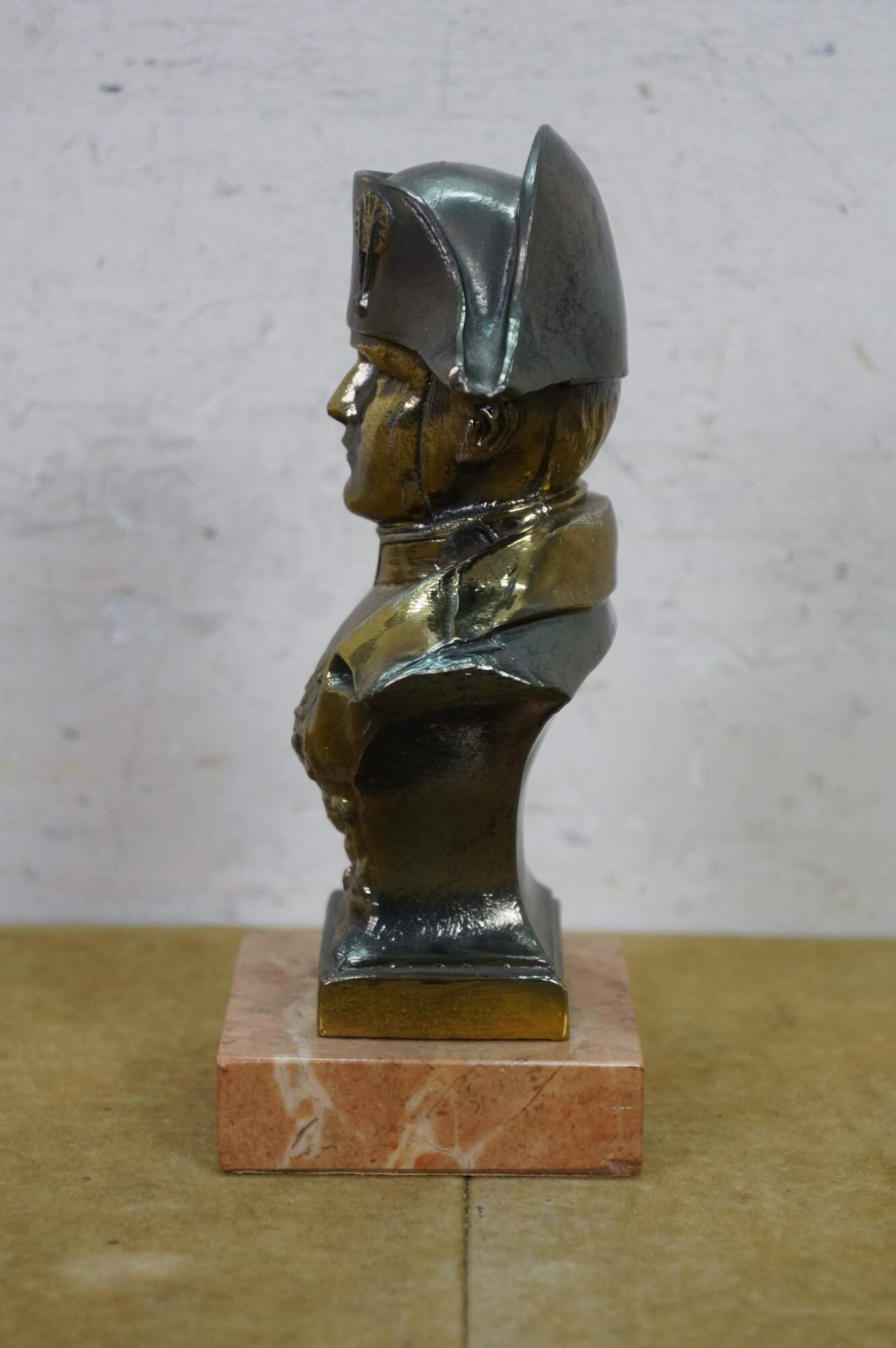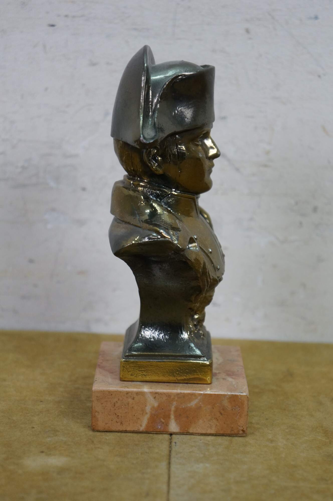 Vintage cast spelter metal Napoleon bust statue featuring the famous military officer in Regalia uniform and spread wing Federal style eagle. Signed on back shoulder by artist.