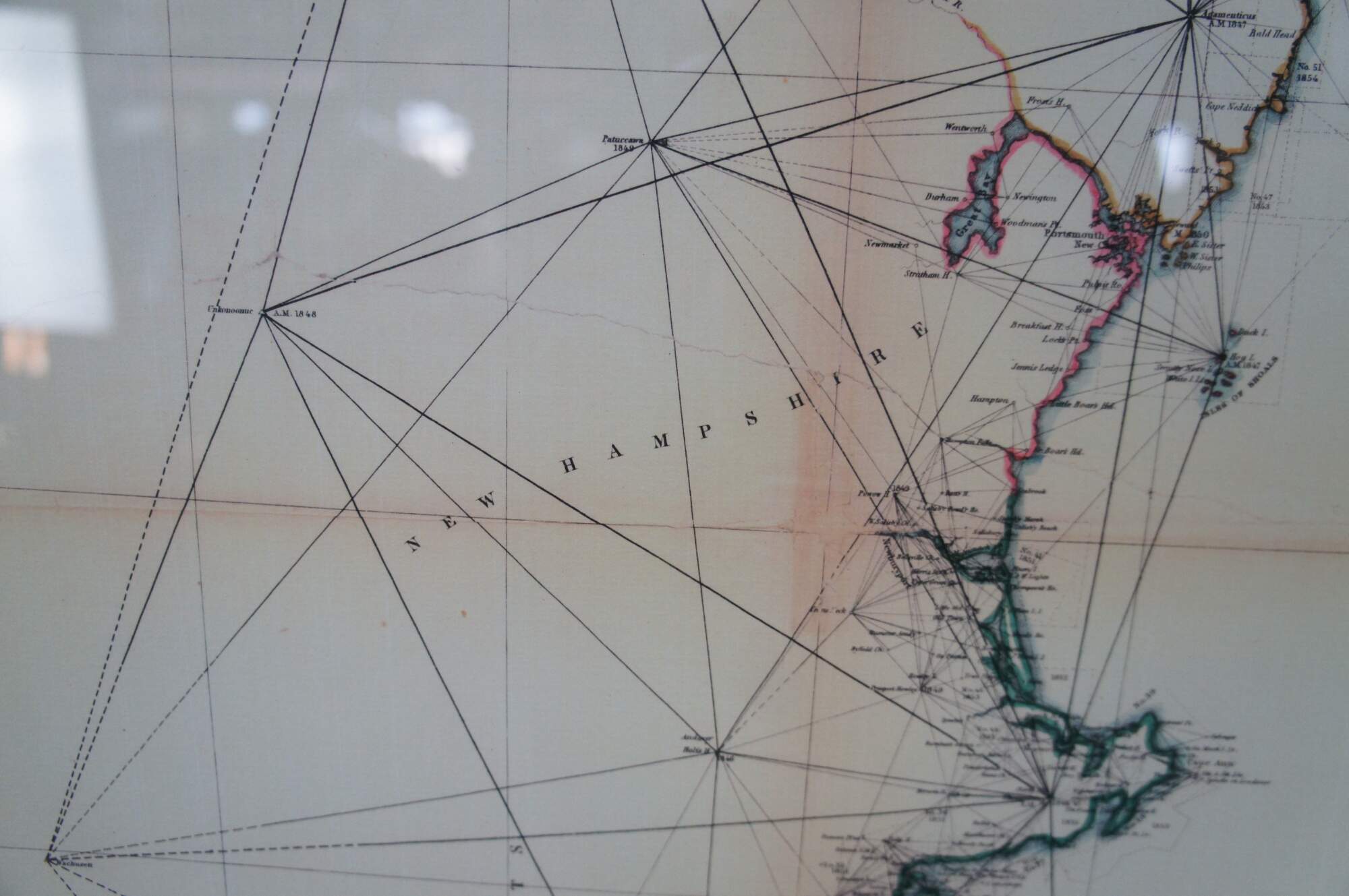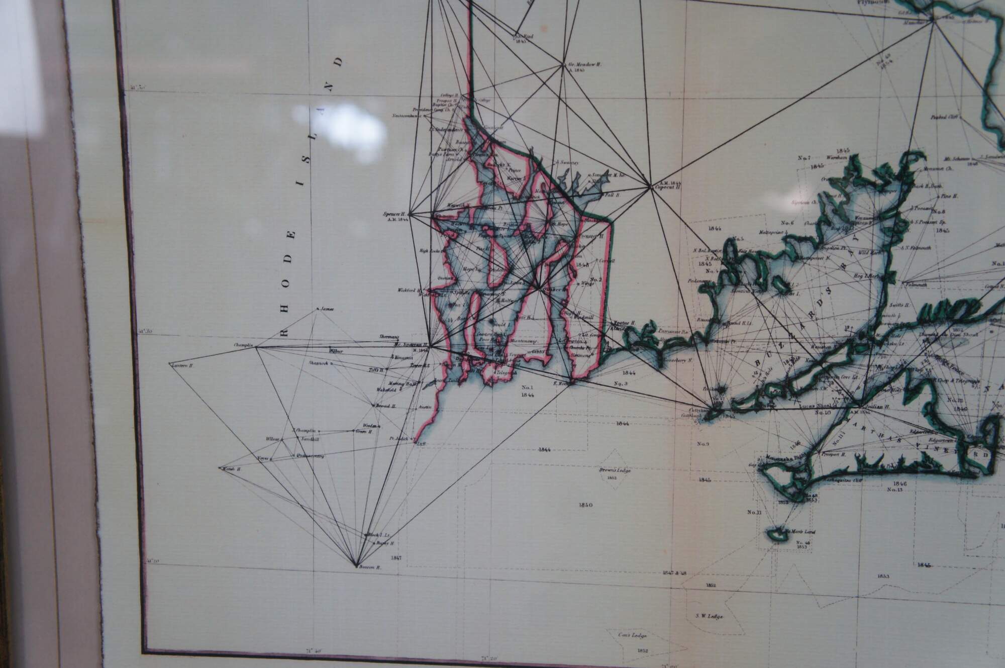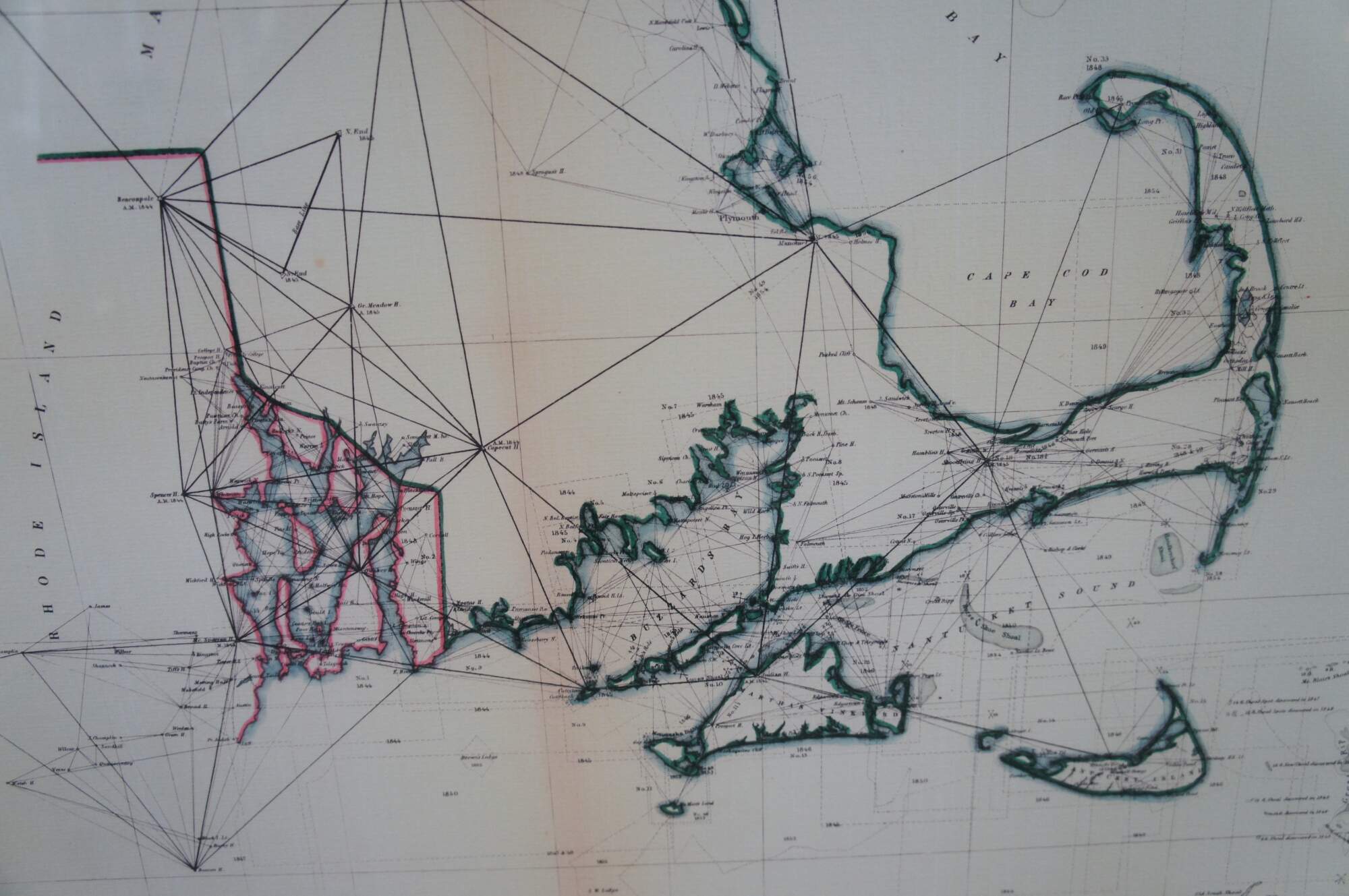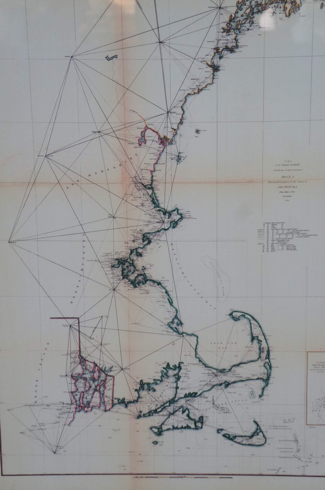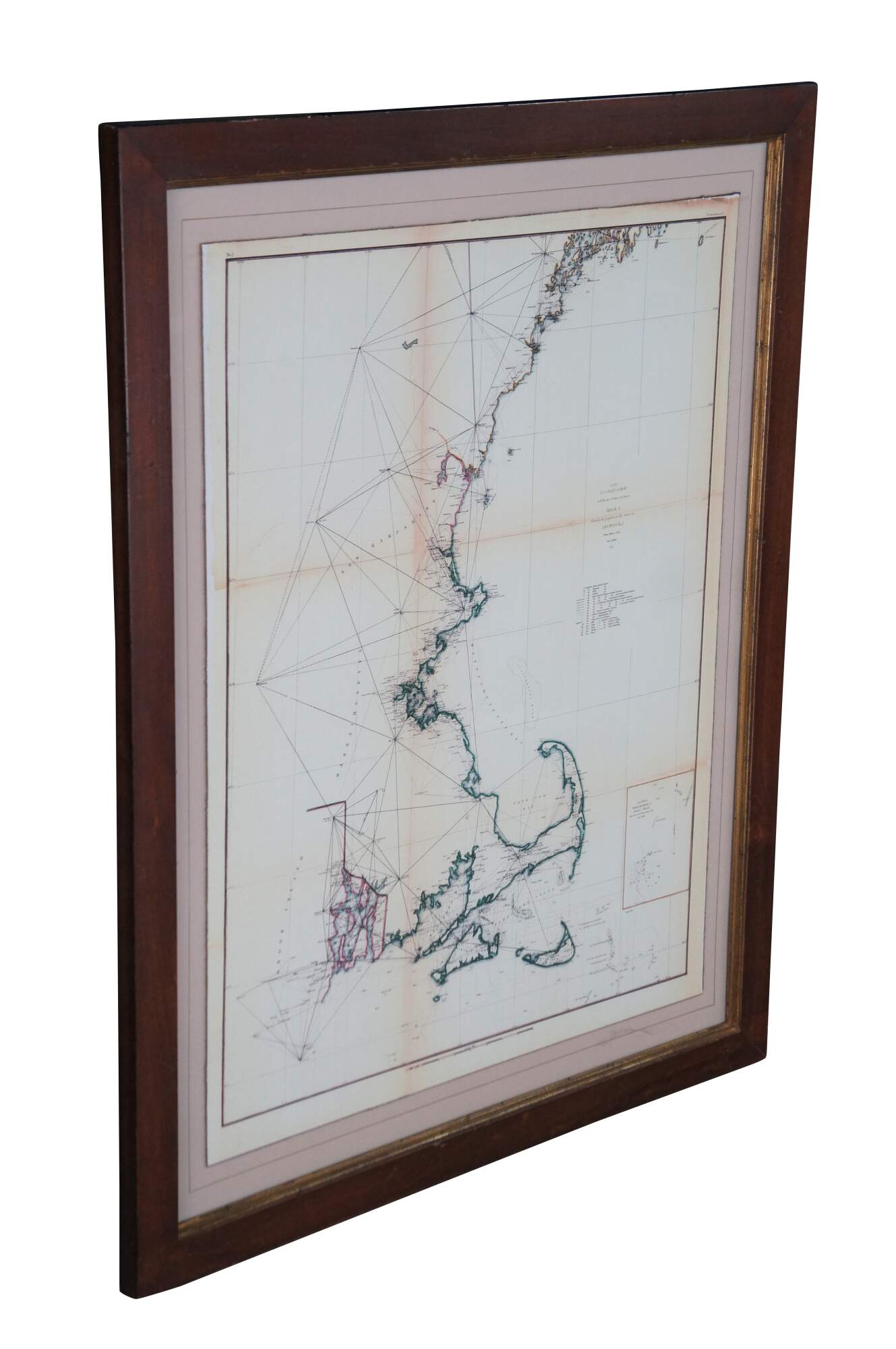 Vintage Soicher Marin navigational survey reproduction map of the eastern coast of the united states circa 1844-1854. It features Rhode Island, Massachusetts, New Hampshire, Buzzards Bay, Cape Cod, Nantucket Sound, Martha's Vineyard, etc.