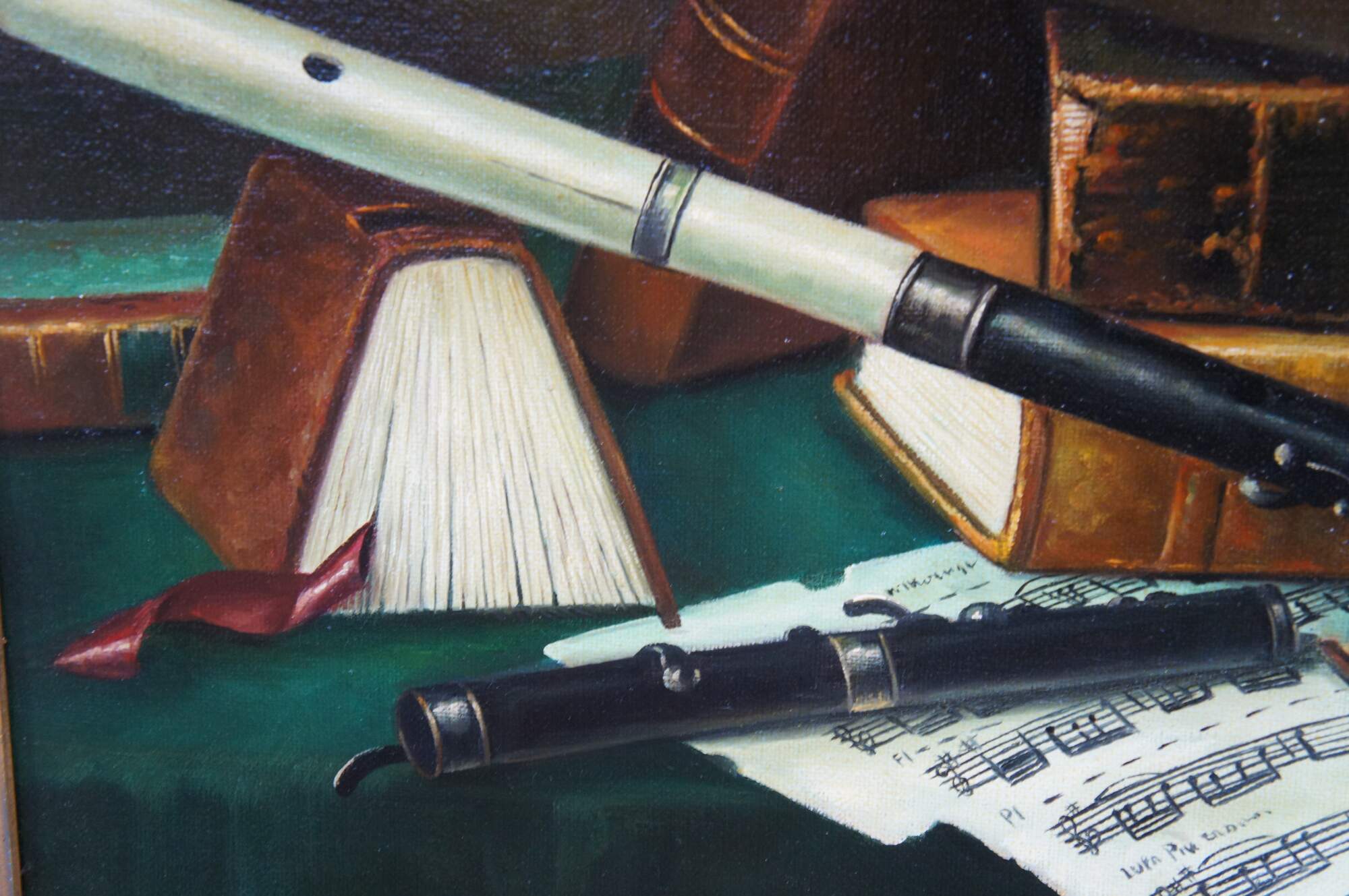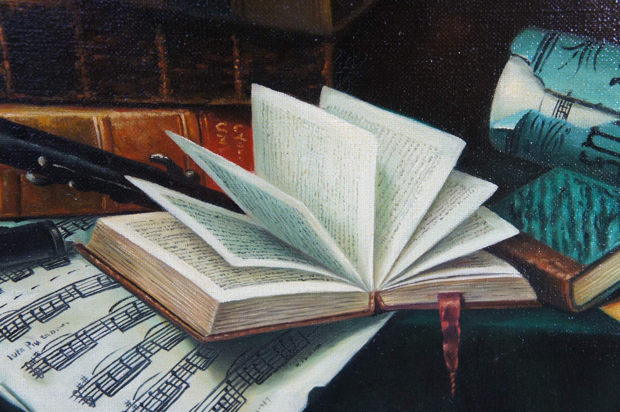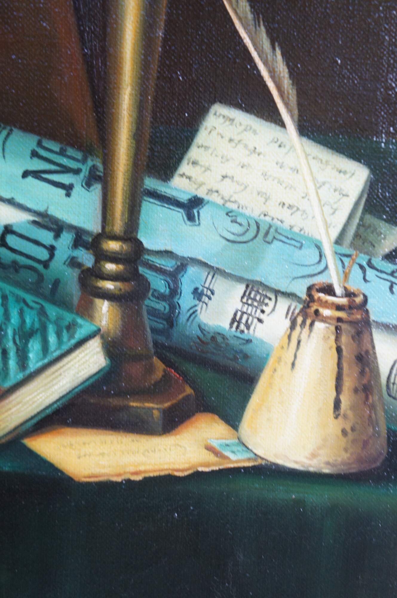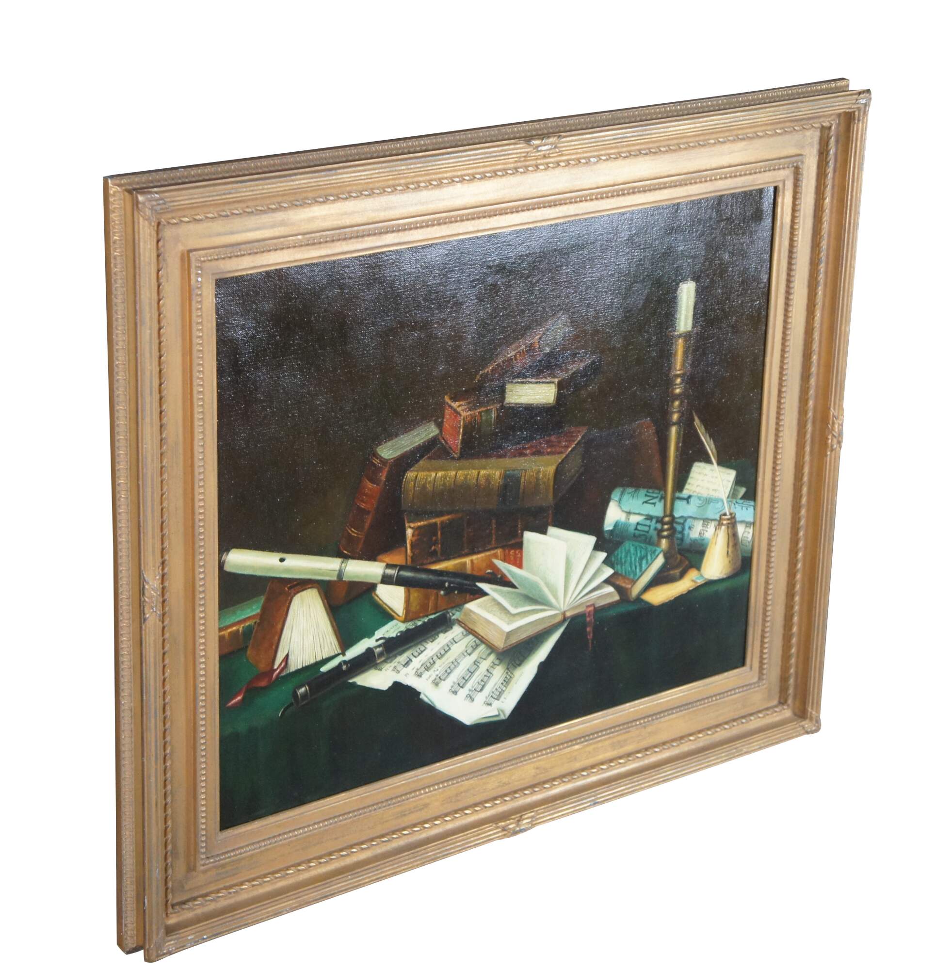 Late 20th century oil painting on canvas after Music and Literature by William Michael Harnett. Depicts a still life tableau on a cloth covered table featuring stacks of books, sheet music, candle, inkwell and wind instrument. Molded frame with gold finish, beveled with beaded / rope twist details.