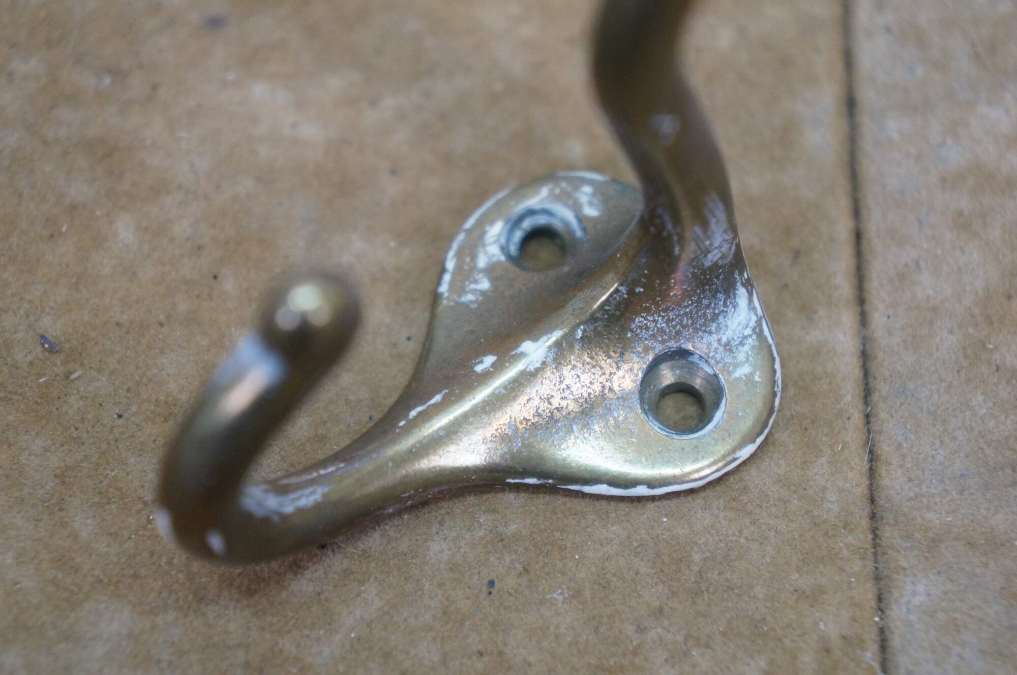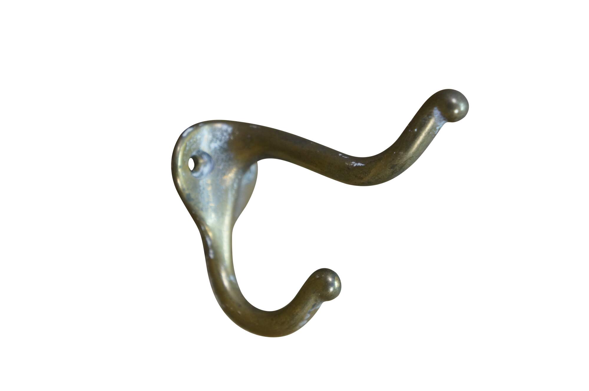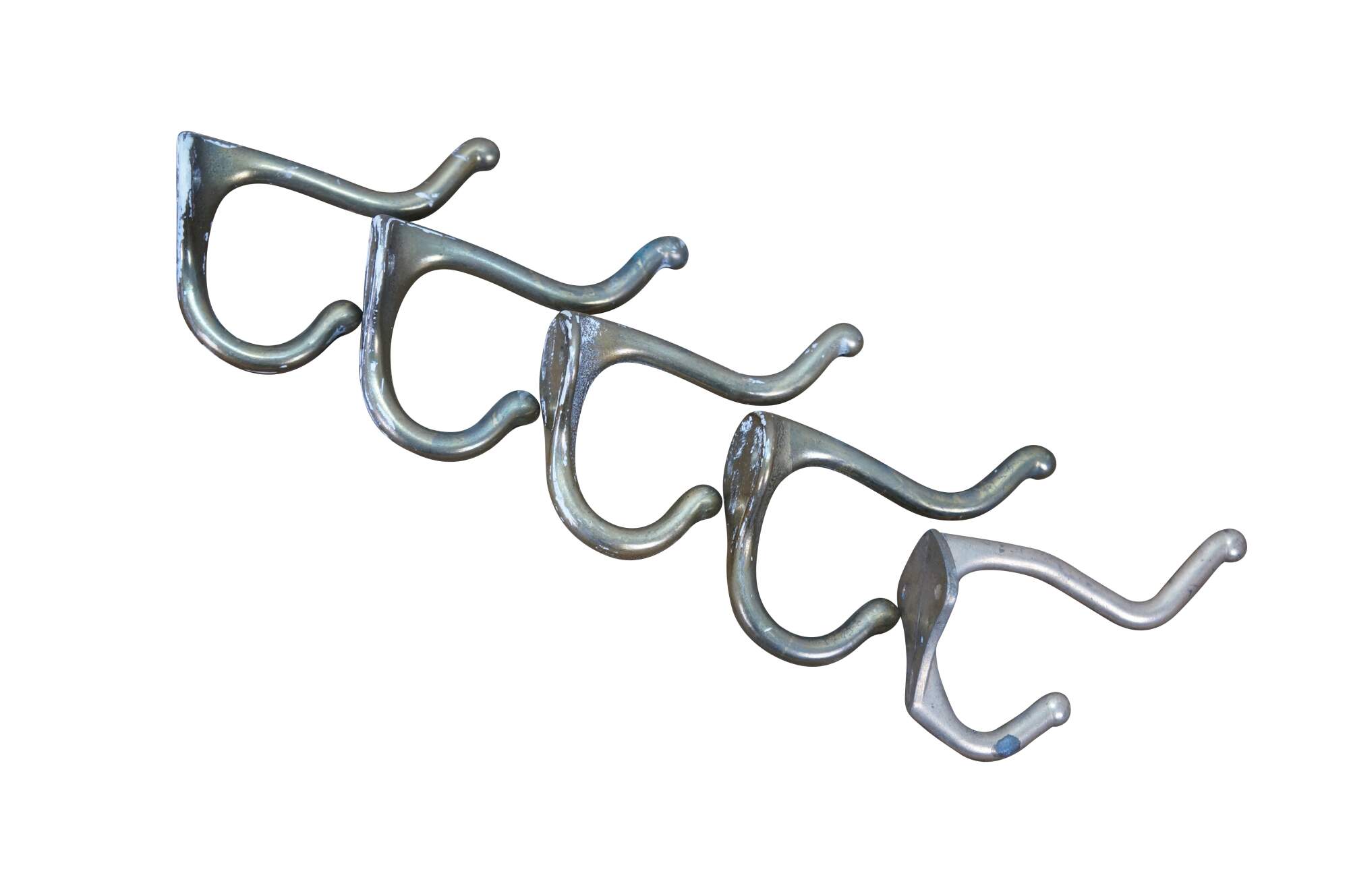 Five antique cast brass double prong coat / hat rack hooks.