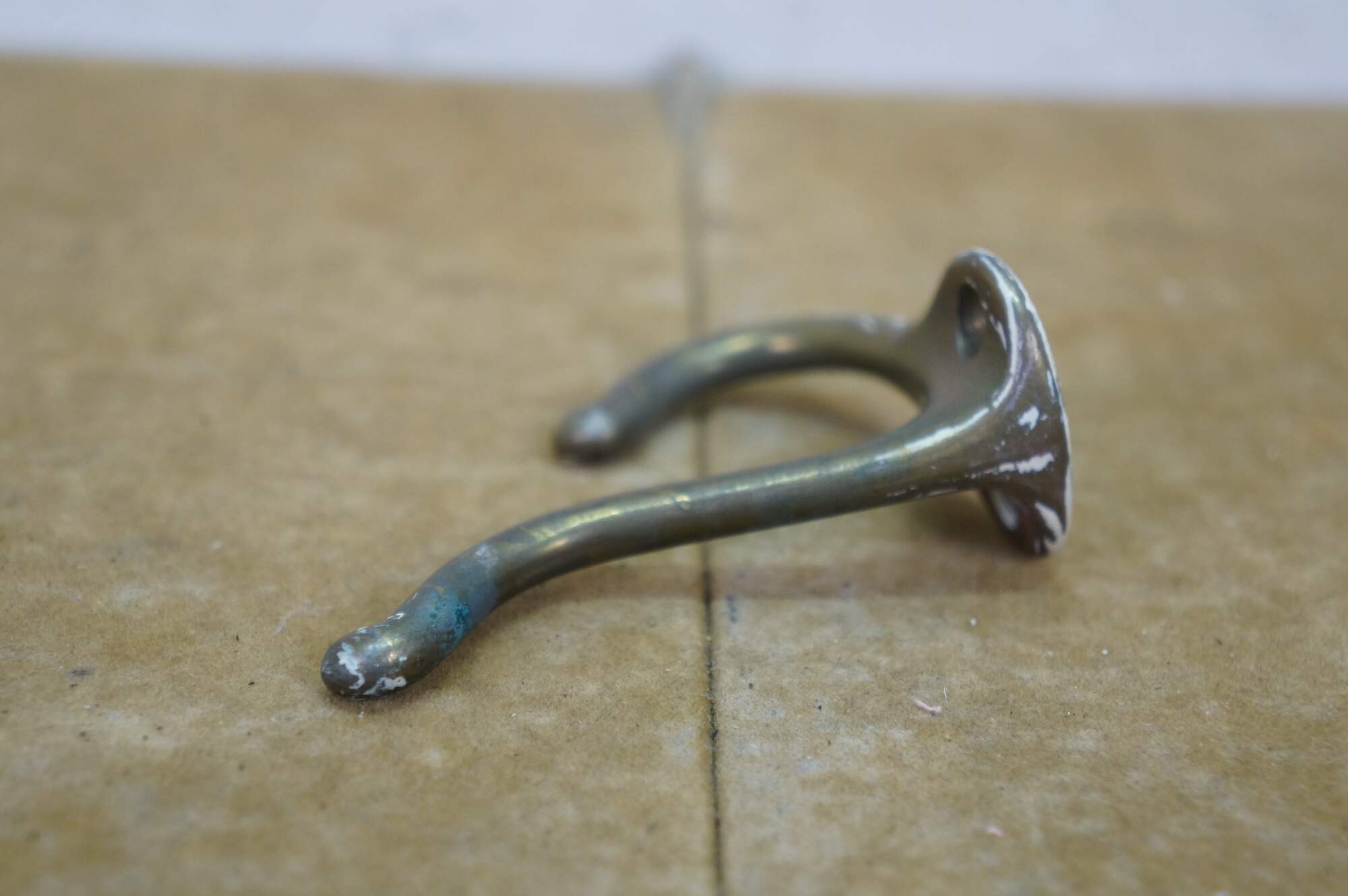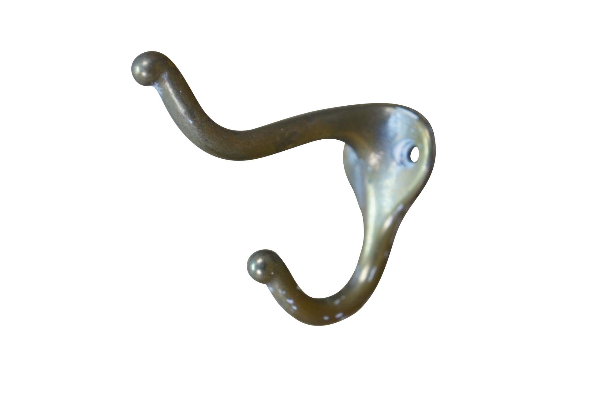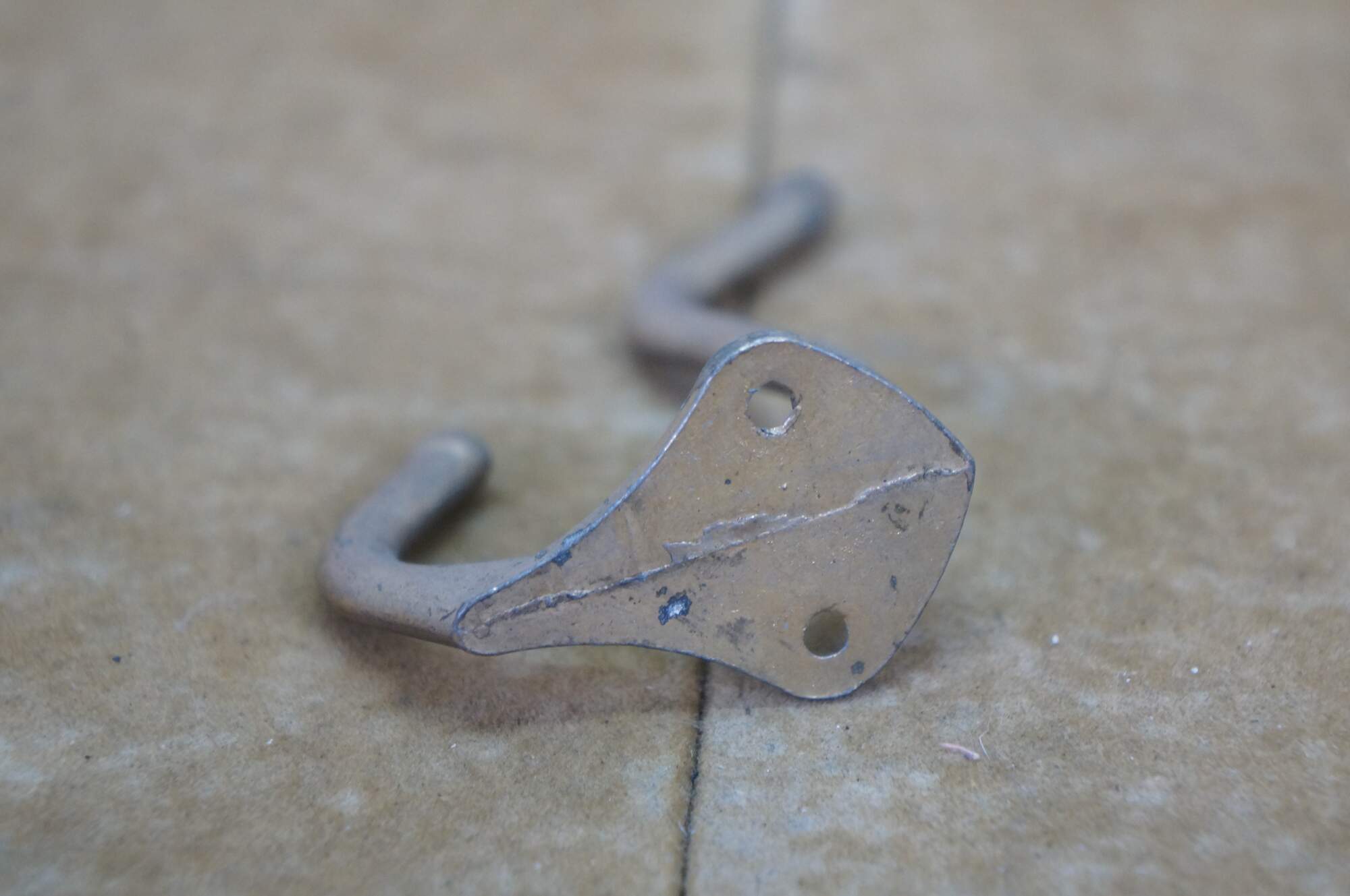Five antique cast brass double prong coat / hat rack hooks.