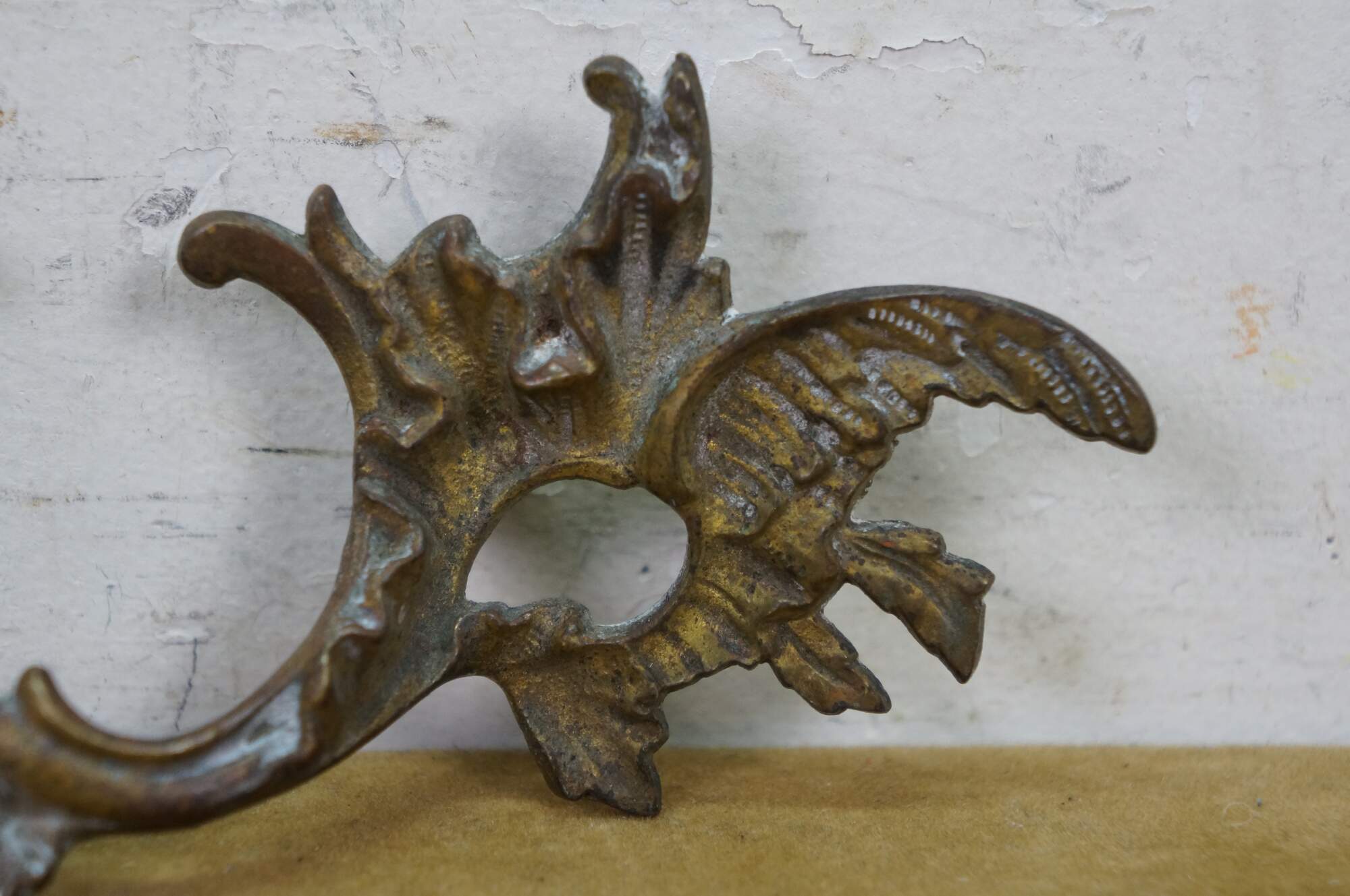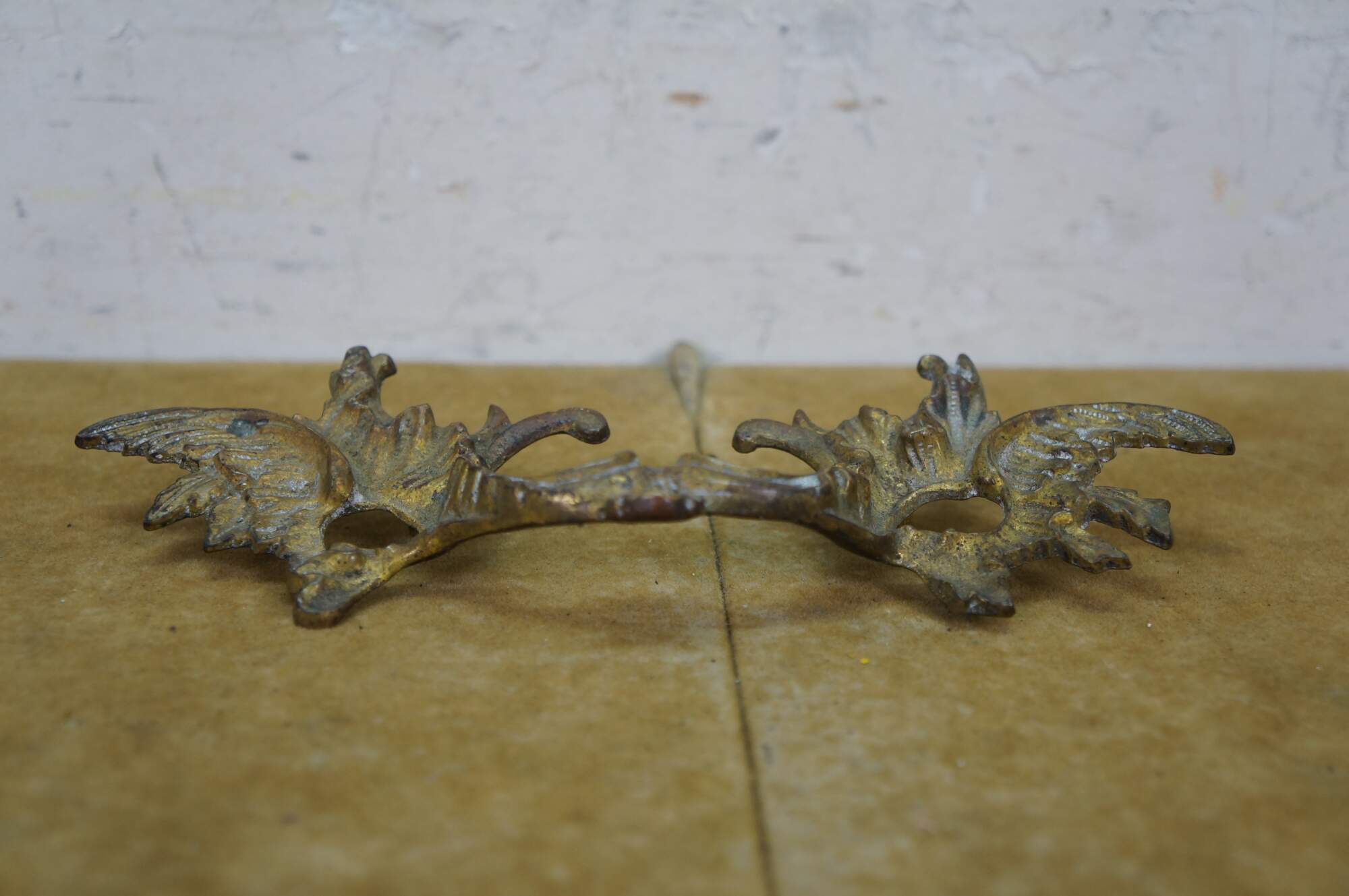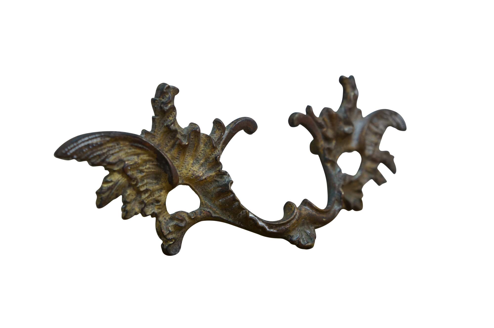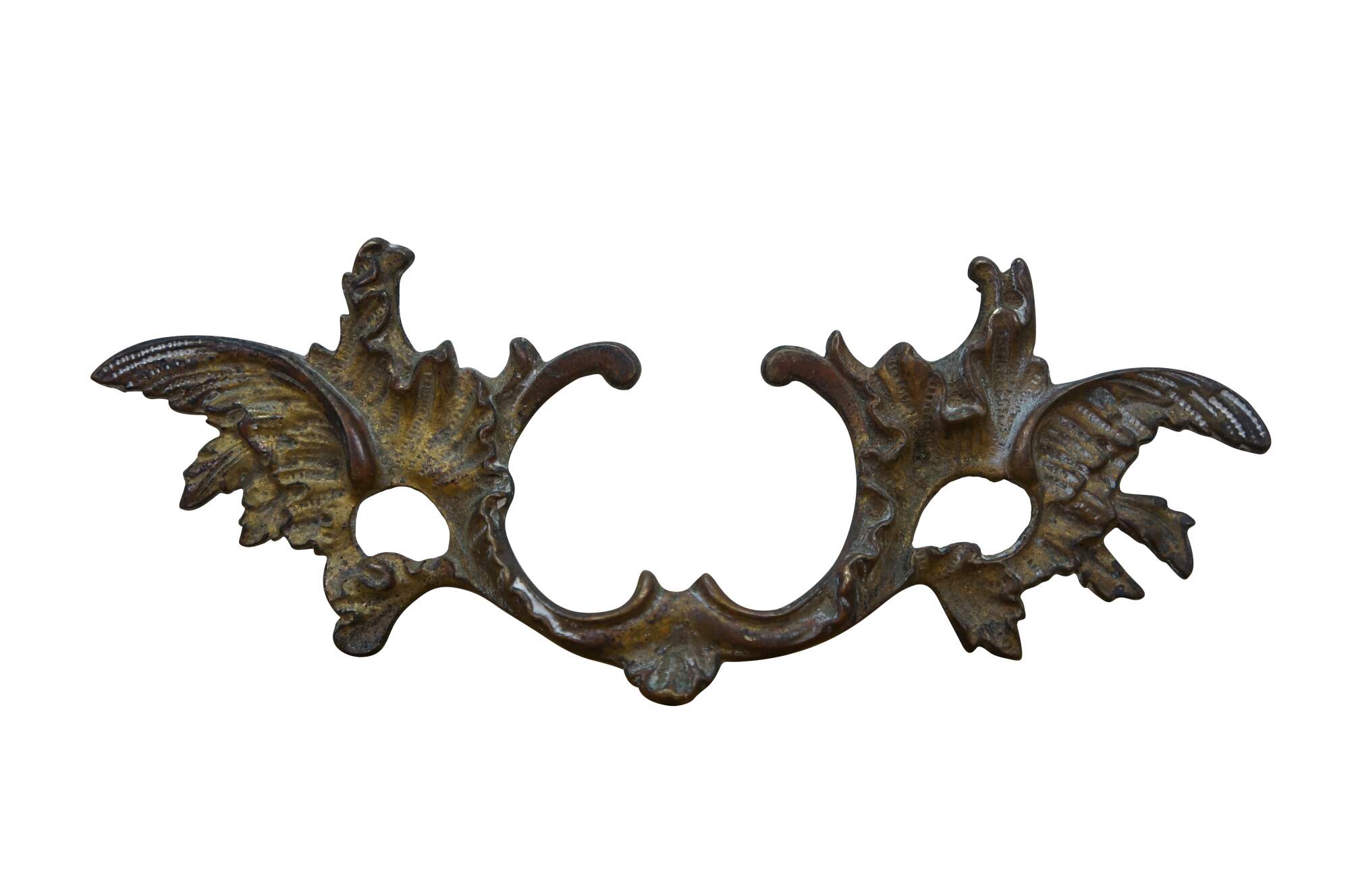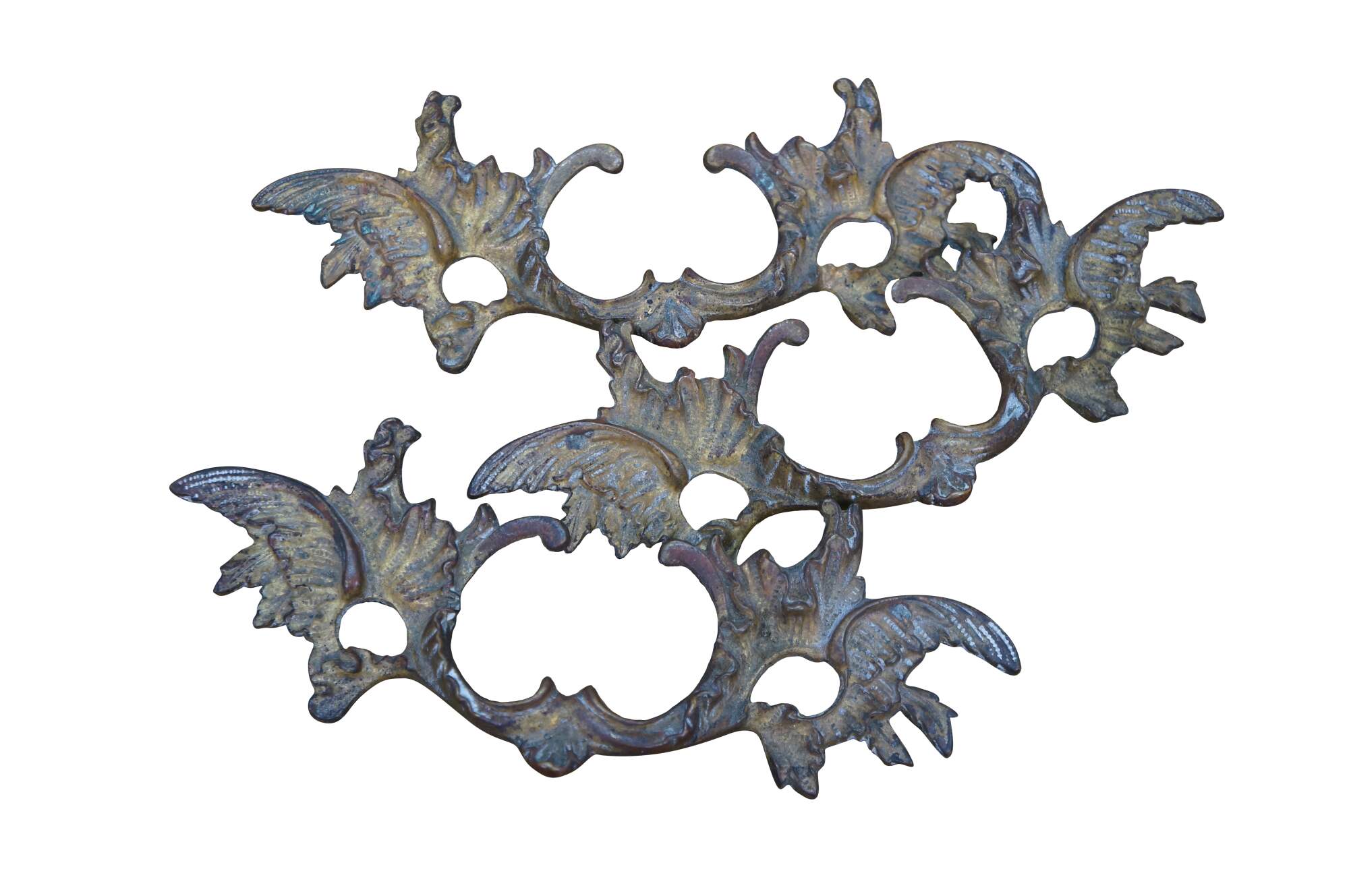 Three antique French Provincial brass drawer pulls featuring a winged acanthus design with 2.75" center holes.