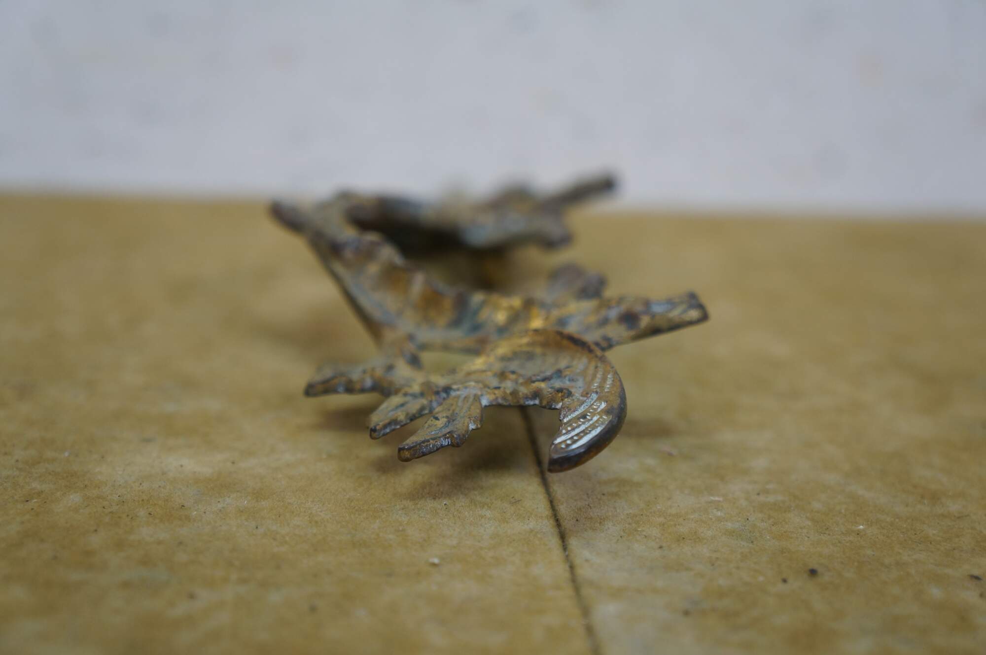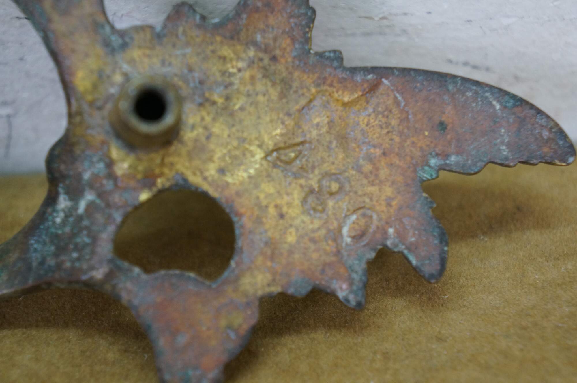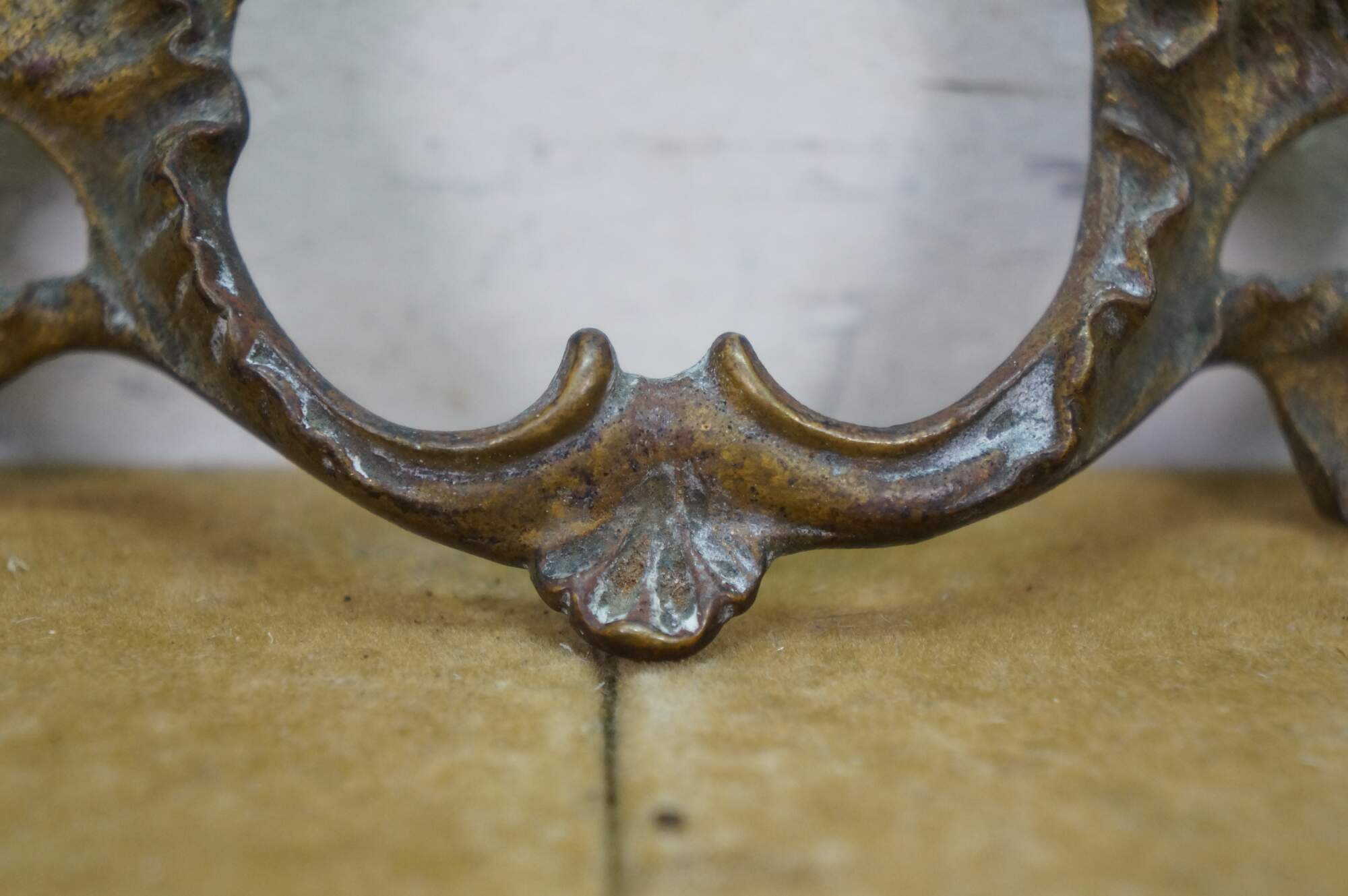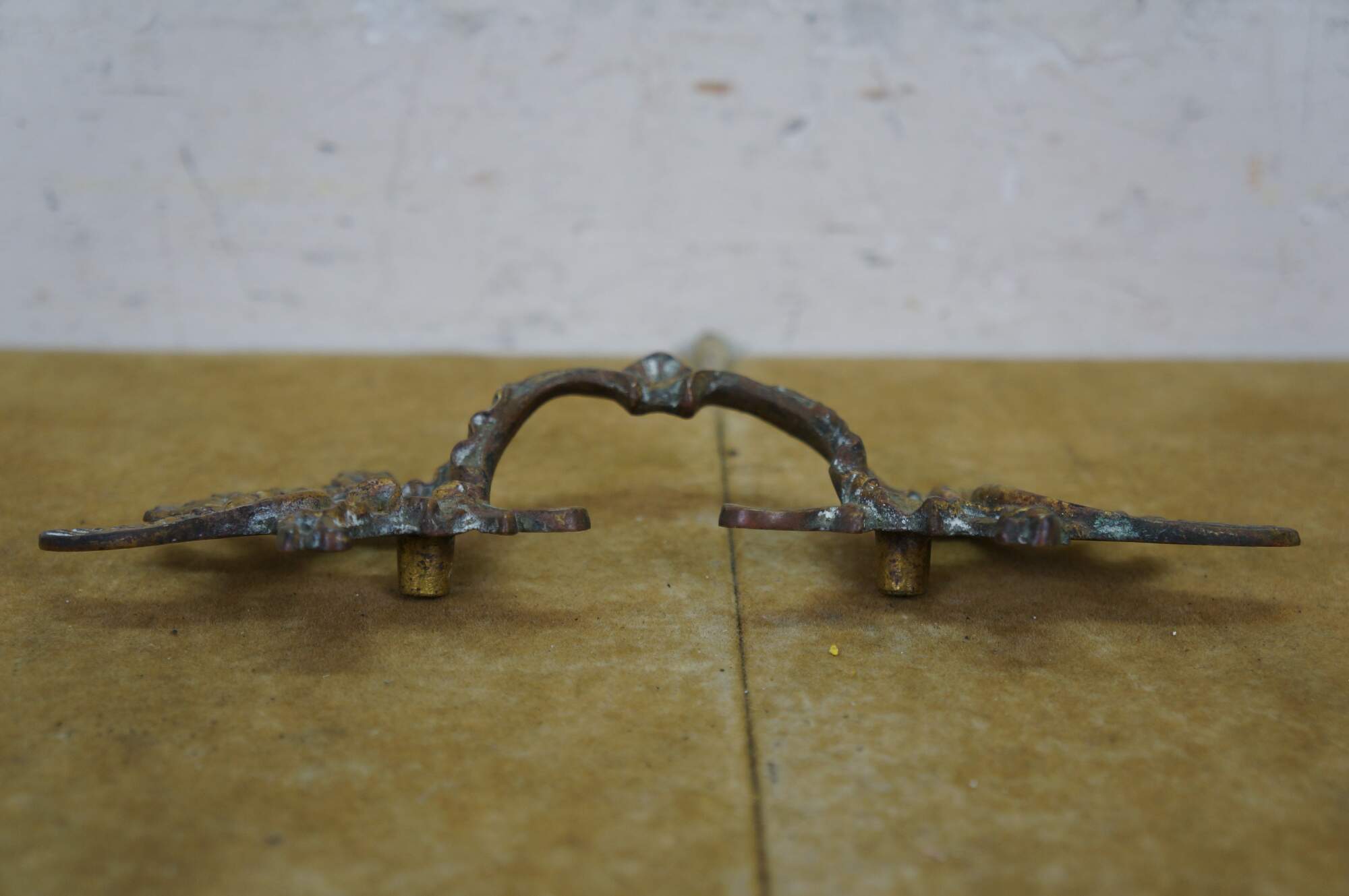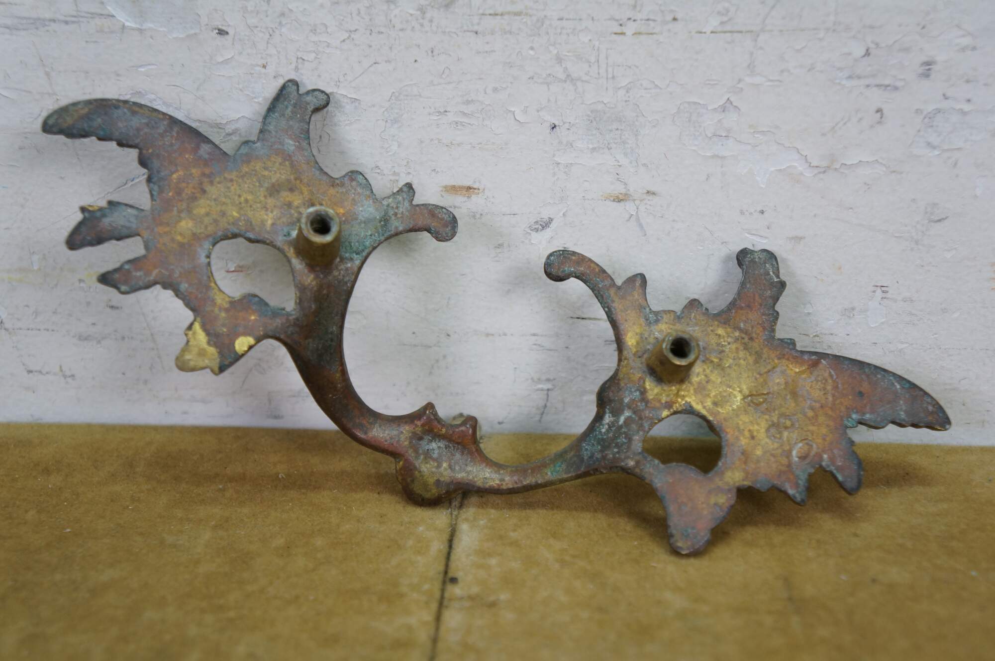 Three antique French Provincial brass drawer pulls featuring a winged acanthus design with 2.75" center holes.