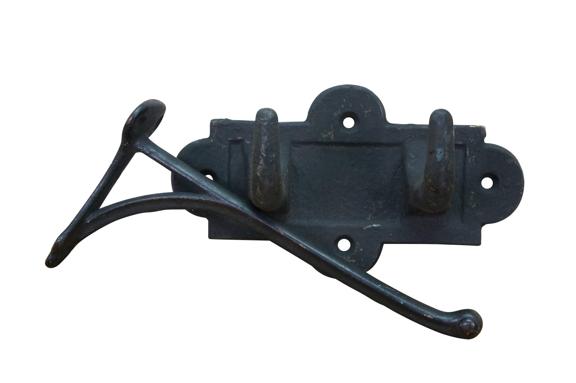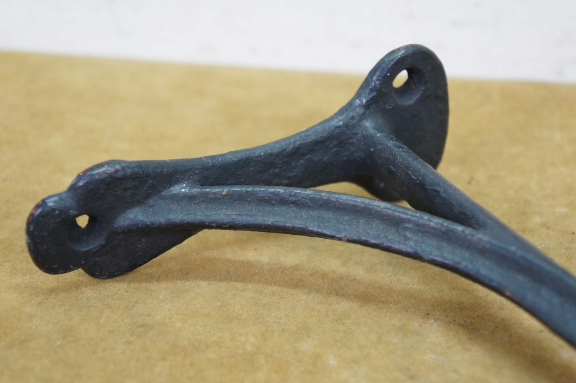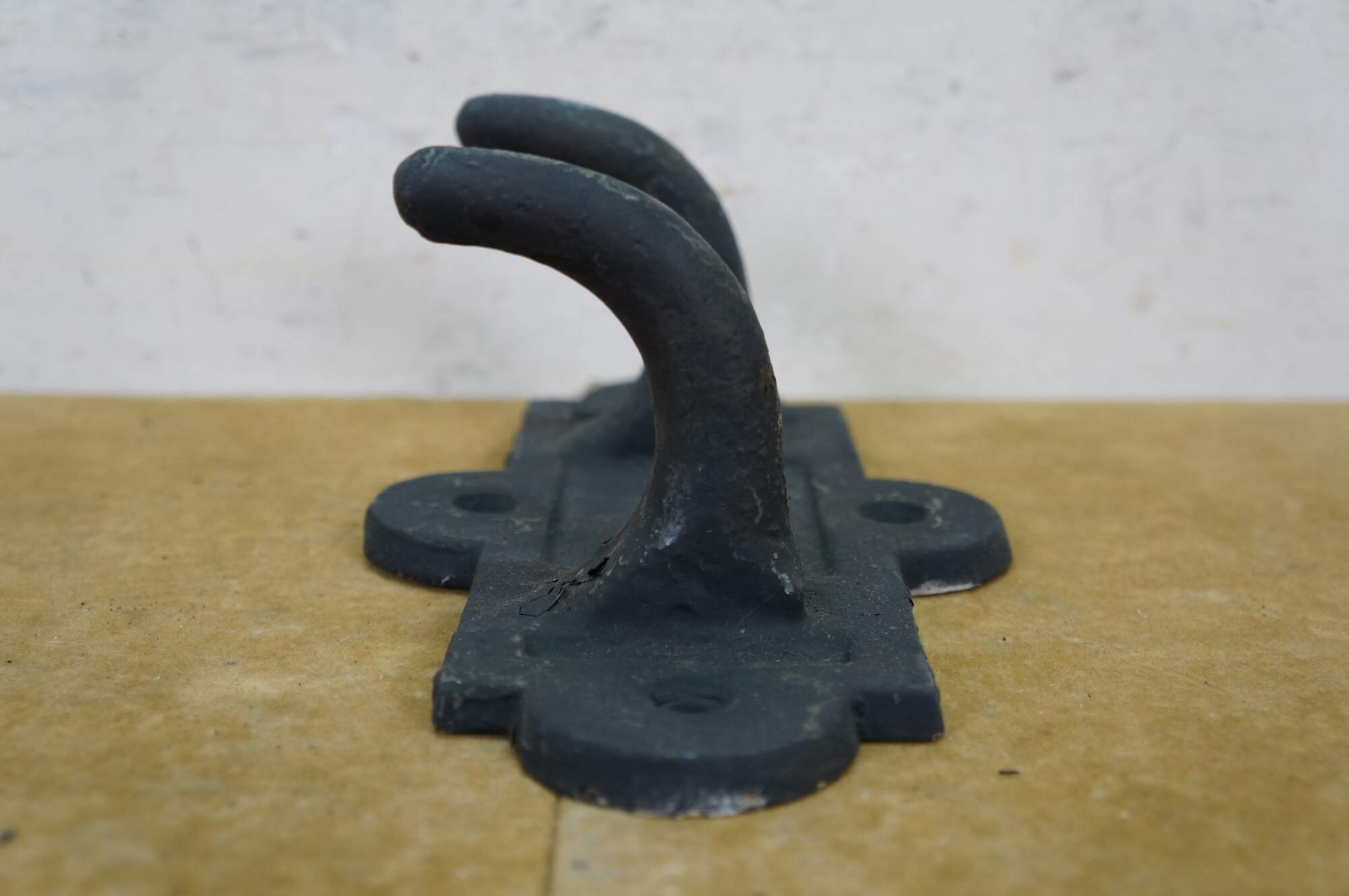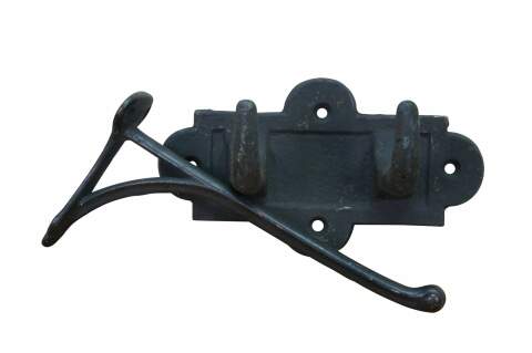 Two antique cast iron two prong barn harness / tack / coat / hat hooks, used in barns to hang saddles, bridles, or heavy coats.
