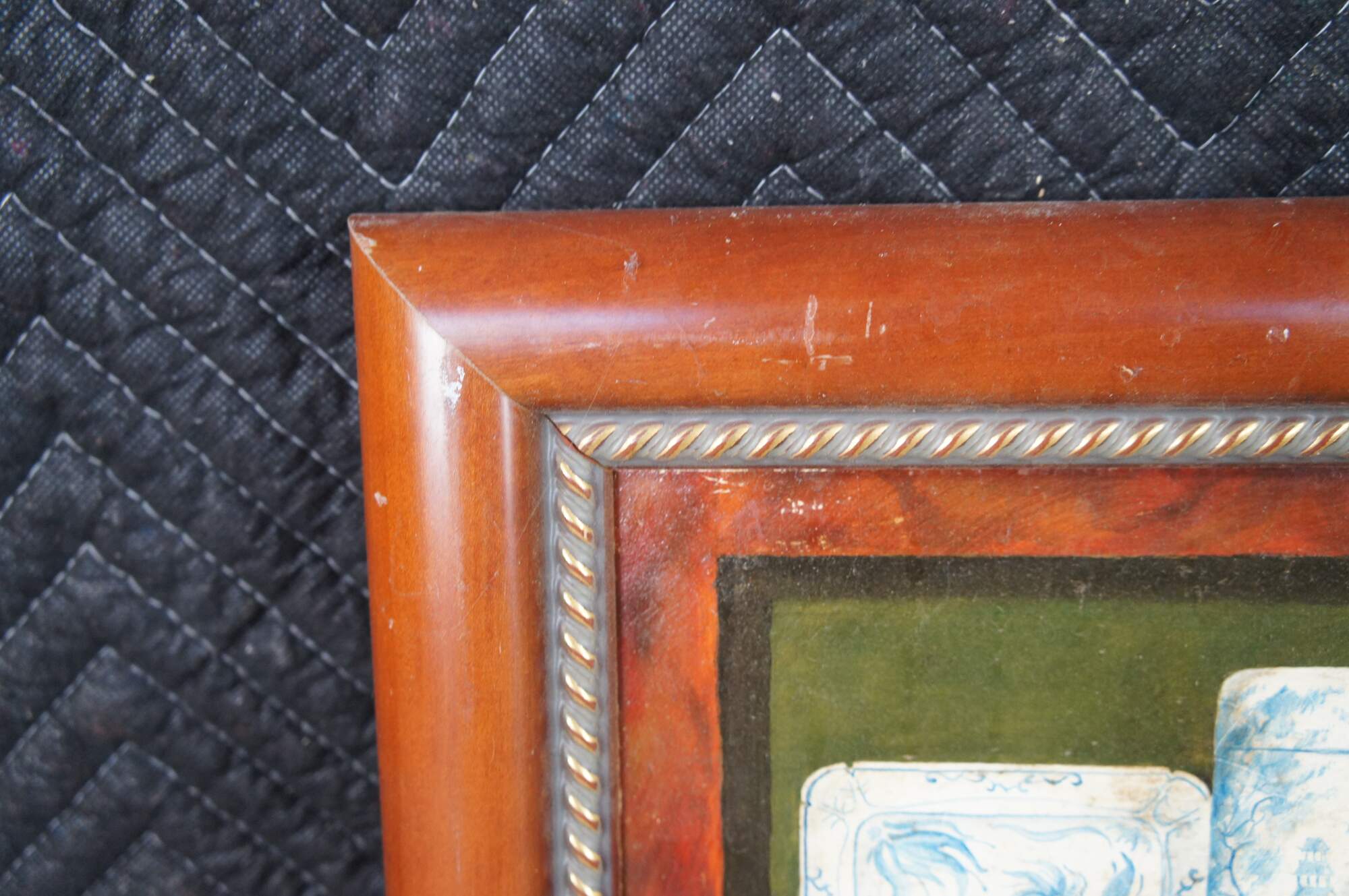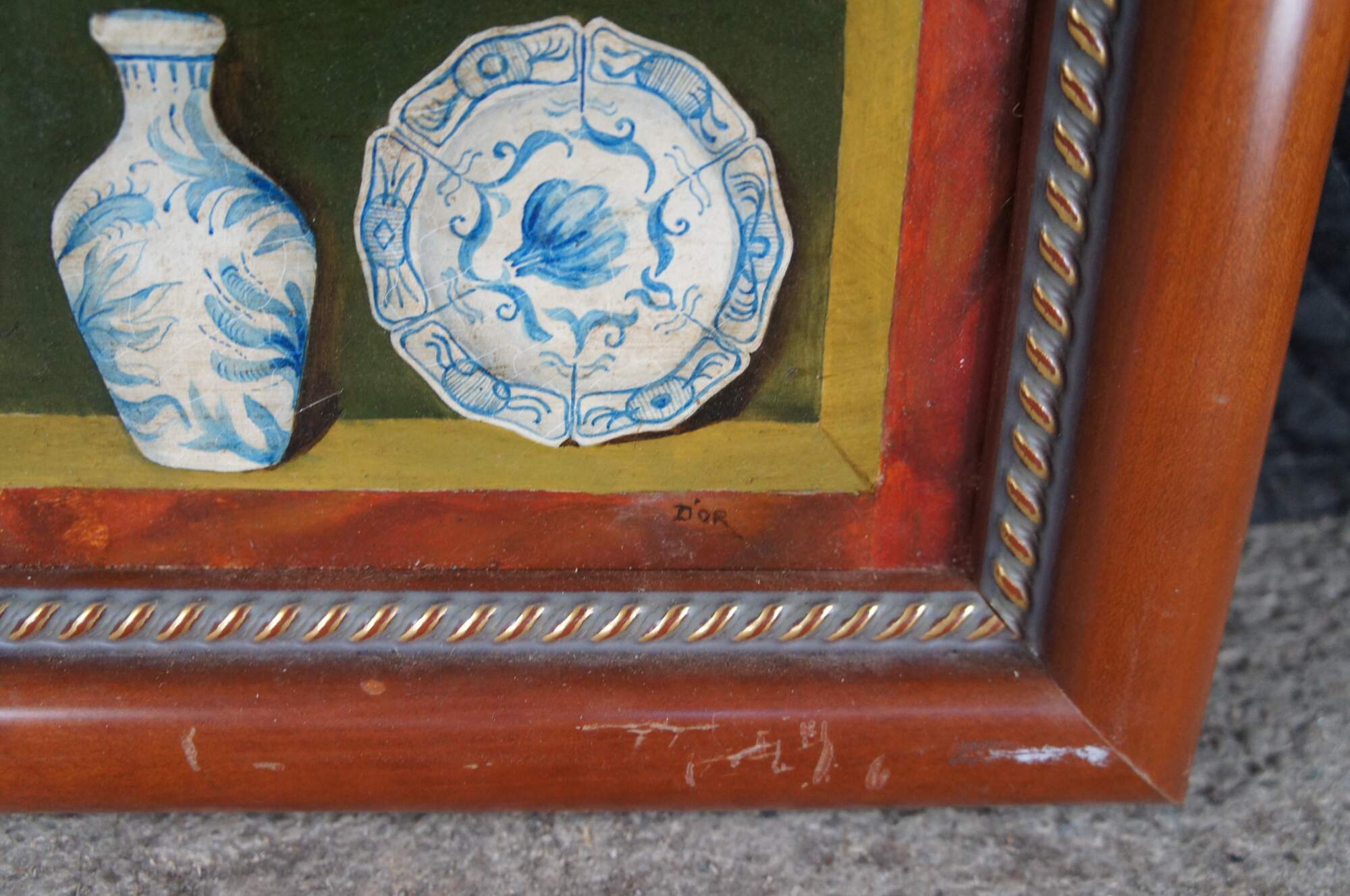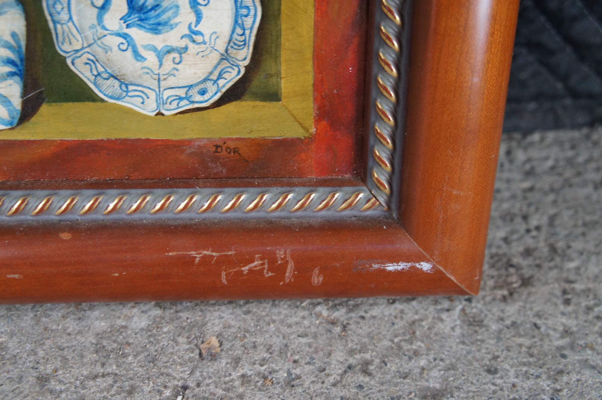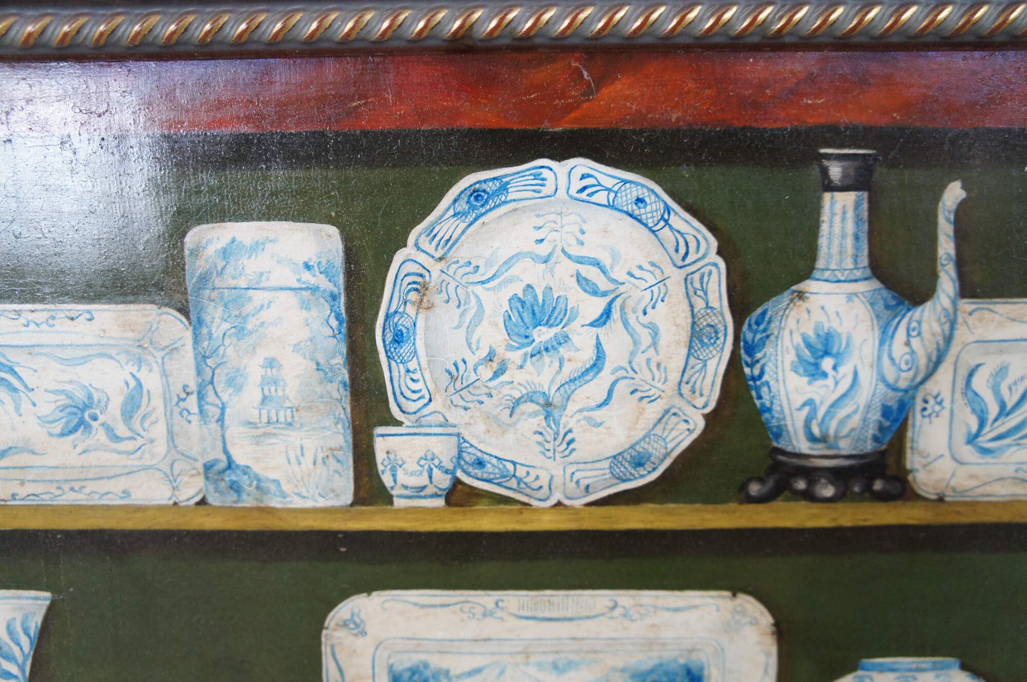 Late 20th century still life oil painting on canvas depicting a farmhouse hutch / cabinet containing a collection of blue and white china plates, bowls, tea cups, pitchers and assorted serving pieces. Signed, lower right by artist Fabrice De Villeneuve. Wood frame with gilt rope twist edge.