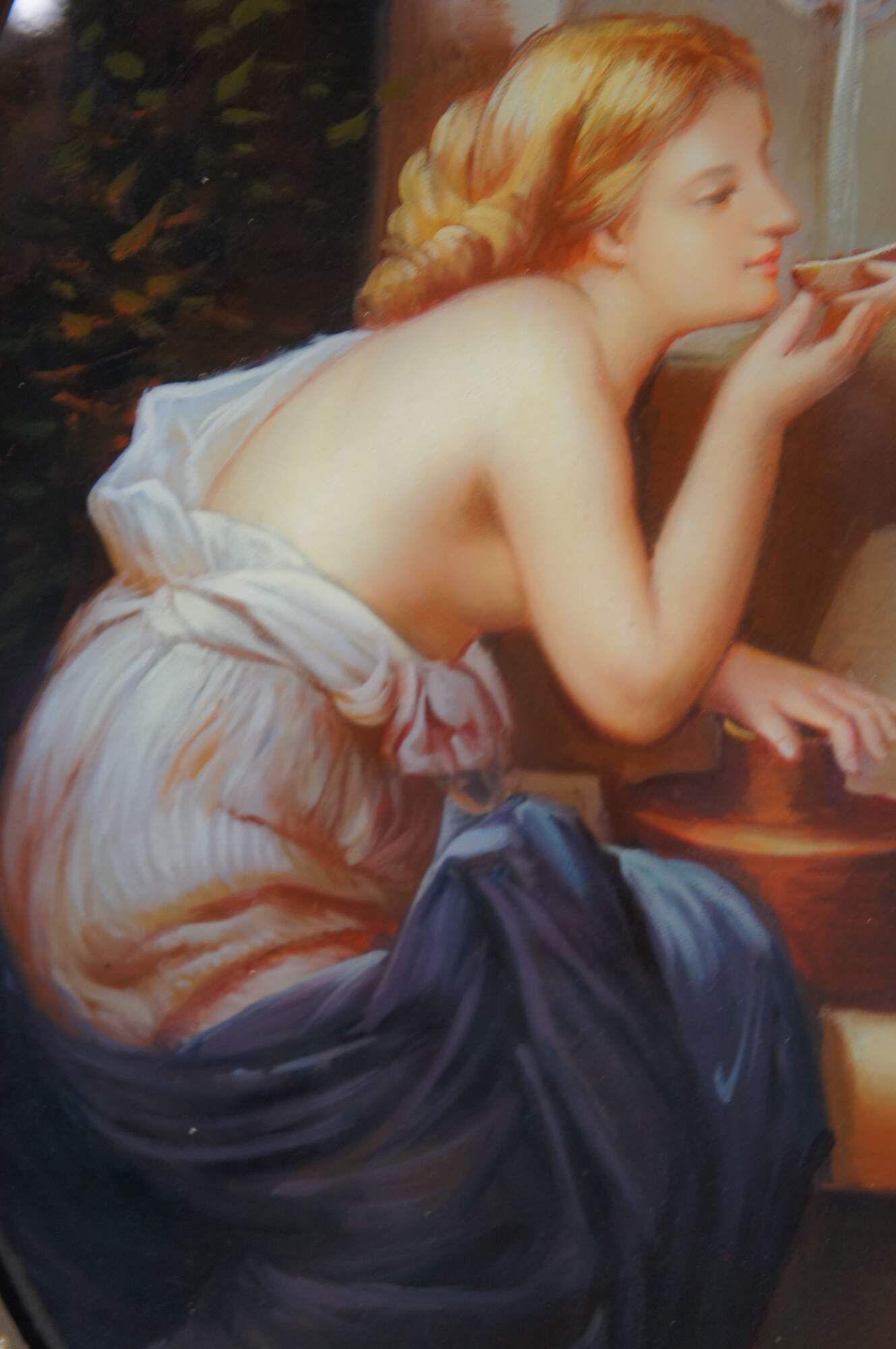 Vintage classical oil painting titled At The Fountain (aka Angel of love and À la Fontaine), after the famous French painting by Henri Pierre Picou. The scene depicts a mythological moment featuring a woman with a winged putto / cherub / Cupid, near a stone fountain. Rectangular oil painting housed in ornate gold Neoclassical oval frame with acanthus, foliate and ribbon design.