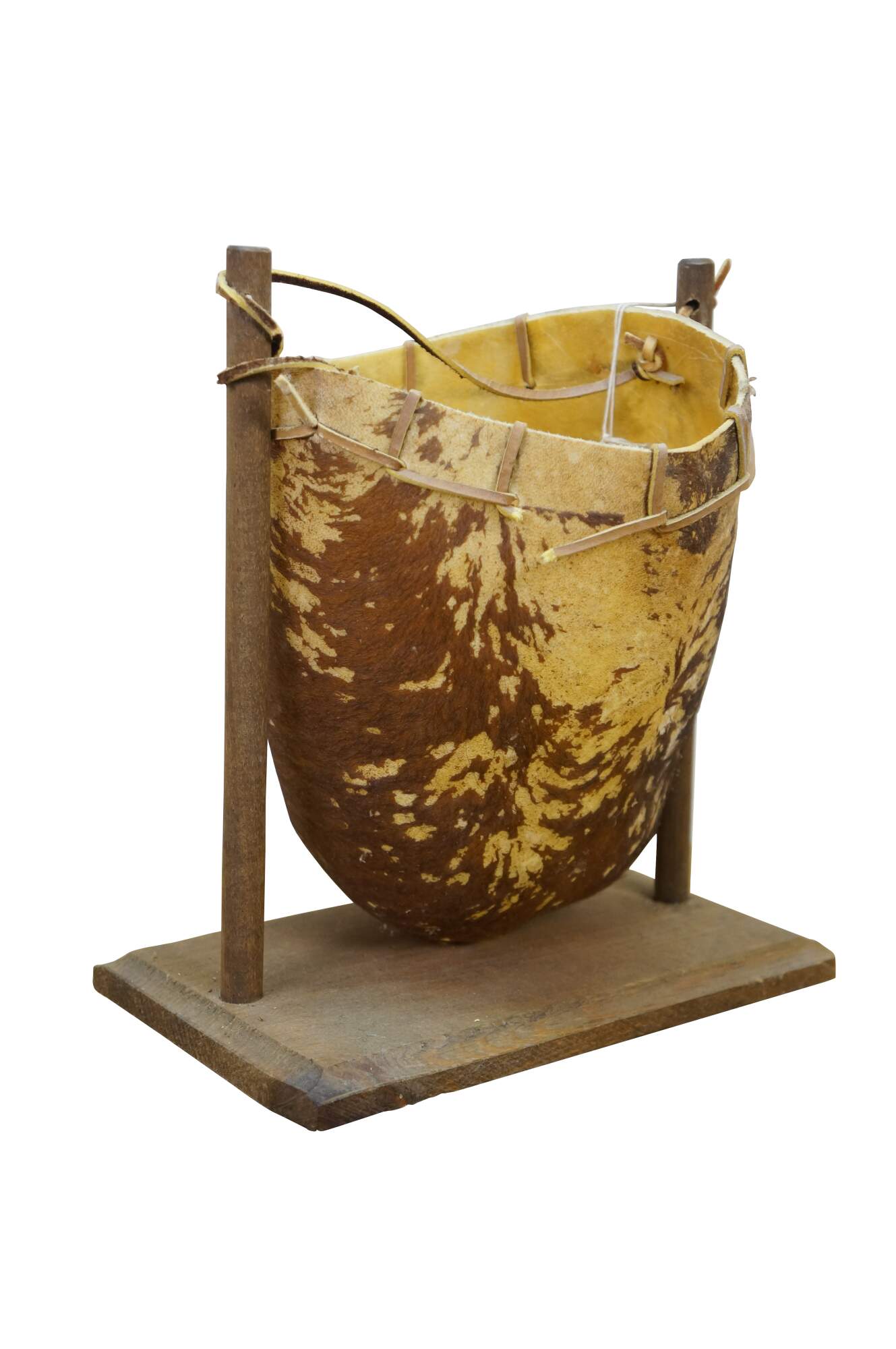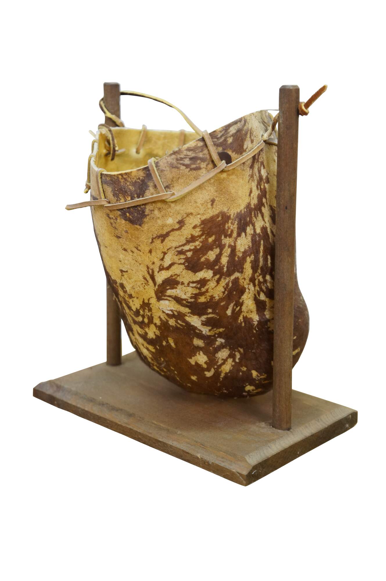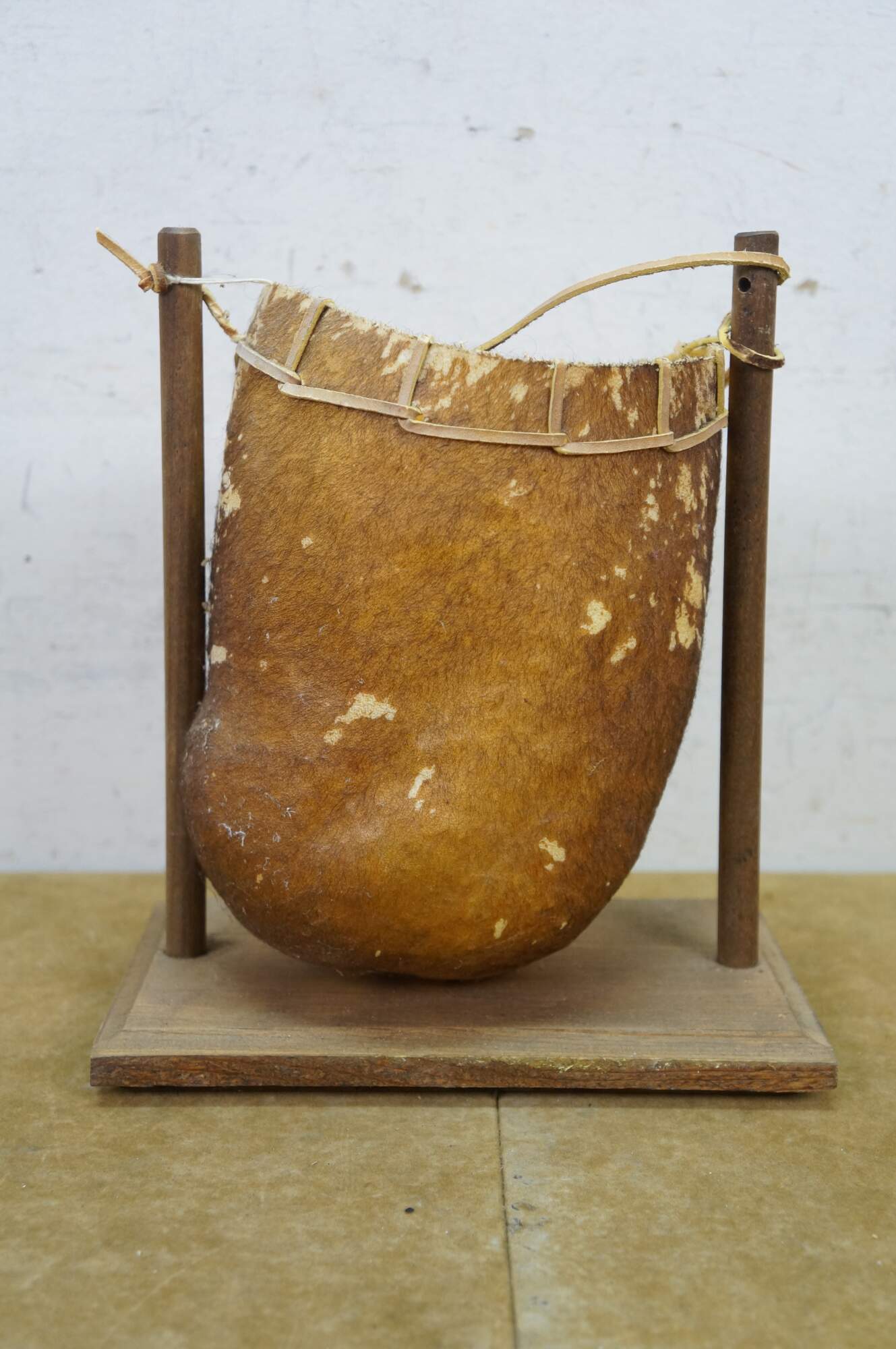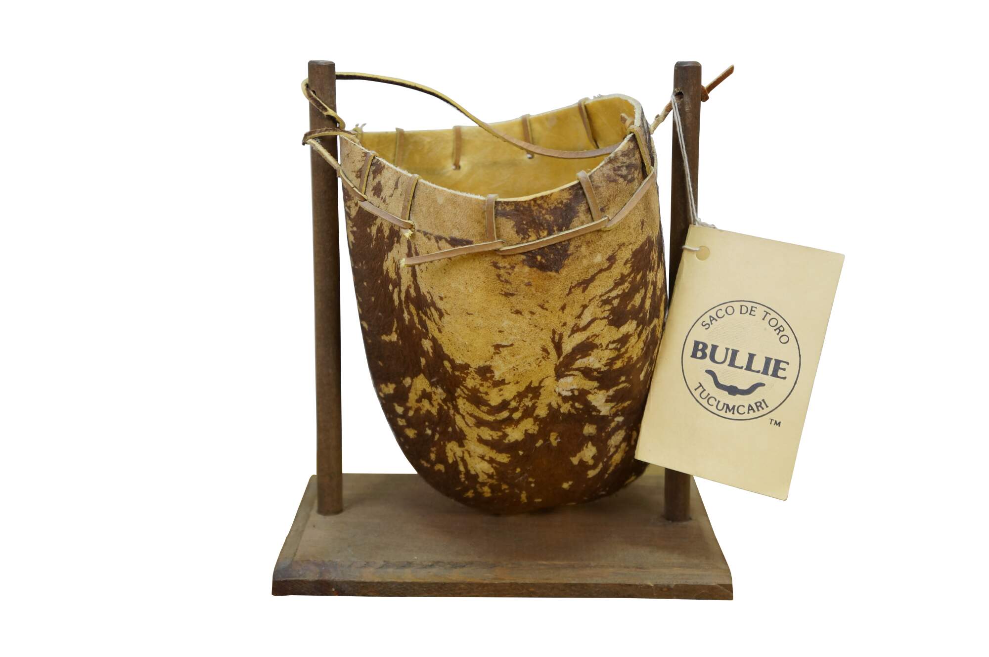 Vintage Saco De Toro Bullie Bull Scrotum bag on a wooden stand, circa 1980s. Handcrafted from organic materials, designed to hang from a wooden frame. Tucumcari, New Mexico.