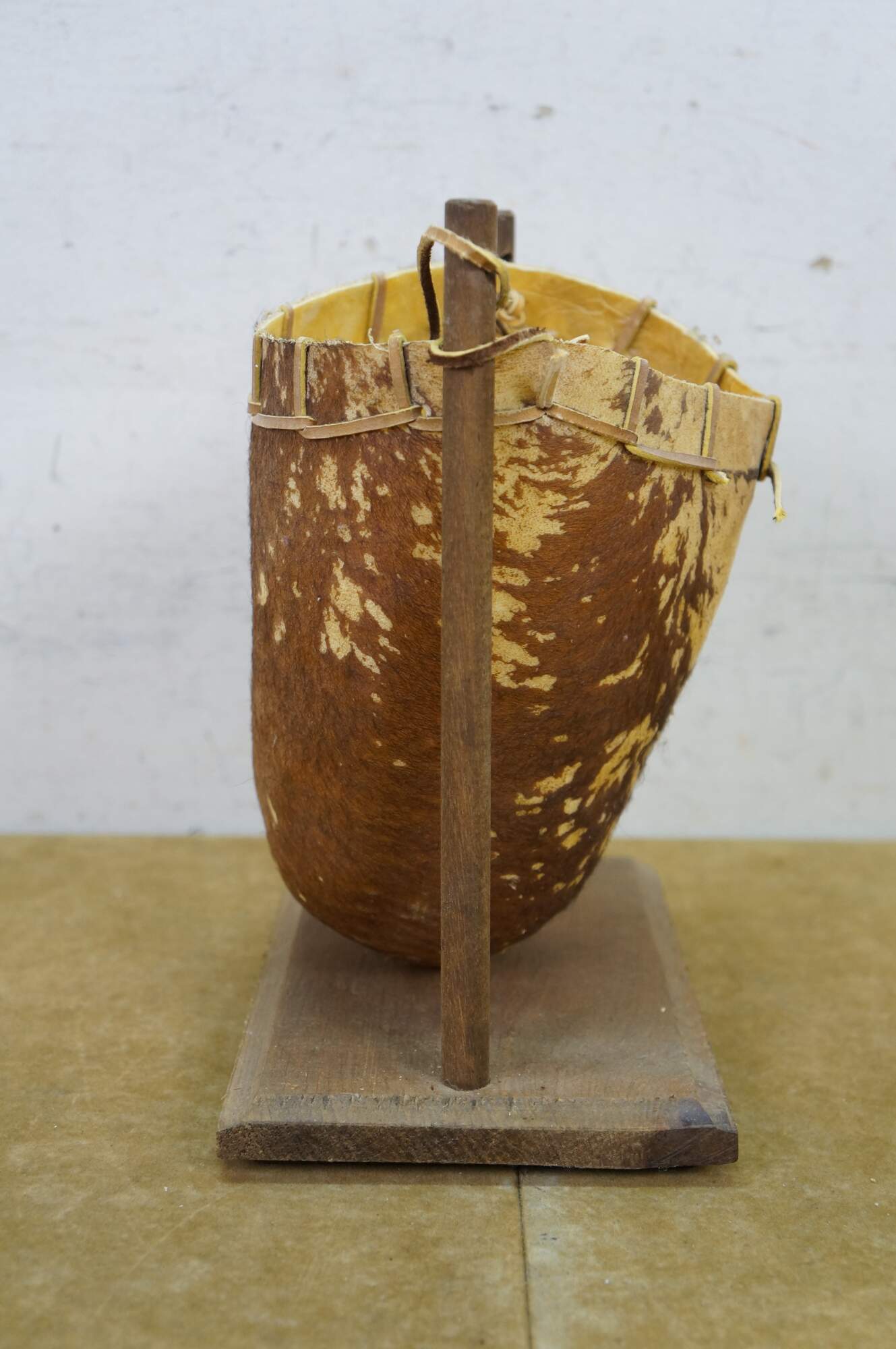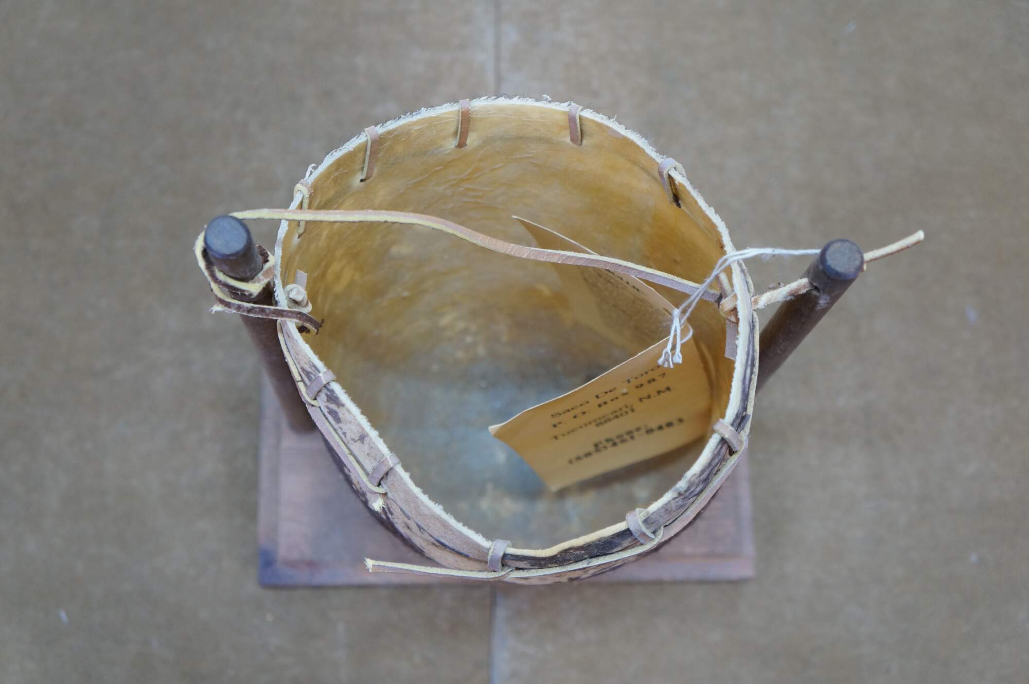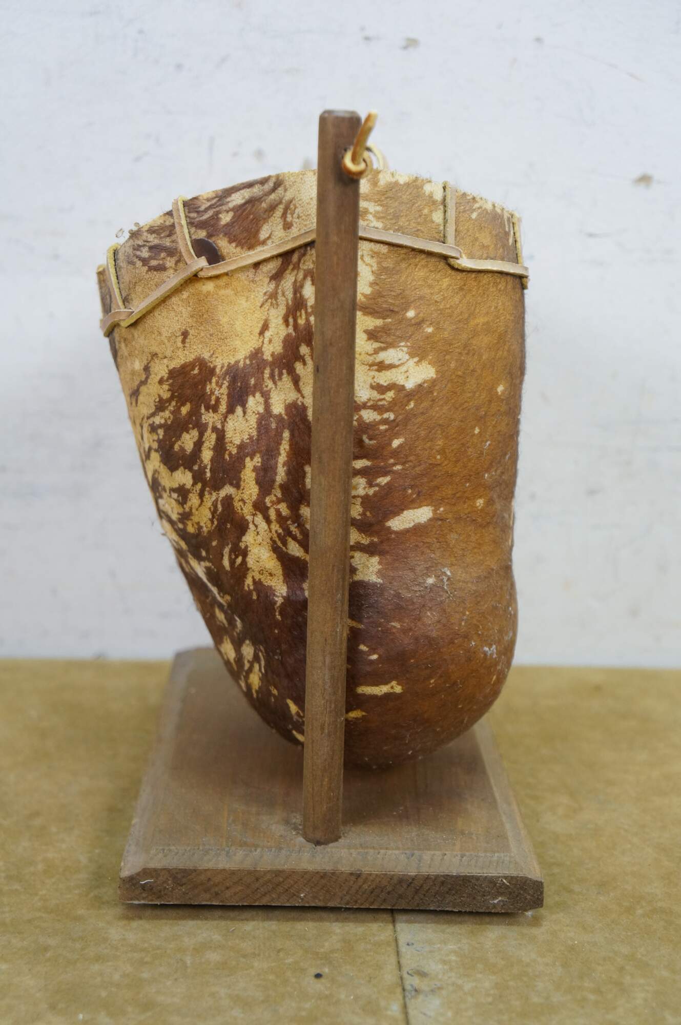 Vintage Saco De Toro Bullie Bull Scrotum bag on a wooden stand, circa 1980s. Handcrafted from organic materials, designed to hang from a wooden frame. Tucumcari, New Mexico.