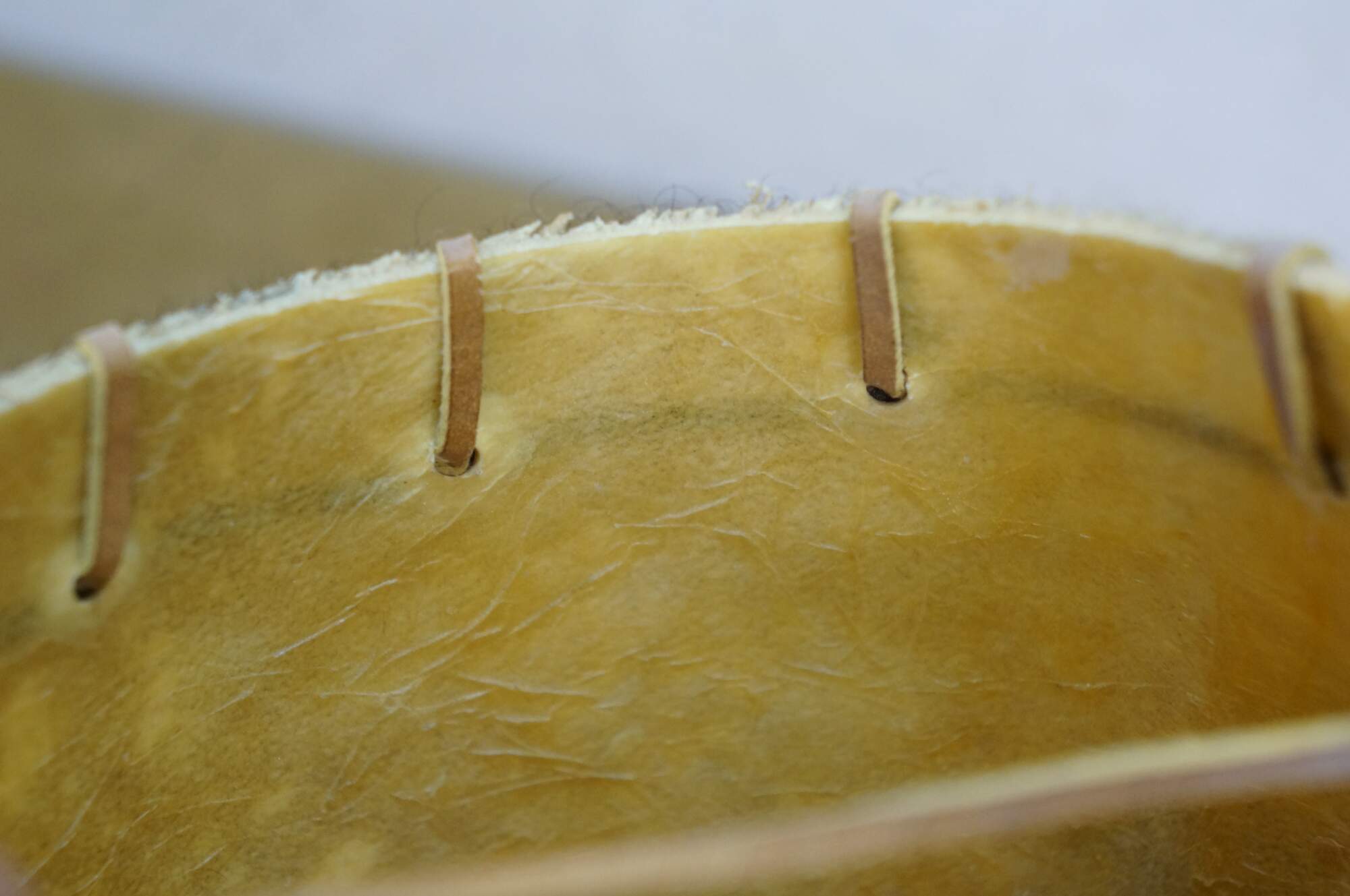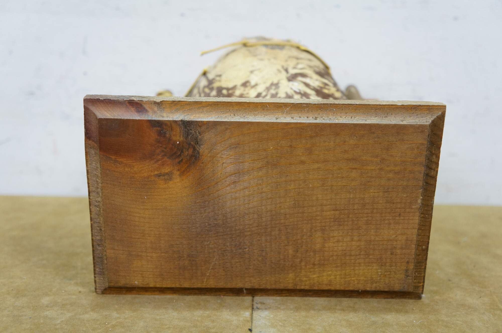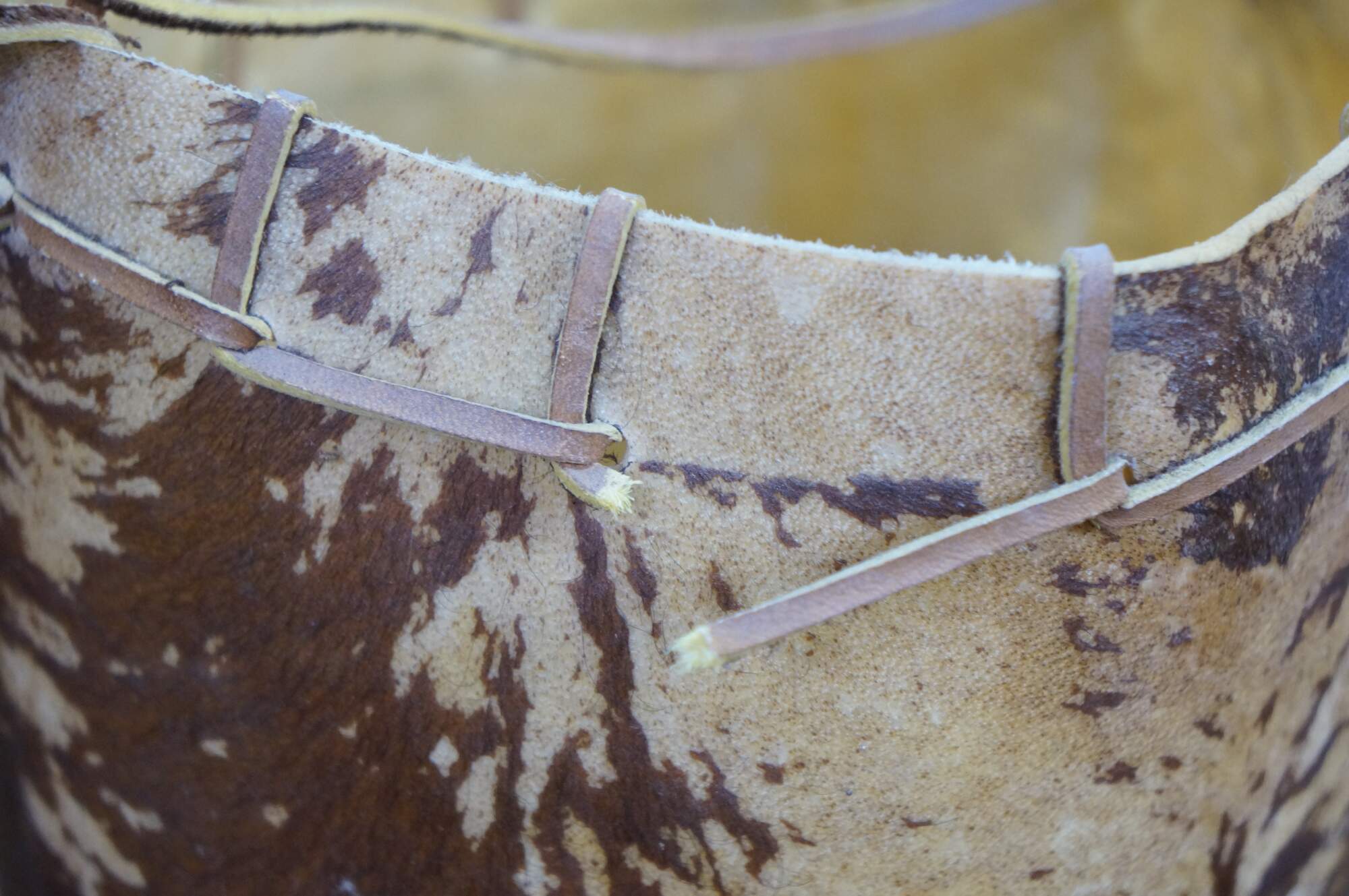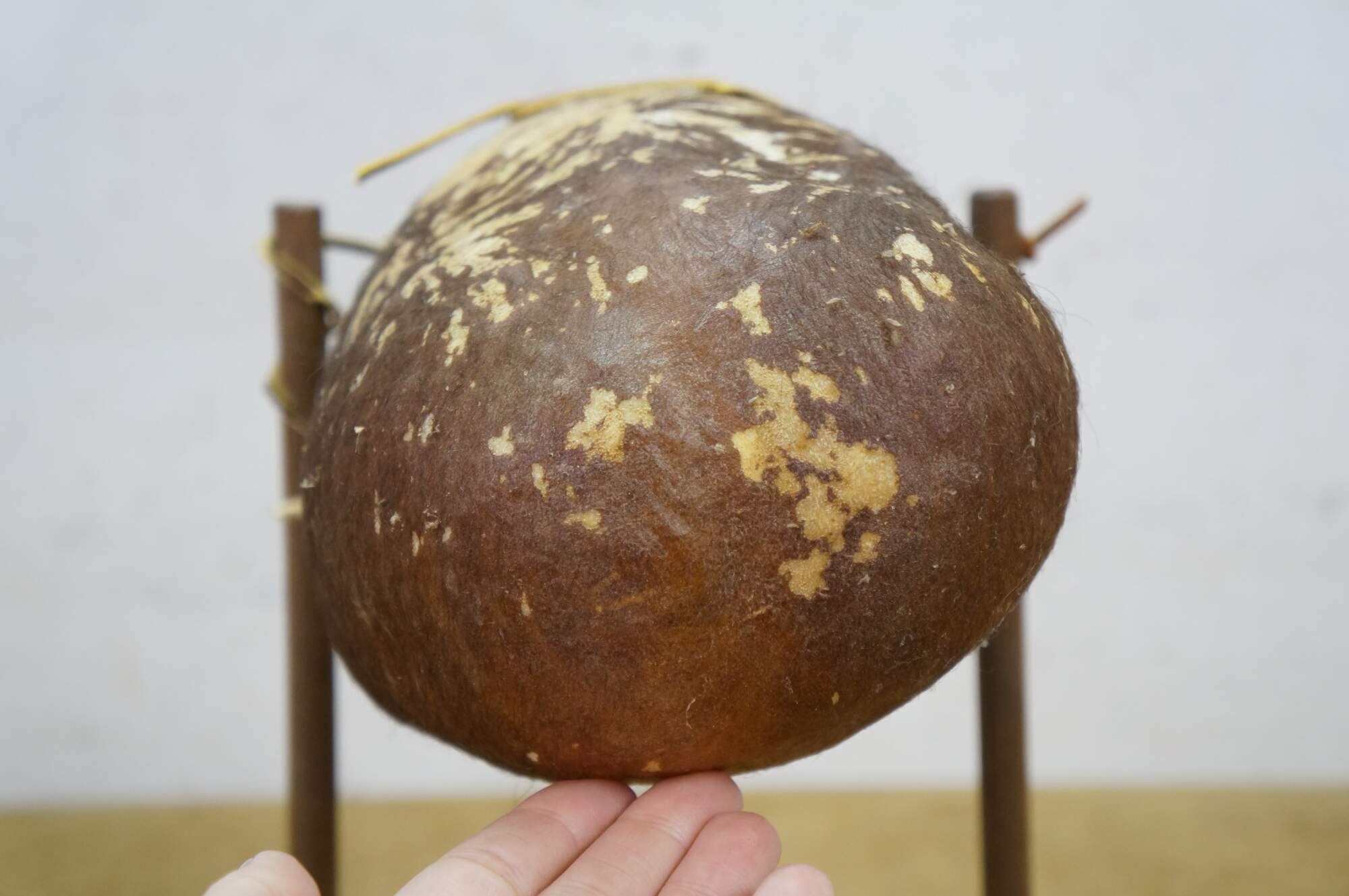 Vintage Saco De Toro Bullie Bull Scrotum bag on a wooden stand, circa 1980s. Handcrafted from organic materials, designed to hang from a wooden frame. Tucumcari, New Mexico.