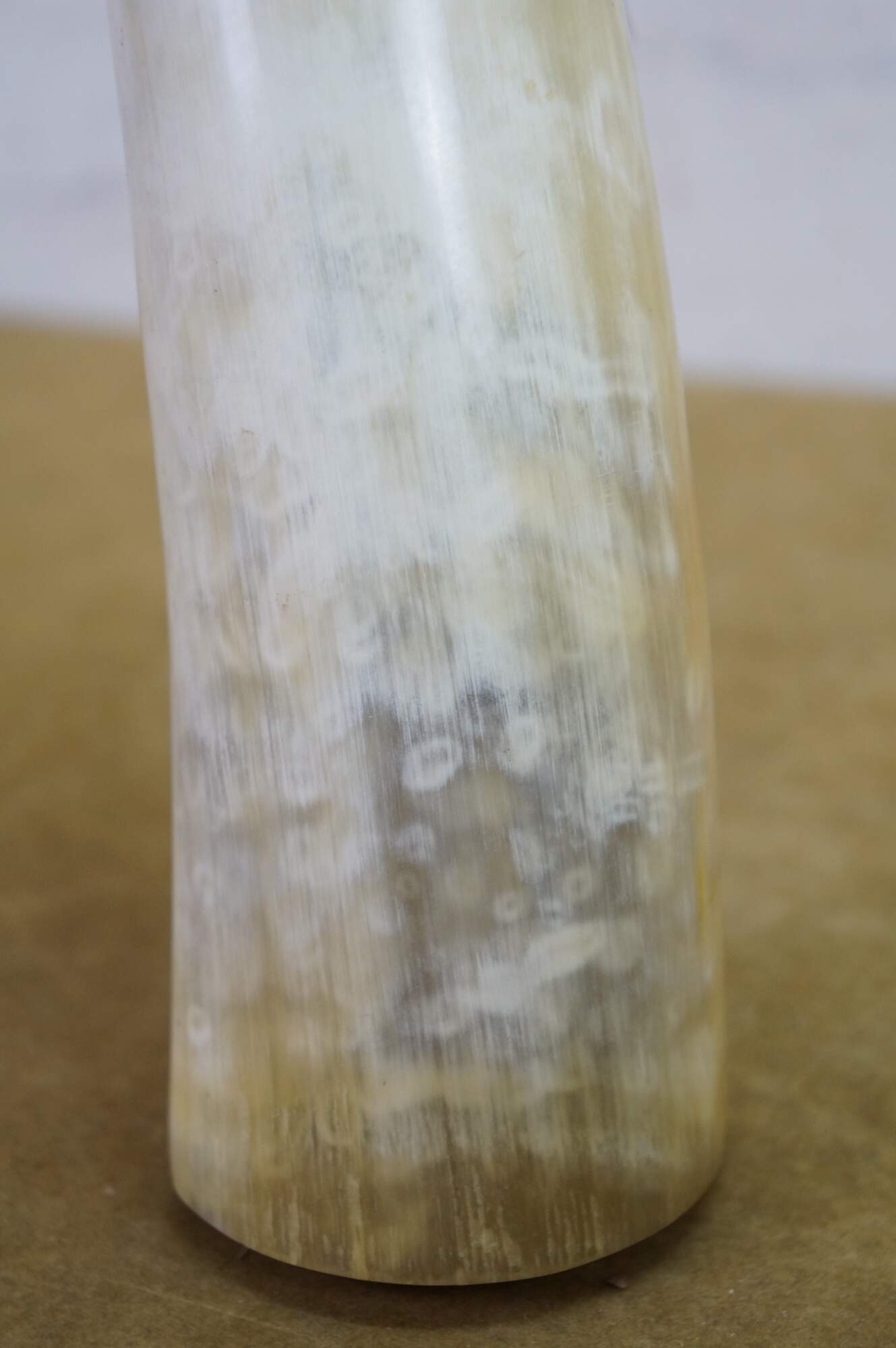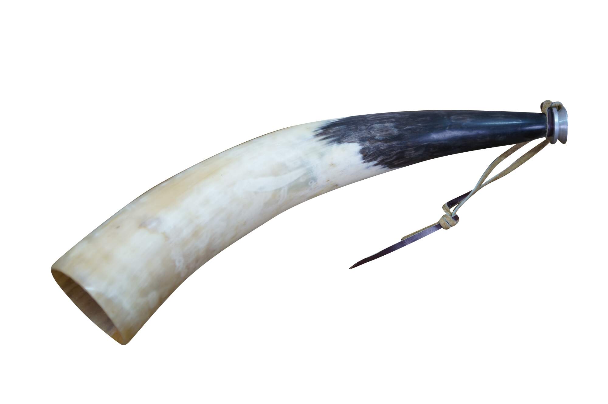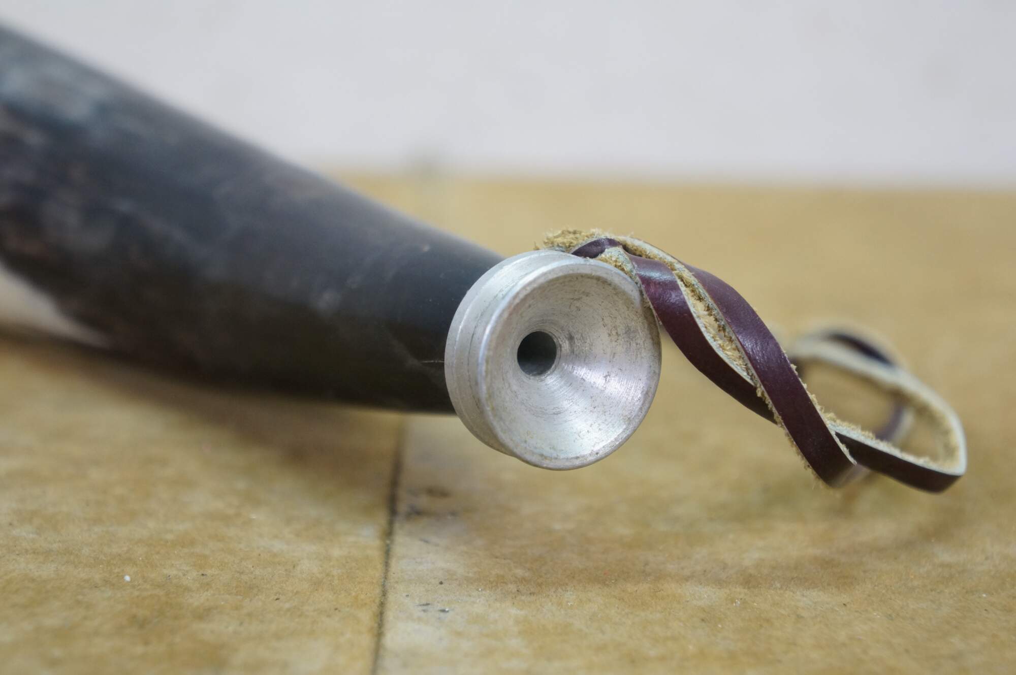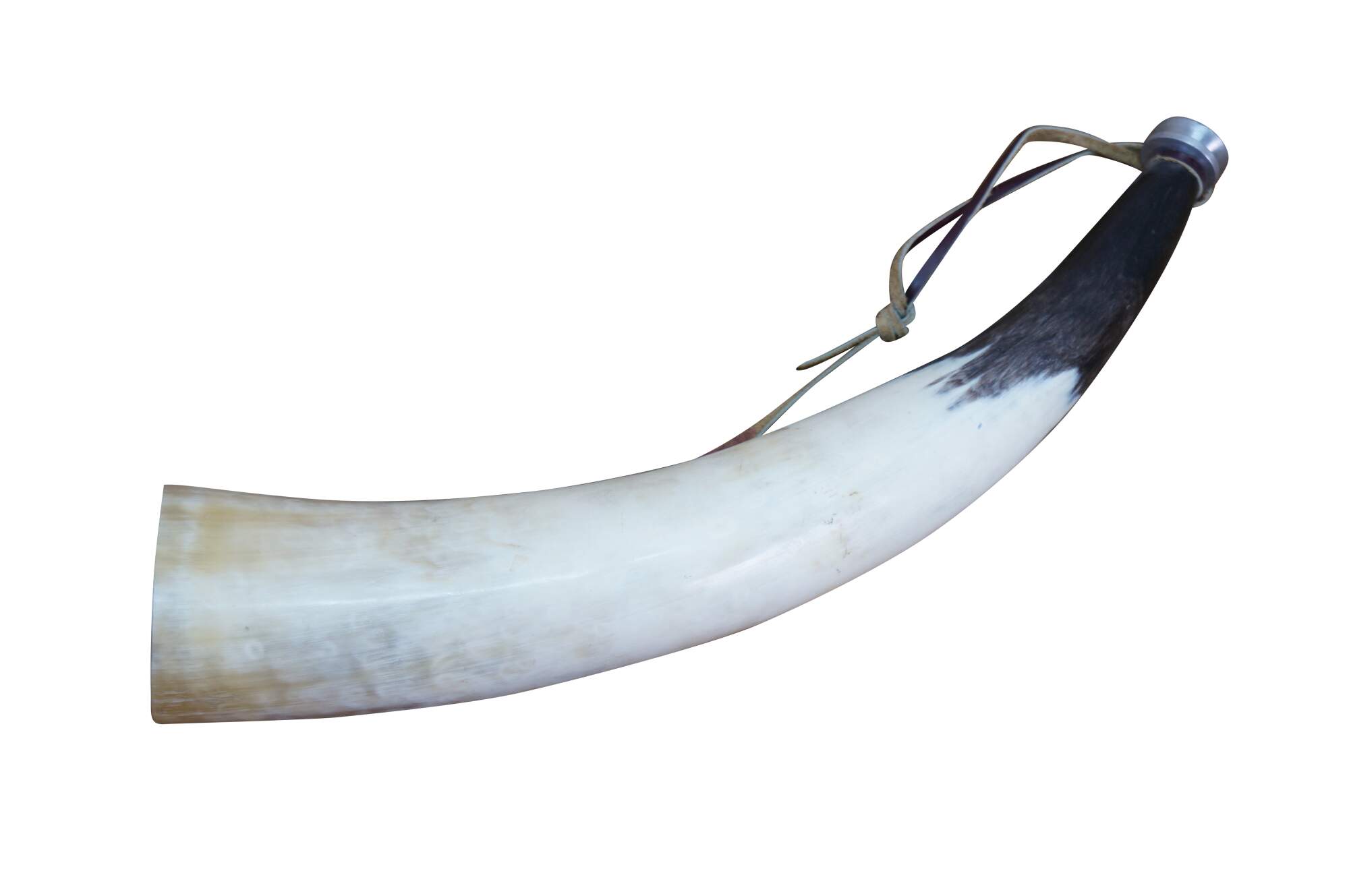Vintage powder horn / trumpet, a traditional container used to hold black powder for firearms. Made from a natural cow or bull horn with a metal mouthpiece tip and leather strap. Common in the 18th and 19th centuries by hunters and soldiers.