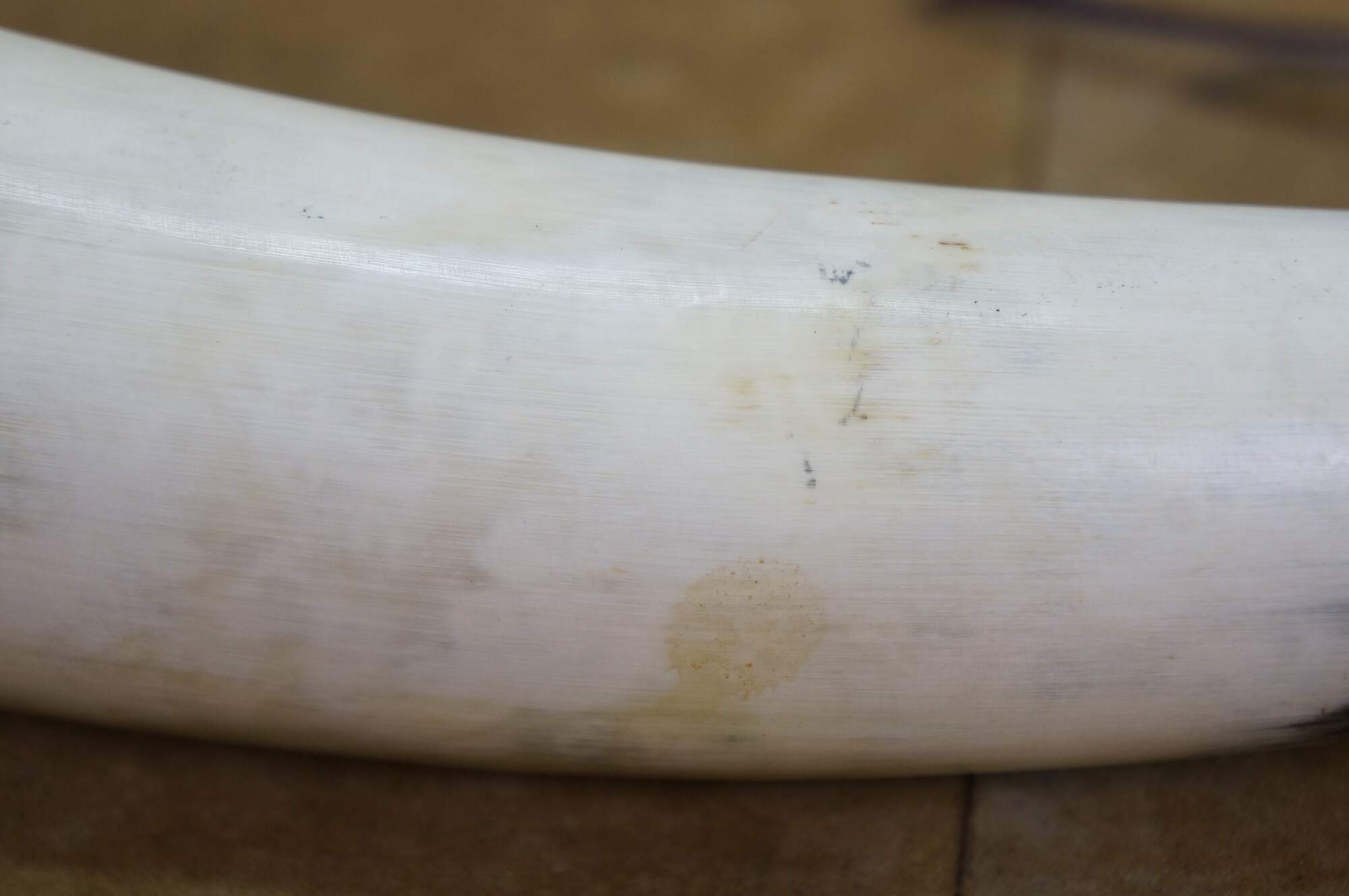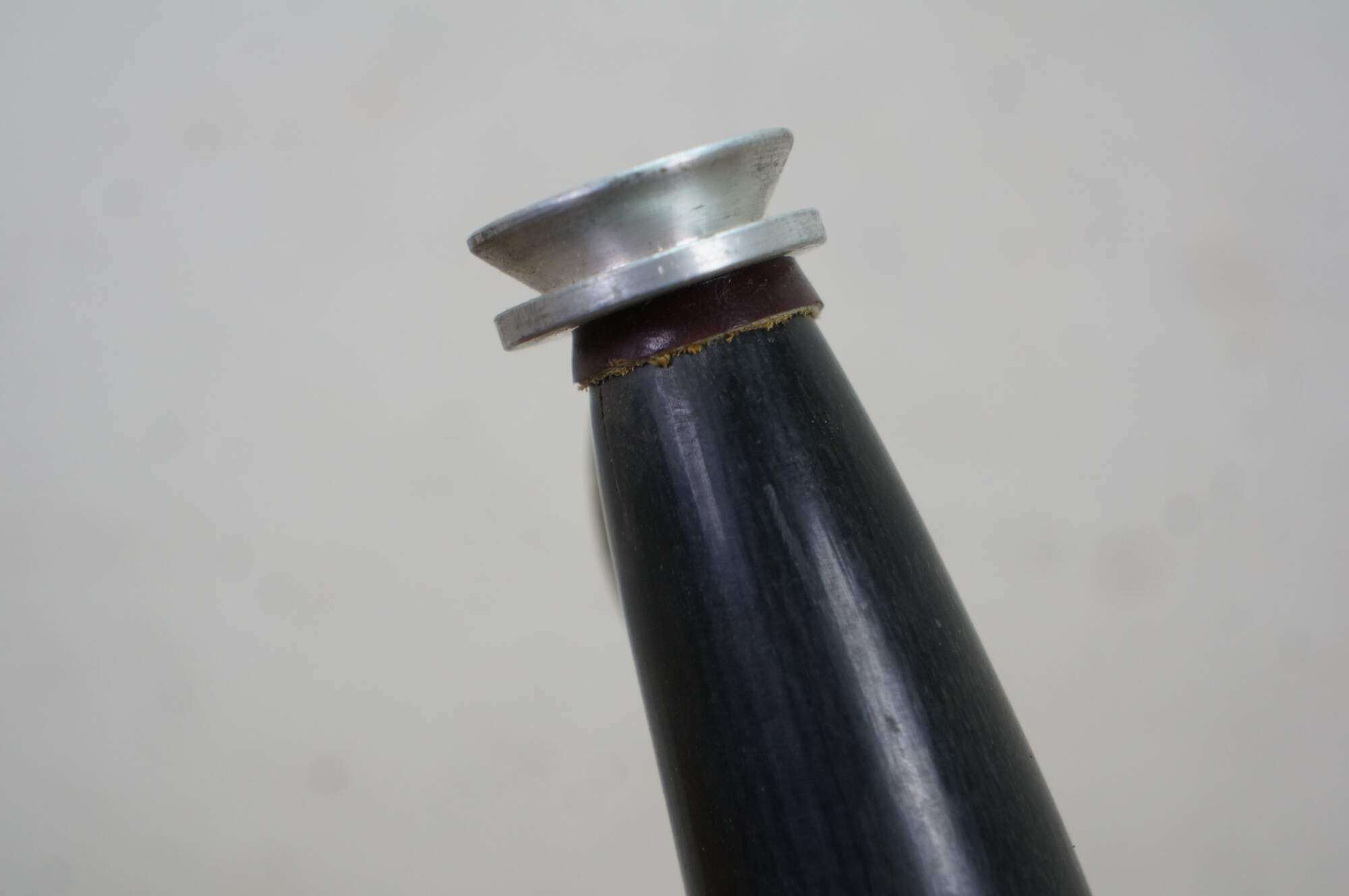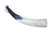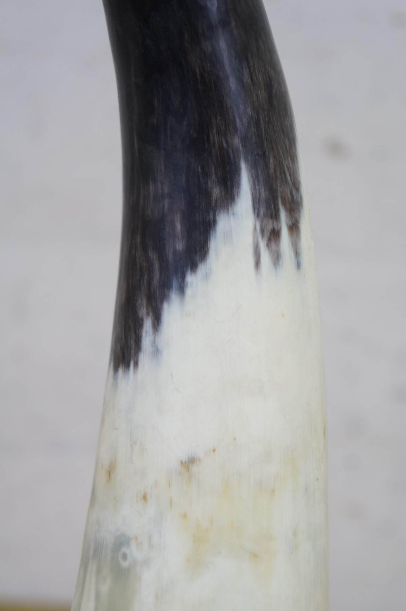 Vintage powder horn / trumpet, a traditional container used to hold black powder for firearms. Made from a natural cow or bull horn with a metal mouthpiece tip and leather strap. Common in the 18th and 19th centuries by hunters and soldiers.