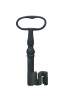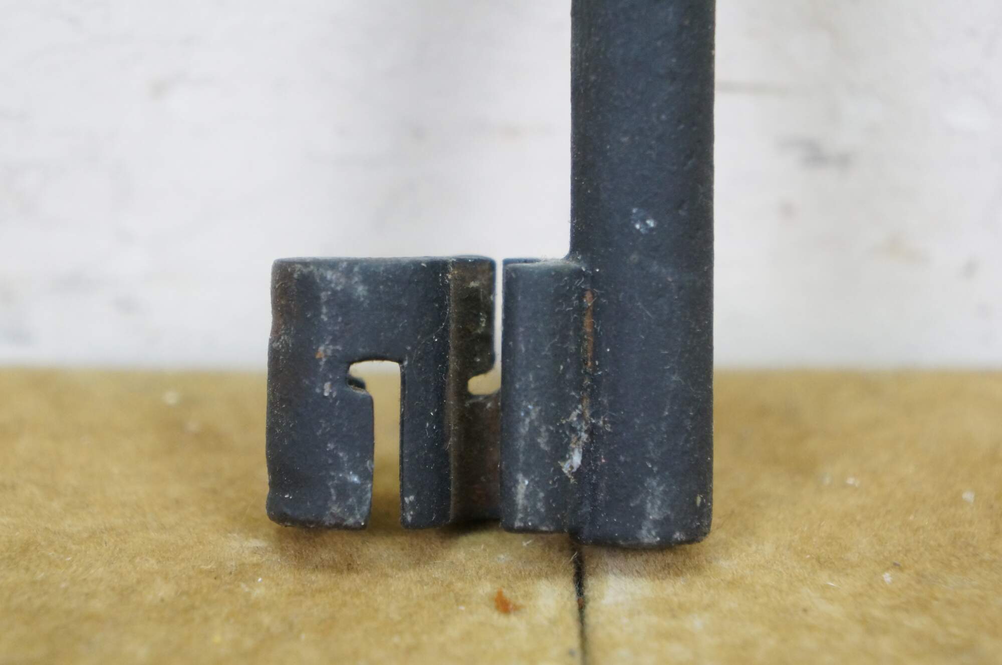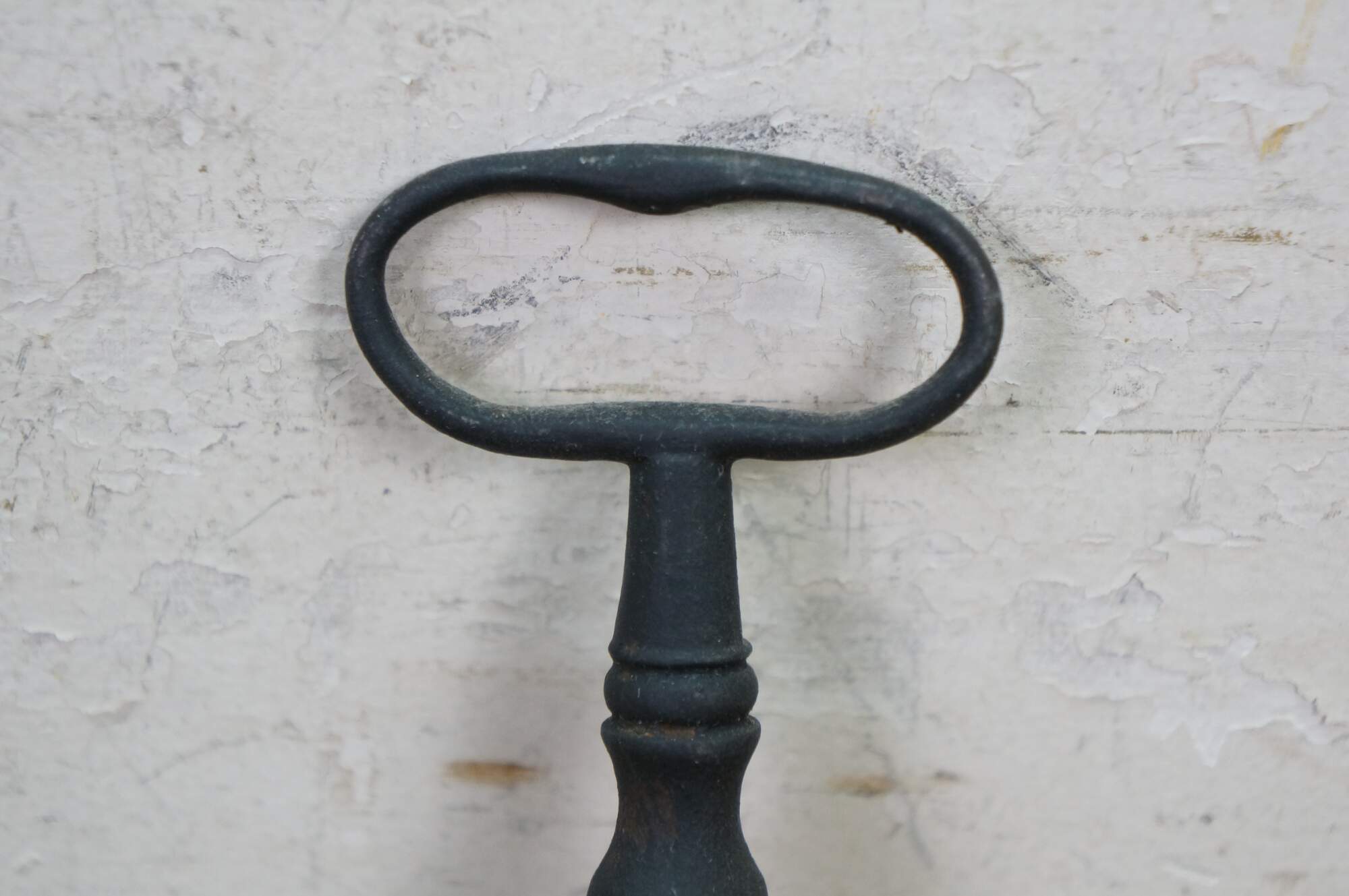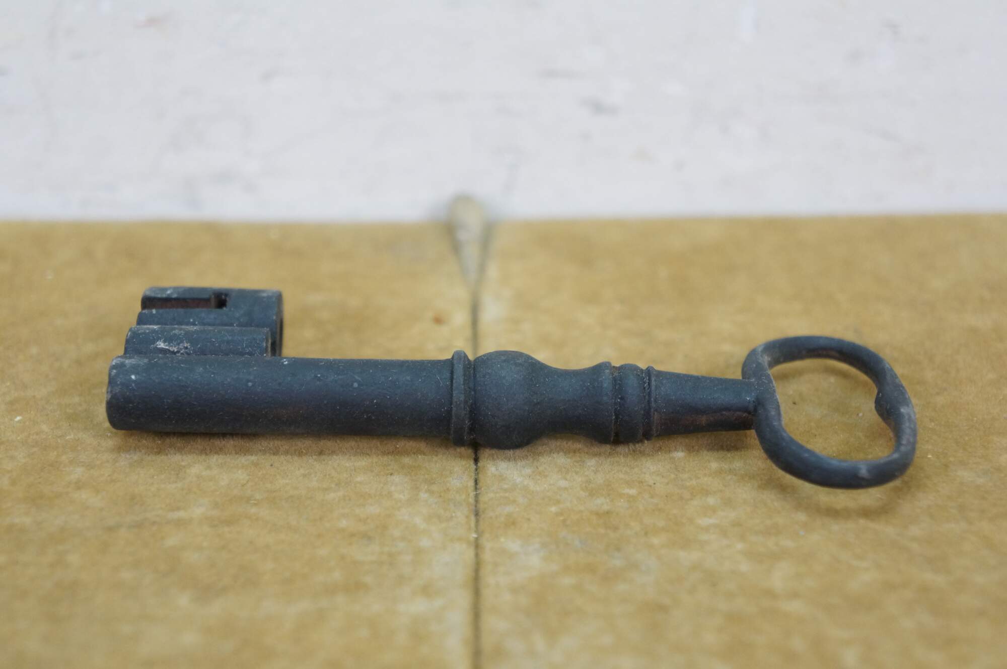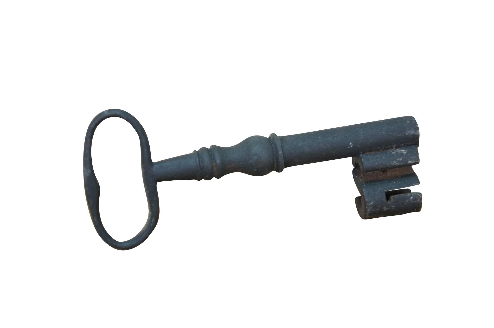Antique wrought iron skeleton key for a large door, gate, cabinet, trunk, armoire, or jail cell. Features a large bow (handle), a solid or hollow barrel, and a complex bit (the part that interacts with the lock mechanism).
