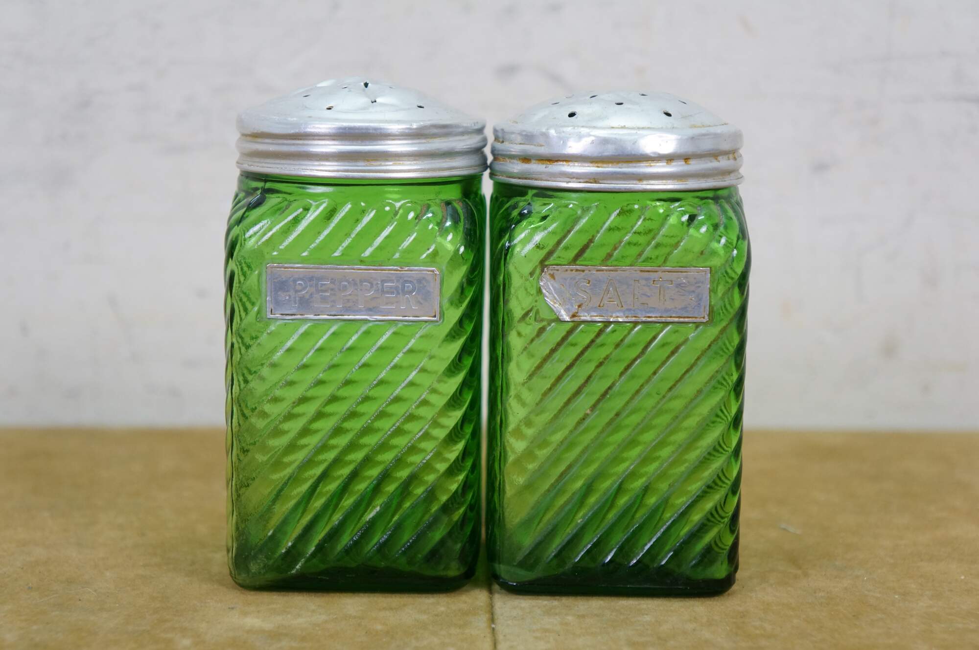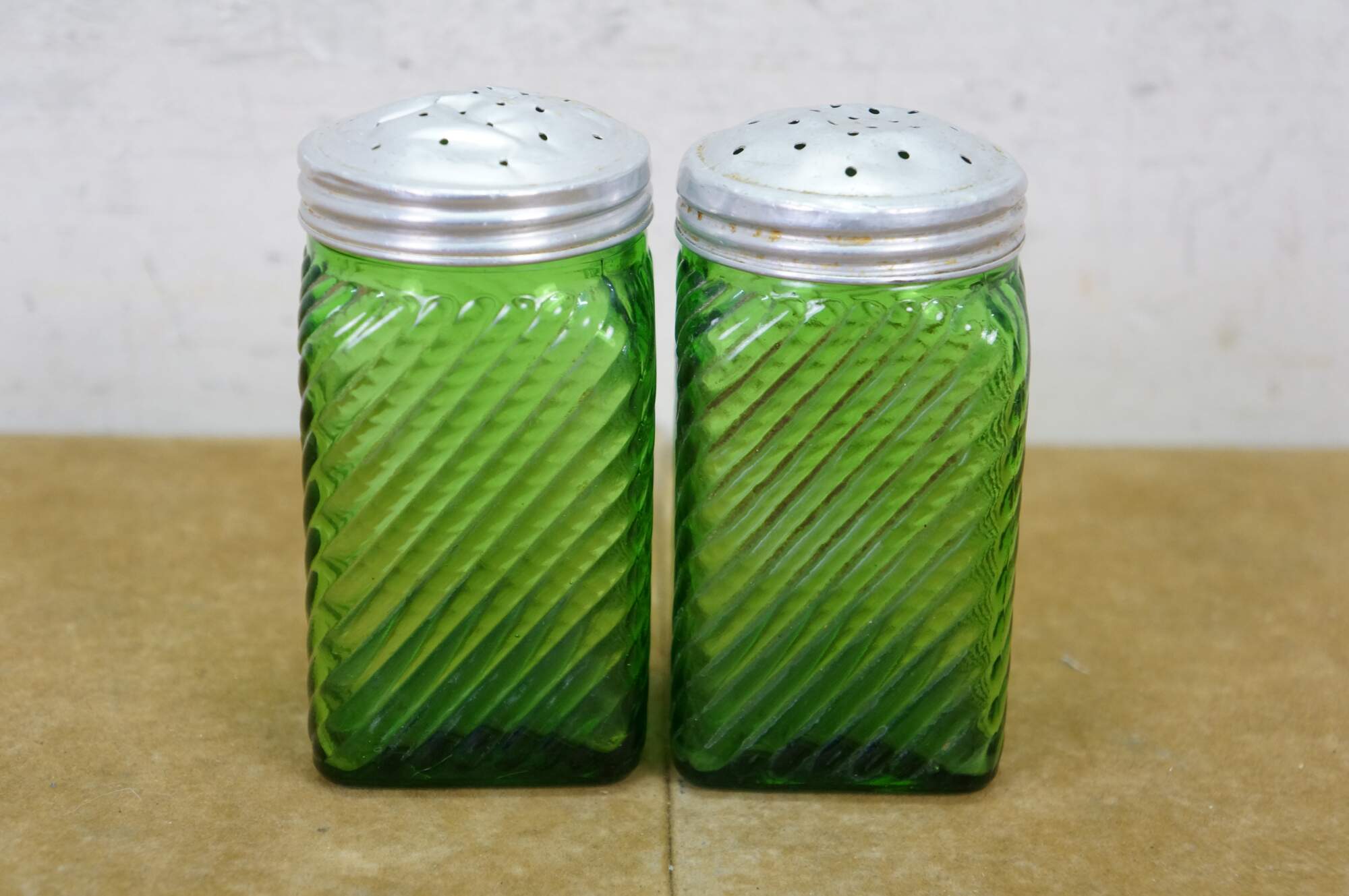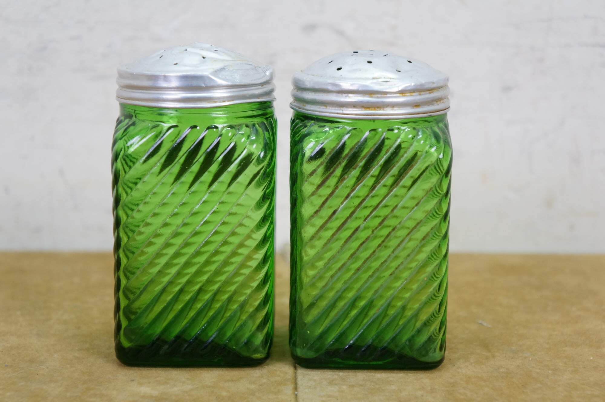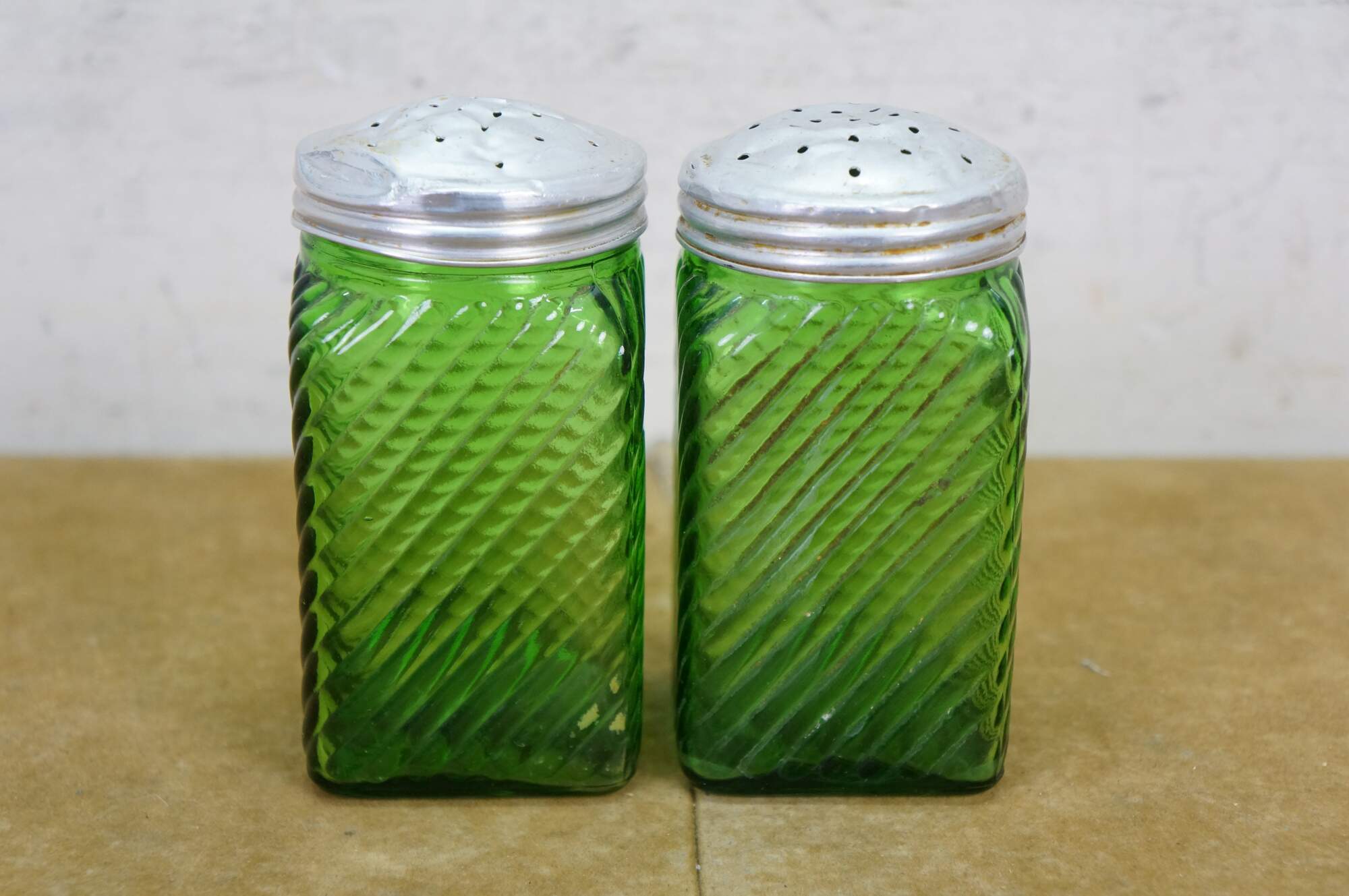 Two Antique Owens Illinois Hoosier Green Ribbed Glass Sugar Salt Pepper Spice Shakers.