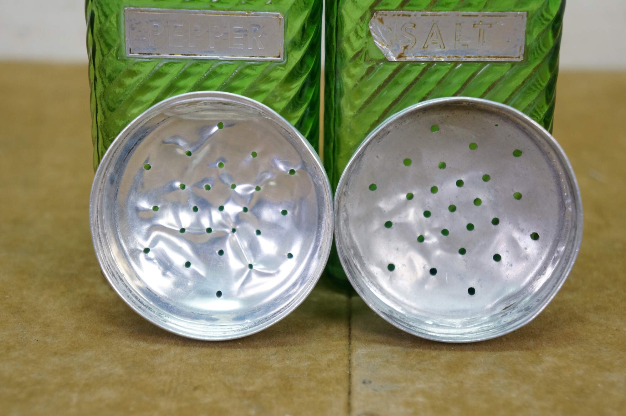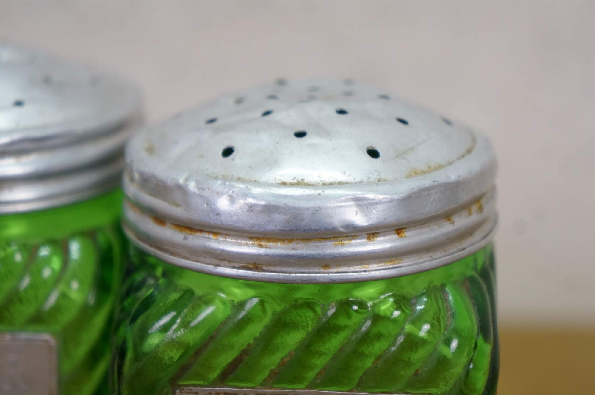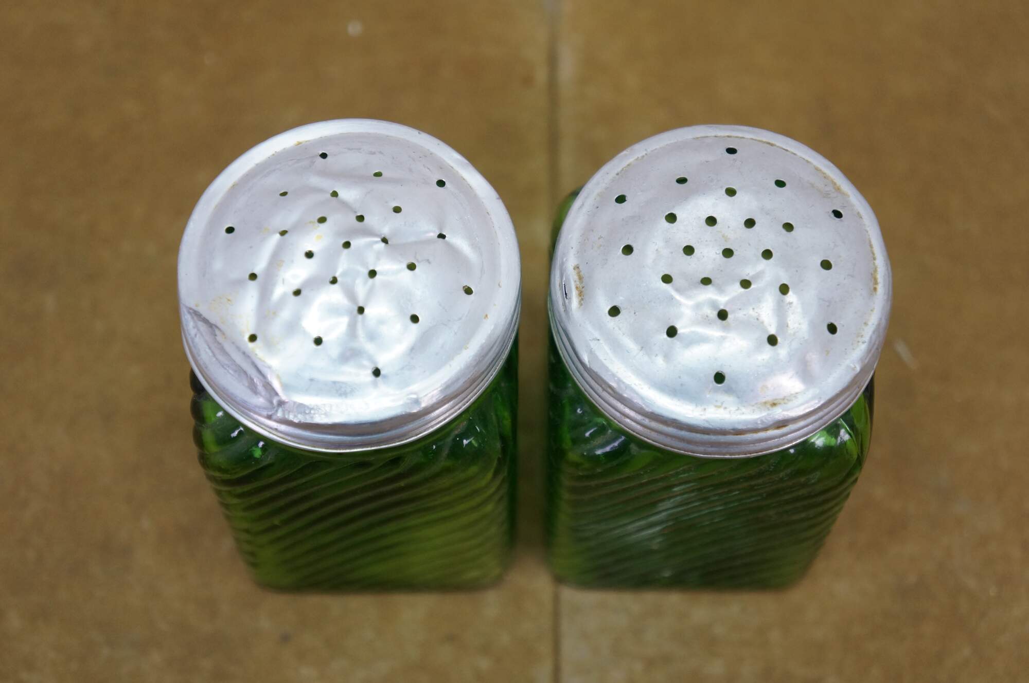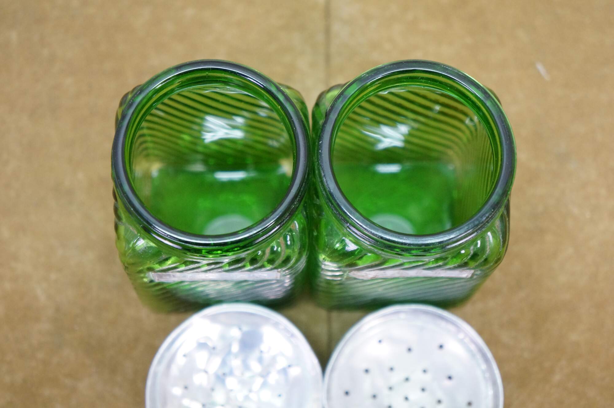 Two Antique Owens Illinois Hoosier Green Ribbed Glass Sugar Salt Pepper Spice Shakers.