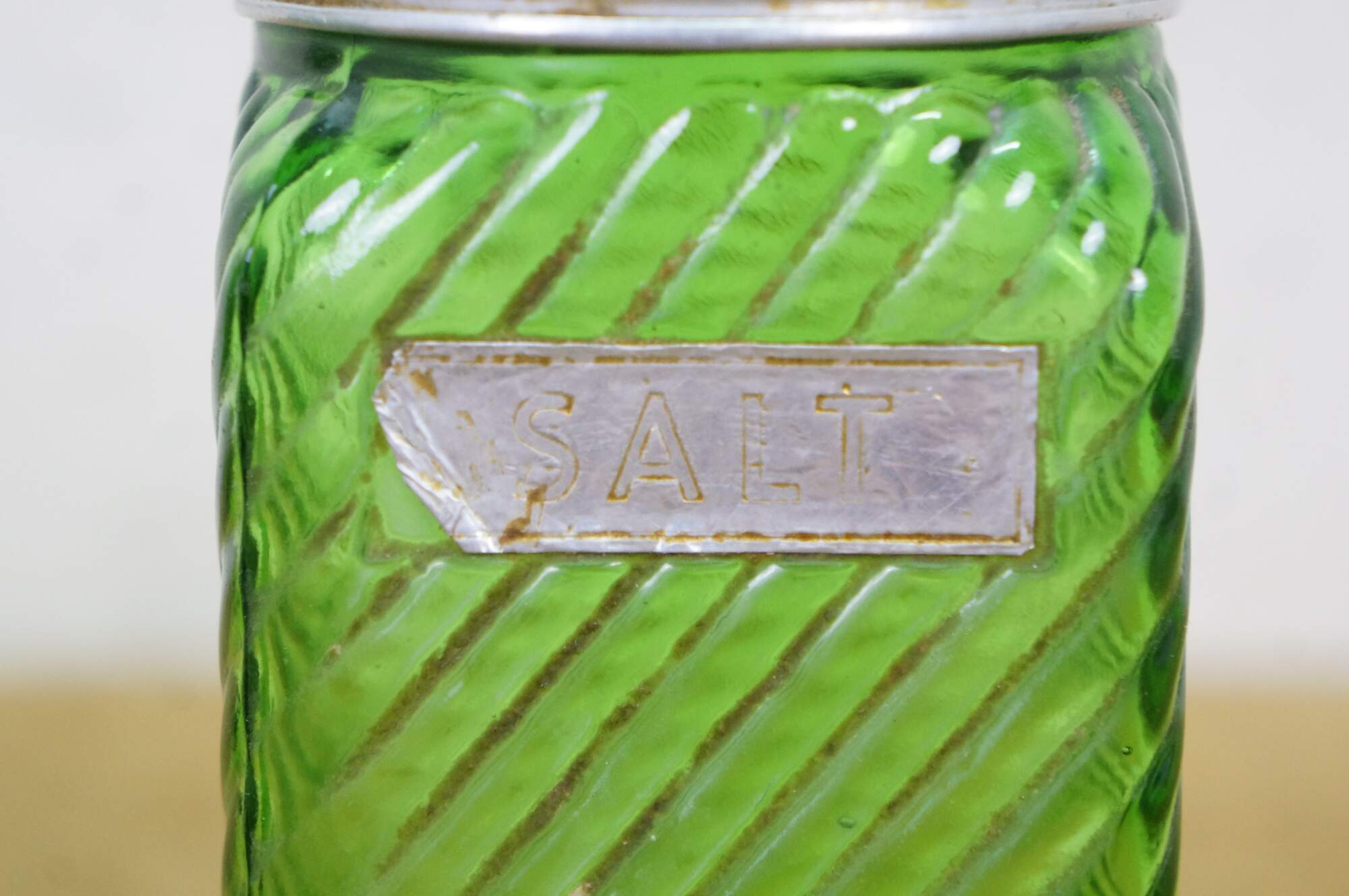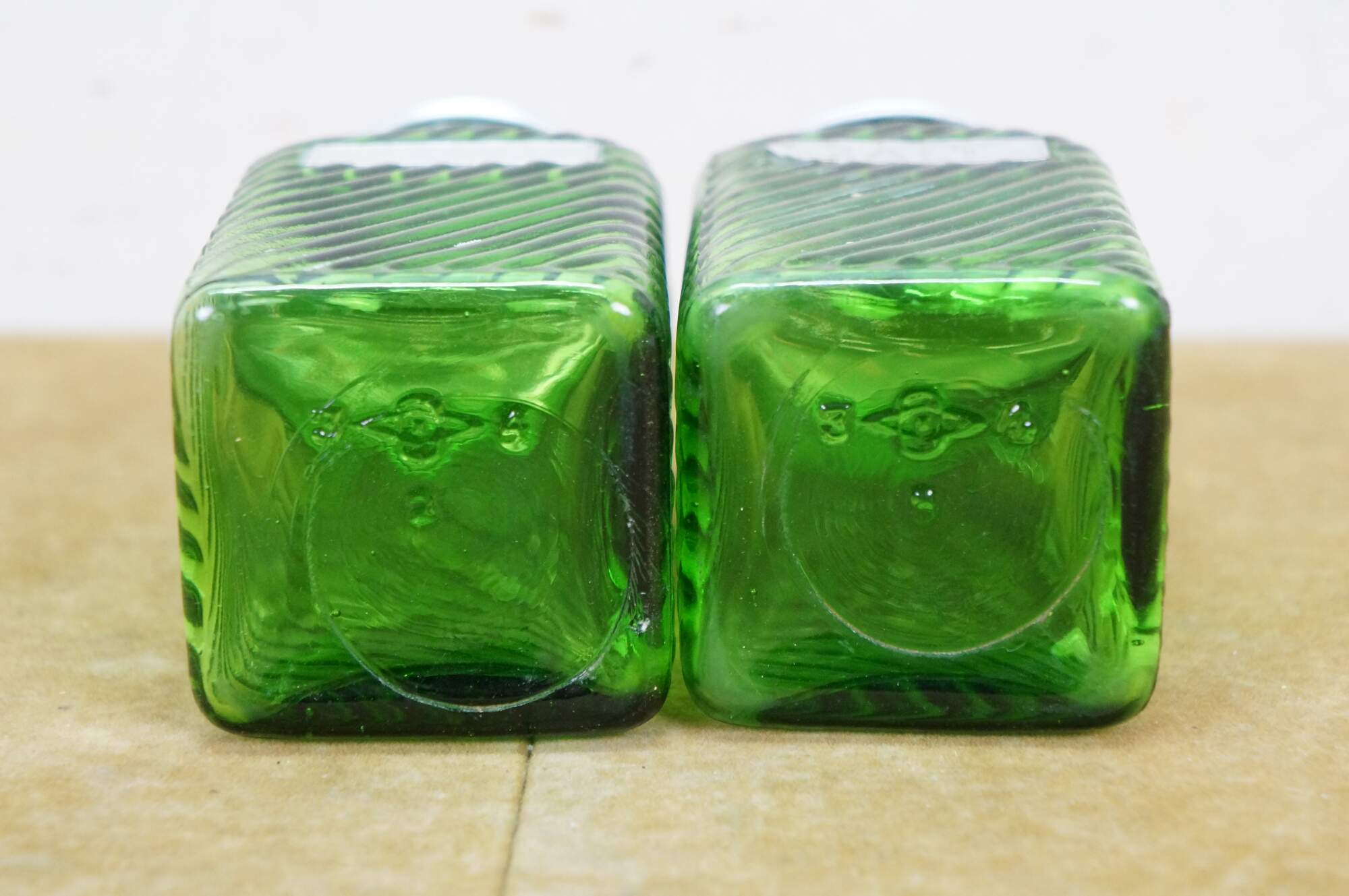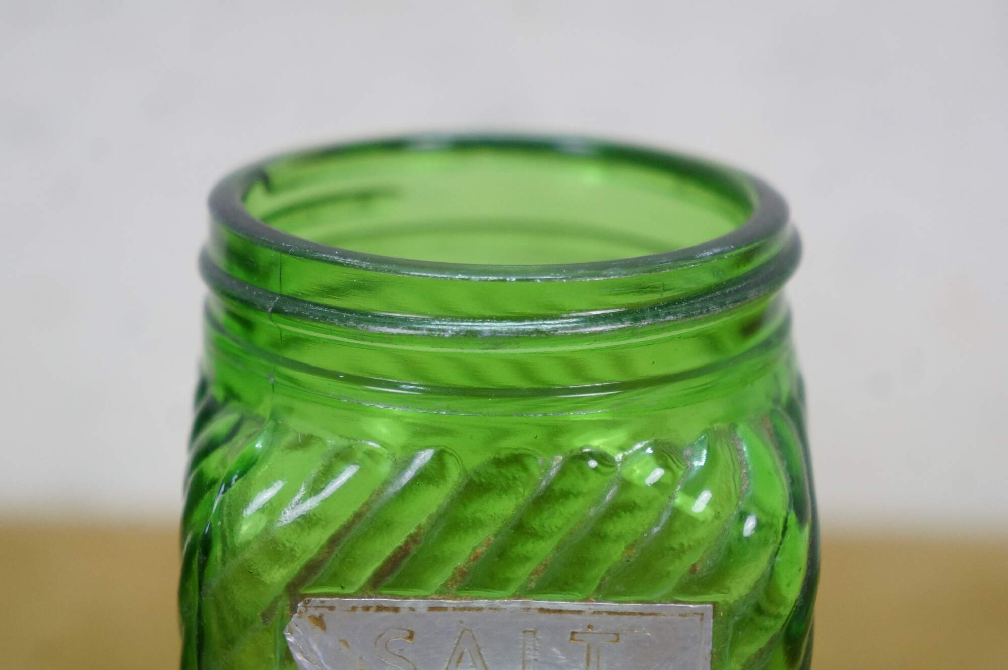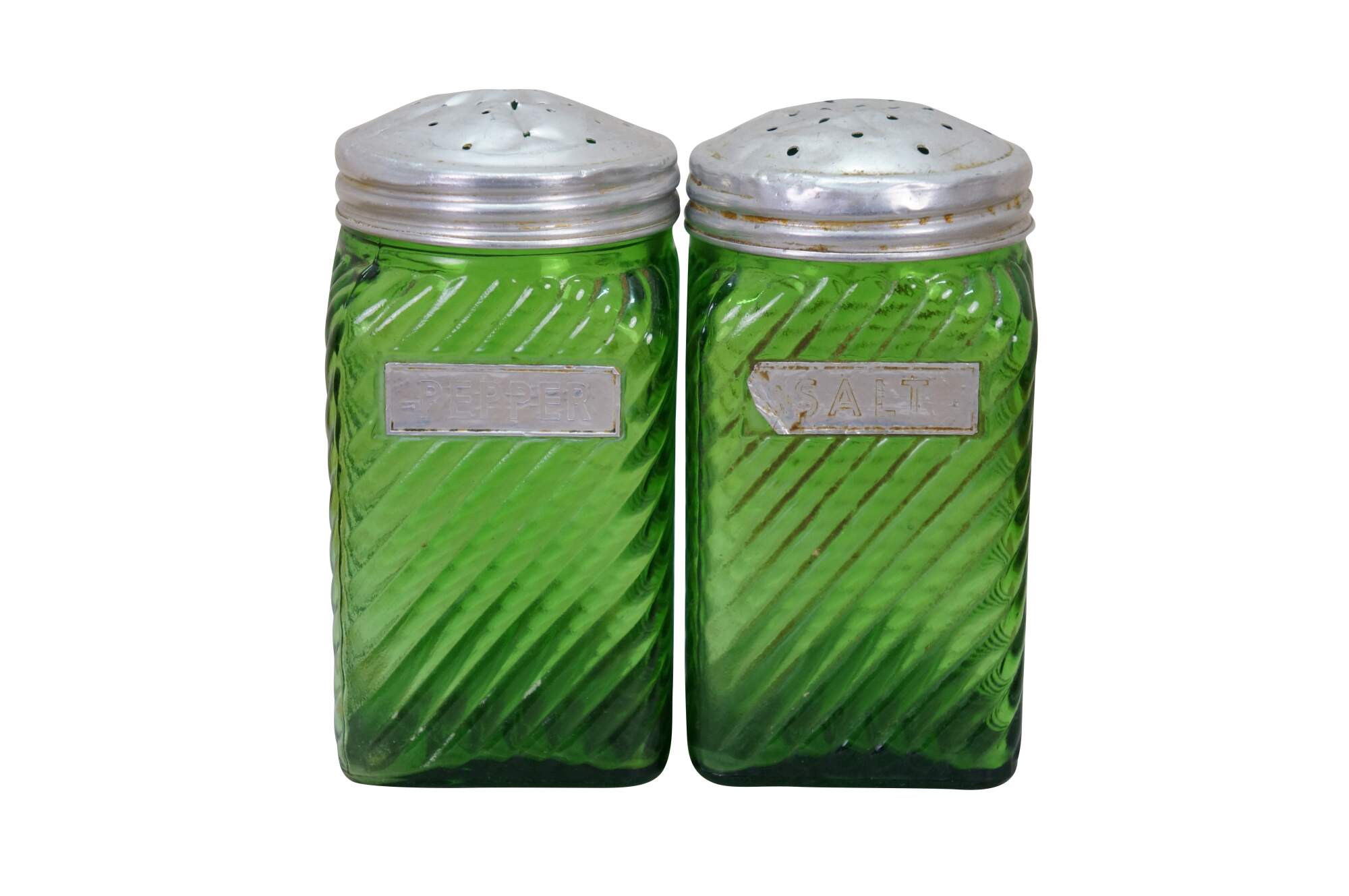 Two Antique Owens Illinois Hoosier Green Ribbed Glass Sugar Salt Pepper Spice Shakers.