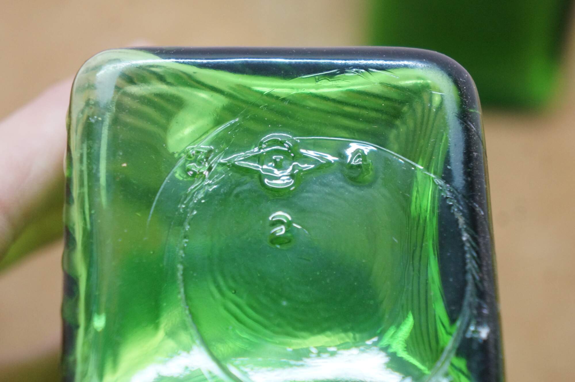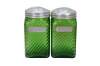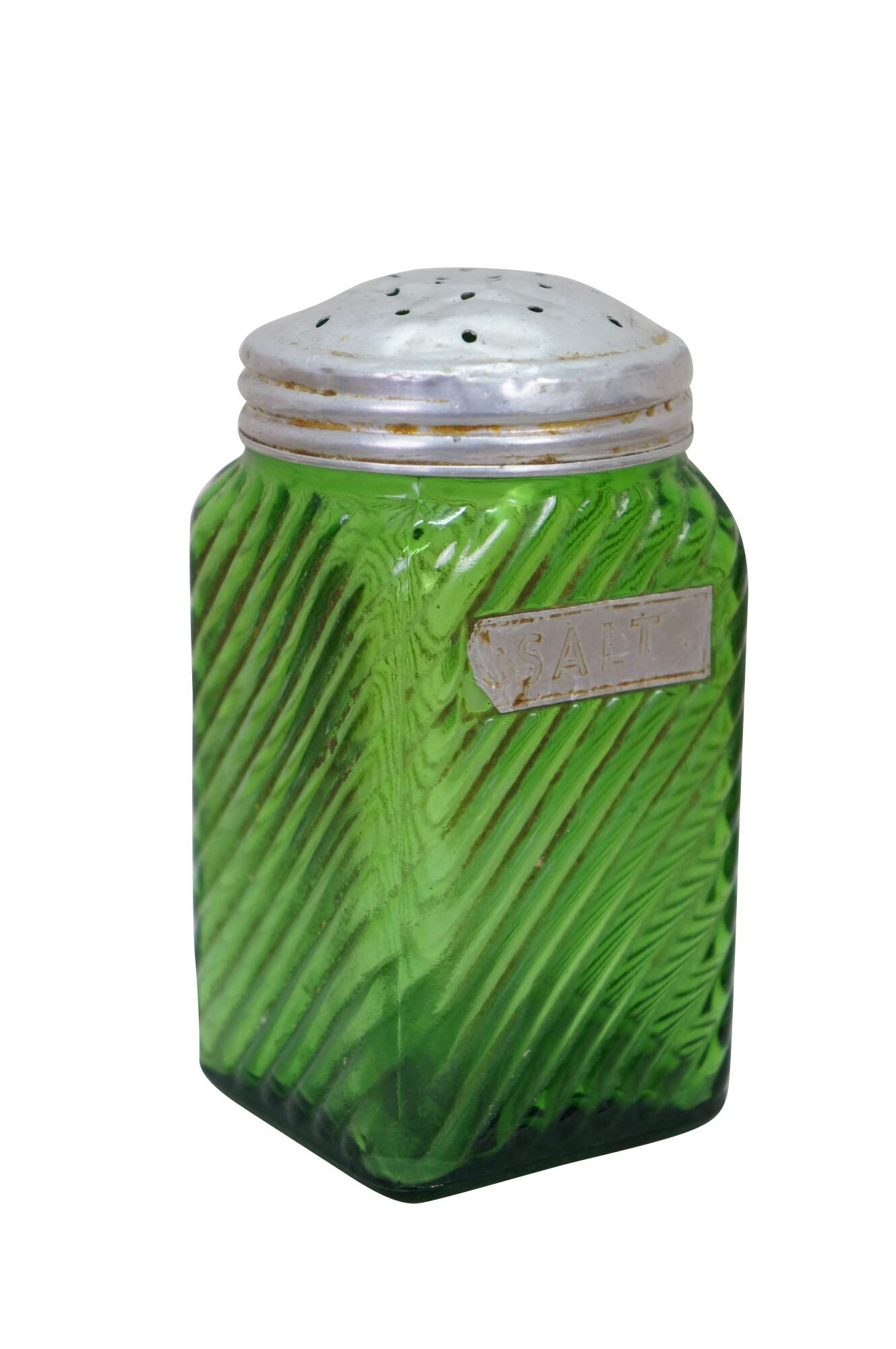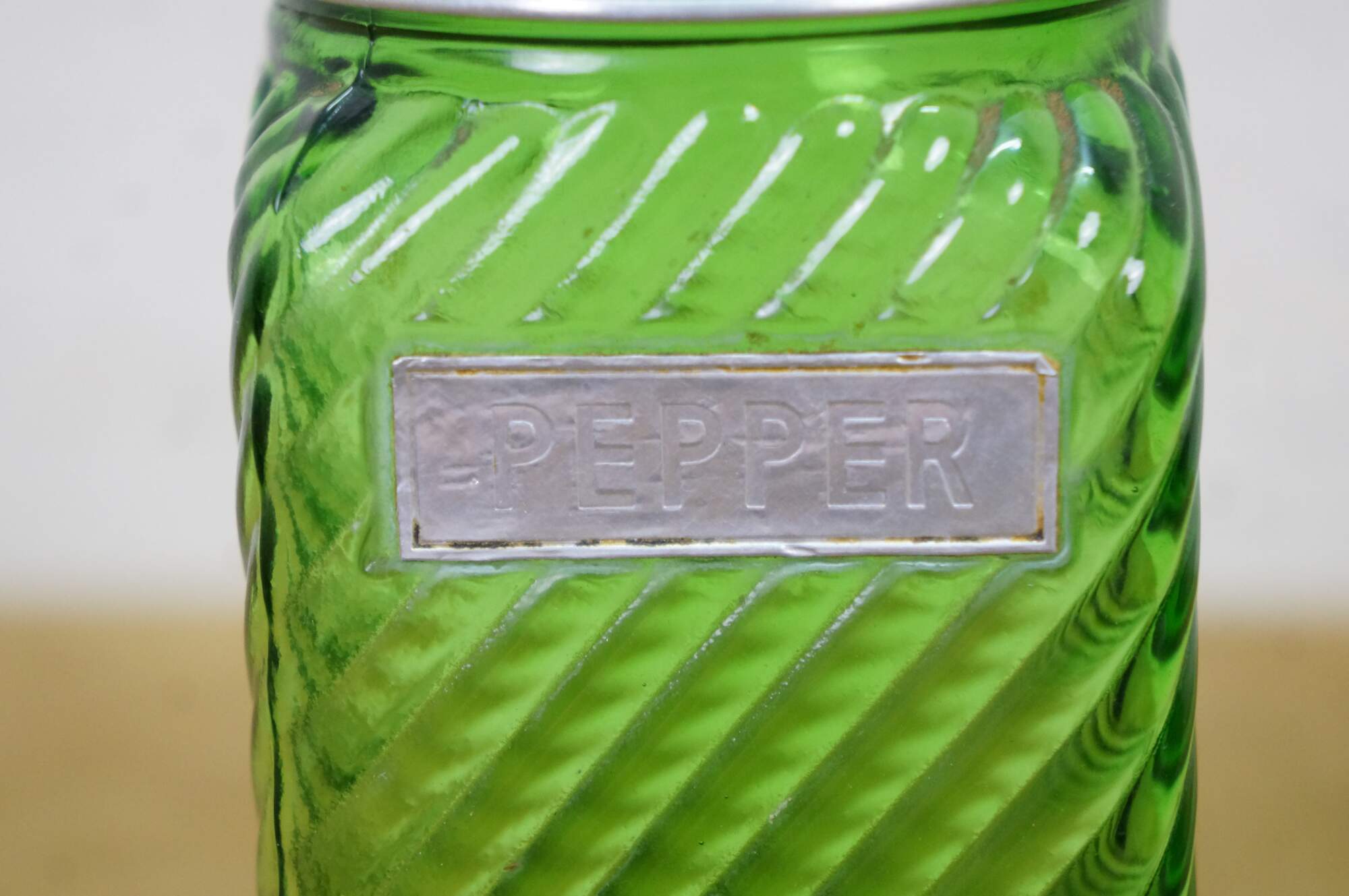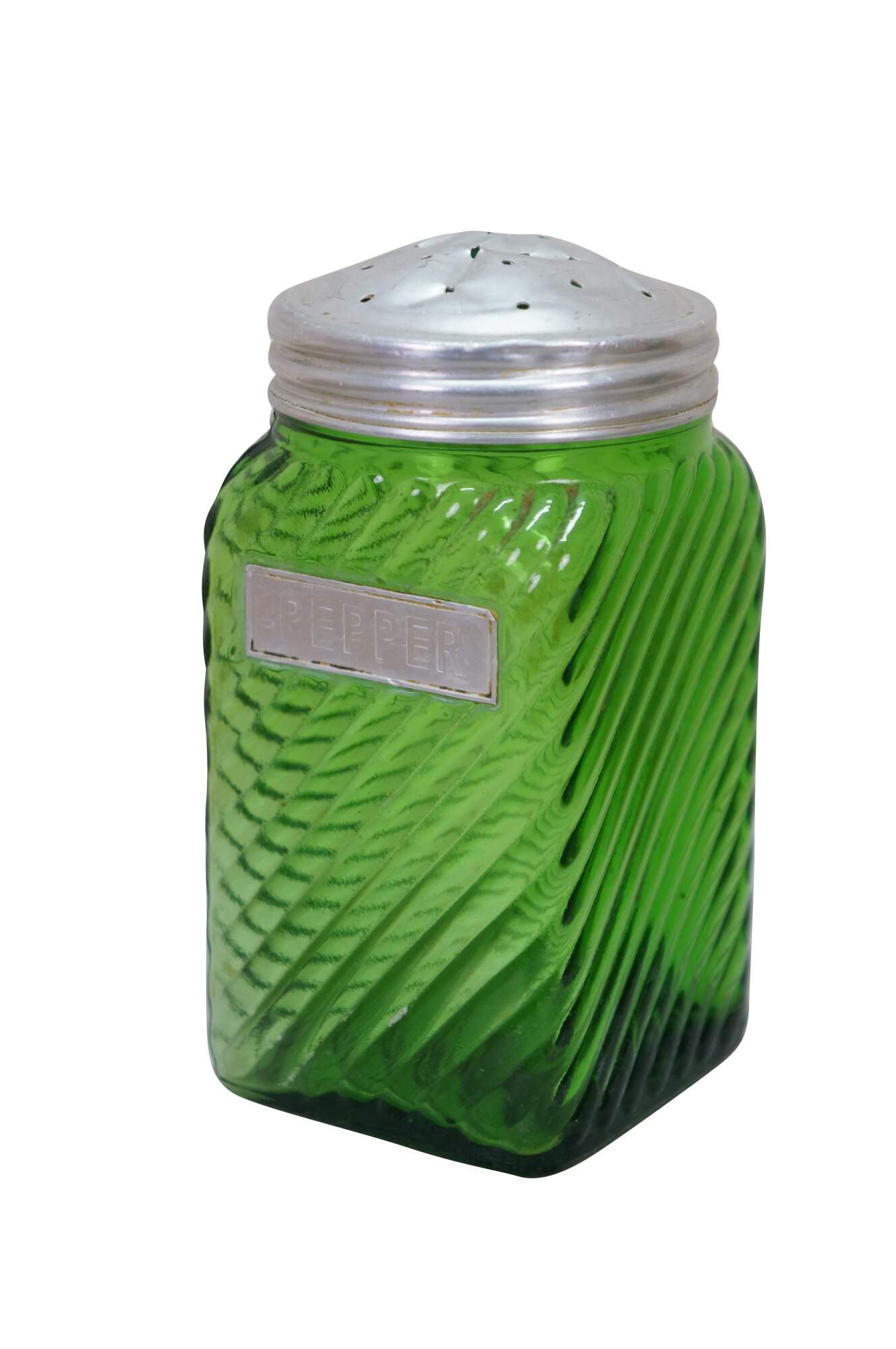 Two Antique Owens Illinois Hoosier Green Ribbed Glass Sugar Salt Pepper Spice Shakers.
