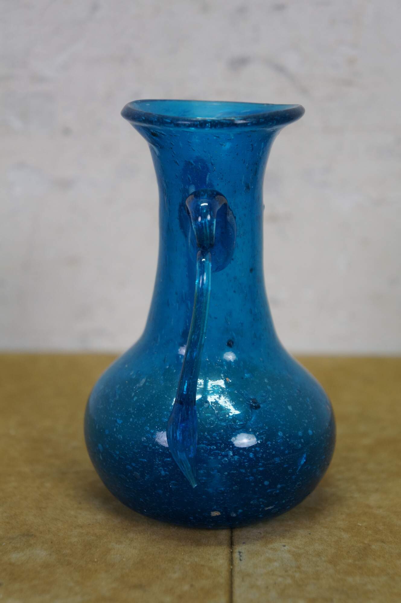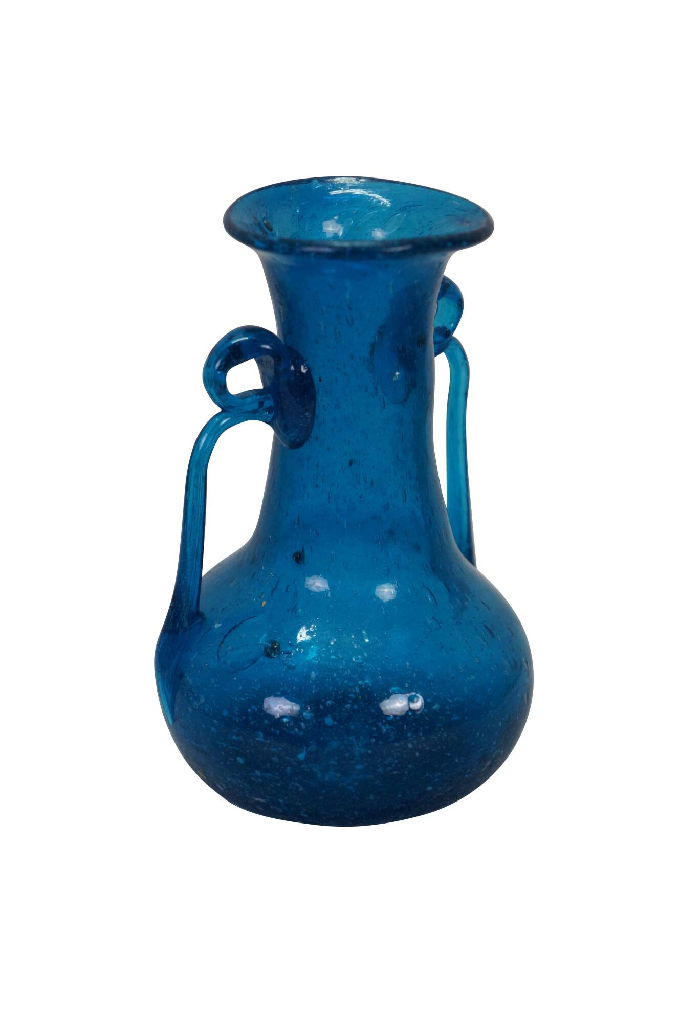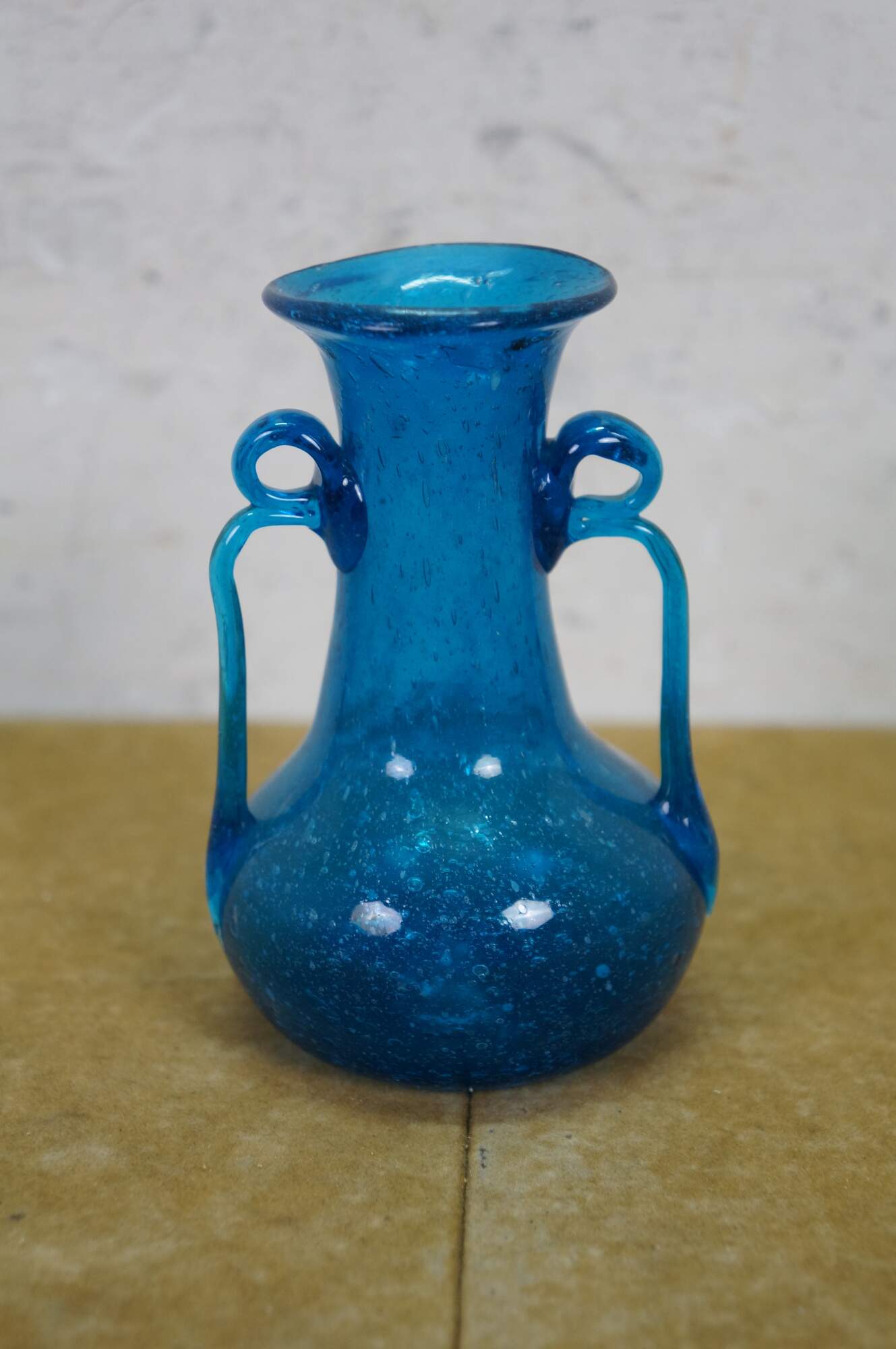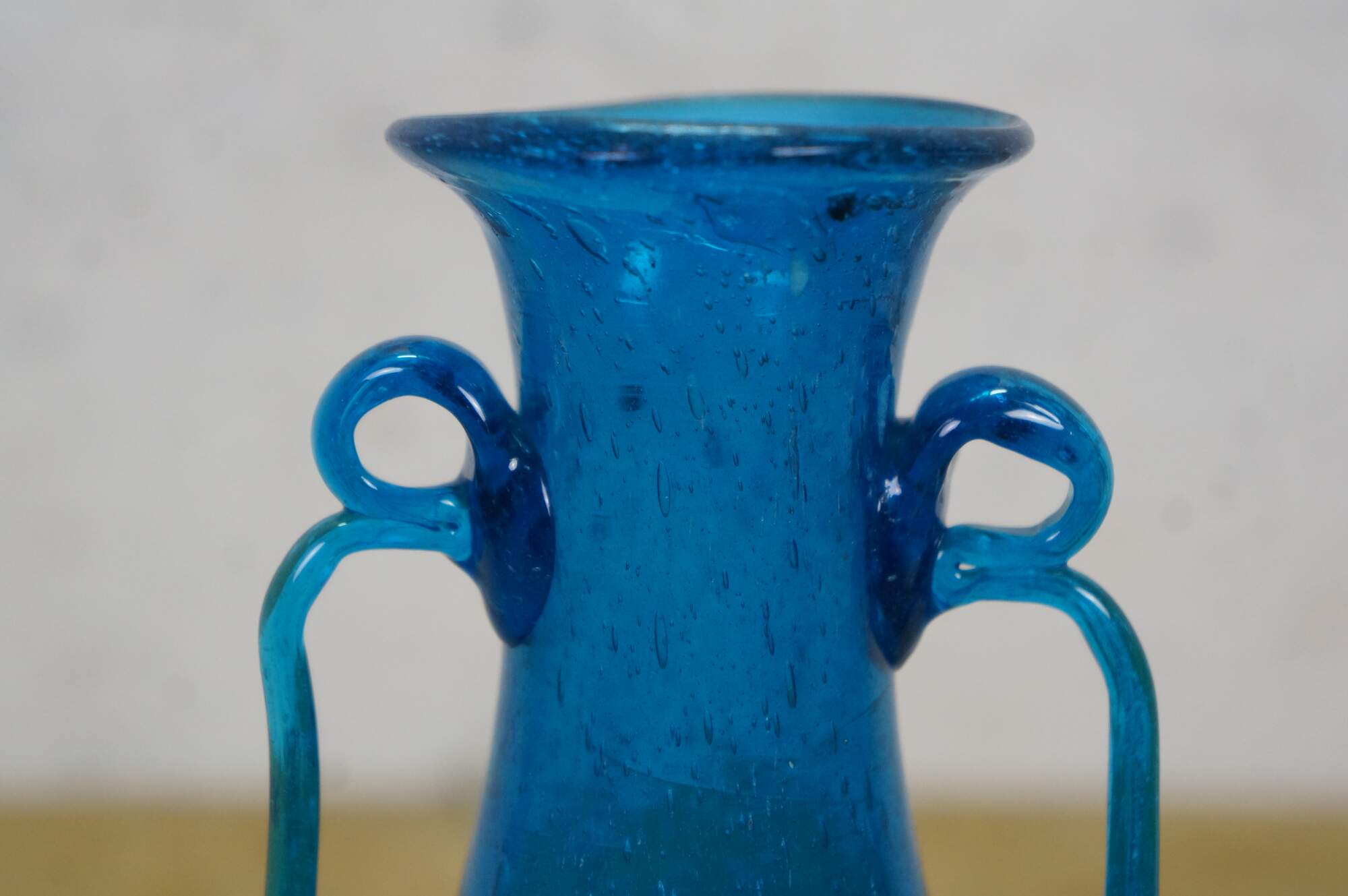 Venetian Italian Murano hand blown blue art glass bud vase featuring a captured air bubble design with double scrolled handles, flared lip, and unpolished pontil.