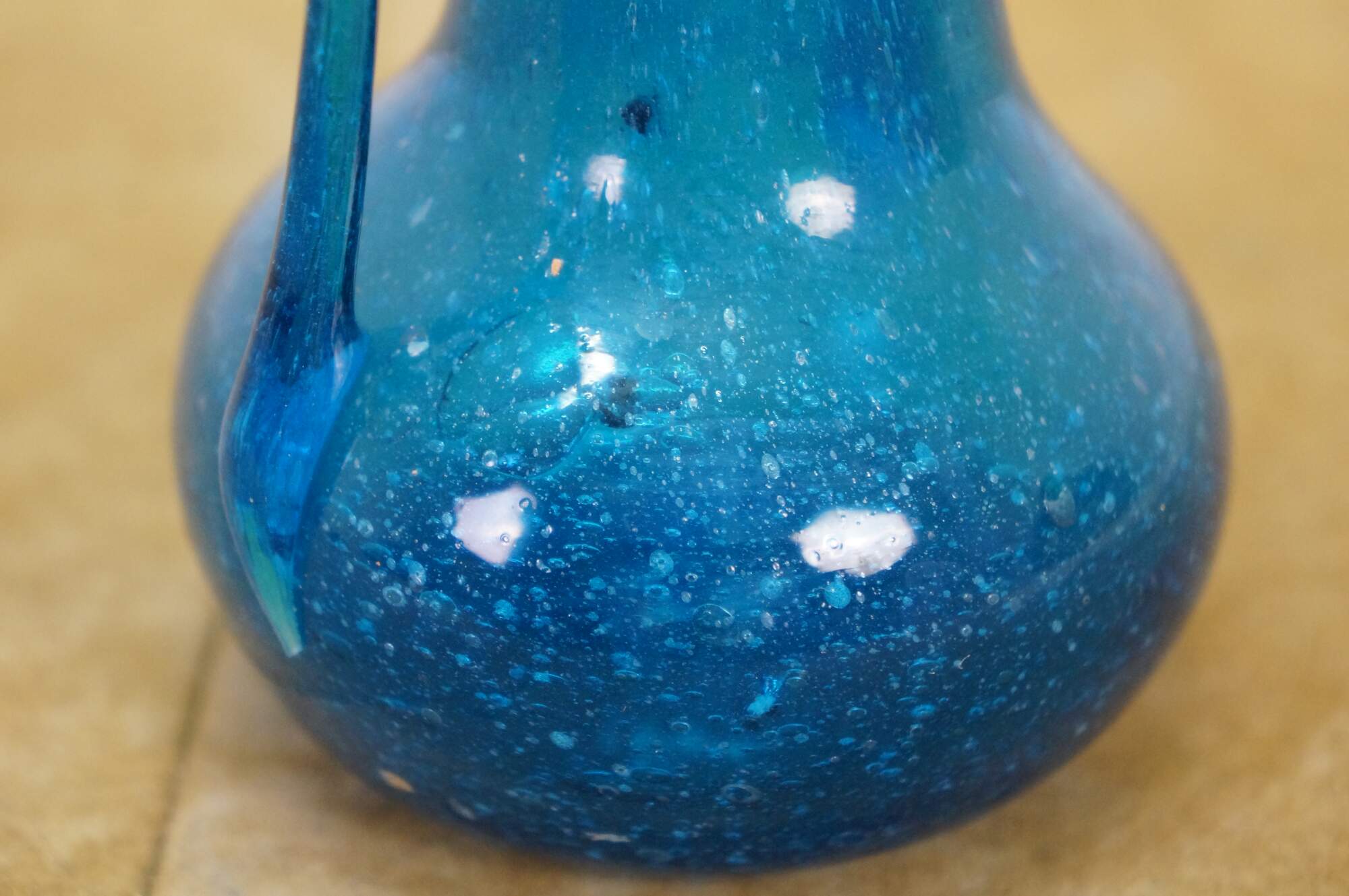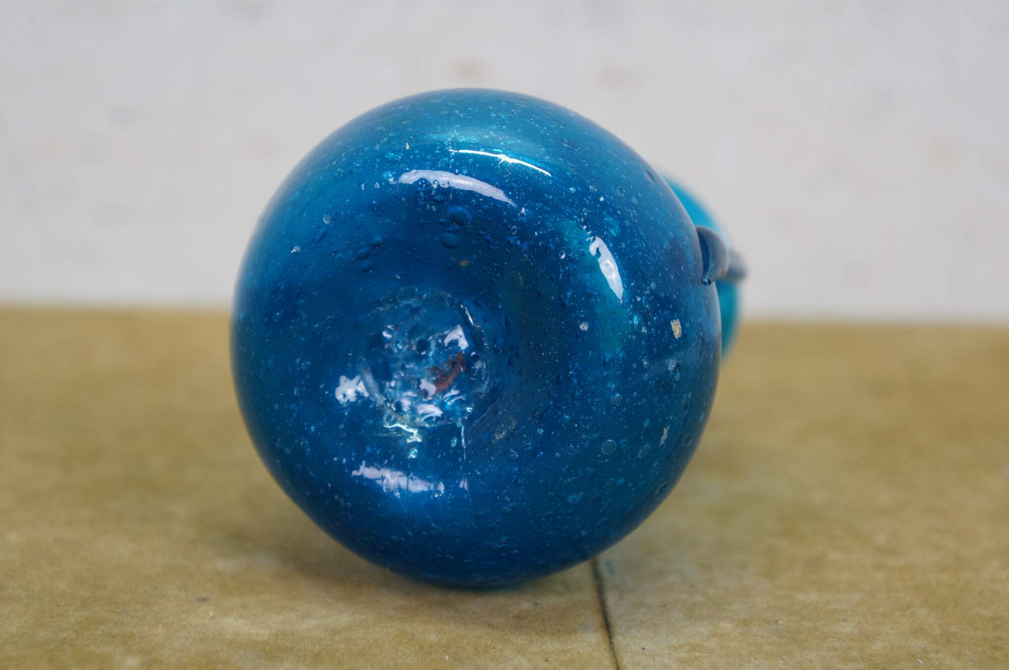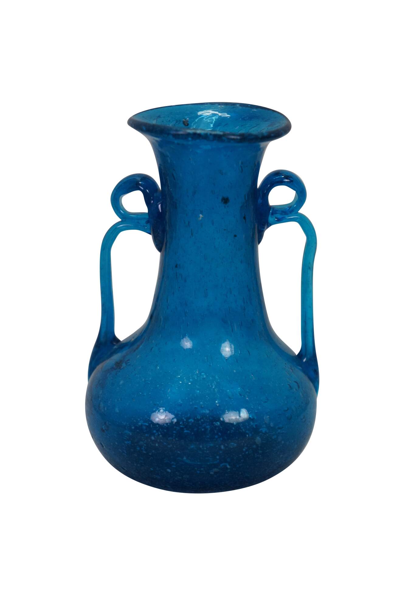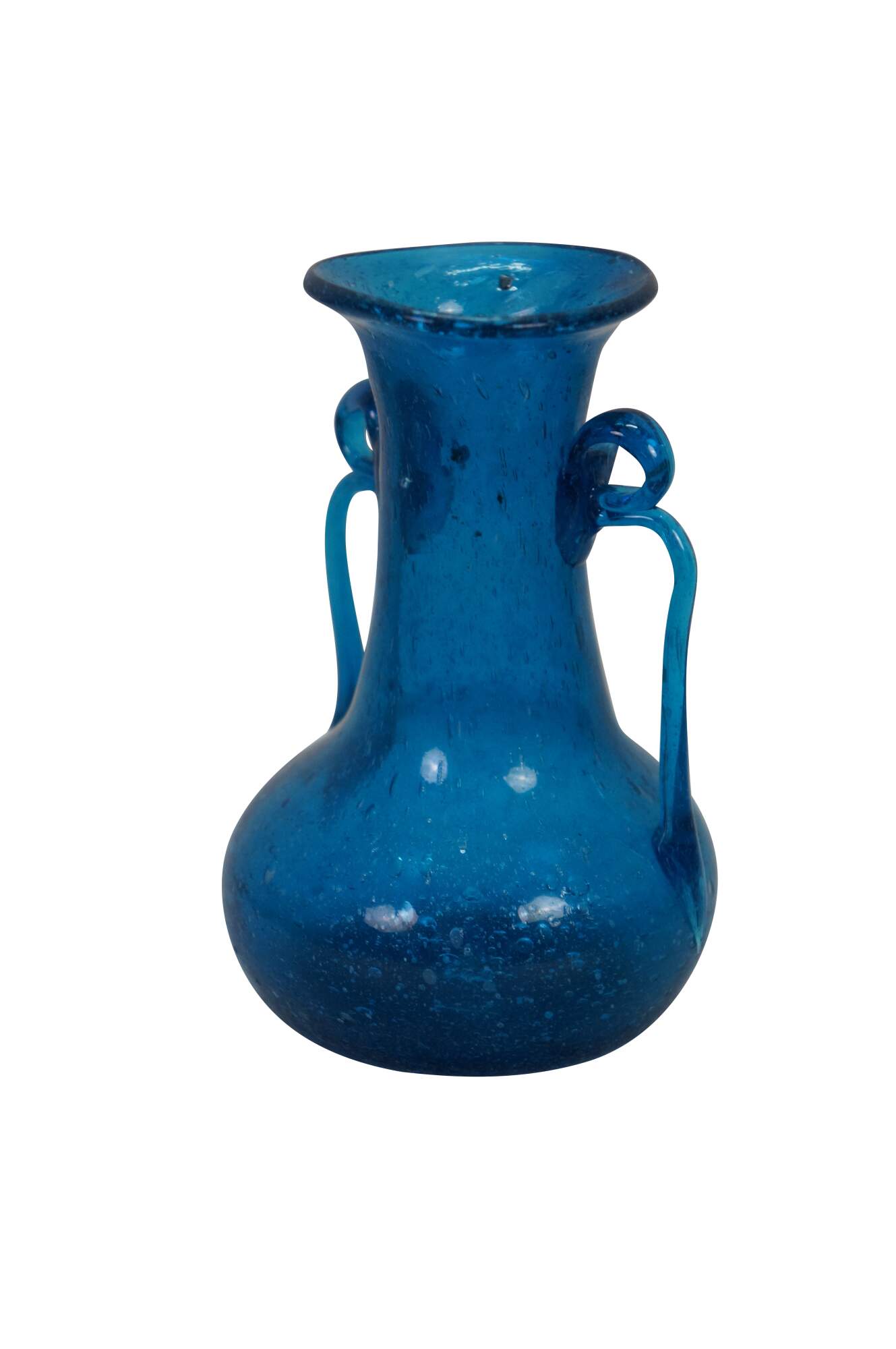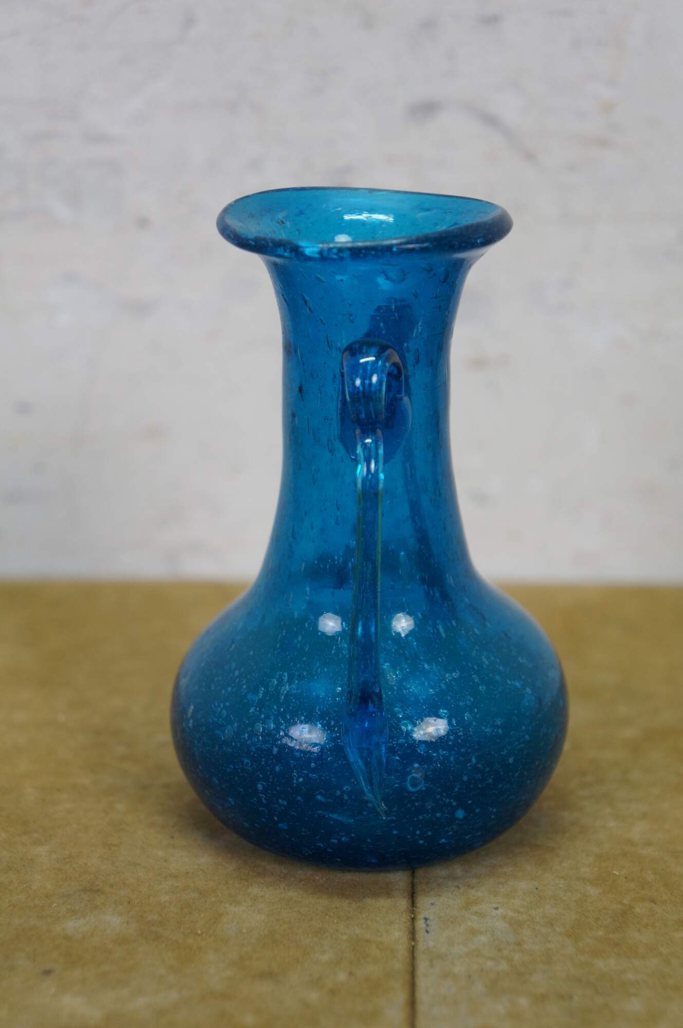 Venetian Italian Murano hand blown blue art glass bud vase featuring a captured air bubble design with double scrolled handles, flared lip, and unpolished pontil.