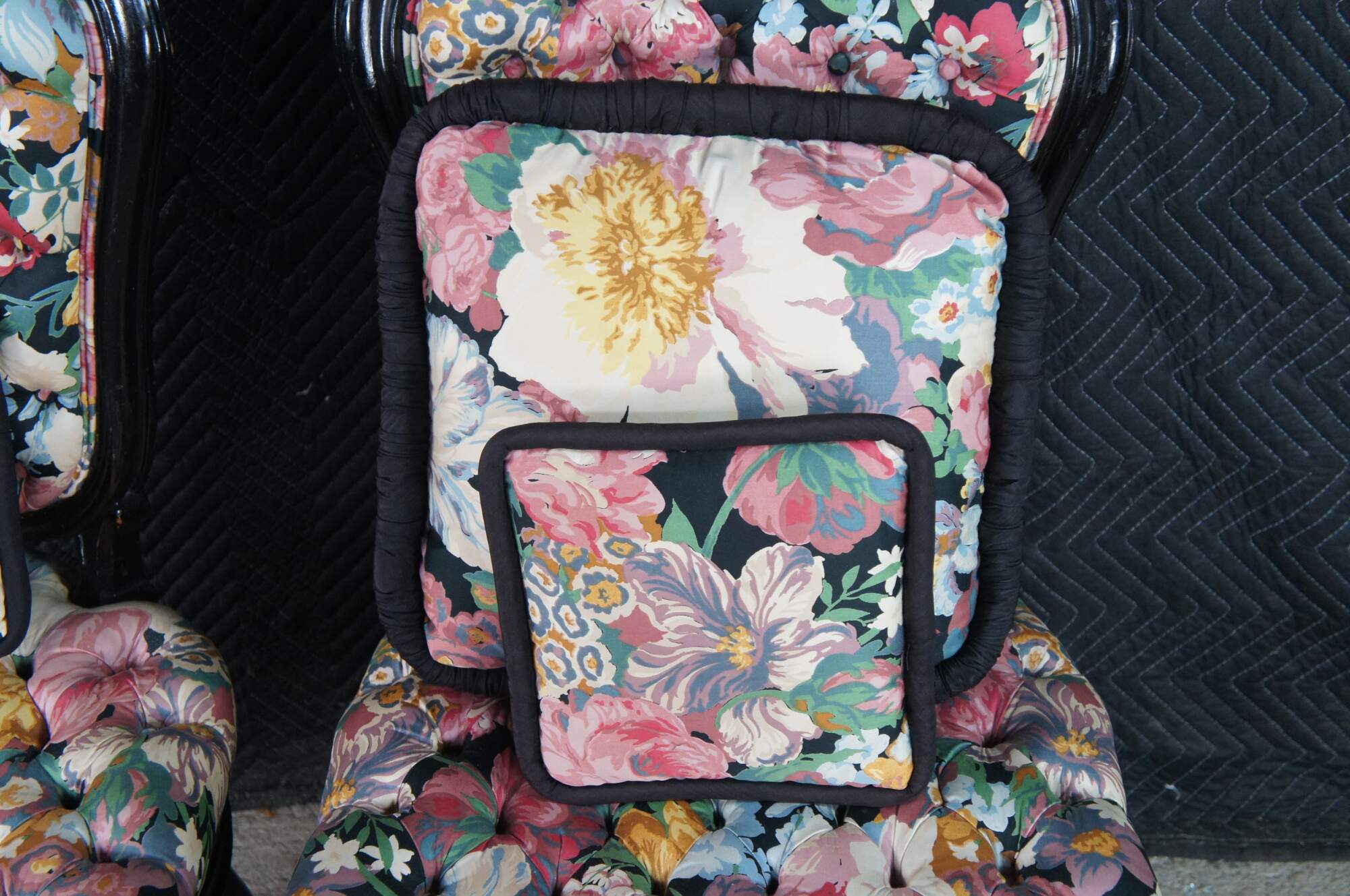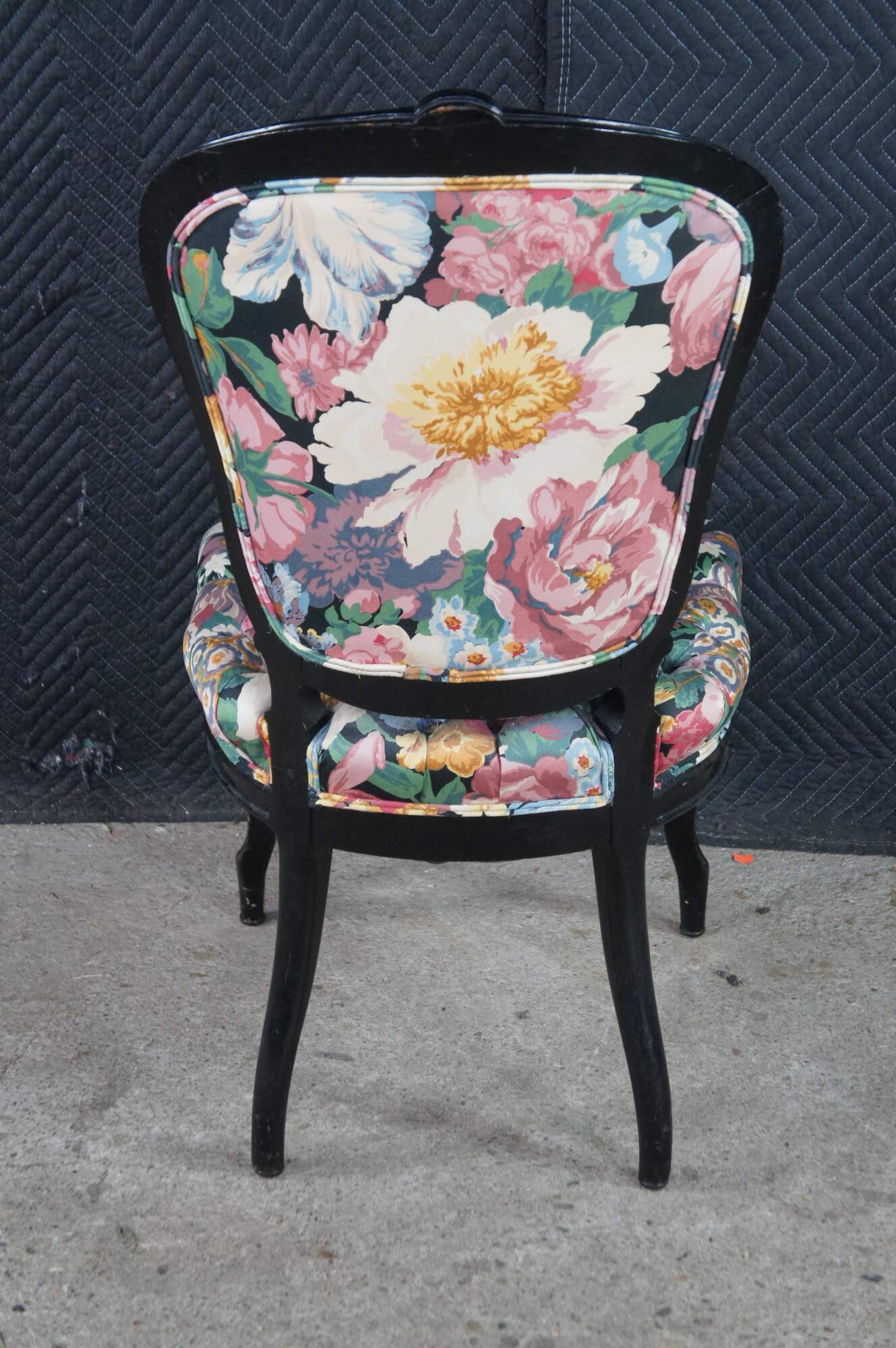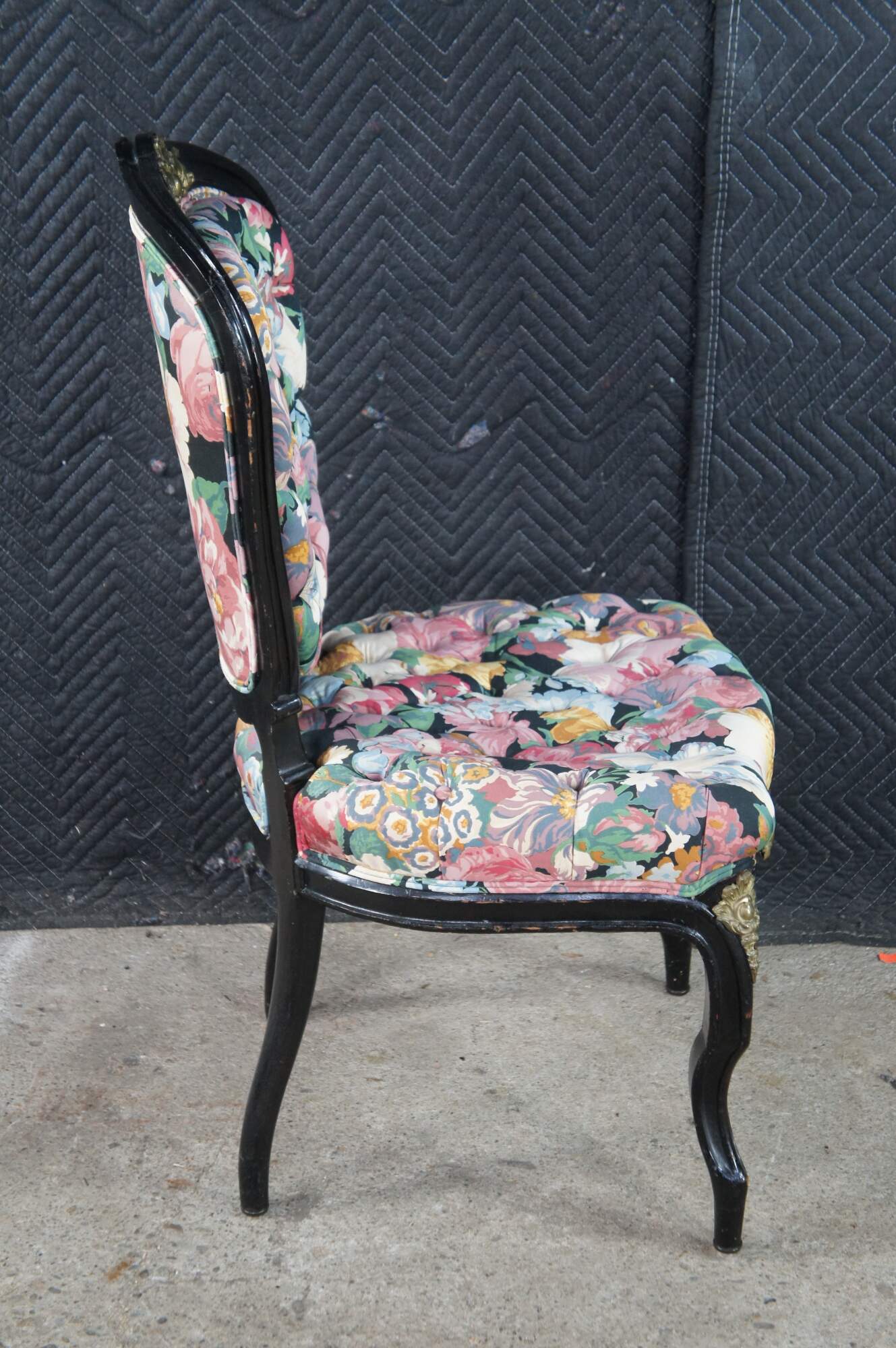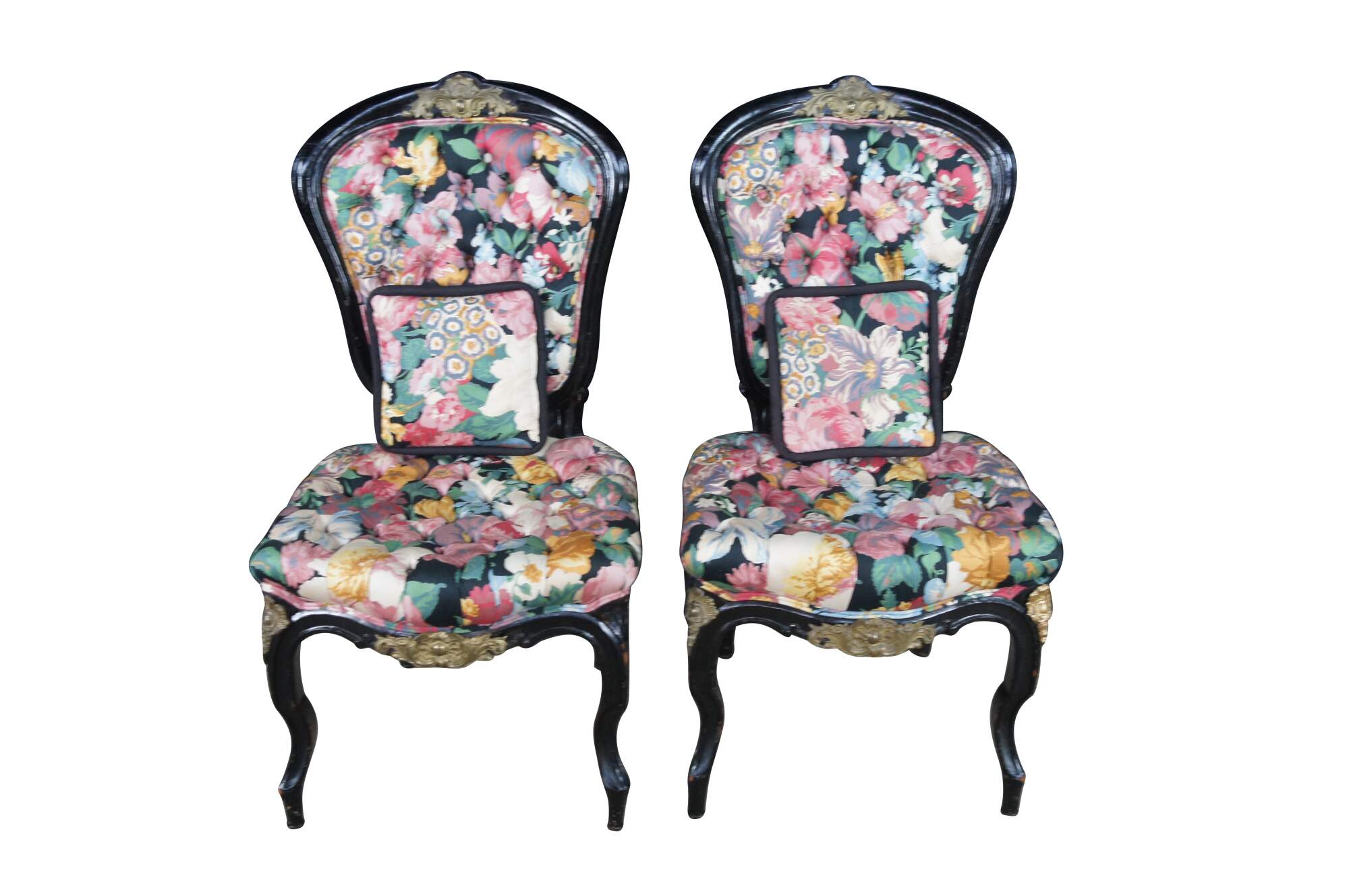Set of four antique French Louis XV style dining chairs. Features an ebonized frame with Baroque ormolu mounts. The chairs are upholstered in Boussac tufted fabric. Includes 3 pillows.