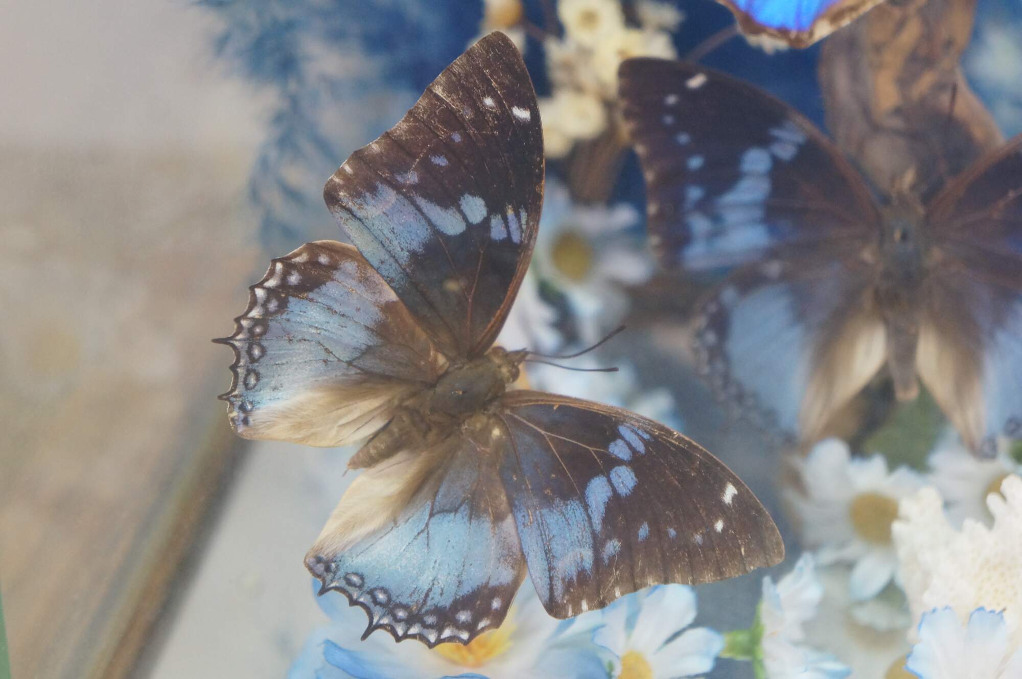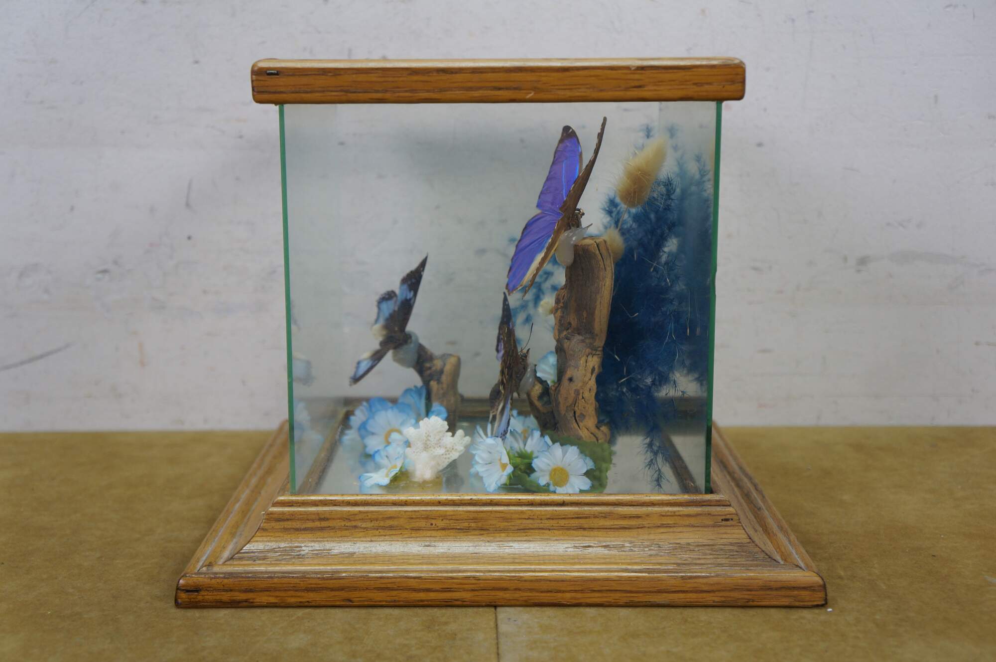 Vintage taxidermy terrarium diorama with butterfly and artificial floral arrangement displayed inside a glass apothecary shadowbox display made from oak and glass.