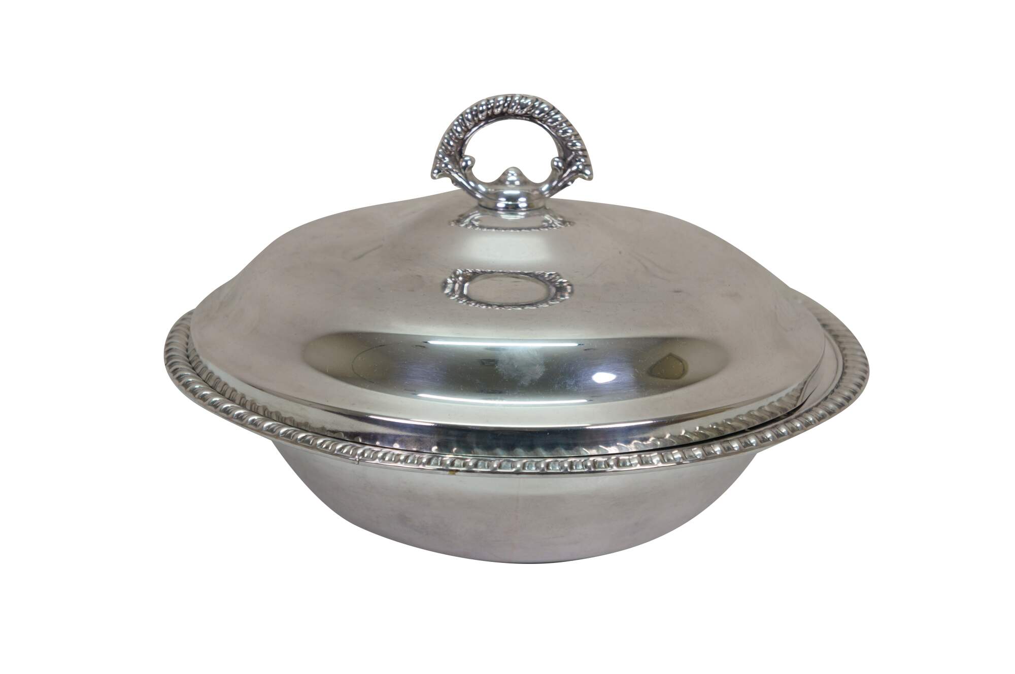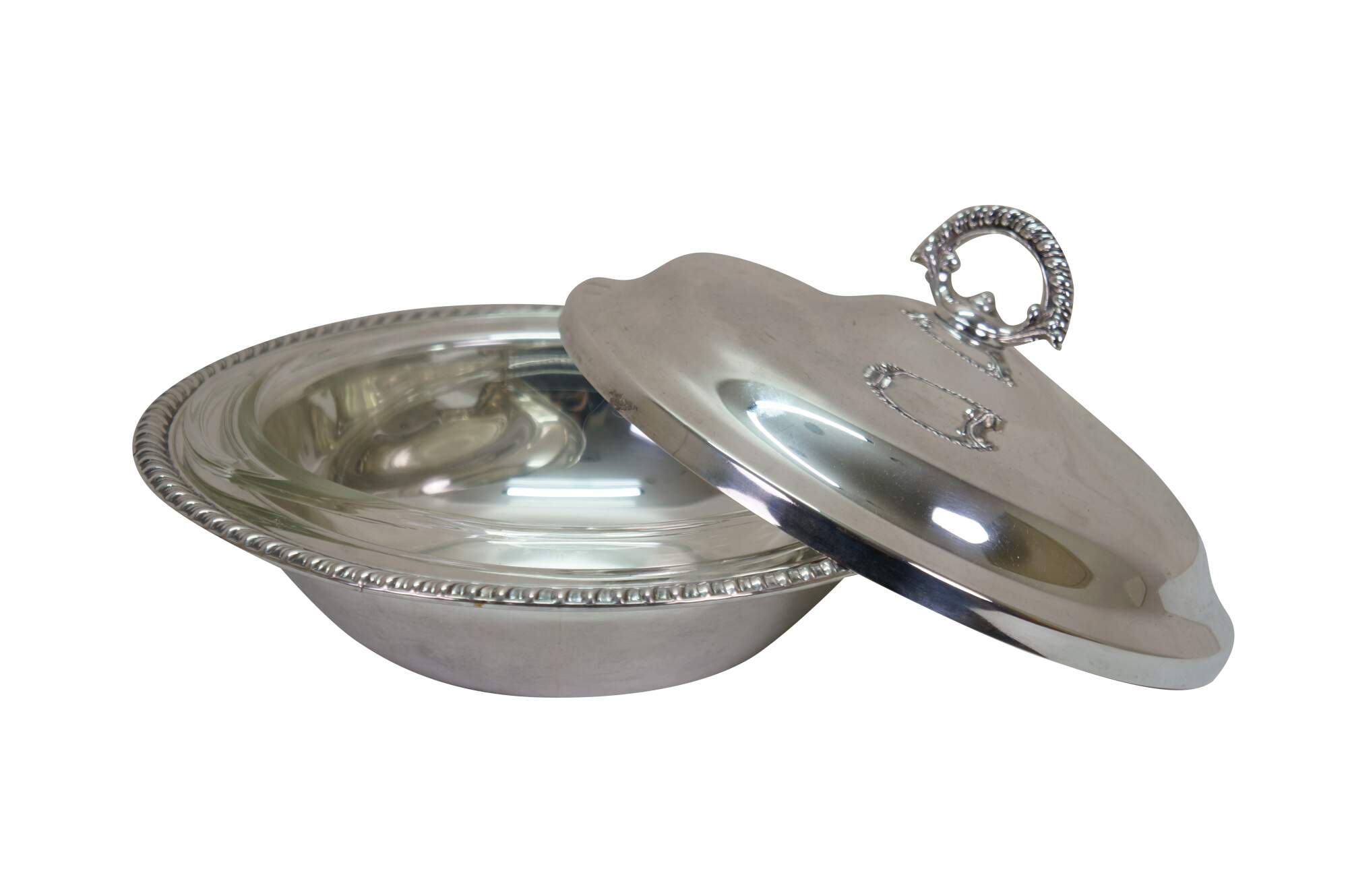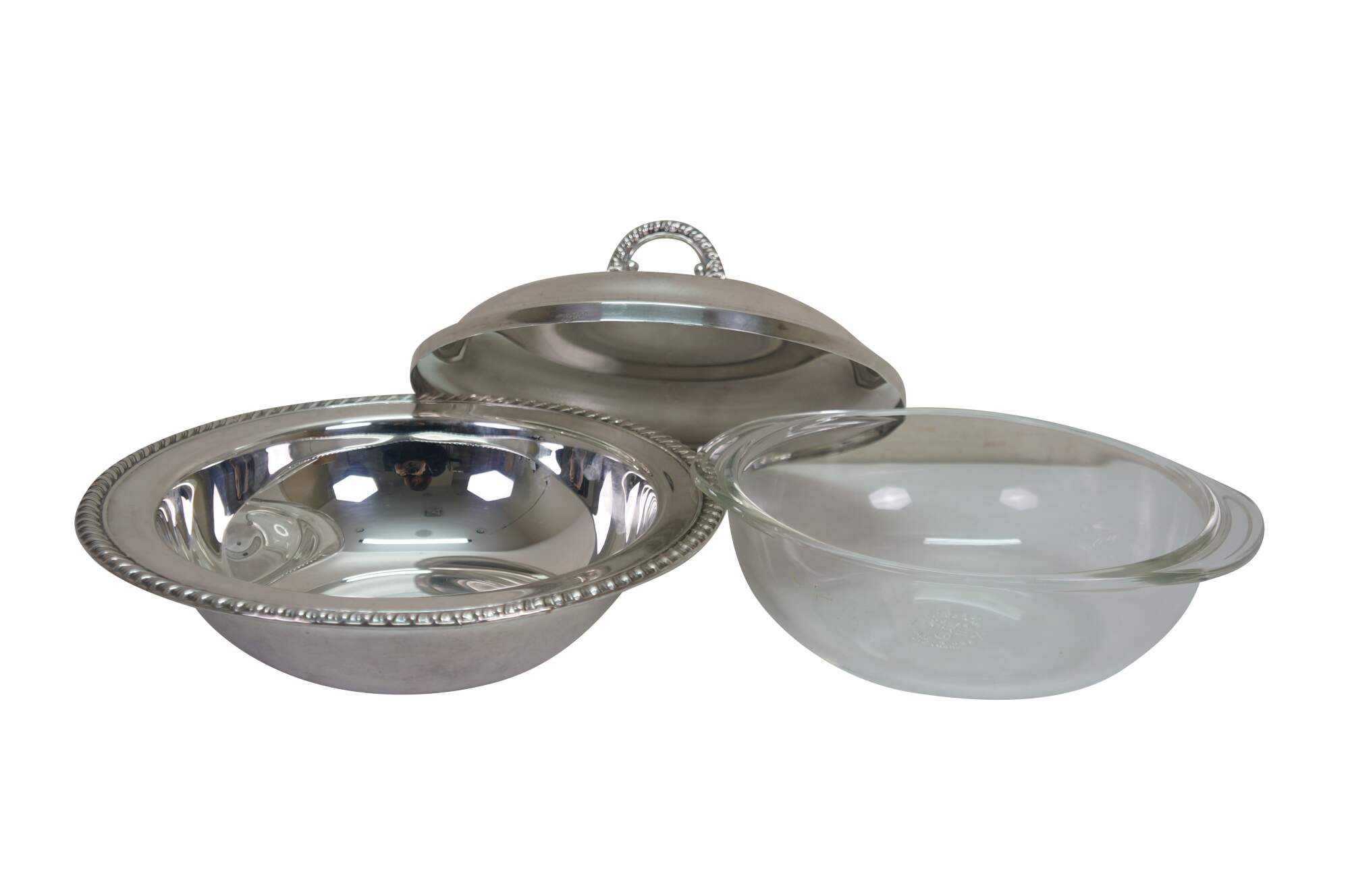 Vintage Wm. Rogers silver plated covered serving casserole dish, often referred to as a banquet dish.� Features a lid with a decorative finial and a gadroon edge pattern. Includes pyrex insert.