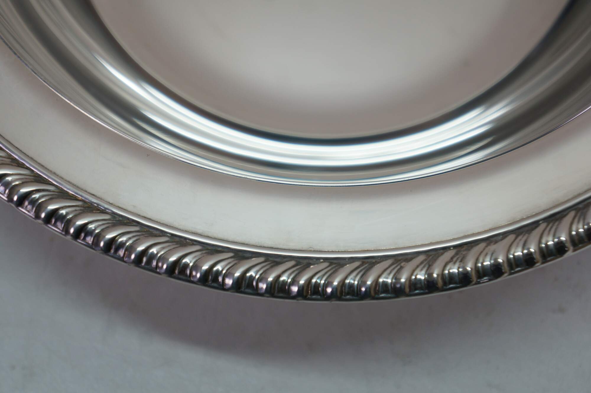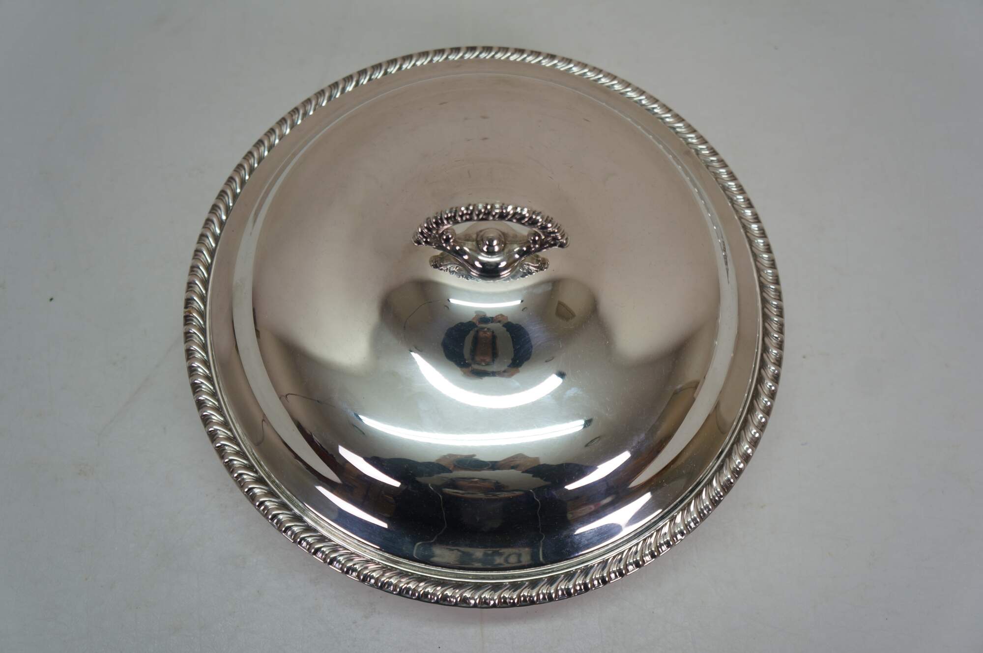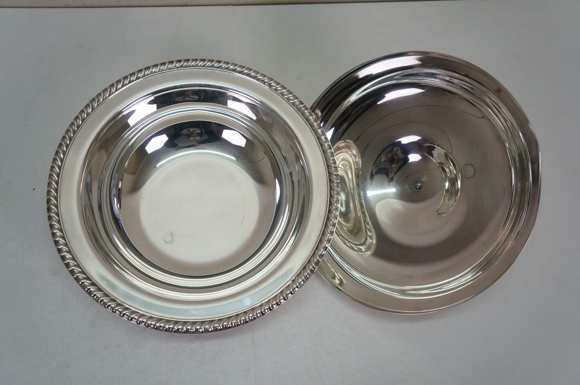 Vintage Wm. Rogers silver plated covered serving casserole dish, often referred to as a banquet dish.� Features a lid with a decorative finial and a gadroon edge pattern. Includes pyrex insert.