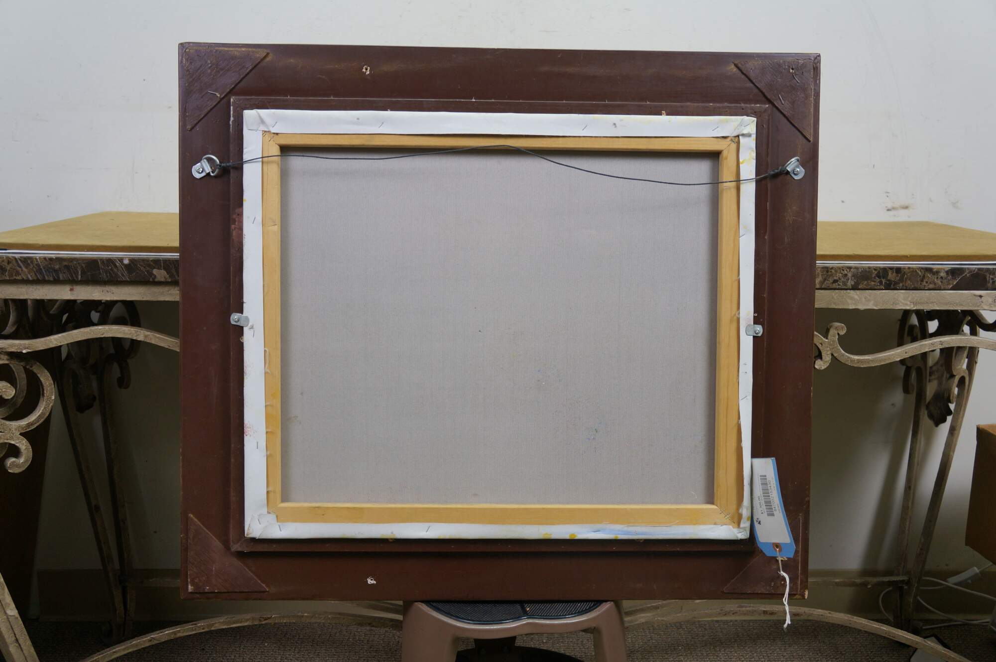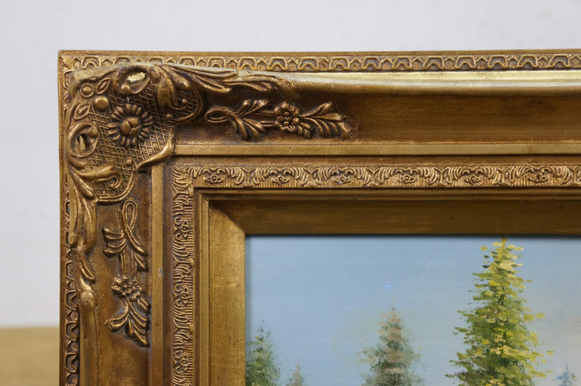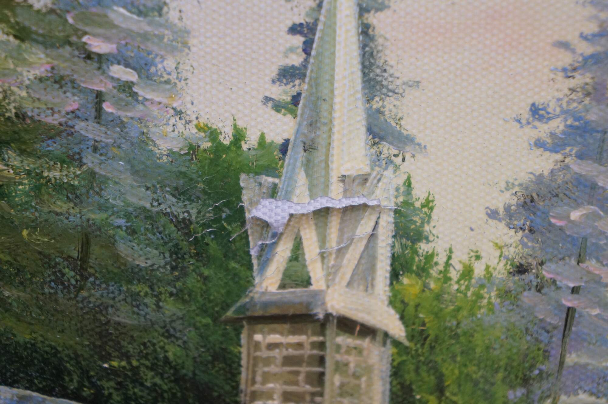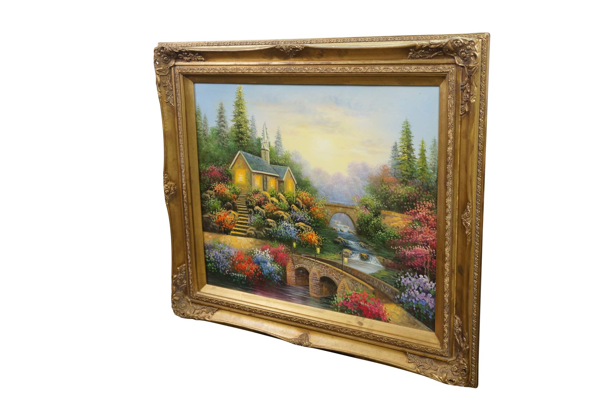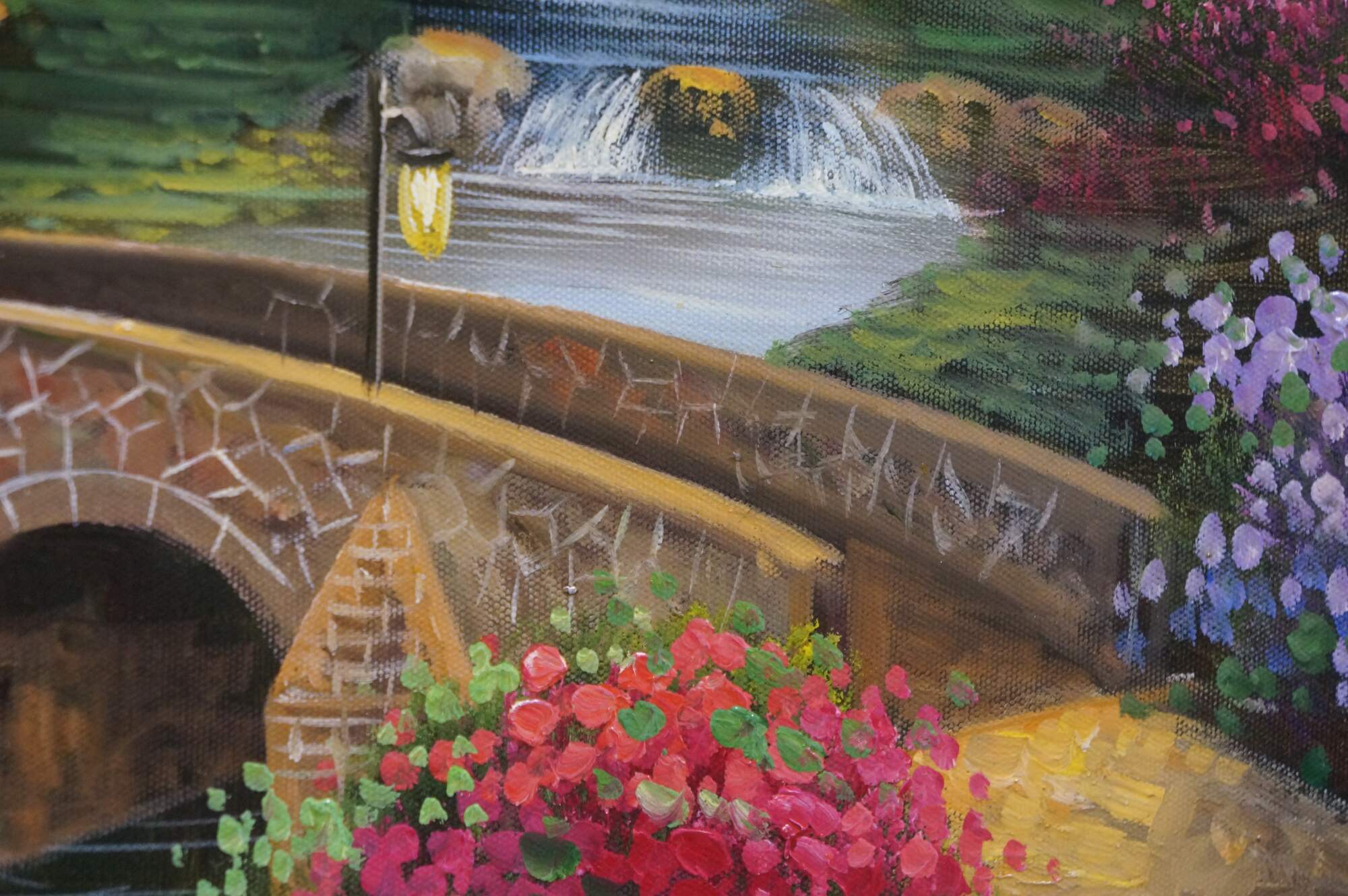 Vintage C. Jaffey oil painting on canvas featuring a serene, picturesque cottage scene with vibrant flowers and a flowing stream. A stone cottage sits on a hill with warm yellow light glowing from the windows. A stream of water cascades down rocks and passing under two stone bridges.� The surrounding area is lush with greenery and tall evergreen trees, all under a soft, bright sky. Framed in wood gold gesso frame.