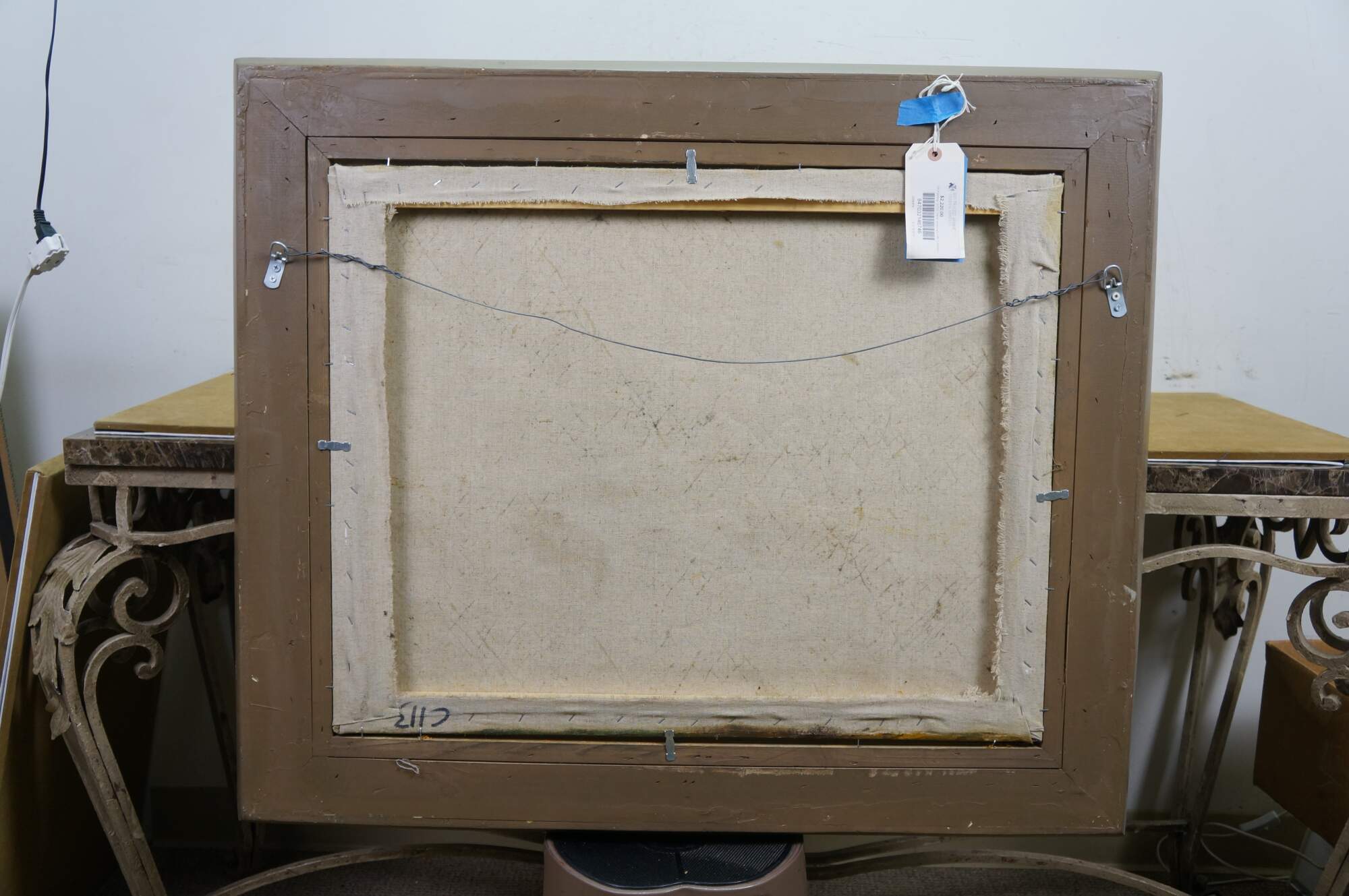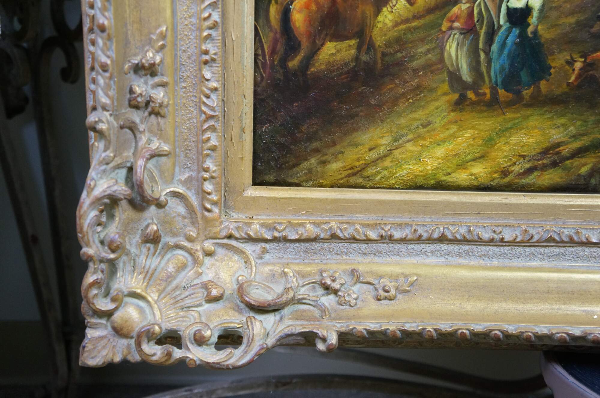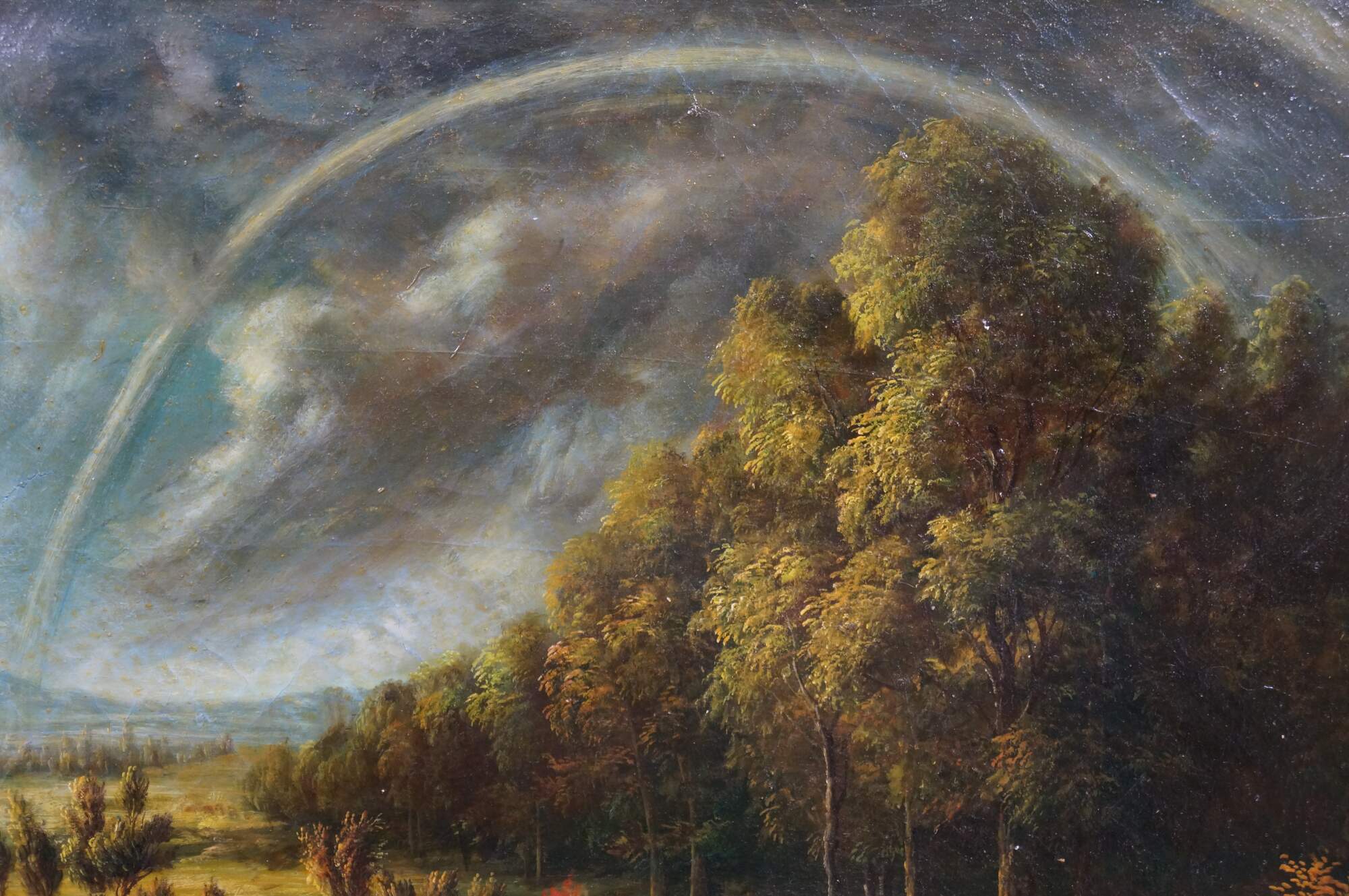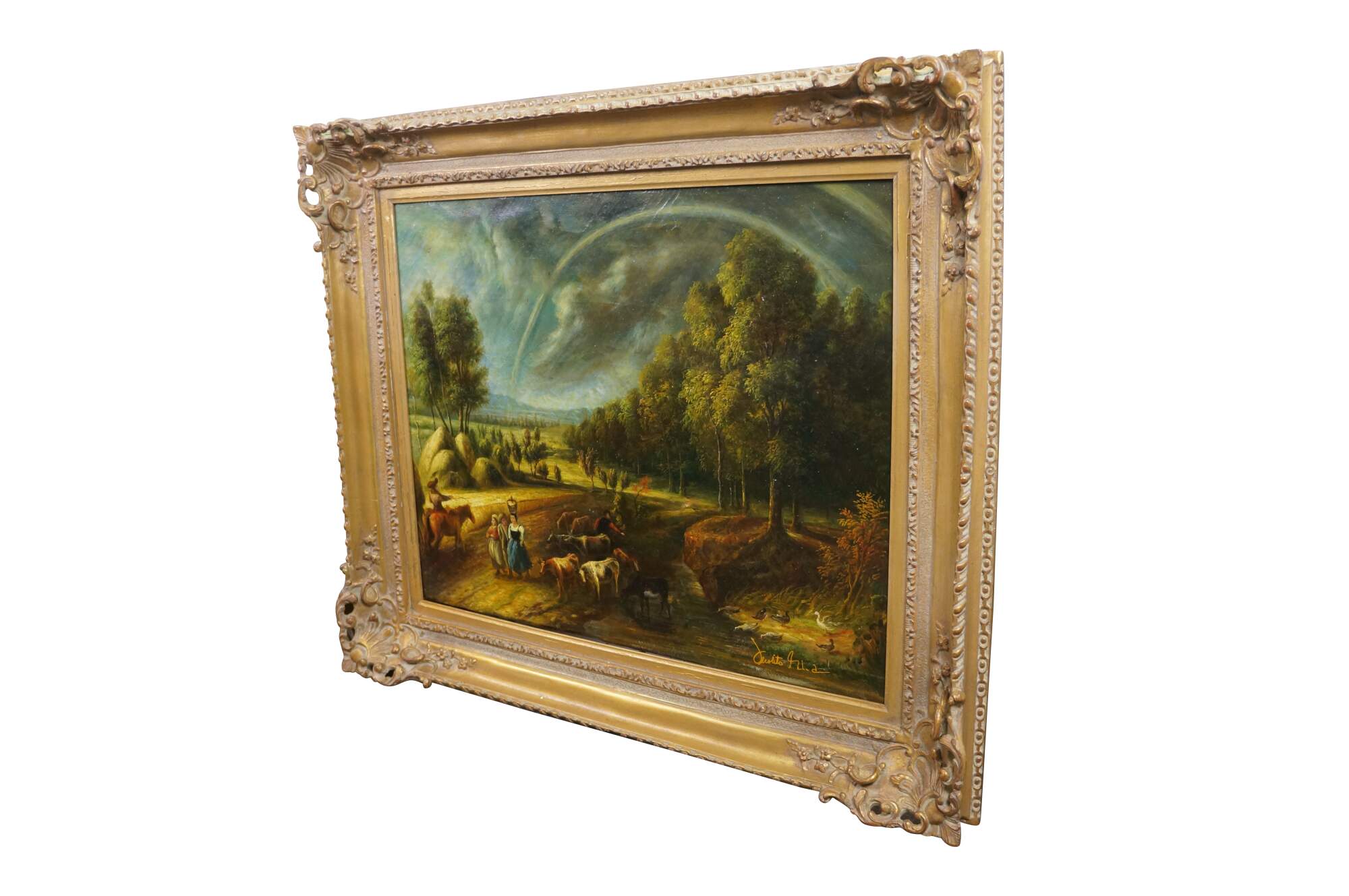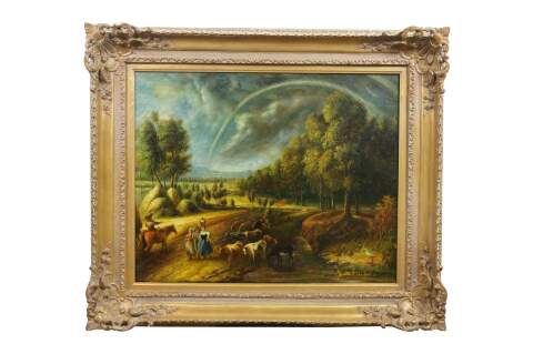 Vintage landscape oil painting on canvas after Peter Paul Rubens. The painting depicts a scene from his country estate, Het Steen, during a late summer afternoon. The scene famously shows a large Rainbow after a storm. Baroque wood frame.
